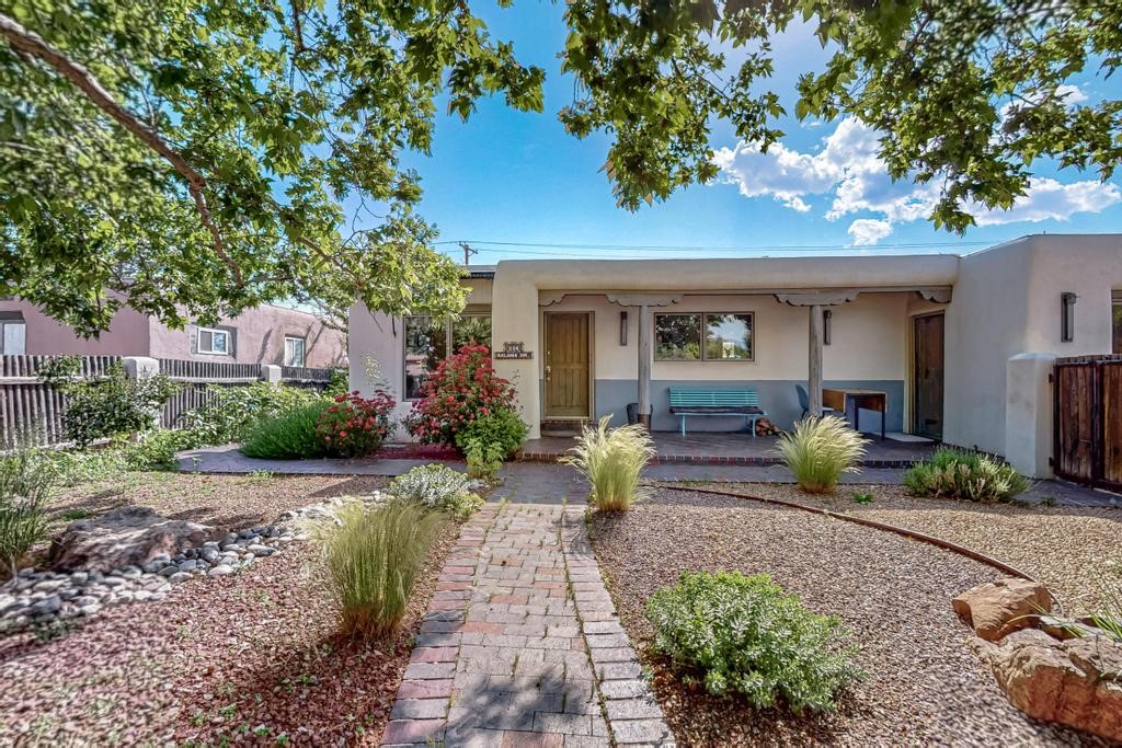 Full of charm and whimsey, this home in the popular Casa Solana neighborhood is just waiting for you! Entering the enclosed courtyard you'll find brick walkways, coyote fencing, and mature landscaping w/ fruit trees and flowers. Inside you'll find wood and tile floors, good light, and a creative Kiva fireplace with river stone accents. There is a separate dinning room off the updated kitchen. Gas range, live edge bar, pebble backsplash, and plenty of storage are bonus's in the kitchen. 3 bedrooms, 3 bathrooms. The hall bath has a lovely amethyst sink and jetted tub. The primary suite is just that. Close the door and you are in an oasis of your own with a lovely bedroom on one side, and a walk in shower/dressing room on the other. This home even has a small finished basement and mechanical room! Out back you'll find a nice sized yard and deck, raised beds, and space for you to make it your own. Close to the Santa Fe River greenbelt, and a short distance to the Santa Fe Plaza, shopping and schools, this house has it all.