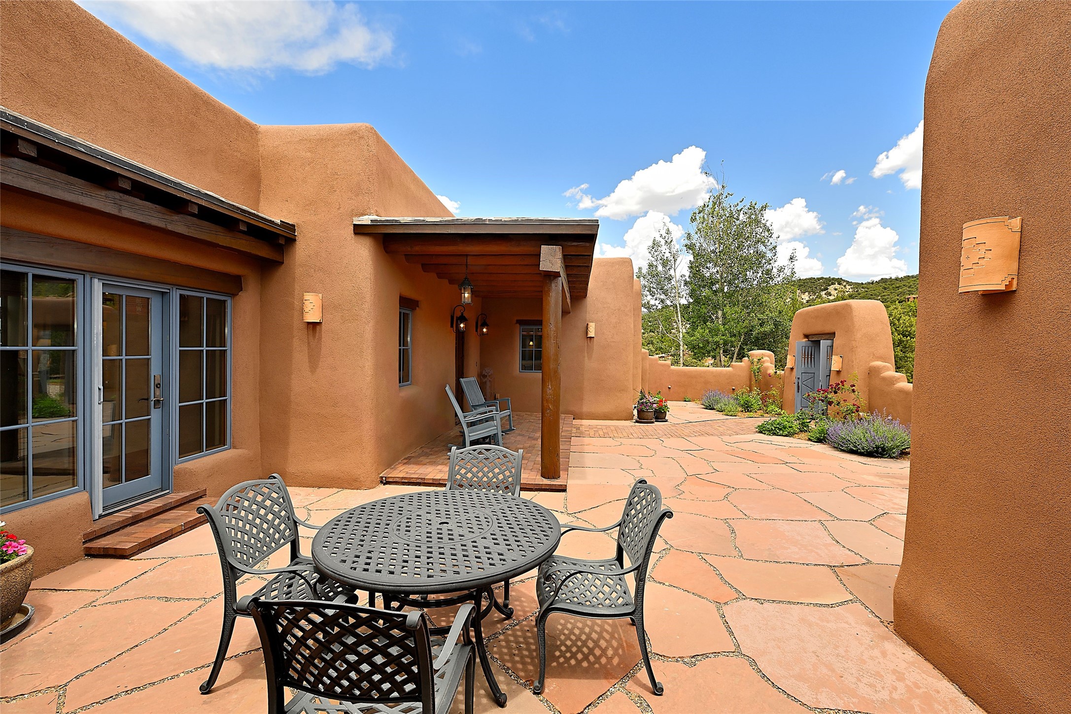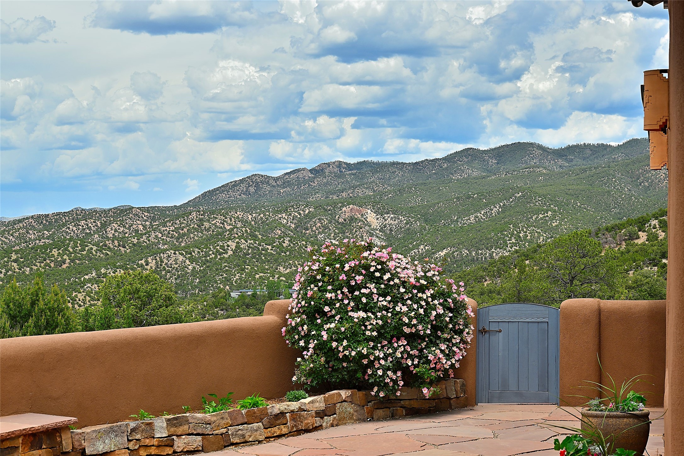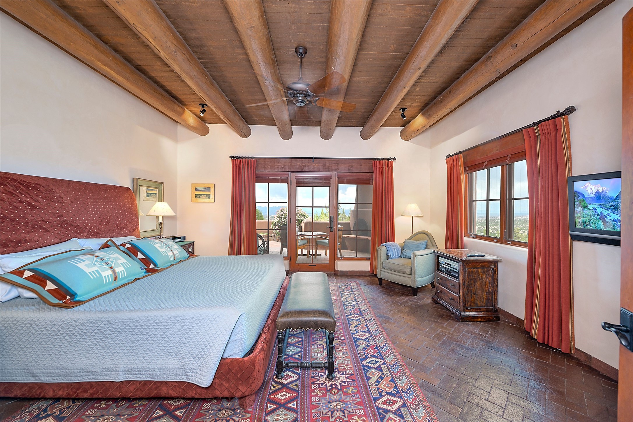 A true masterpiece of Spanish Pueblo architecture, this exceptional residence in Bishop's Lodge Hills is a stunning collaboration between acclaimed architect Ed Boniface and master builder Will Prull. Designed and constructed in 2007 for the current owner, with meticulous attention to detail, this home seamlessly blends traditional craftsmanship with modern luxury, all while capturing commanding views of the surrounding mountains and breathtaking sunsets. Upon entering the foyer, guests are enveloped in a space inspired by the sacred geometry of a Navajo Hogan, setting the tone for the rich architectural heritage woven throughout the home. The grand living room boasts soaring beamed ceilings supported by hand-carved corbels, while a striking fireplace design--borrowed from ancient traditions--serves as a warm and welcoming focal point. The formal dining area opens gracefully onto the Grand Portal, which leads to an expansive rooftop deck, offering panoramic vistas that define Santa Fe's unparalleled beauty. The chef's kitchen is a showpiece of authenticity and elegance, featuring antiqued custom cabinetry, classic tile countertops and custom carved backsplashes, and top-of-the-line Viking Stainless appliances. At its heart sits a black walnut-topped center island--both functional and visually stunning--complemented by an adjacent breakfast room that overlooks the walled entry courtyard, creating an intimate space for morning gatherings. The luxurious primary suite is a retreat unto itself, complete with a charming gas Kiva fireplace, two spa-like baths, and two walk-in closets. A separate office, situated within the primary wing, provides the perfect setting for focus and creativity. On the opposite wing, comfortable guest suites ensure privacy and tranquility, making this home an ideal sanctuary for both residents and visitors alike. Every aspect of this home's design and construction reflects an extraordinary commitment to craftsmanship, authenticity, and architectural excellence.