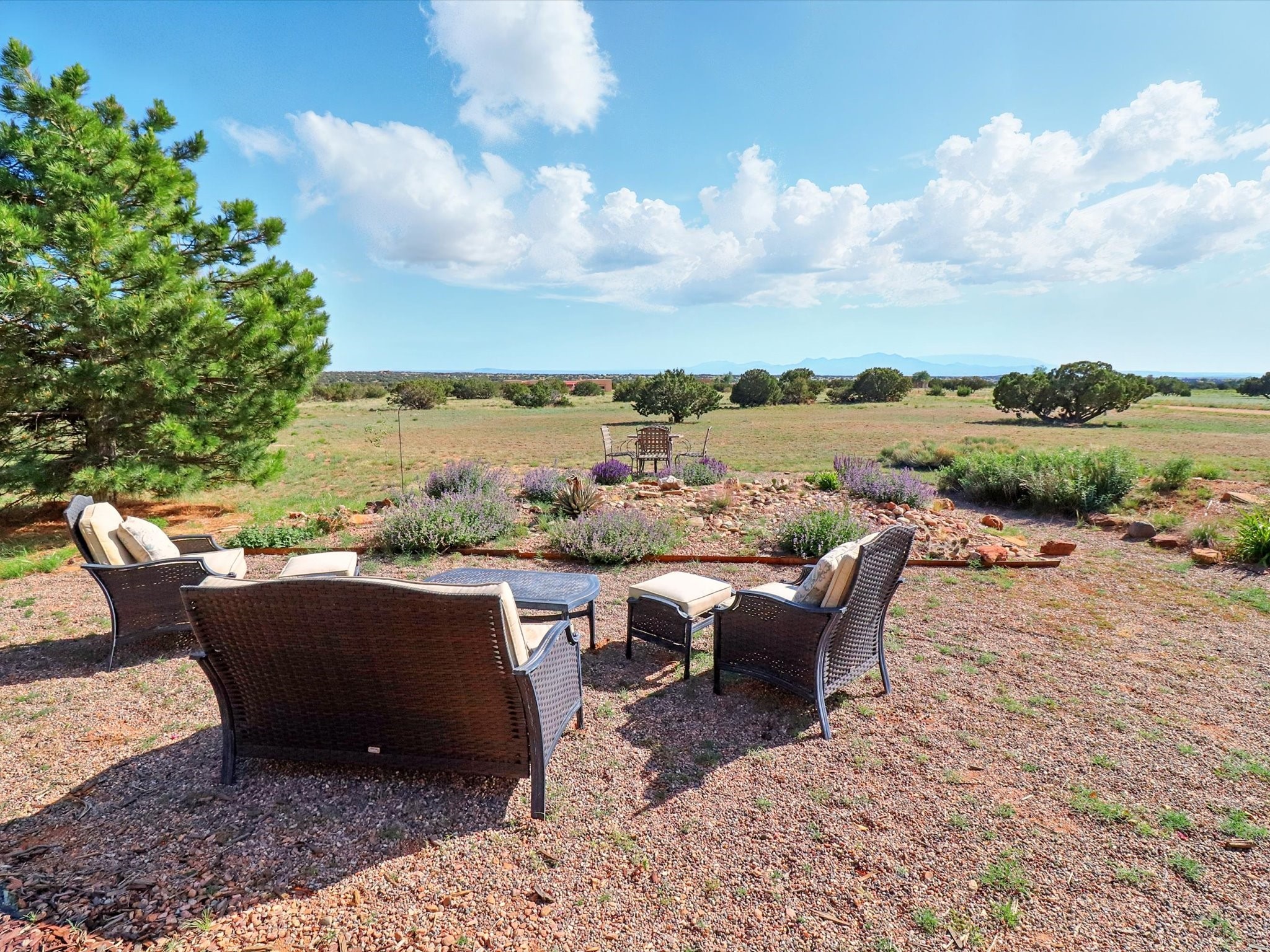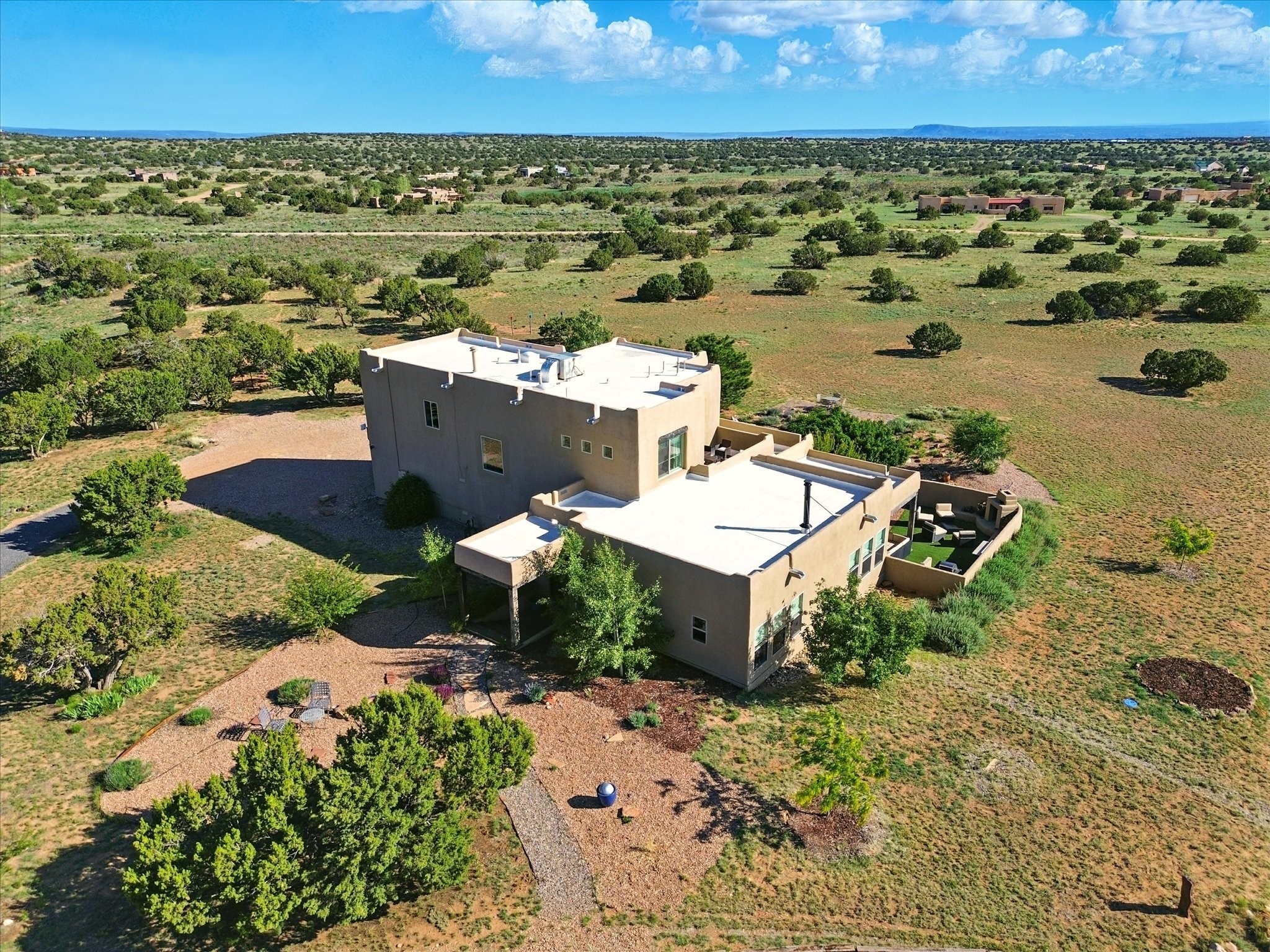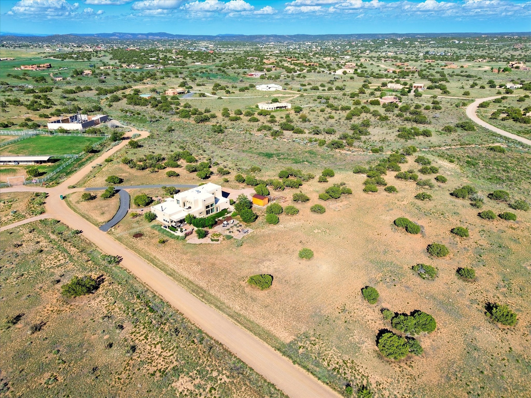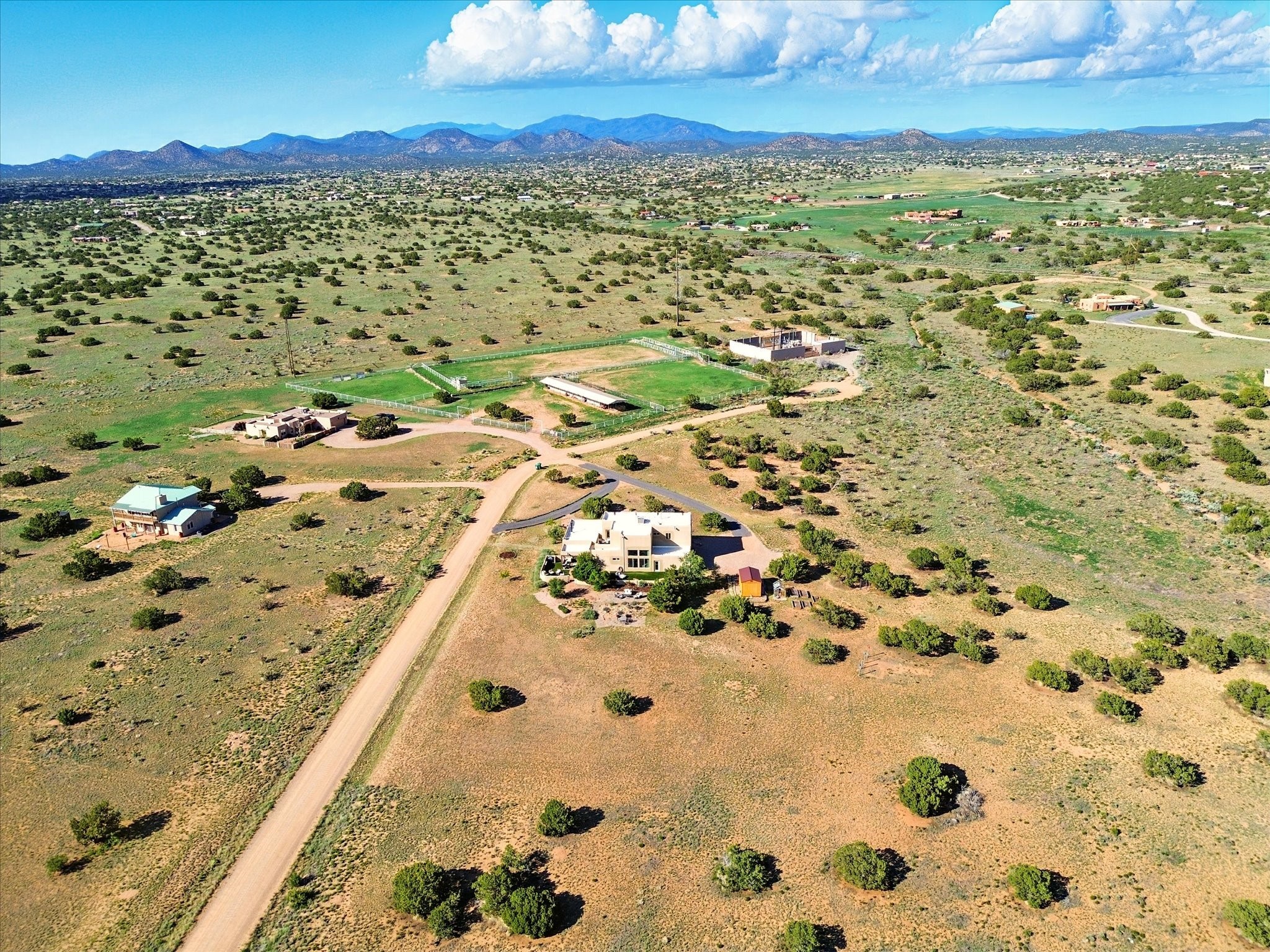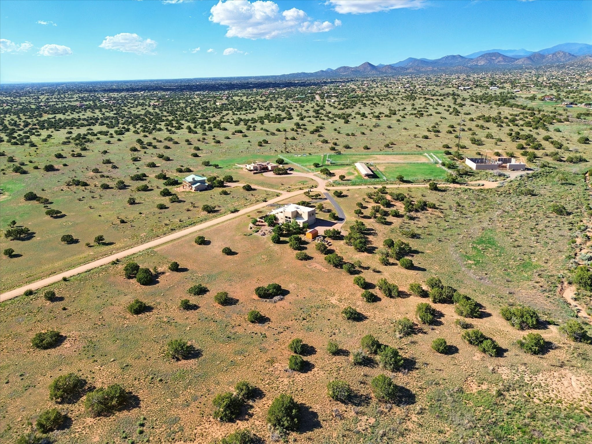 Experience breathtaking views surrounding this exceptional property located on just over 4 acres of pristine high desert landscape. This stunning home blends the timeless charm of Pueblo-style architecture with the inviting touches of modern farmhouse design including an expansive 1,000 square foot addition completed in 2020. The versatile floor plan is anchored by a beautifully updated gourmet kitchen featuring a Sub-Zero refrigerator and custom finishes with ample workspace, and a seamless flow for entertaining. On the main floor you will find that the primary bedroom showcases soaring ceilings with a picturesque view and private access to the outdoor courtyard. Complete with an oversized closet area and beautifully renovated bathroom that is perfect for soaking in the bathtub while taking in the view from the large picture window right above. The second floor consists of two bedrooms, a bonus room and two bathrooms. The balcony off the ensuite bedroom is ideal for soaking in the mountains and serene sunsets. Step outside to enjoy the covered portal and cozy up by the outdoor wood-burning fireplace. Fruit trees dot the landscape, adding character and a touch of sweetness to your retreat. Backed by peaceful green space and only minutes from the Galisteo Basin preserve, Santa Fe Rail Trail, this property offers the perfect blend of tranquility, access to nature and refined living. Do not miss this rare opportunity to own a home that truly captures the spirit and beauty of New Mexico.Pre-listing inspection report is available.