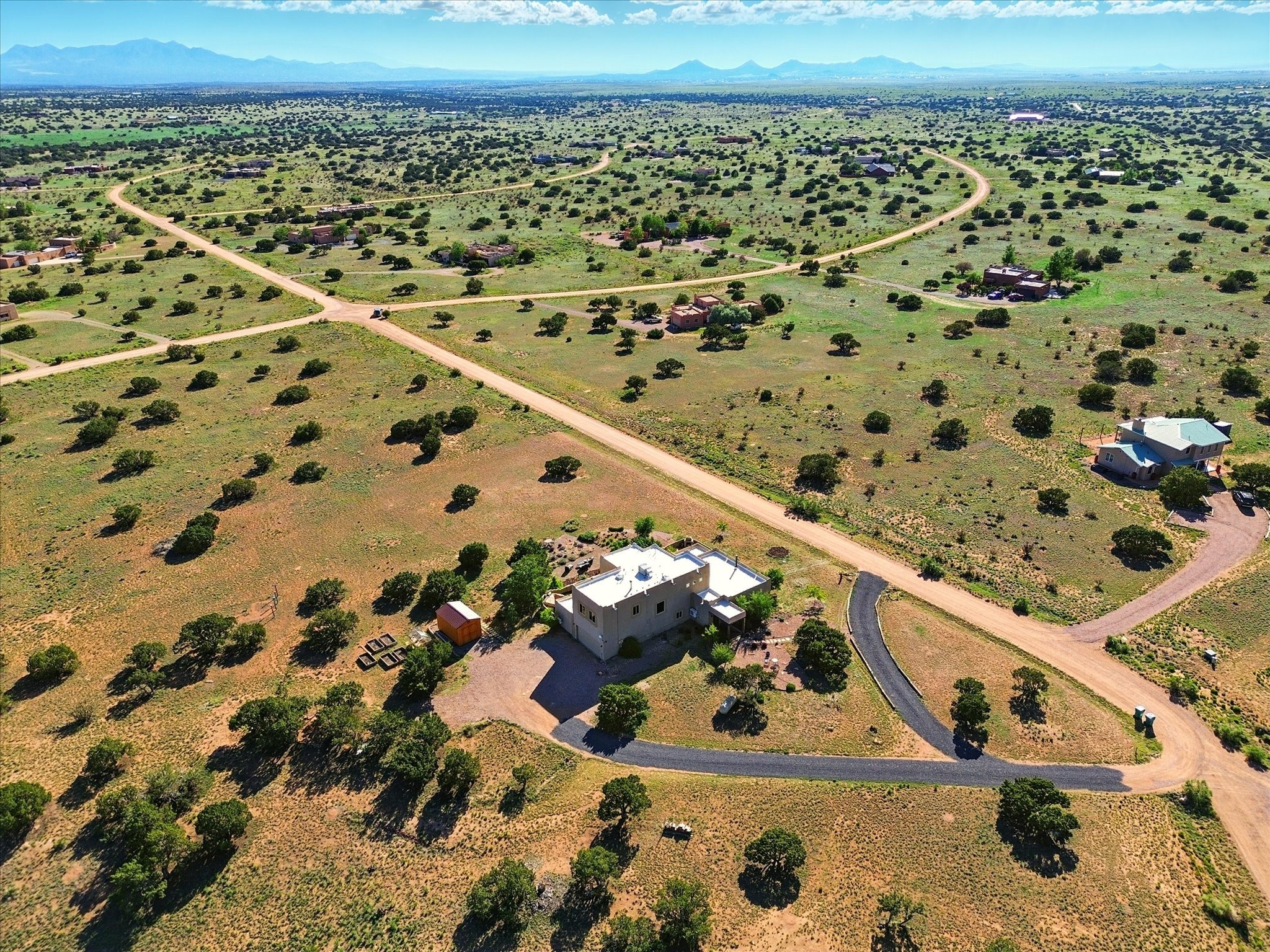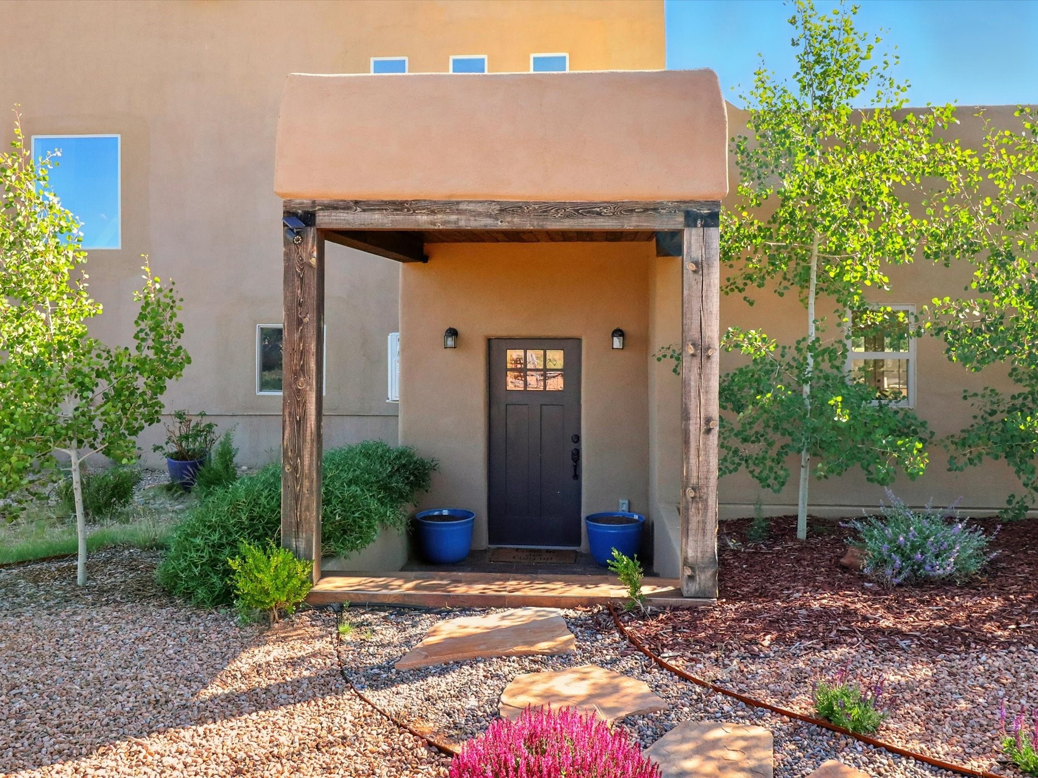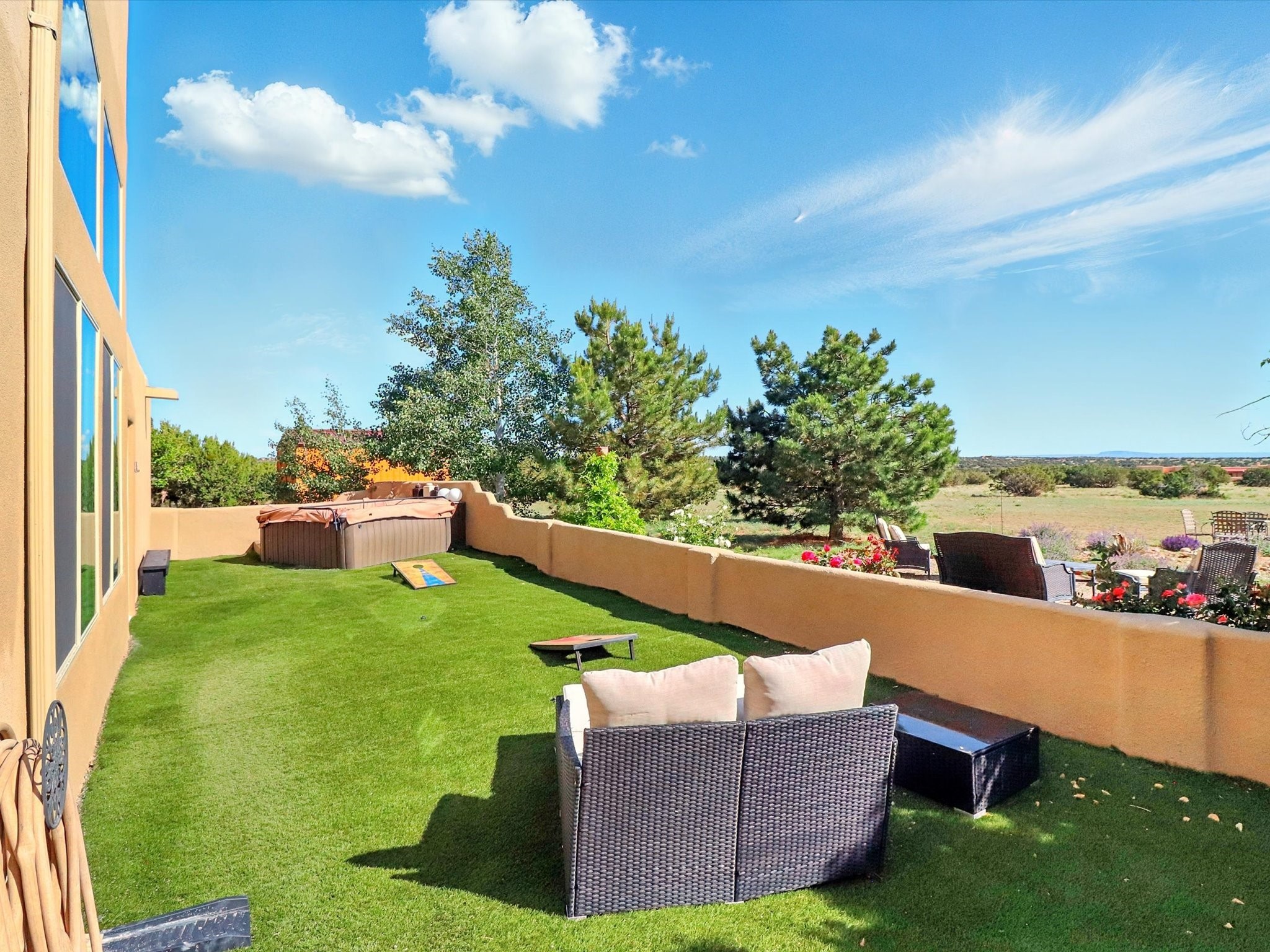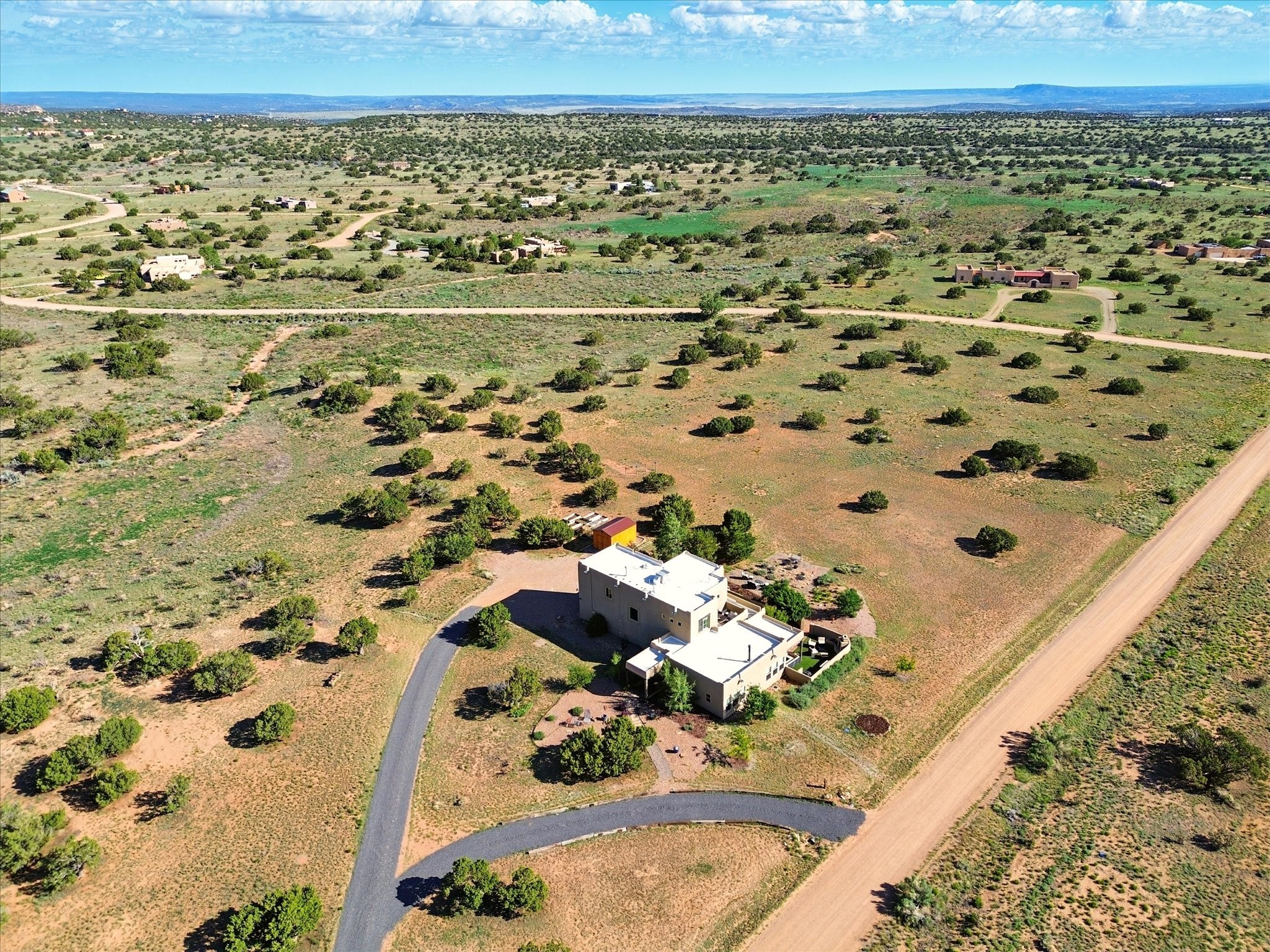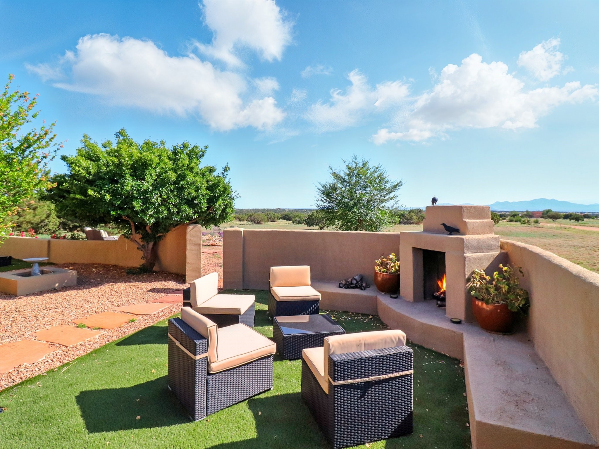 Experience breathtaking views surrounding this exceptional property located on just over 4 acres of pristine high desert landscape. This stunning home blends the timeless charm of Pueblo-style architecture with the inviting touches of modern farmhouse design including an expansive 1,000 square foot addition completed in 2020. The versatile floor plan is anchored by a beautifully updated gourmet kitchen featuring a Sub-Zero refrigerator and custom finishes with ample workspace, and a seamless flow for entertaining. On the main floor you will find that the primary bedroom showcases soaring ceilings with a picturesque view and private access to the outdoor courtyard. Complete with an oversized closet area and beautifully renovated bathroom that is perfect for soaking in the bathtub while taking in the view from the large picture window right above. The second floor consists of two bedrooms, a bonus room and two bathrooms. The balcony off the ensuite bedroom is ideal for soaking in the mountains and serene sunsets. Step outside to enjoy the covered portal and cozy up by the outdoor wood-burning fireplace. Fruit trees dot the landscape, adding character and a touch of sweetness to your retreat. Backed by peaceful green space and only minutes from the Galisteo Basin preserve, Santa Fe Rail Trail, this property offers the perfect blend of tranquility, access to nature and refined living. Do not miss this rare opportunity to own a home that truly captures the spirit and beauty of New Mexico.Pre-listing inspection report is available.