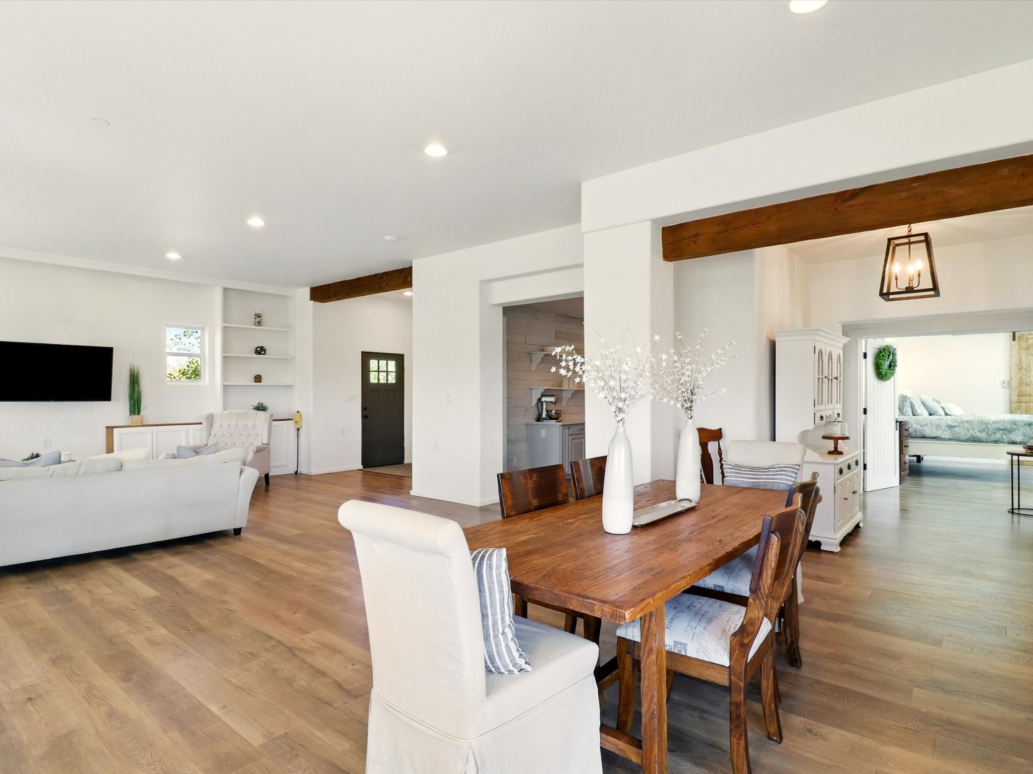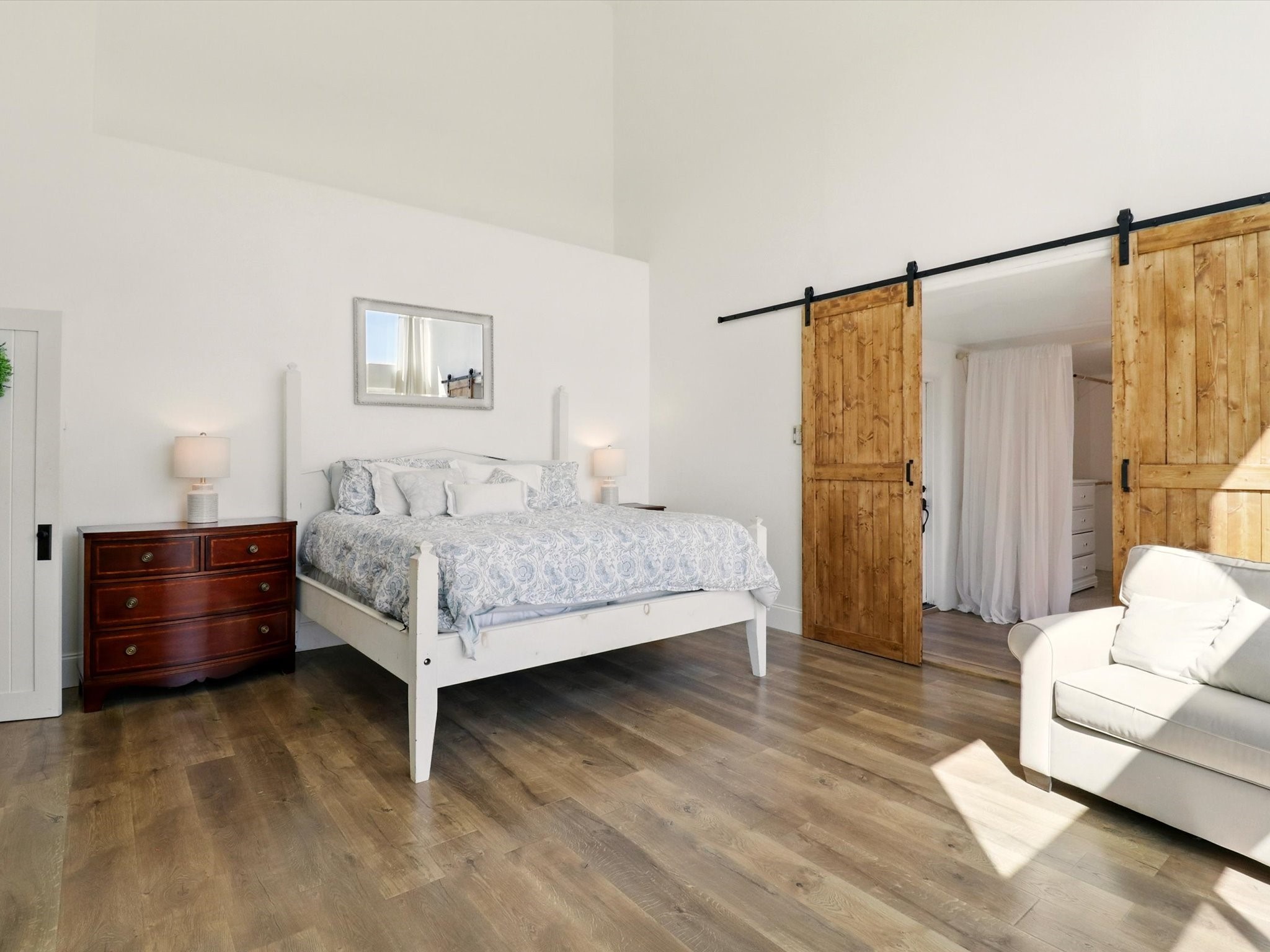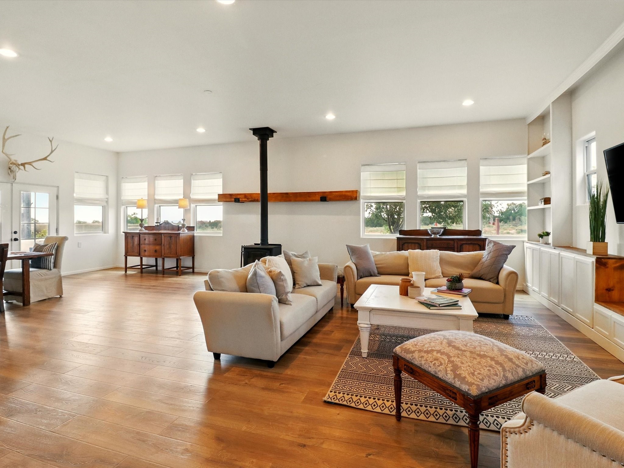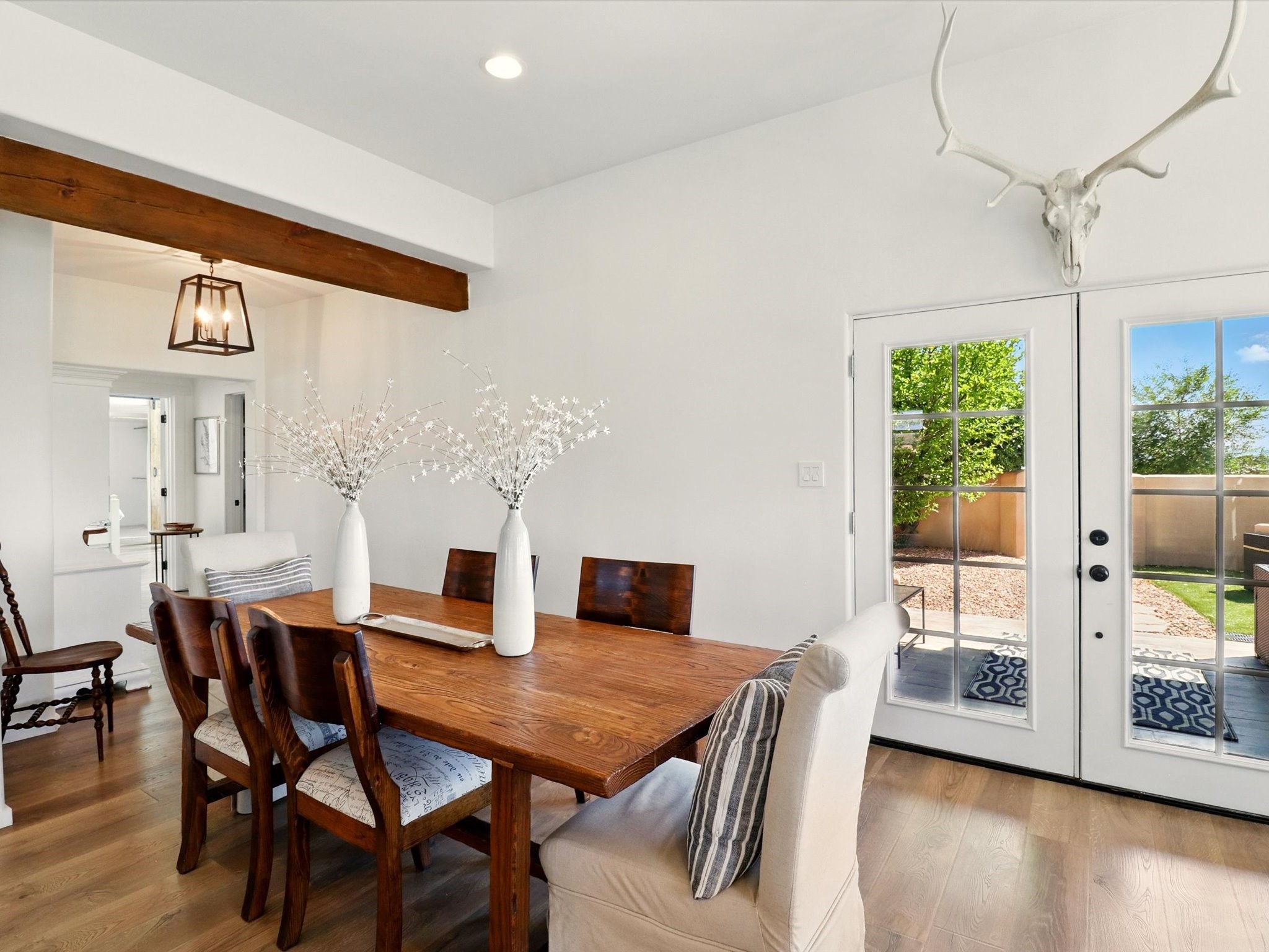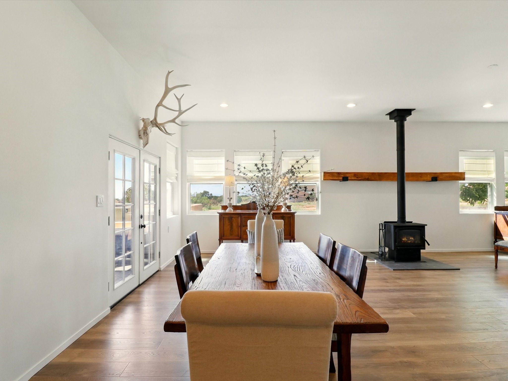 Experience breathtaking views surrounding this exceptional property located on just over 4 acres of pristine high desert landscape. This stunning home blends the timeless charm of Pueblo-style architecture with the inviting touches of modern farmhouse design including an expansive 1,000 square foot addition completed in 2020. The versatile floor plan is anchored by a beautifully updated gourmet kitchen featuring a Sub-Zero refrigerator and custom finishes with ample workspace, and a seamless flow for entertaining. On the main floor you will find that the primary bedroom showcases soaring ceilings with a picturesque view and private access to the outdoor courtyard. Complete with an oversized closet area and beautifully renovated bathroom that is perfect for soaking in the bathtub while taking in the view from the large picture window right above. The second floor consists of two bedrooms, a bonus room and two bathrooms. The balcony off the ensuite bedroom is ideal for soaking in the mountains and serene sunsets. Step outside to enjoy the covered portal and cozy up by the outdoor wood-burning fireplace. Fruit trees dot the landscape, adding character and a touch of sweetness to your retreat. Backed by peaceful green space and only minutes from the Galisteo Basin preserve, Santa Fe Rail Trail, this property offers the perfect blend of tranquility, access to nature and refined living. Do not miss this rare opportunity to own a home that truly captures the spirit and beauty of New Mexico.Pre-listing inspection report is available.