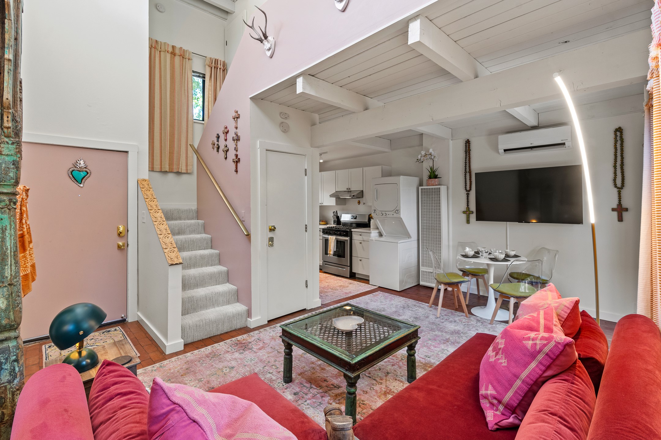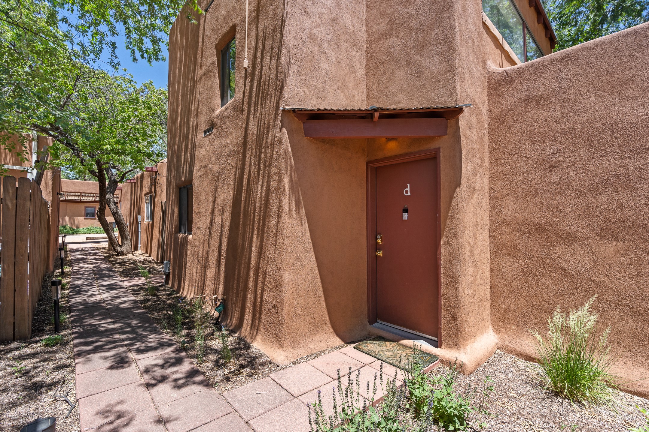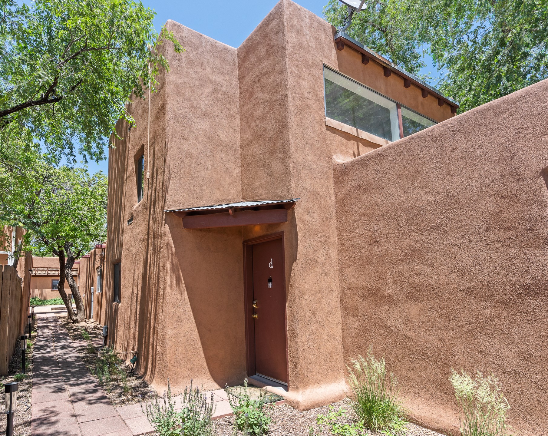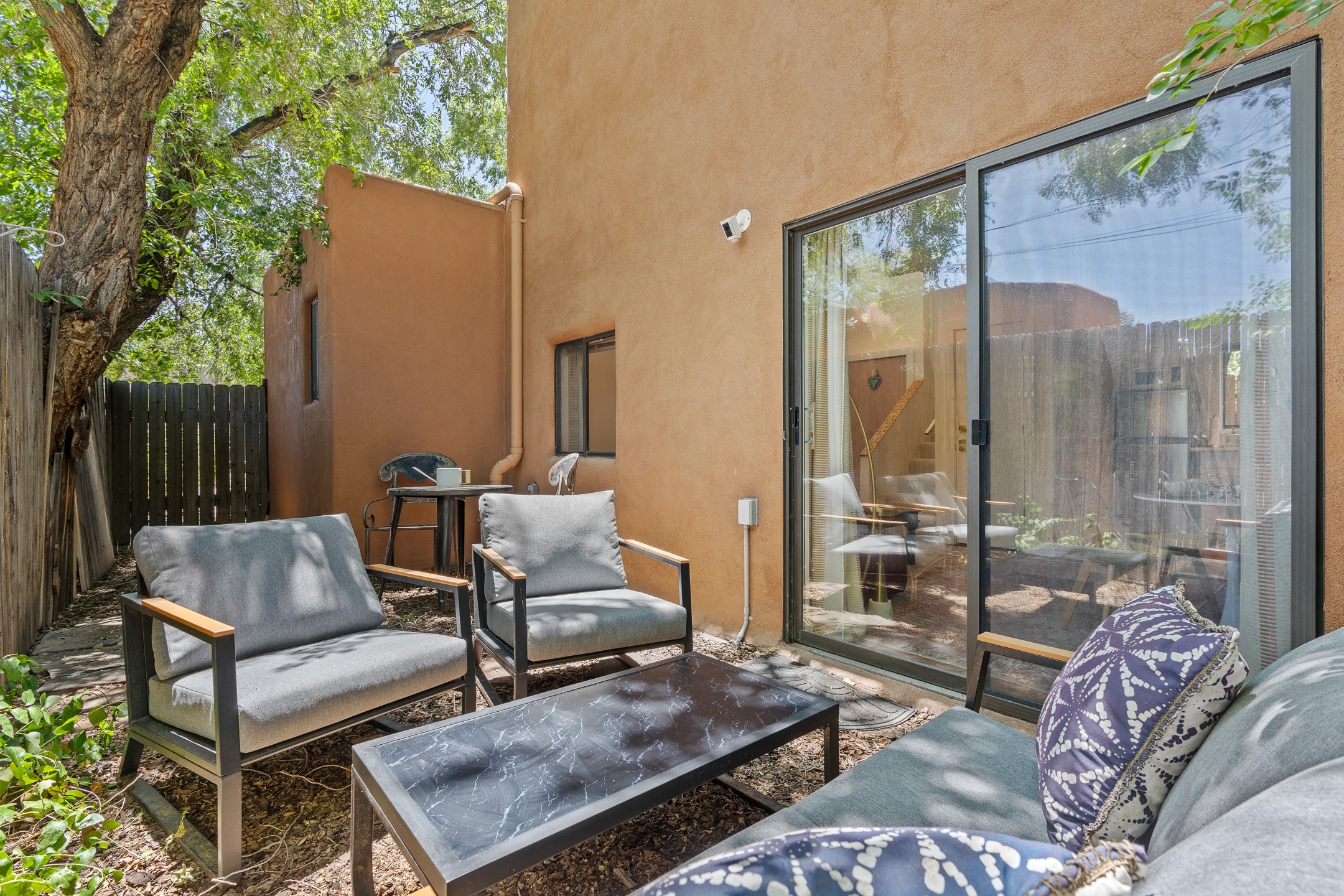 Welcome to this charming and thoughtfully updated 1-bedroom, 1-bath loft-style condo with approximately 588 square feet of light and bright living space. Ideally located in central Santa Fe, this sweet home is just minutes from Trader Joe's, restaurants, shopping, parks, and schools. Soaring ceilings and warm brick floors create an inviting atmosphere in the main living area, while the updated kitchen features sleek stainless steel appliances, quartz countertops, and a washer and dryer for added convenience. Minisplit systems upstairs and down provide efficient heating and cooling year-round. Upstairs, the cozy loft bedroom offers privacy and character with whitewashed wood ceilings and an ensuite bath adorned with playful and cheerful aesthetic. Step outside to your private backyard patio--perfect for morning coffee, evening drinks, or casual barbecues with friends. Additional highlights include a designated parking space and a low-maintenance lifestyle in a cozy condo community. Whether you're looking for a starter home, a pied--terre, or a charming investment property, this gem checks all the boxes.