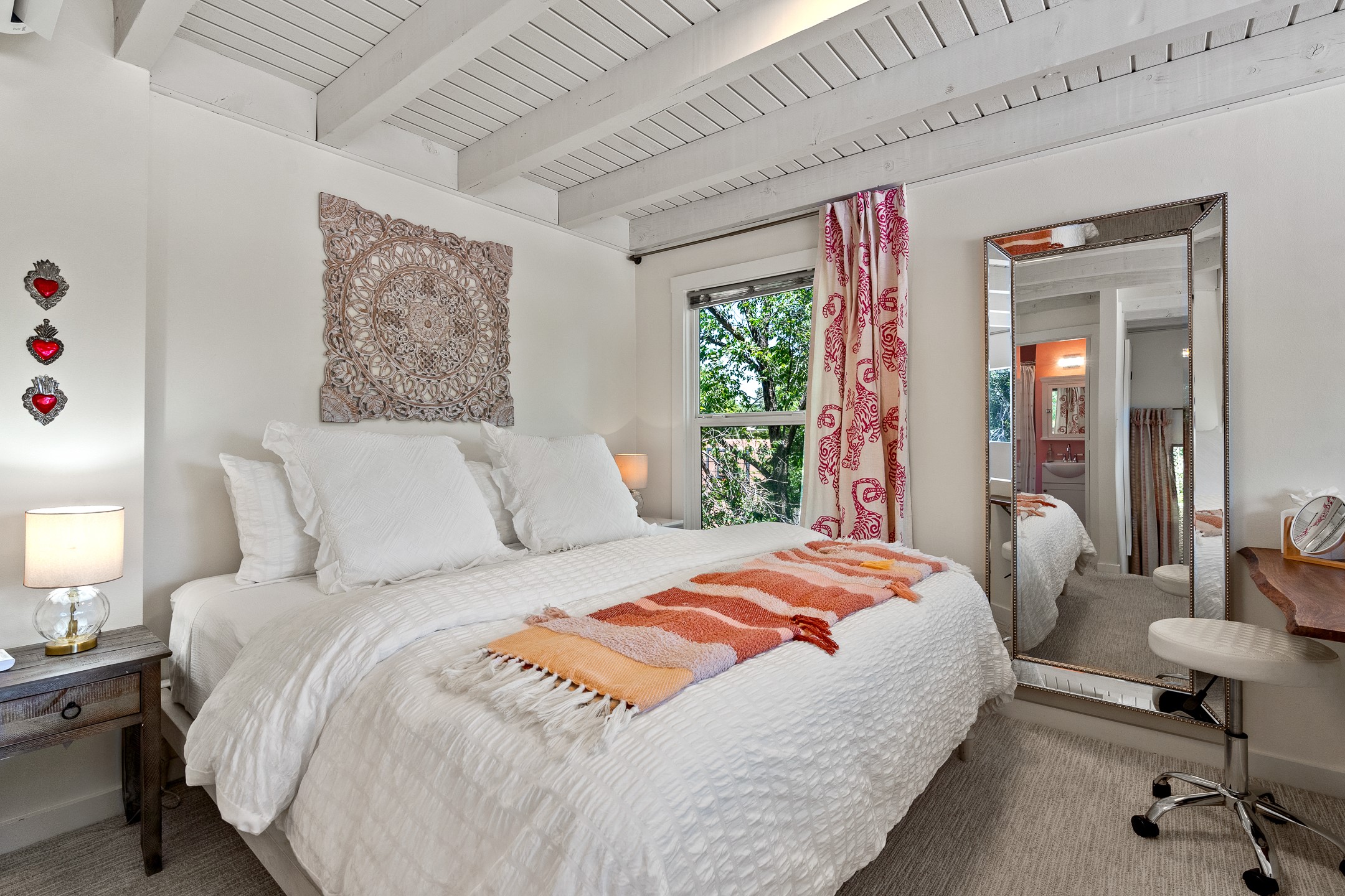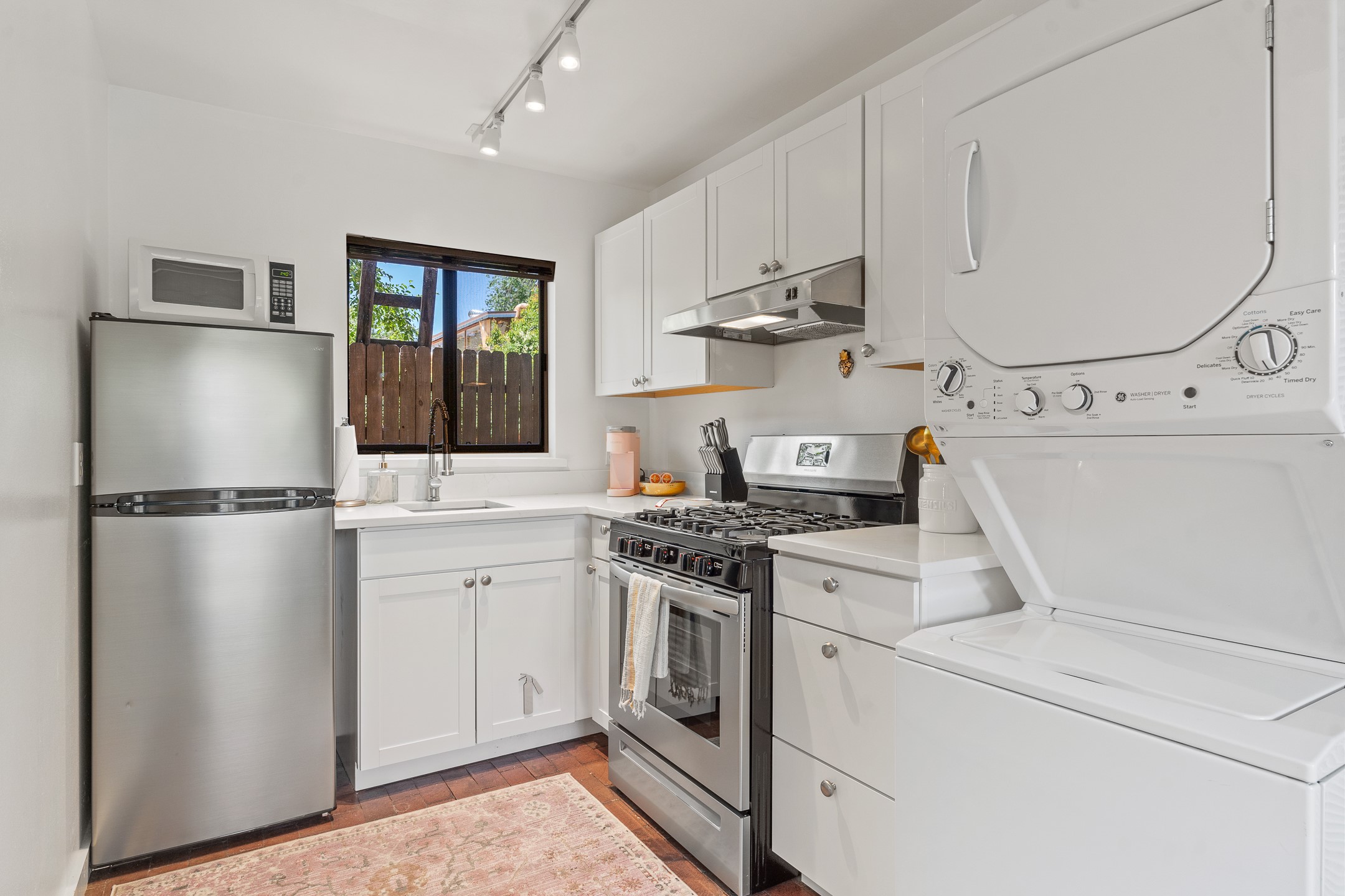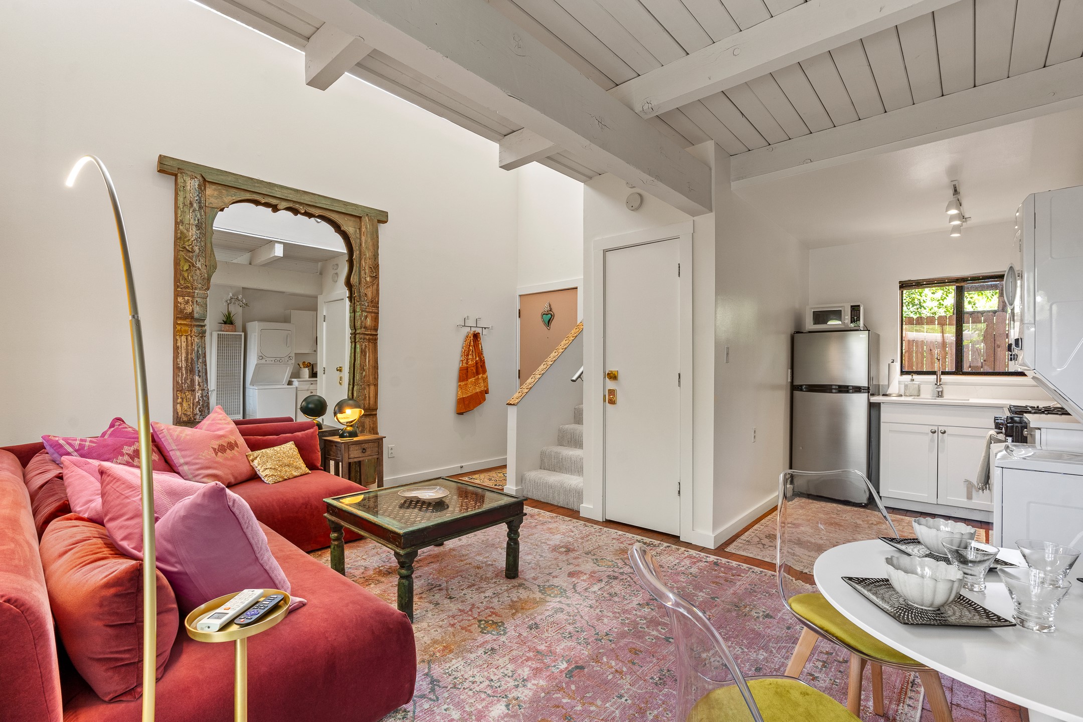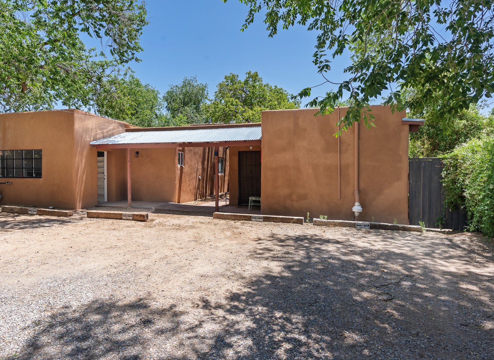 Welcome to this charming and thoughtfully updated 1-bedroom, 1-bath loft-style condo with approximately 588 square feet of light and bright living space. Ideally located in central Santa Fe, this sweet home is just minutes from Trader Joe's, restaurants, shopping, parks, and schools. Soaring ceilings and warm brick floors create an inviting atmosphere in the main living area, while the updated kitchen features sleek stainless steel appliances, quartz countertops, and a washer and dryer for added convenience. Minisplit systems upstairs and down provide efficient heating and cooling year-round. Upstairs, the cozy loft bedroom offers privacy and character with whitewashed wood ceilings and an ensuite bath adorned with playful and cheerful aesthetic. Step outside to your private backyard patio--perfect for morning coffee, evening drinks, or casual barbecues with friends. Additional highlights include a designated parking space and a low-maintenance lifestyle in a cozy condo community. Whether you're looking for a starter home, a pied--terre, or a charming investment property, this gem checks all the boxes.