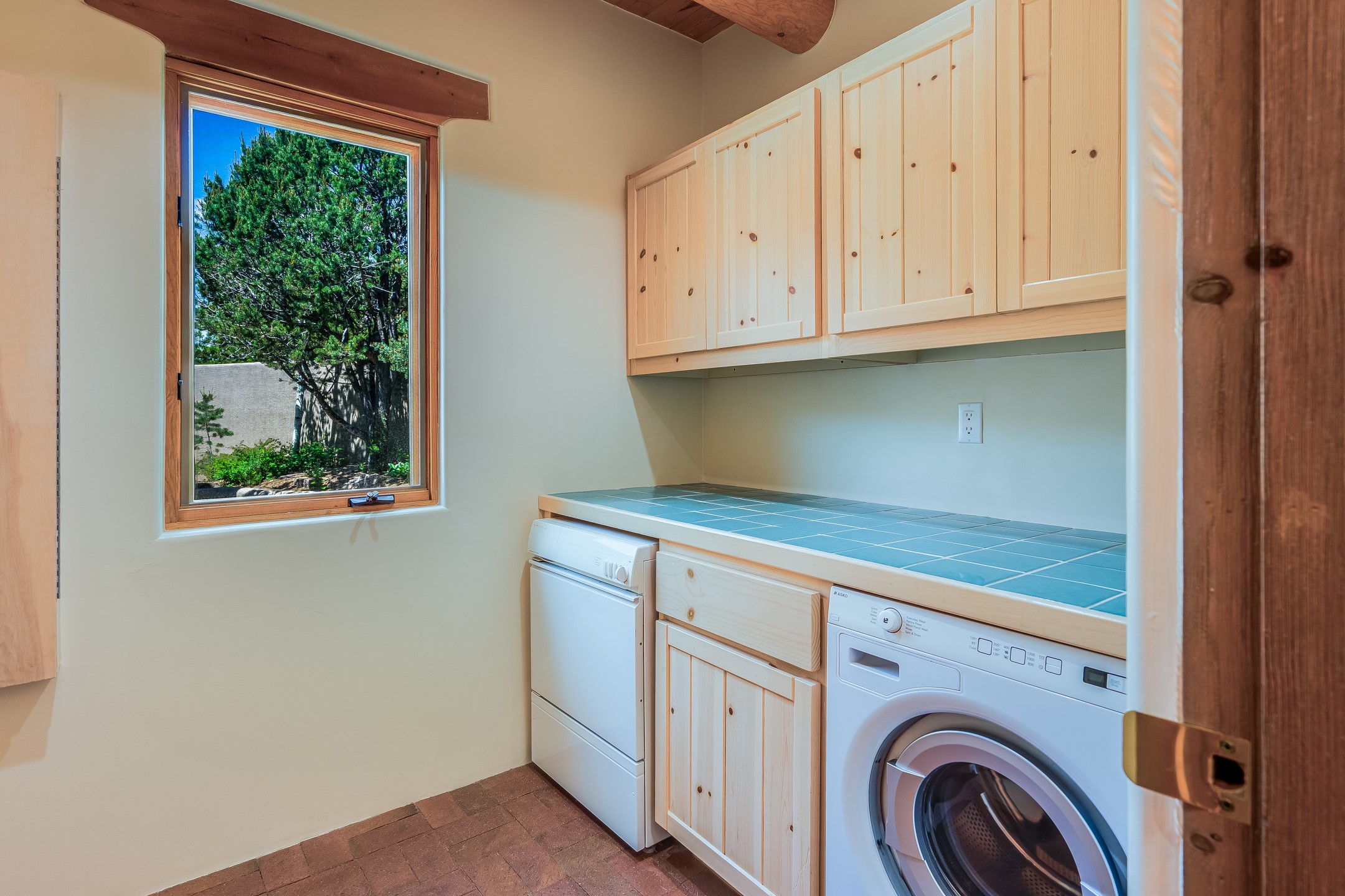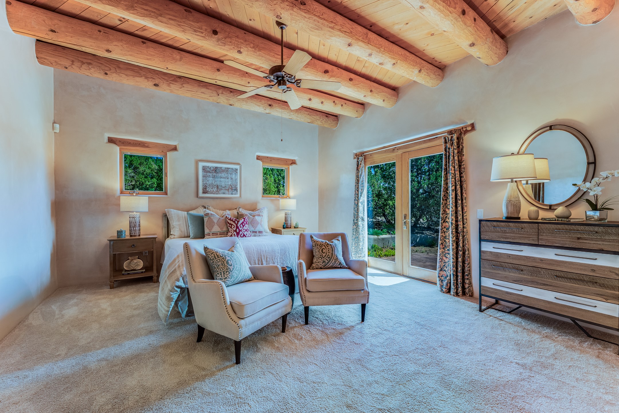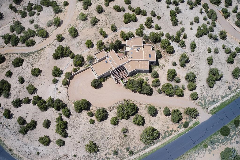 Located in Estates II at Las Campanas, this 3,267* sq. ft. home provides a split floor plan - master suite with a full bath, large walk-in closet, and private patio area separated from 2 guest rooms with 1 full bath. Living room, dining room, breakfast nook and kitchen in an open plan configuration. Office/den adjacent to living room. Four heating/cooling mini-splits, and radiant floor heating maintain a desirable level of comfort throughout. There's even a 220v outlet in the garage for your EV.With form and function seamlessly integrated, the sense of a relaxed elegance is promoted by the dwelling's creature comforts: tall ceilings, single-level open plan layout, large windows, natural materials, and strategically placed outdoor living areas. Contemporary touches, seen in the selections of materials, finishes, and fixtures, are balanced with the acknowledgement given toward "Santa Fe charm" through the use of plaster wall finishes, brick flooring material, and exposed kivas.Awesome views of Baldy and Sangre de Cristo mountains!
