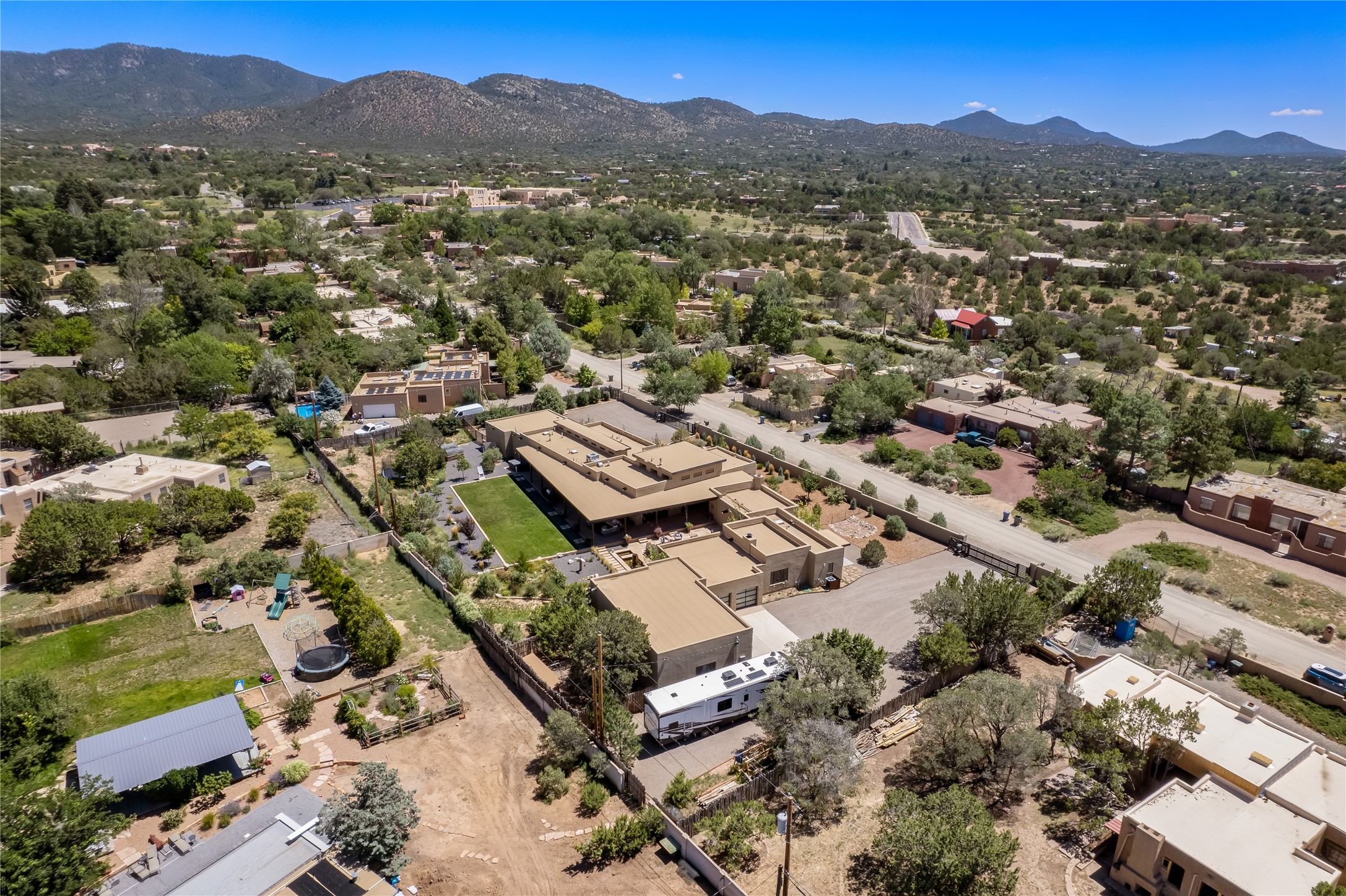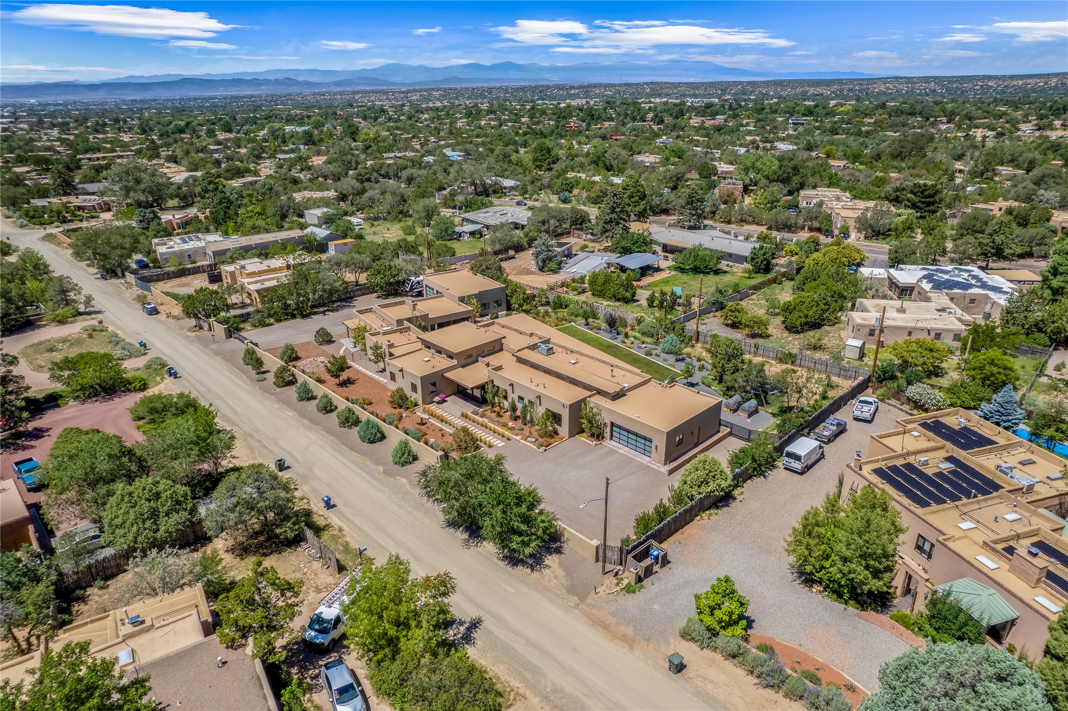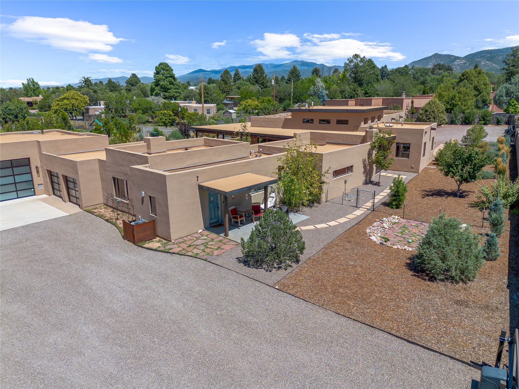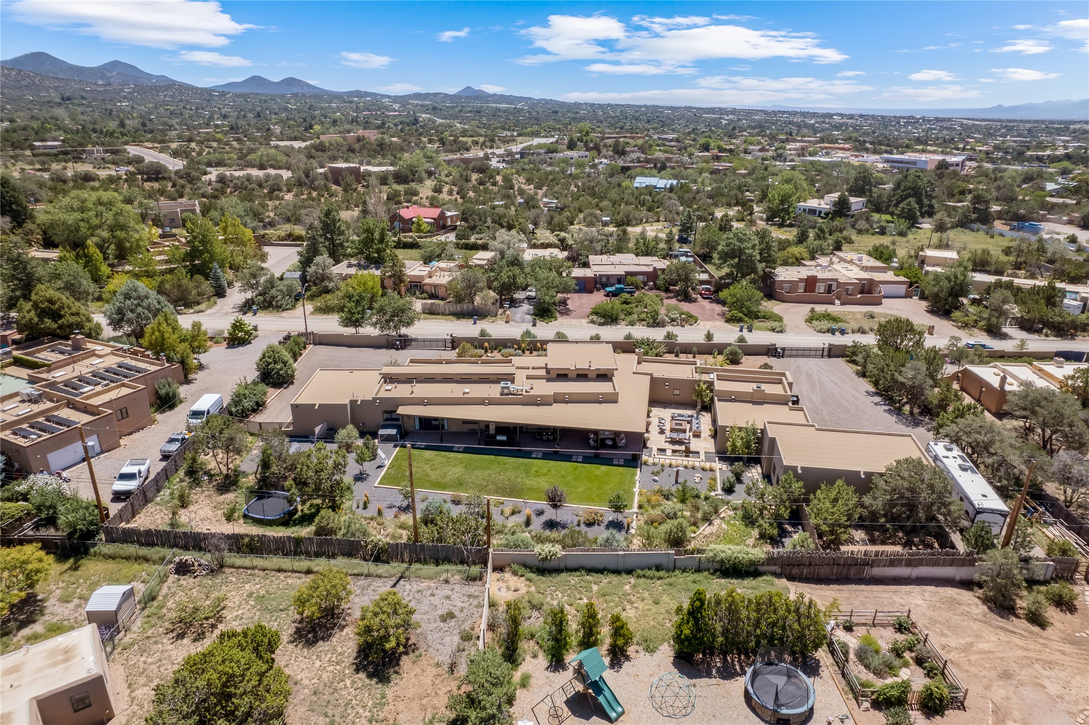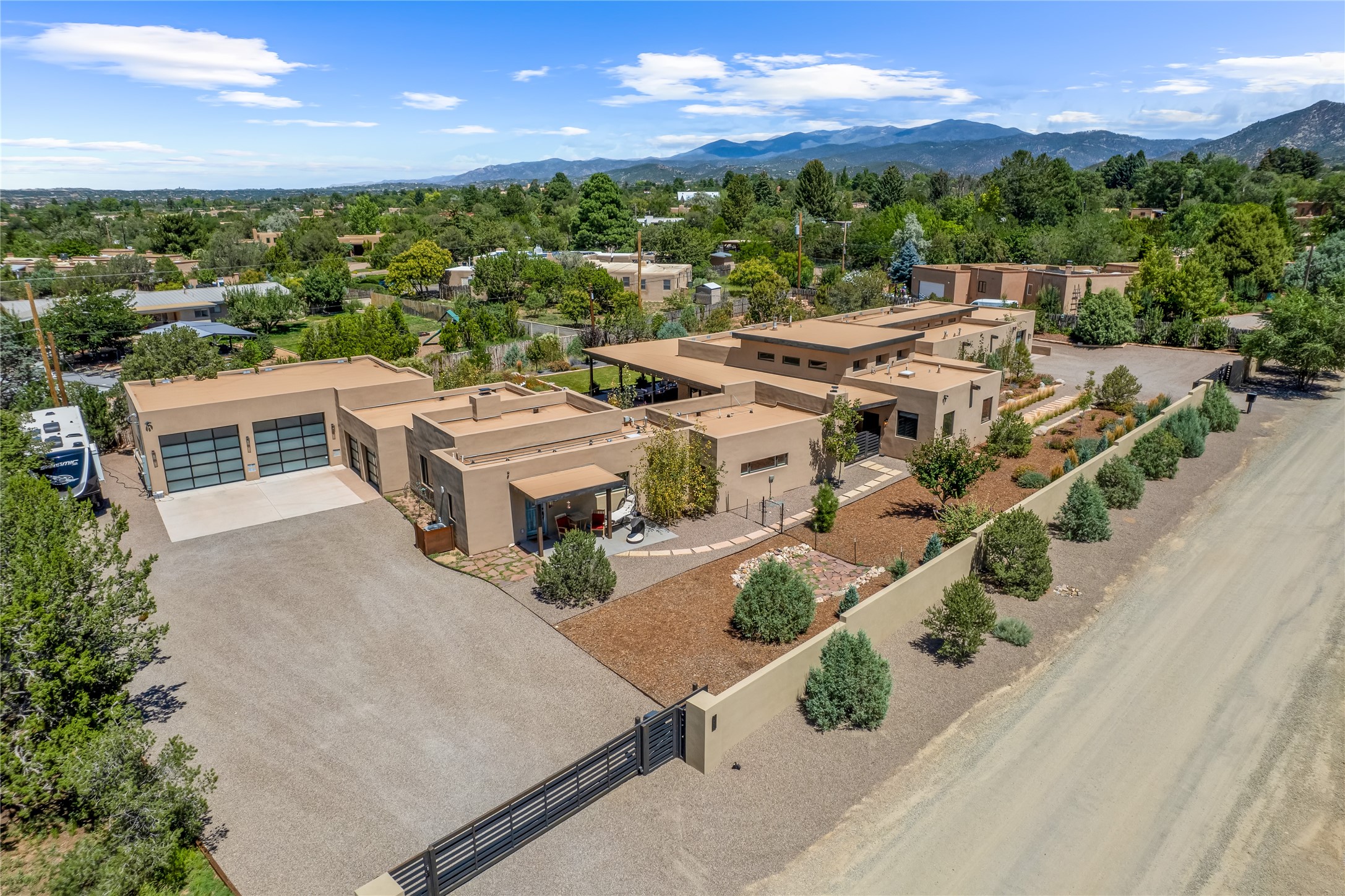 This exquisite 1-acre gated compound that's centrally located & just 2 miles from the historic Santa Fe Plaza features a masterfully designed main residence, spacious guest home, and 6 garage bays for collectors or creatives. The main home offers ~3,875 sq. ft. of refined living with Venetian plaster walls in public areas, custom cabinetry throughout, and 8-ft interior doors. The living and dining rooms feature an impressive dual aspect Ortal fireplace. Soaring ceilings and a wet bar with beverage drawers complete the living room, which opens to a ~1,700 sq. ft. covered patio. Multi-slide door systems open to this impressive patio, that includes built-in Bromic heaters and a 42 inch Wolf grill. The chef's kitchen is anchored by a Lacanche 7-burner stove, pot filler, Sub-Zero refrigerator and freezer, Wolf steam oven, Cove dishwasher and hot/cold tap. The butler's pantry has an abundance of storage, undermount lighting and Red/White EuroCave wine refrigerators. A serene primary suite includes a steam shower, soaking tub, room sized walk-in closet with island, and patio access. Smart touches include Sonos surround system, California Closets, electric patio shades, and a whole-house water filtration system. The guest house (~1,460 sq. ft.) offers generous privacy with a large living area, bedroom, and its own designer fireplace. An attached garage/storage wing (~1,853 sq. ft.) includes a standard 2-car bay plus an oversized 2+ bay garage with 10'x12' doors--ideal for small RVs, boats, or a home gym/studio. Both main and guest garages include EV hookup capabilities. Outdoors, enjoy lush landscaping by McCumber Fine Gardens, fruit trees, raised garden beds, a custom firepit and water feature, and ample space for entertaining--easily accommodating up to 100 guests. Additional highlights include steel electric gates, frosted glass garage doors, radiant heat in main home, and the most luxurious laundry/craft room you will find. This gated retreat is a one-of-a-kind compound.
