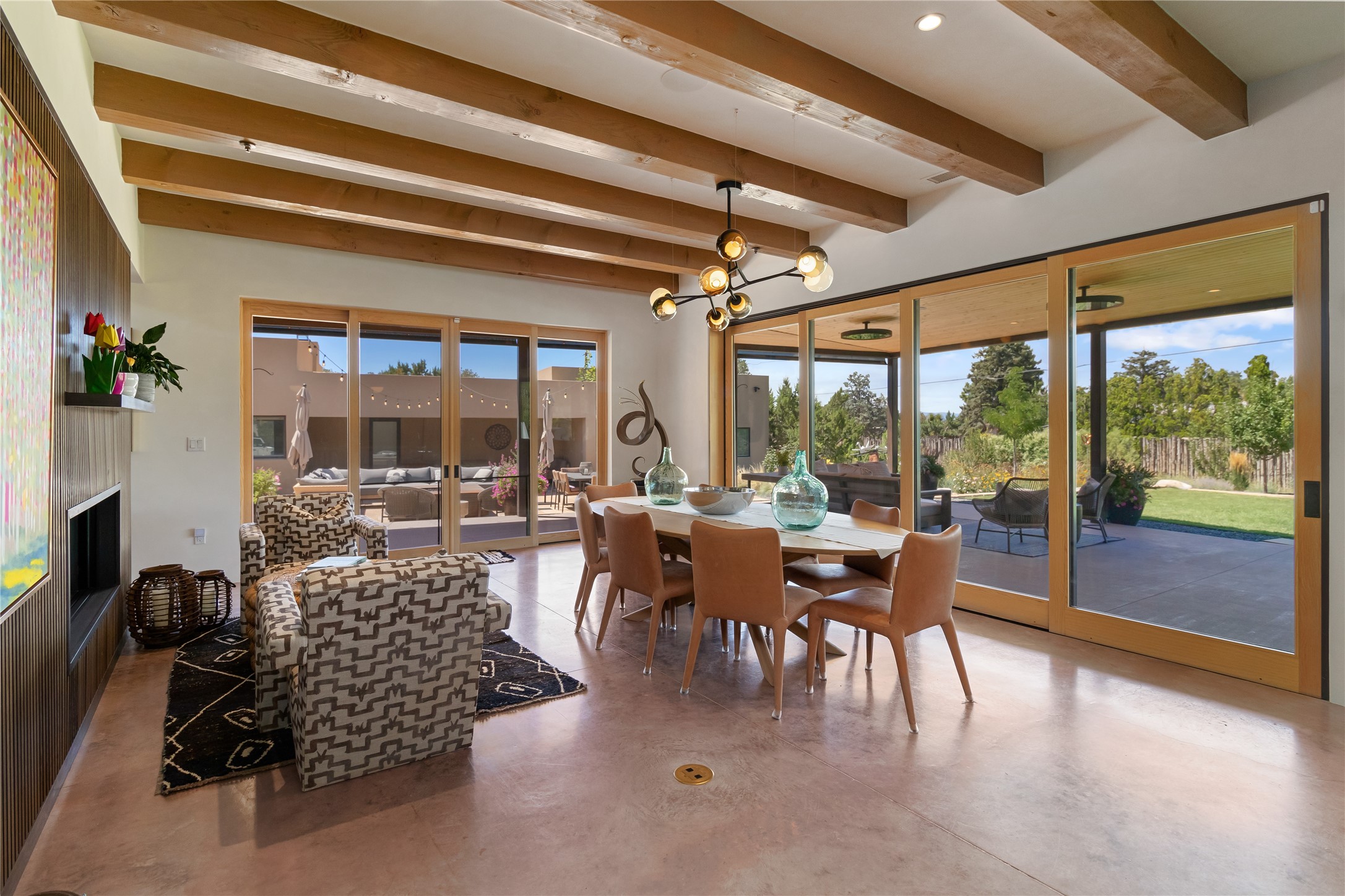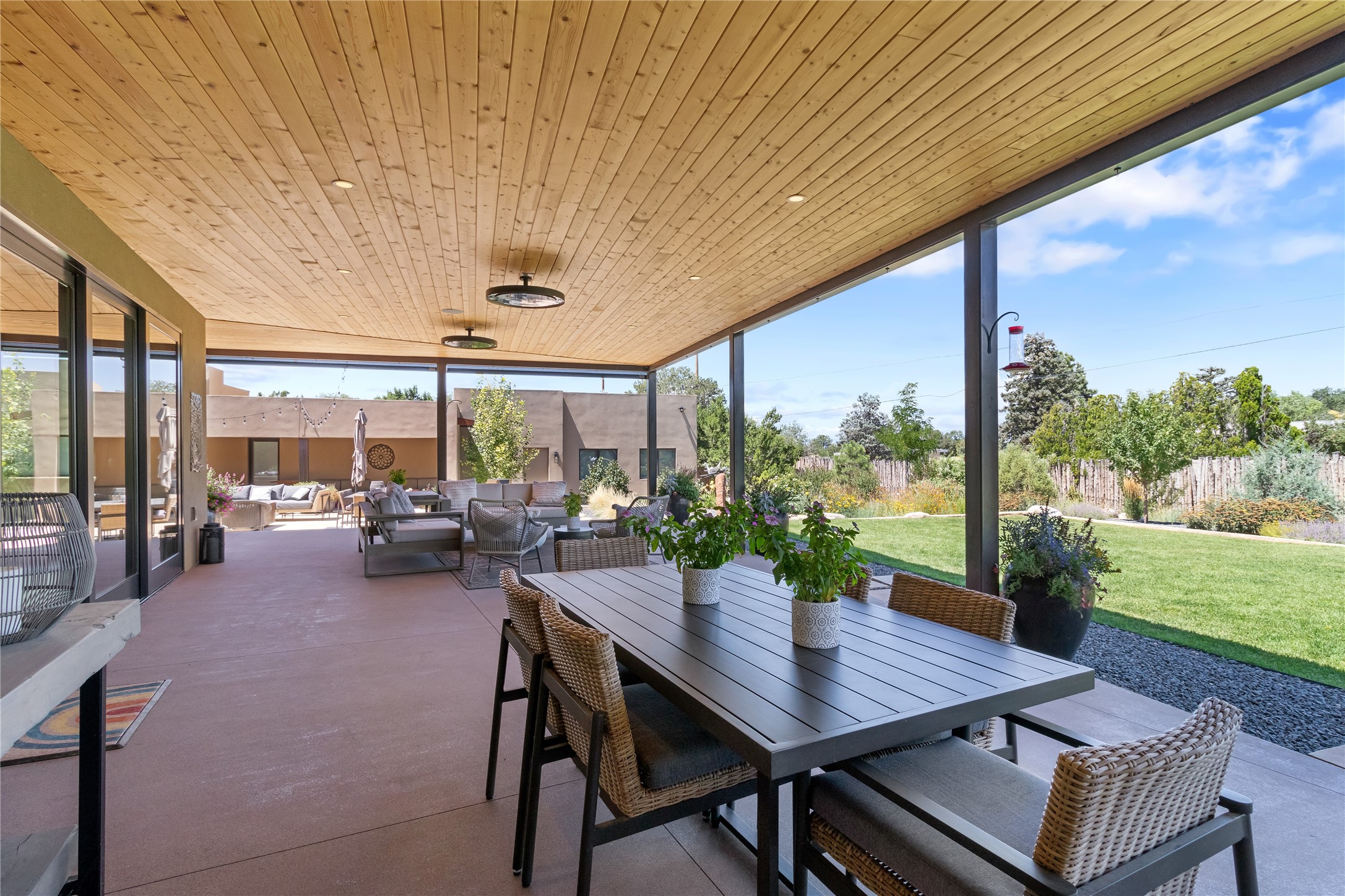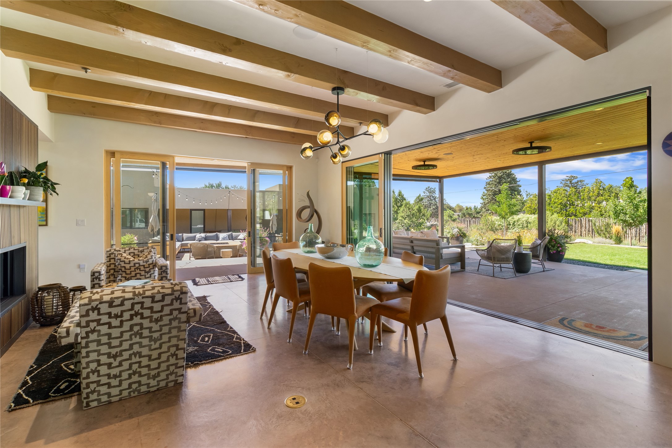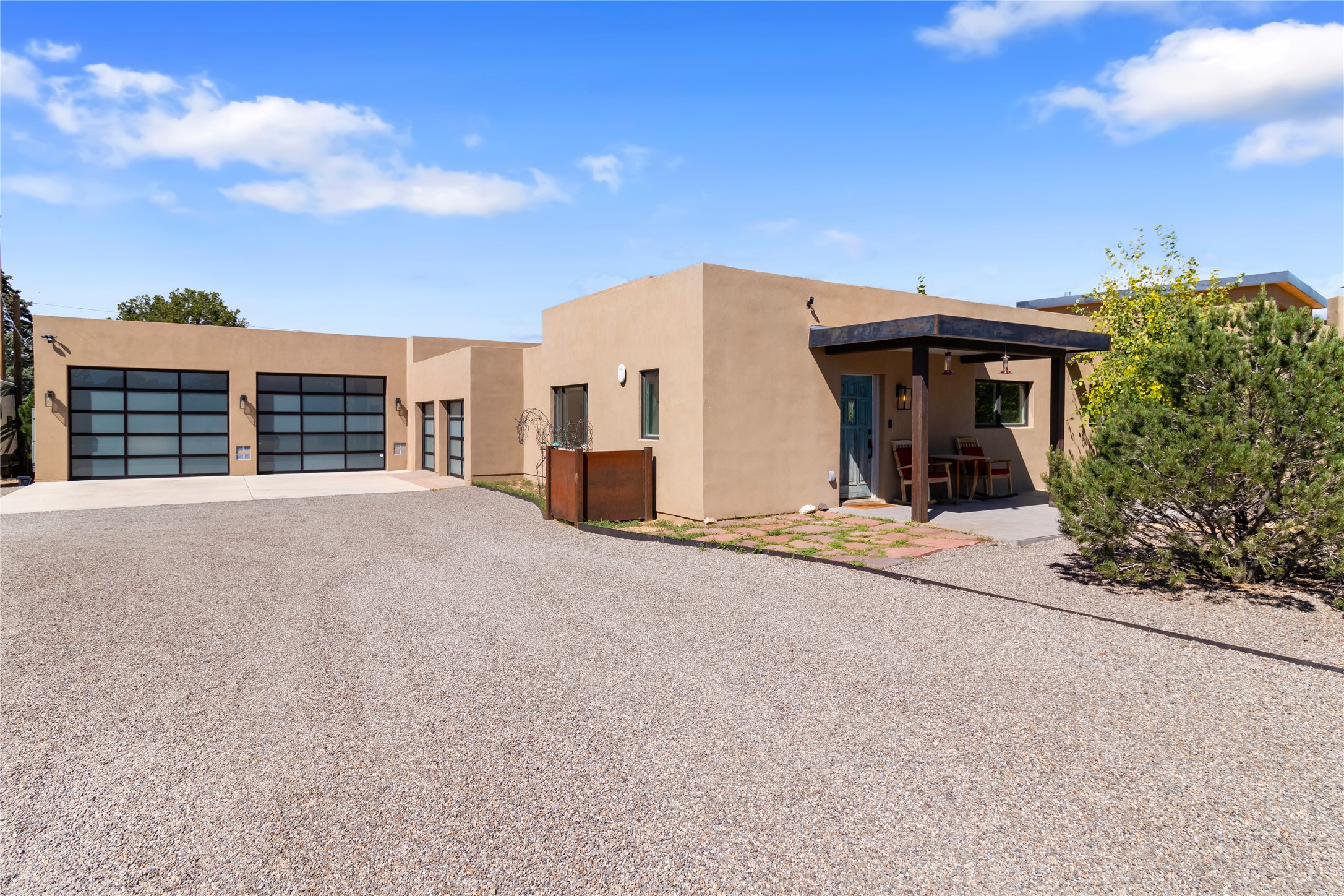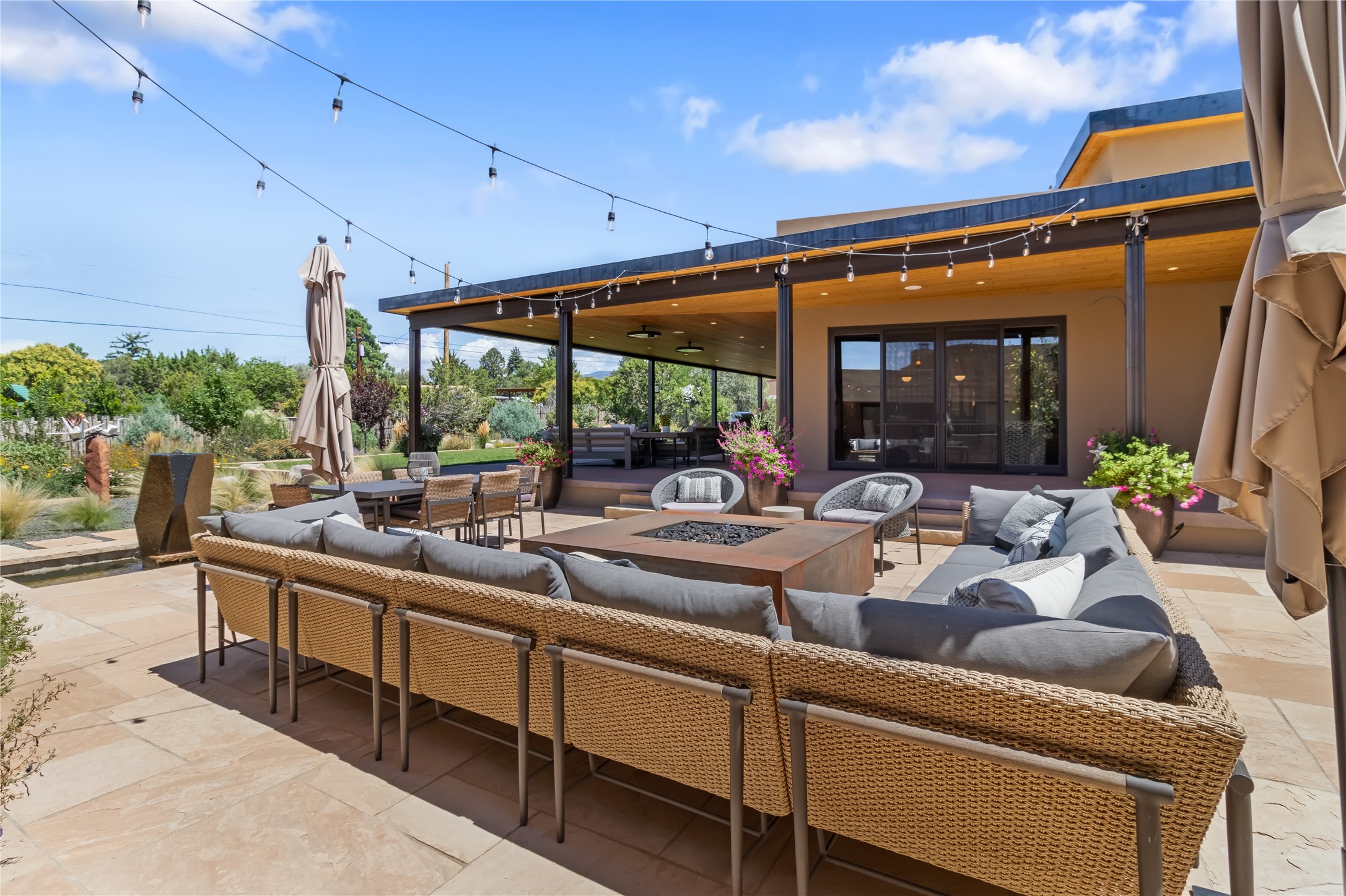 This exquisite 1-acre gated compound that's centrally located & just 2 miles from the historic Santa Fe Plaza features a masterfully designed main residence, spacious guest home, and 6 garage bays for collectors or creatives. The main home offers ~3,875 sq. ft. of refined living with Venetian plaster walls in public areas, custom cabinetry throughout, and 8-ft interior doors. The living and dining rooms feature an impressive dual aspect Ortal fireplace. Soaring ceilings and a wet bar with beverage drawers complete the living room, which opens to a ~1,700 sq. ft. covered patio. Multi-slide door systems open to this impressive patio, that includes built-in Bromic heaters and a 42 inch Wolf grill. The chef's kitchen is anchored by a Lacanche 7-burner stove, pot filler, Sub-Zero refrigerator and freezer, Wolf steam oven, Cove dishwasher and hot/cold tap. The butler's pantry has an abundance of storage, undermount lighting and Red/White EuroCave wine refrigerators. A serene primary suite includes a steam shower, soaking tub, room sized walk-in closet with island, and patio access. Smart touches include Sonos surround system, California Closets, electric patio shades, and a whole-house water filtration system. The guest house (~1,460 sq. ft.) offers generous privacy with a large living area, bedroom, and its own designer fireplace. An attached garage/storage wing (~1,853 sq. ft.) includes a standard 2-car bay plus an oversized 2+ bay garage with 10'x12' doors--ideal for small RVs, boats, or a home gym/studio. Both main and guest garages include EV hookup capabilities. Outdoors, enjoy lush landscaping by McCumber Fine Gardens, fruit trees, raised garden beds, a custom firepit and water feature, and ample space for entertaining--easily accommodating up to 100 guests. Additional highlights include steel electric gates, frosted glass garage doors, radiant heat in main home, and the most luxurious laundry/craft room you will find. This gated retreat is a one-of-a-kind compound.