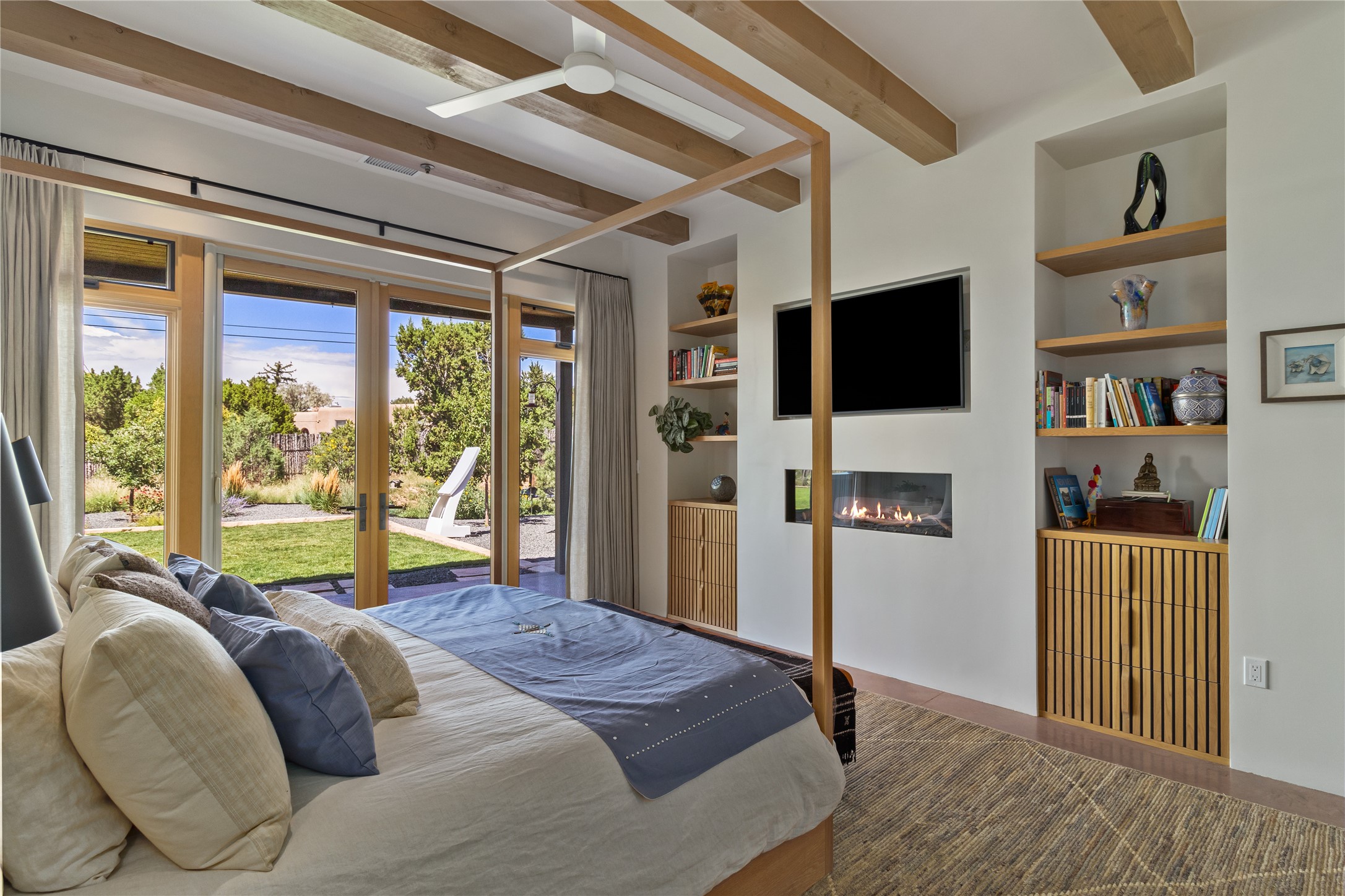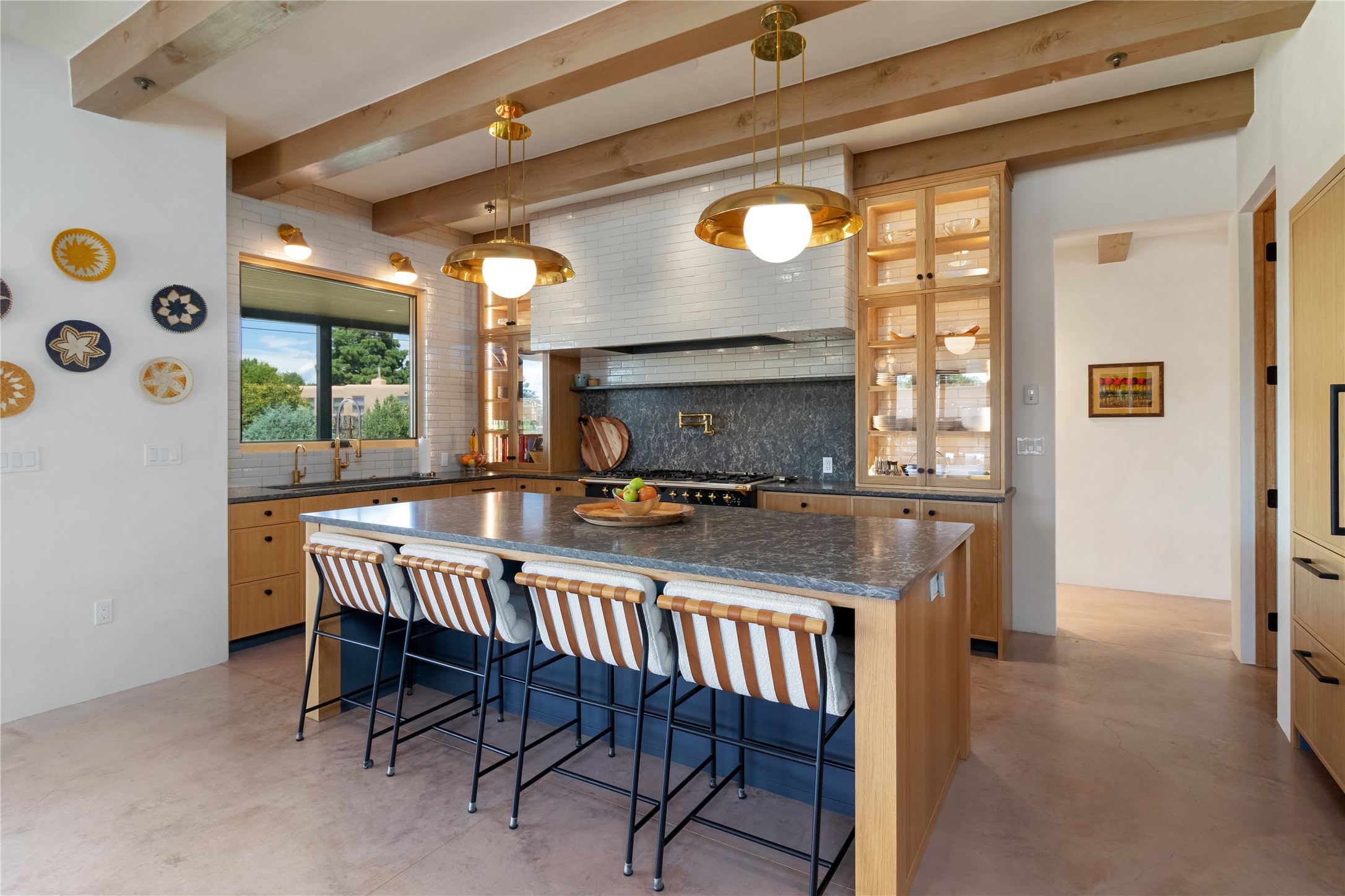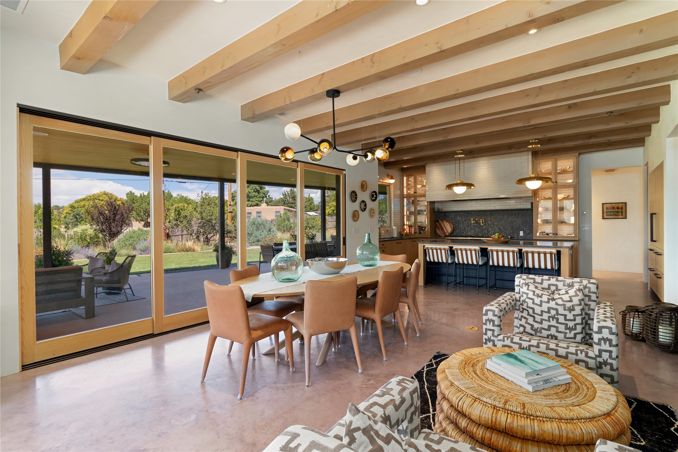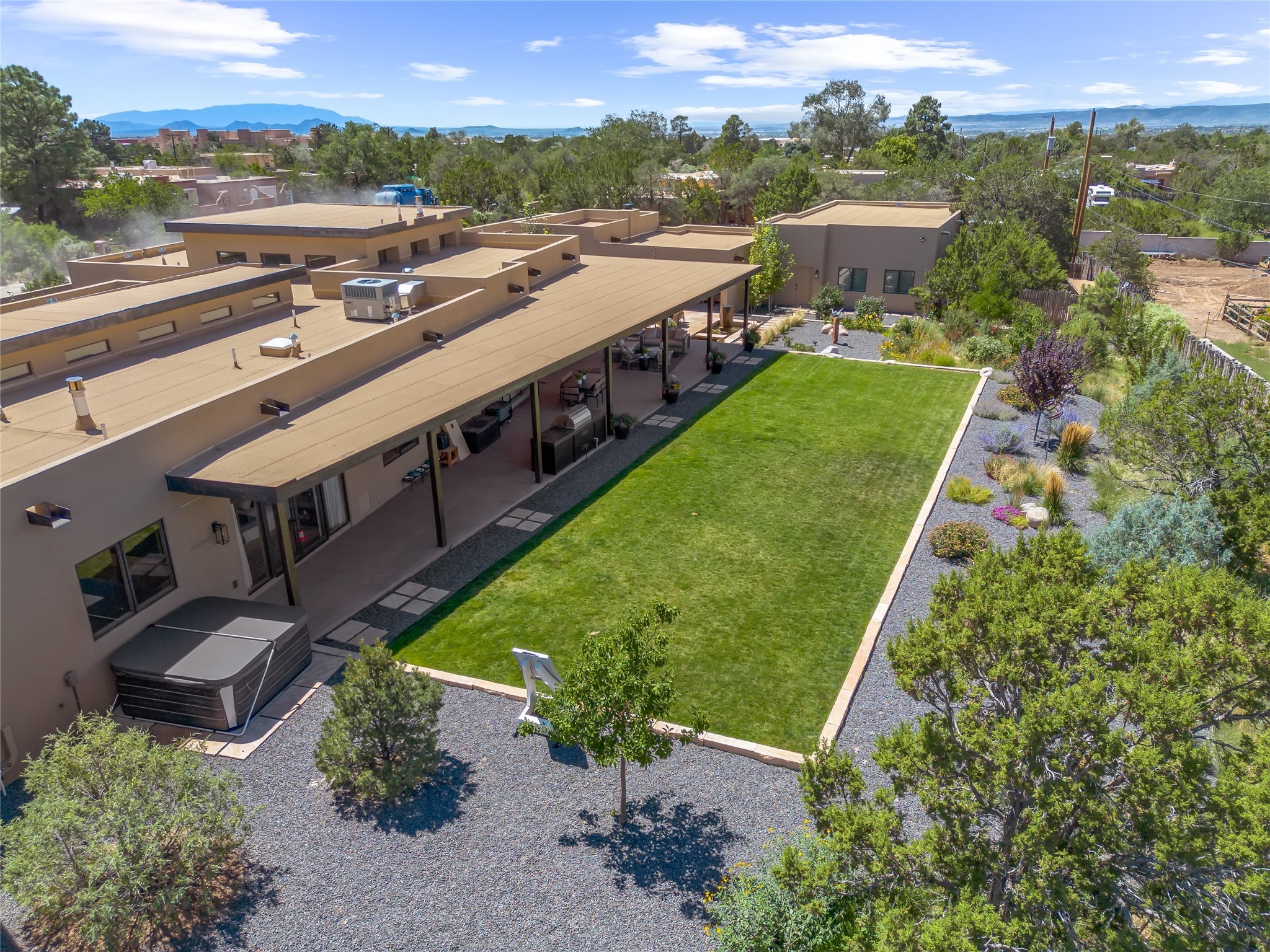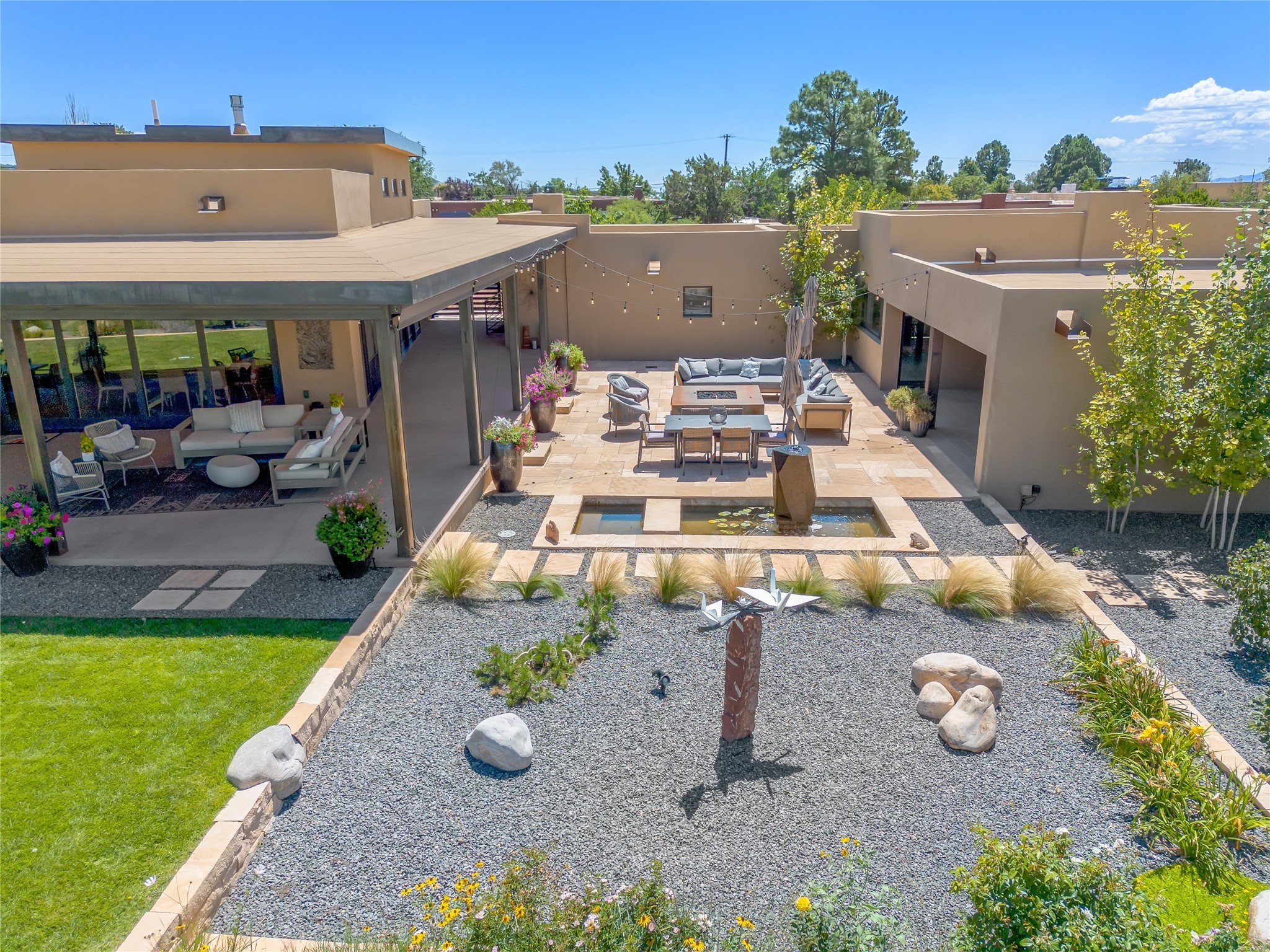 This exquisite 1-acre gated compound that's centrally located & just 2 miles from the historic Santa Fe Plaza features a masterfully designed main residence, spacious guest home, and 6 garage bays for collectors or creatives. The main home offers ~3,875 sq. ft. of refined living with Venetian plaster walls in public areas, custom cabinetry throughout, and 8-ft interior doors. The living and dining rooms feature an impressive dual aspect Ortal fireplace. Soaring ceilings and a wet bar with beverage drawers complete the living room, which opens to a ~1,700 sq. ft. covered patio. Multi-slide door systems open to this impressive patio, that includes built-in Bromic heaters and a 42 inch Wolf grill. The chef's kitchen is anchored by a Lacanche 7-burner stove, pot filler, Sub-Zero refrigerator and freezer, Wolf steam oven, Cove dishwasher and hot/cold tap. The butler's pantry has an abundance of storage, undermount lighting and Red/White EuroCave wine refrigerators. A serene primary suite includes a steam shower, soaking tub, room sized walk-in closet with island, and patio access. Smart touches include Sonos surround system, California Closets, electric patio shades, and a whole-house water filtration system. The guest house (~1,460 sq. ft.) offers generous privacy with a large living area, bedroom, and its own designer fireplace. An attached garage/storage wing (~1,853 sq. ft.) includes a standard 2-car bay plus an oversized 2+ bay garage with 10'x12' doors--ideal for small RVs, boats, or a home gym/studio. Both main and guest garages include EV hookup capabilities. Outdoors, enjoy lush landscaping by McCumber Fine Gardens, fruit trees, raised garden beds, a custom firepit and water feature, and ample space for entertaining--easily accommodating up to 100 guests. Additional highlights include steel electric gates, frosted glass garage doors, radiant heat in main home, and the most luxurious laundry/craft room you will find. This gated retreat is a one-of-a-kind compound.