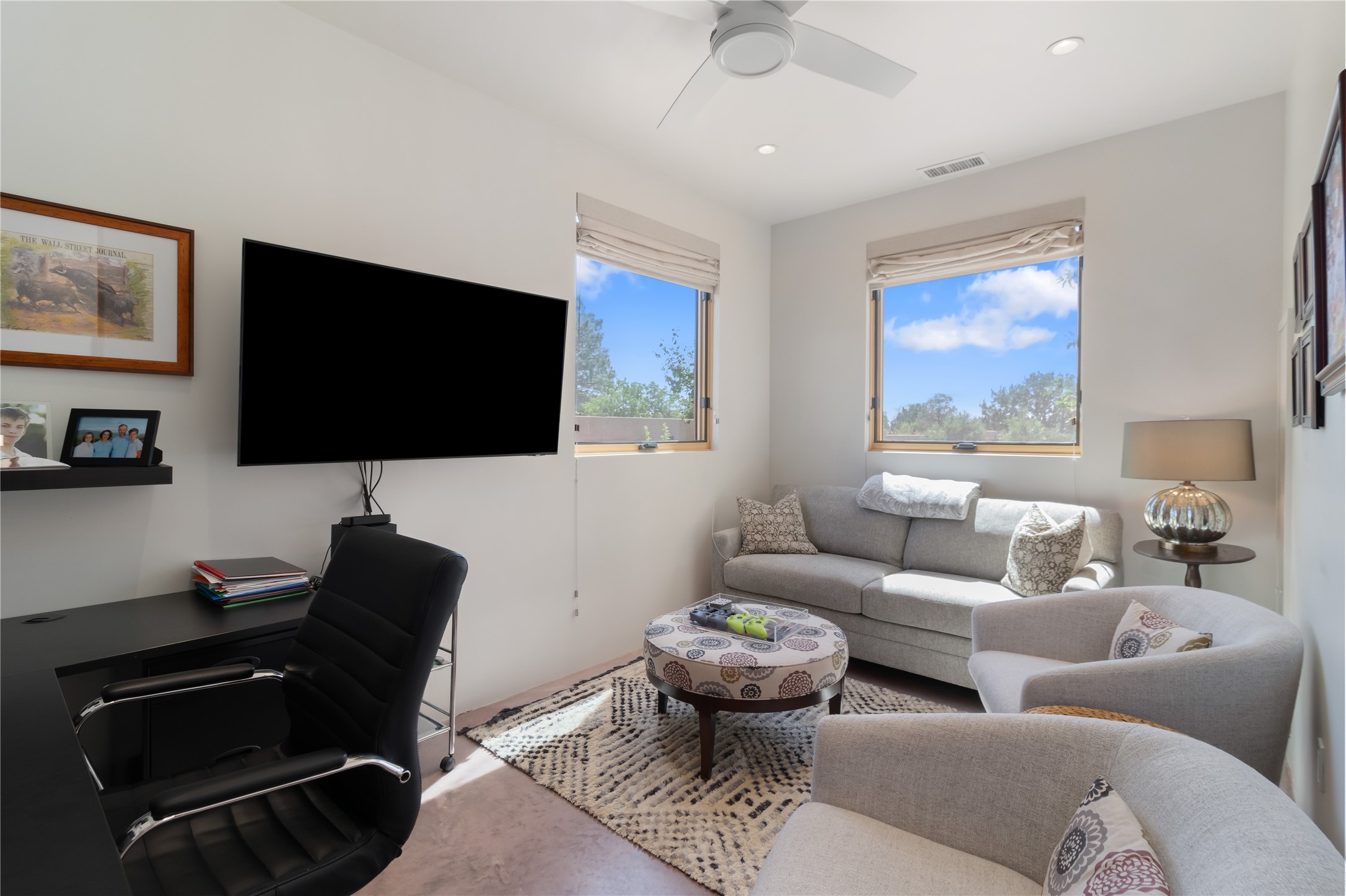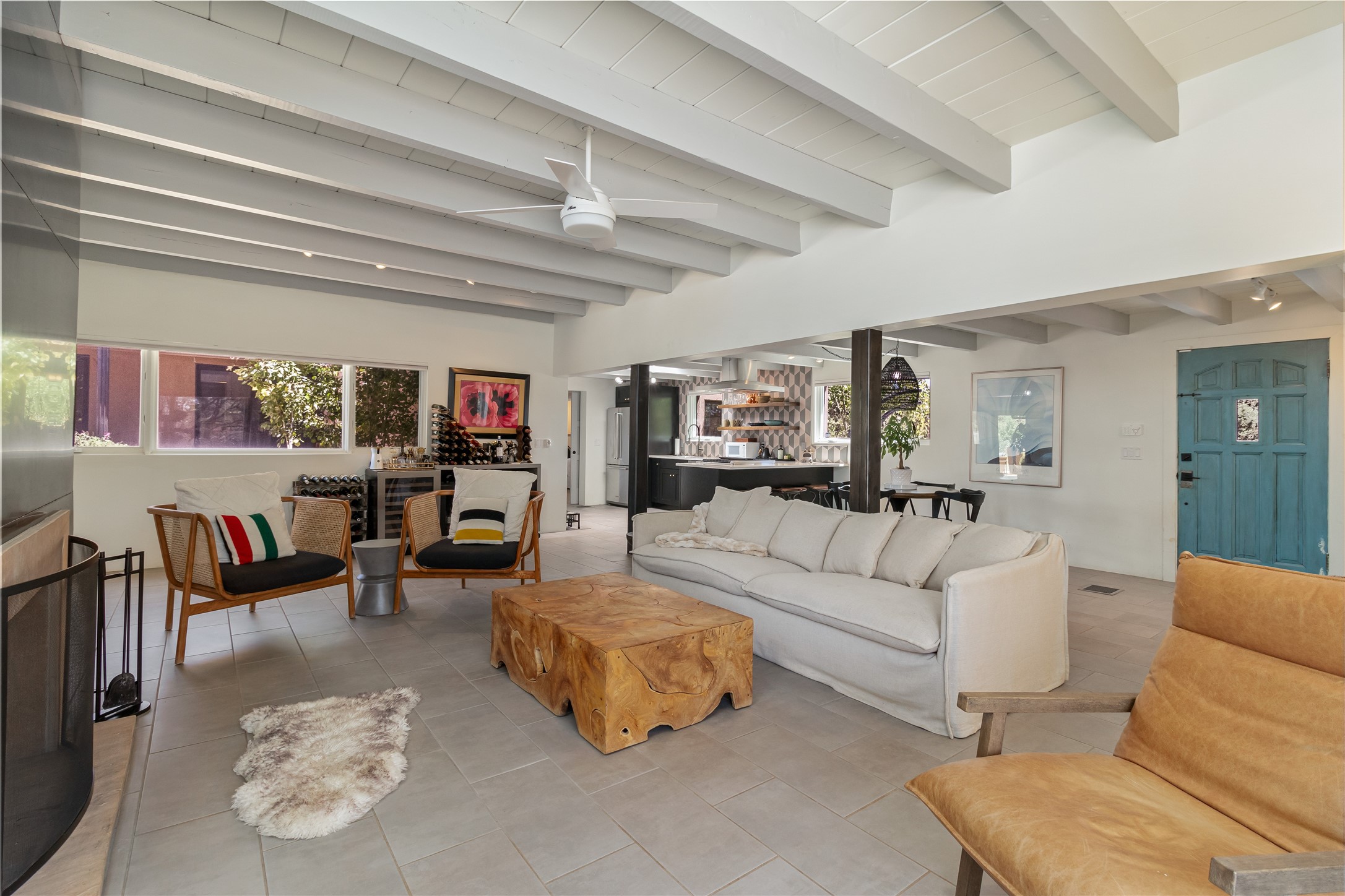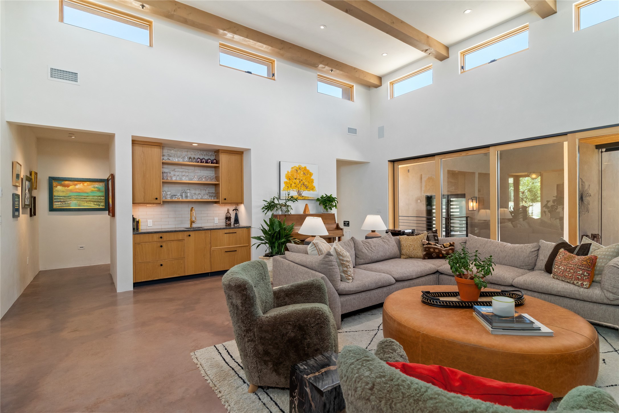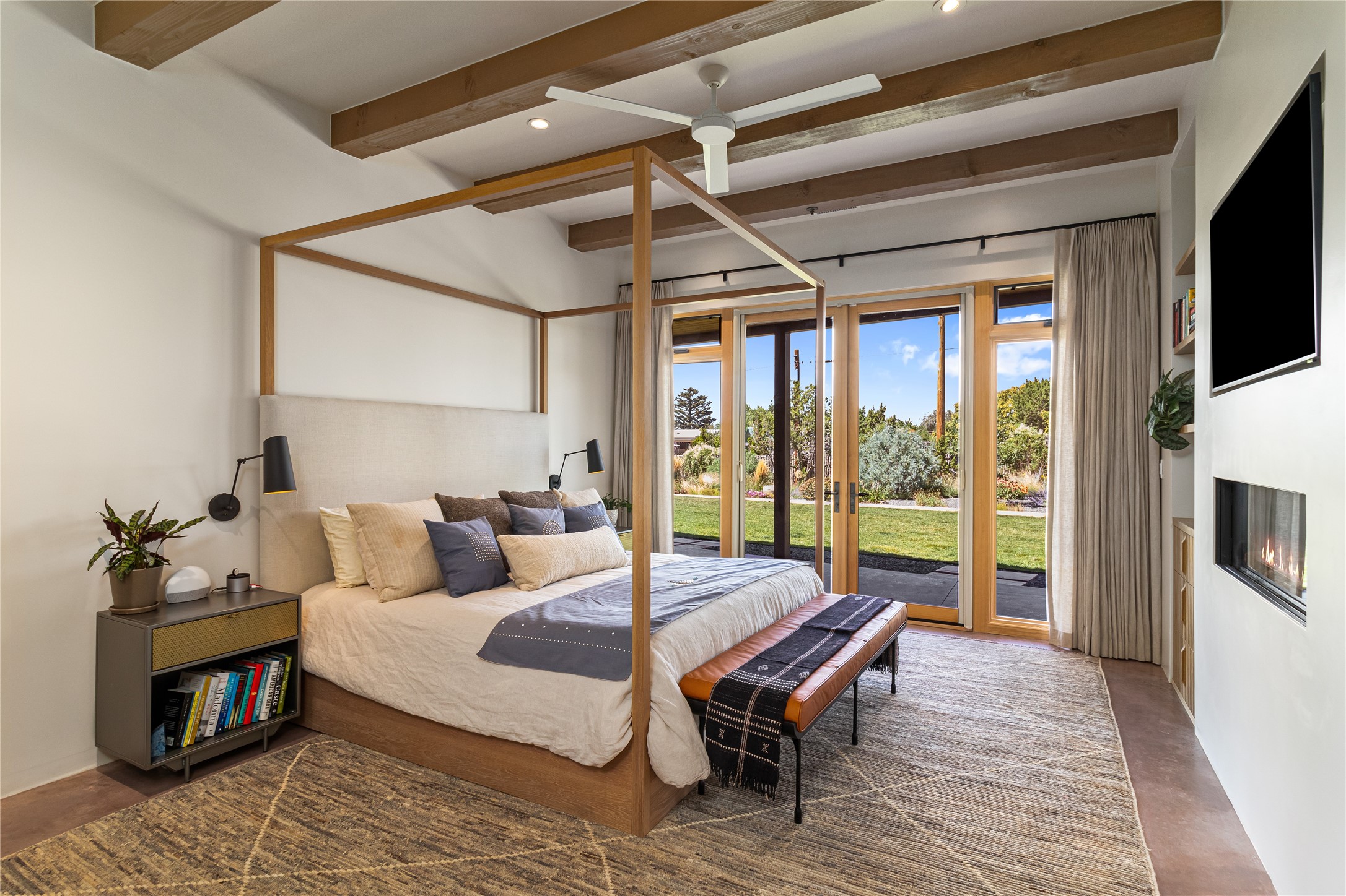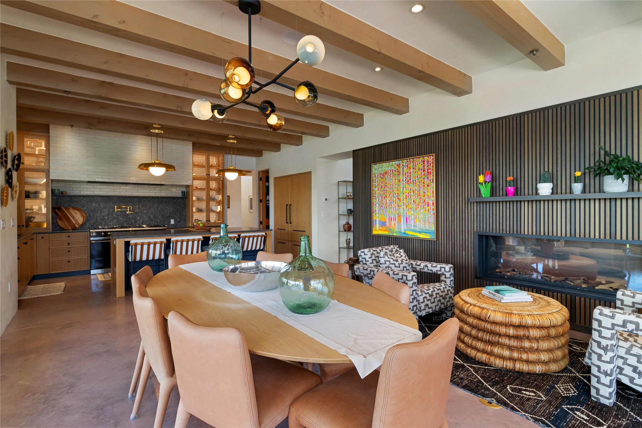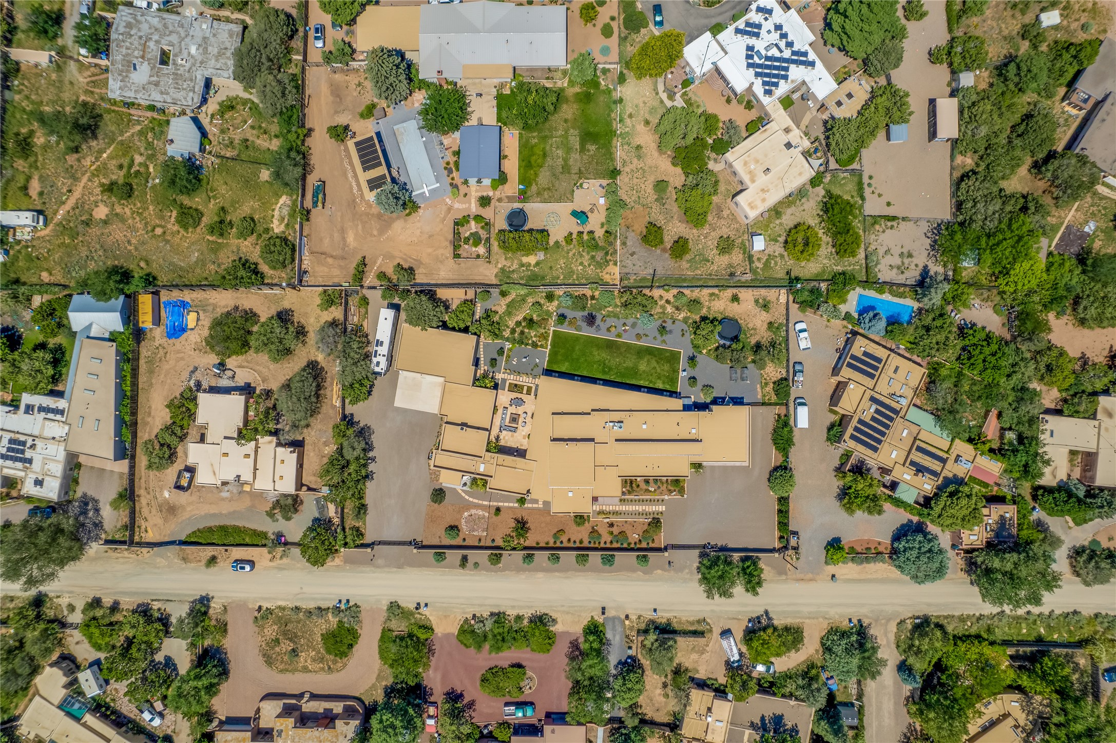 This exquisite 1-acre gated compound that's centrally located & just 2 miles from the historic Santa Fe Plaza features a masterfully designed main residence, spacious guest home, and 6 garage bays for collectors or creatives. The main home offers ~3,875 sq. ft. of refined living with Venetian plaster walls in public areas, custom cabinetry throughout, and 8-ft interior doors. The living and dining rooms feature an impressive dual aspect Ortal fireplace. Soaring ceilings and a wet bar with beverage drawers complete the living room, which opens to a ~1,700 sq. ft. covered patio. Multi-slide door systems open to this impressive patio, that includes built-in Bromic heaters and a 42 inch Wolf grill. The chef's kitchen is anchored by a Lacanche 7-burner stove, pot filler, Sub-Zero refrigerator and freezer, Wolf steam oven, Cove dishwasher and hot/cold tap. The butler's pantry has an abundance of storage, undermount lighting and Red/White EuroCave wine refrigerators. A serene primary suite includes a steam shower, soaking tub, room sized walk-in closet with island, and patio access. Smart touches include Sonos surround system, California Closets, electric patio shades, and a whole-house water filtration system. The guest house (~1,460 sq. ft.) offers generous privacy with a large living area, bedroom, and its own designer fireplace. An attached garage/storage wing (~1,853 sq. ft.) includes a standard 2-car bay plus an oversized 2+ bay garage with 10'x12' doors--ideal for small RVs, boats, or a home gym/studio. Both main and guest garages include EV hookup capabilities. Outdoors, enjoy lush landscaping by McCumber Fine Gardens, fruit trees, raised garden beds, a custom firepit and water feature, and ample space for entertaining--easily accommodating up to 100 guests. Additional highlights include steel electric gates, frosted glass garage doors, radiant heat in main home, and the most luxurious laundry/craft room you will find. This gated retreat is a one-of-a-kind compound.