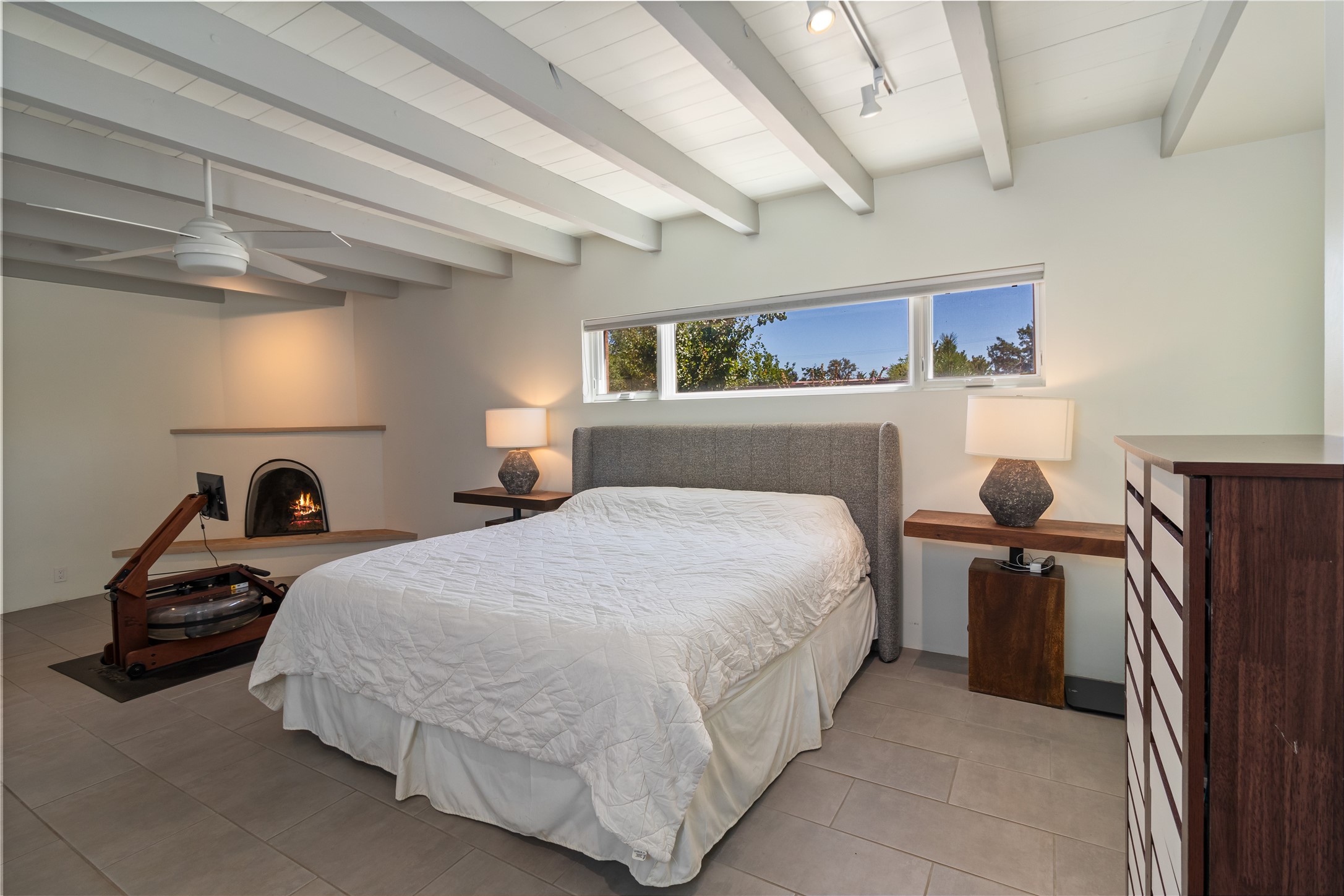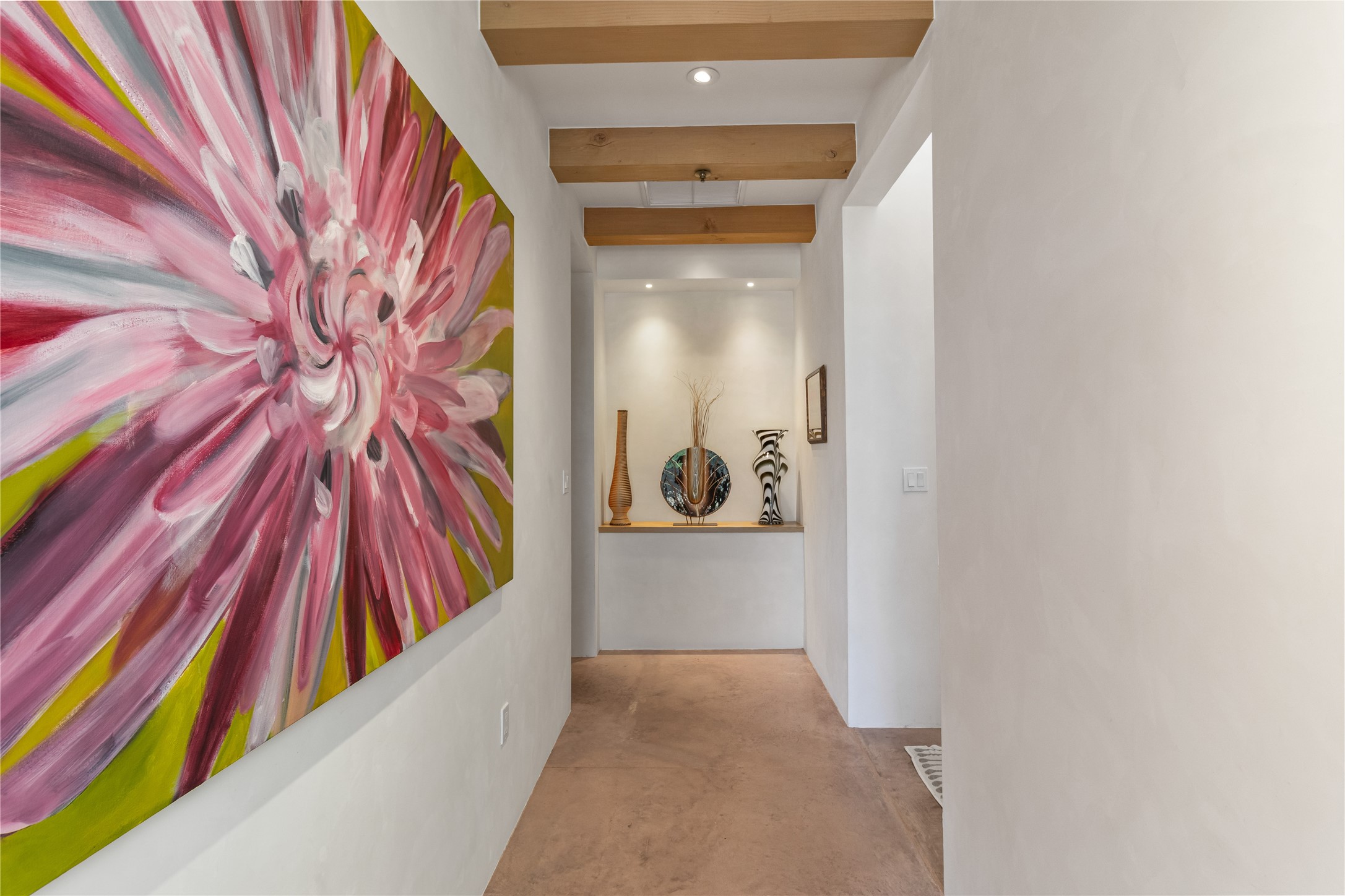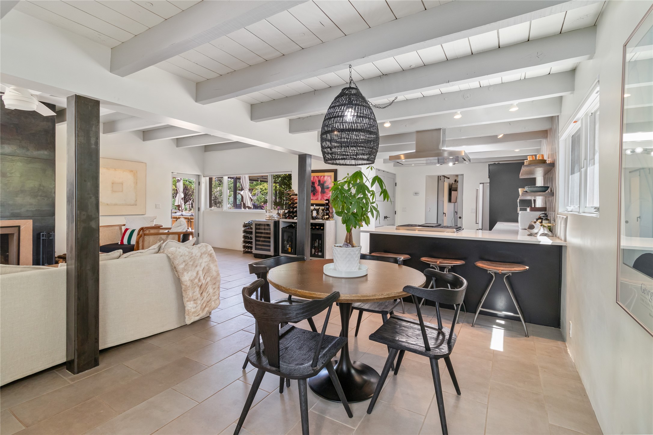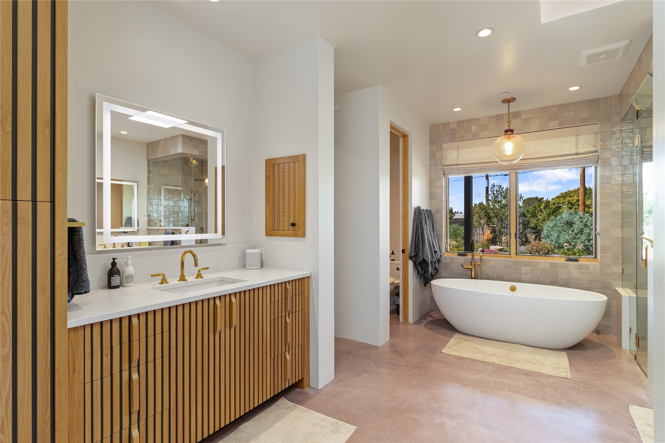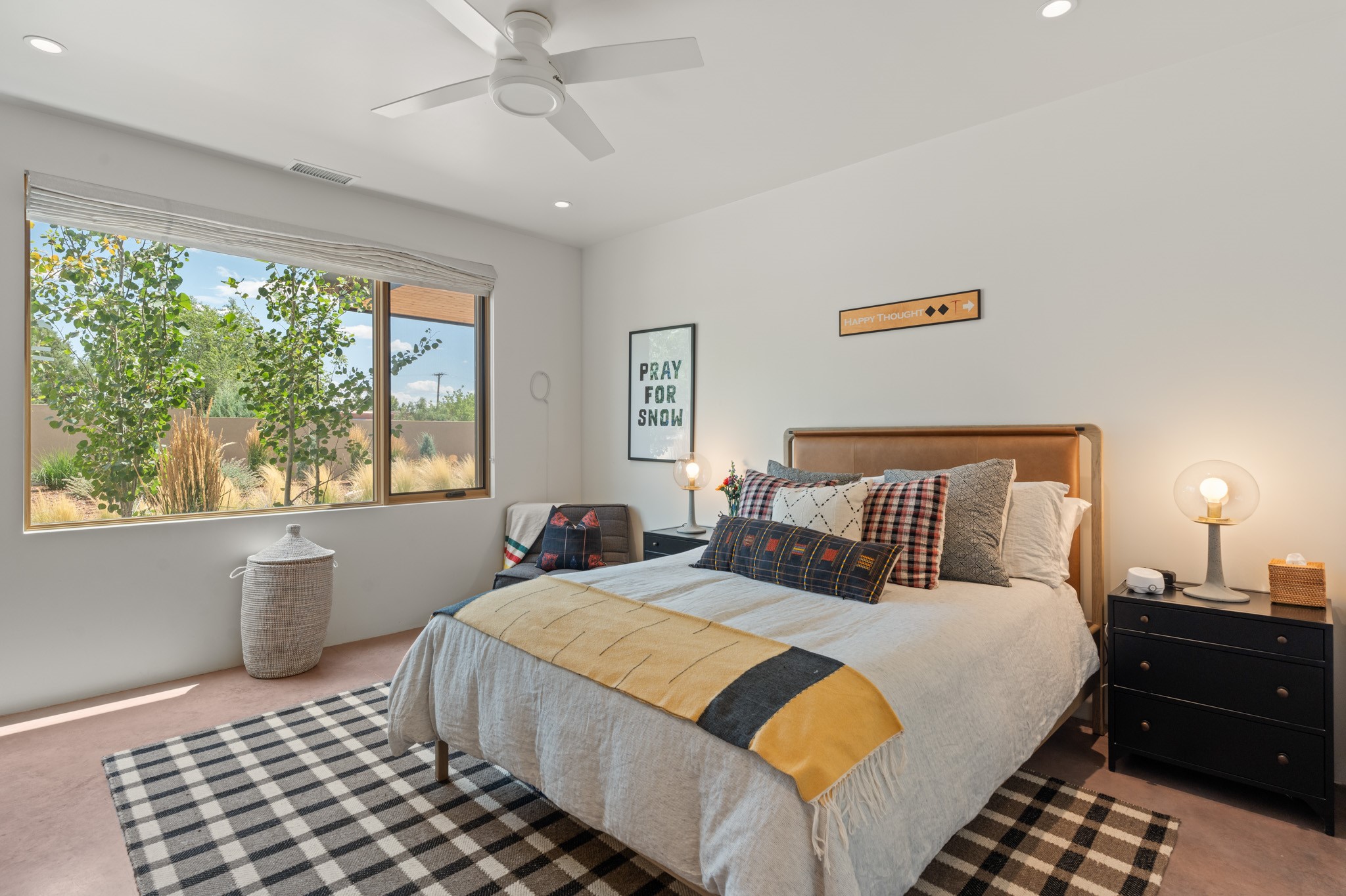 This exquisite 1-acre gated compound that's centrally located & just 2 miles from the historic Santa Fe Plaza features a masterfully designed main residence, spacious guest home, and 6 garage bays for collectors or creatives. The main home offers ~3,875 sq. ft. of refined living with Venetian plaster walls in public areas, custom cabinetry throughout, and 8-ft interior doors. The living and dining rooms feature an impressive dual aspect Ortal fireplace. Soaring ceilings and a wet bar with beverage drawers complete the living room, which opens to a ~1,700 sq. ft. covered patio. Multi-slide door systems open to this impressive patio, that includes built-in Bromic heaters and a 42 inch Wolf grill. The chef's kitchen is anchored by a Lacanche 7-burner stove, pot filler, Sub-Zero refrigerator and freezer, Wolf steam oven, Cove dishwasher and hot/cold tap. The butler's pantry has an abundance of storage, undermount lighting and Red/White EuroCave wine refrigerators. A serene primary suite includes a steam shower, soaking tub, room sized walk-in closet with island, and patio access. Smart touches include Sonos surround system, California Closets, electric patio shades, and a whole-house water filtration system. The guest house (~1,460 sq. ft.) offers generous privacy with a large living area, bedroom, and its own designer fireplace. An attached garage/storage wing (~1,853 sq. ft.) includes a standard 2-car bay plus an oversized 2+ bay garage with 10'x12' doors--ideal for small RVs, boats, or a home gym/studio. Both main and guest garages include EV hookup capabilities. Outdoors, enjoy lush landscaping by McCumber Fine Gardens, fruit trees, raised garden beds, a custom firepit and water feature, and ample space for entertaining--easily accommodating up to 100 guests. Additional highlights include steel electric gates, frosted glass garage doors, radiant heat in main home, and the most luxurious laundry/craft room you will find. This gated retreat is a one-of-a-kind compound.