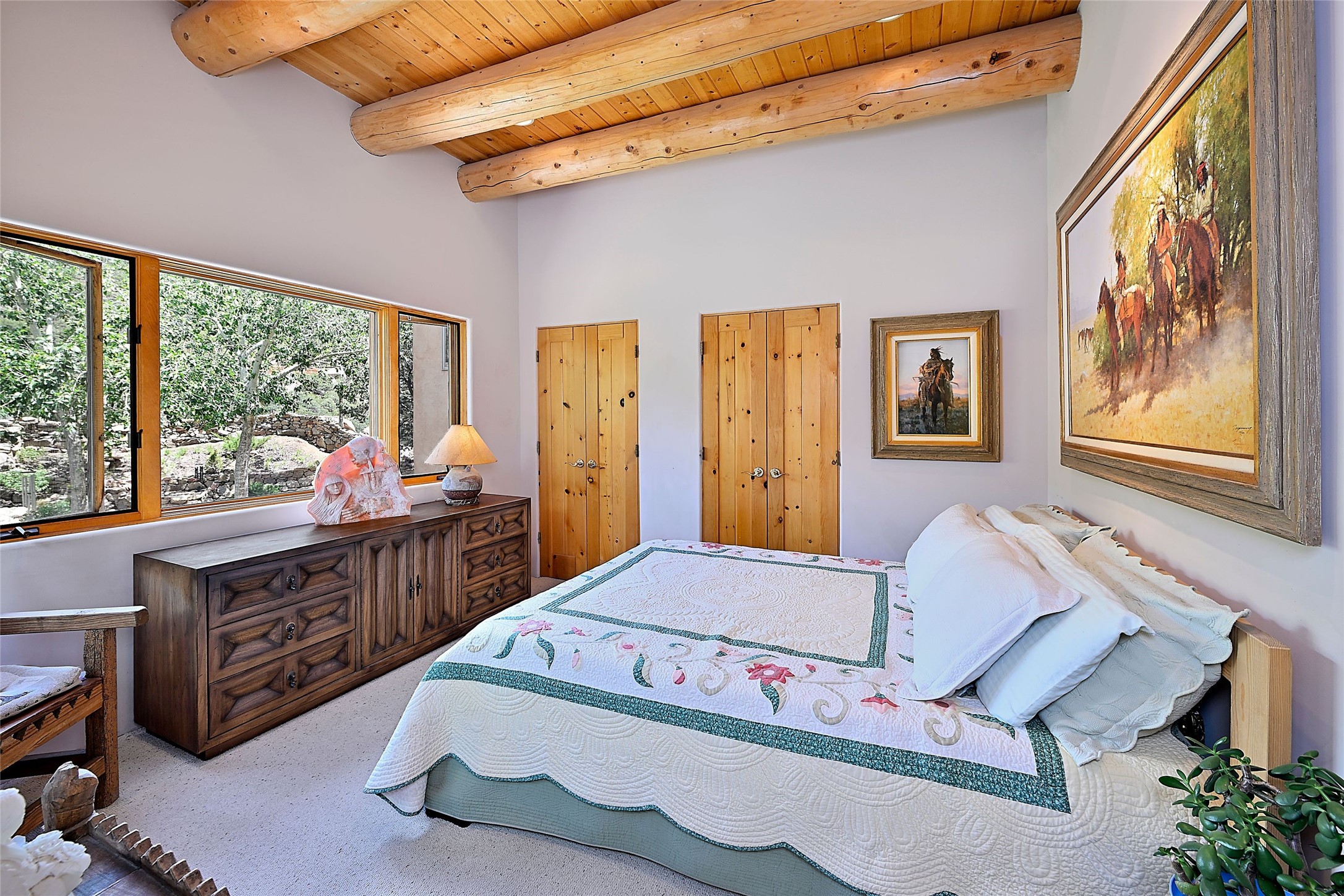 Elevated Living in Santa Fe's Foothills: A Majestic Retreat with Unrivaled ViewsPerched at approximately 7,500 feet, this unique Santa Fe residence offers a top-of-the-world experience, blending seclusion with breathtaking vistas across five mountain ranges. From fiery sunsets and dramatic desert storms to shimmering city lights, this home captures the ever-changing beauty of Northern New Mexico.Designed for those seeking comfort, privacy, and inspiration, the residence sits on five pinon-studded acres -- with an astonishing skyline and easy access to Santa Fe. It's just nine minutes from the historic Plaza, world-class dining, and renowned museums. A thoughtfully sited trail leads to a scenic overlook at top of the property, perfect for early evening toasts in the glow of twilight.Inside, the great room invites abundant natural light through soaring two-story windows and opens to three spacious decks--ideal for embracing the splendor of the high desert sky. The interiors are gracefully appointed with antique, artisan touches: hand-troweled plaster walls, ash and sandstone floors, and hand-crafted cabinetry. Traditional elements like oversized vigas, rough-hewn pine, and smooth-crafted latillas provide warmth and a sense of place.Five wood-burning fireplaces -- three of them harmonized in a Suisse-inspired layout -- bring cozy charm to the living, dining, and outdoor spaces during cooler months. The open kitchen, outdoor spaces and generous and inviting living areas make entertaining exhilarating and effortless.The home's three-bedroom floorplan includes a luxurious main-level primary suite with spa bath, walk-in closet, and direct deck access. Upstairs, a second glorious suite -- currently used as an art studio --presents show-stopping views and its own magnificent terrace. The third bedroom, downstairs, overlooks the courtyard, with its own en-suite bath. Additional architectural details include special northeast facing moon-view windows, beautifully framing the boulder, stone and earth-wrapped cove below with native plantings and lawn -- a perfect nook for shaded afternoon retreats.A thoughtfully planned fenced dog run makes this property as pet-friendly as it is people-perfect.