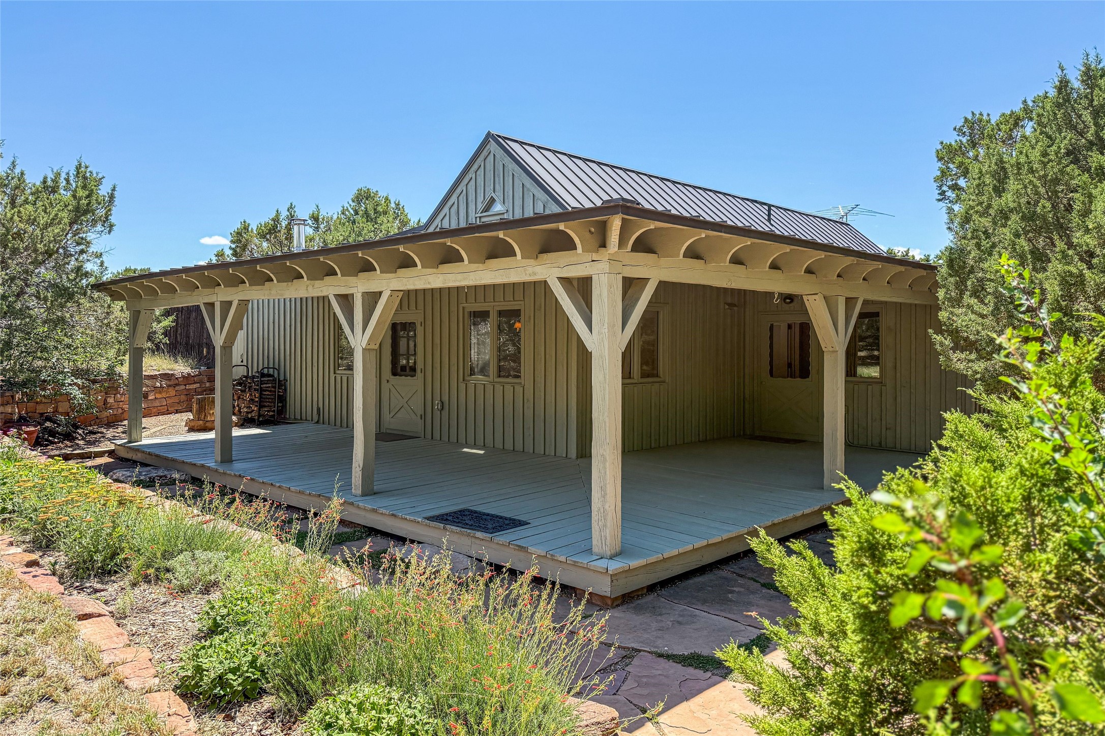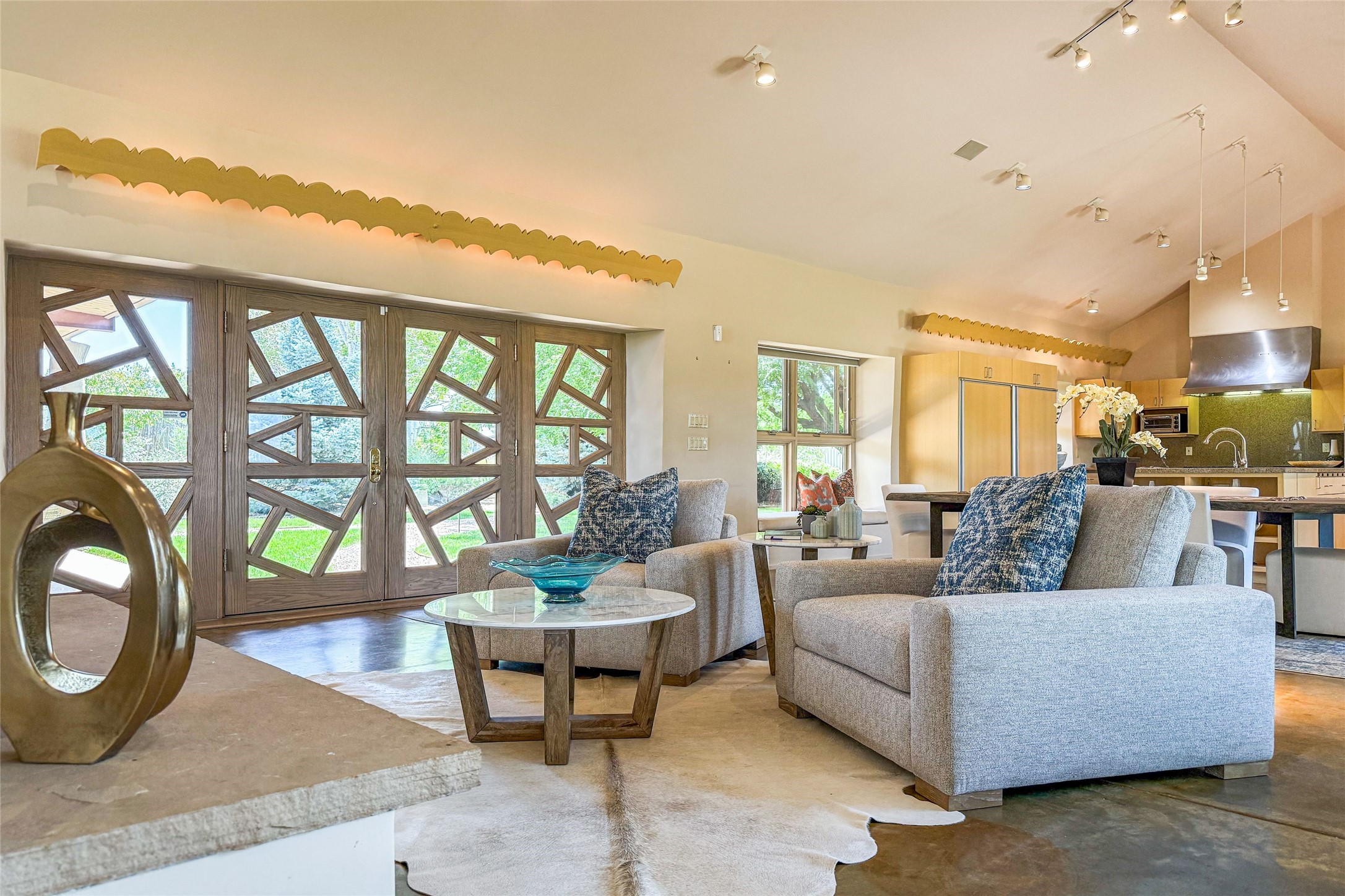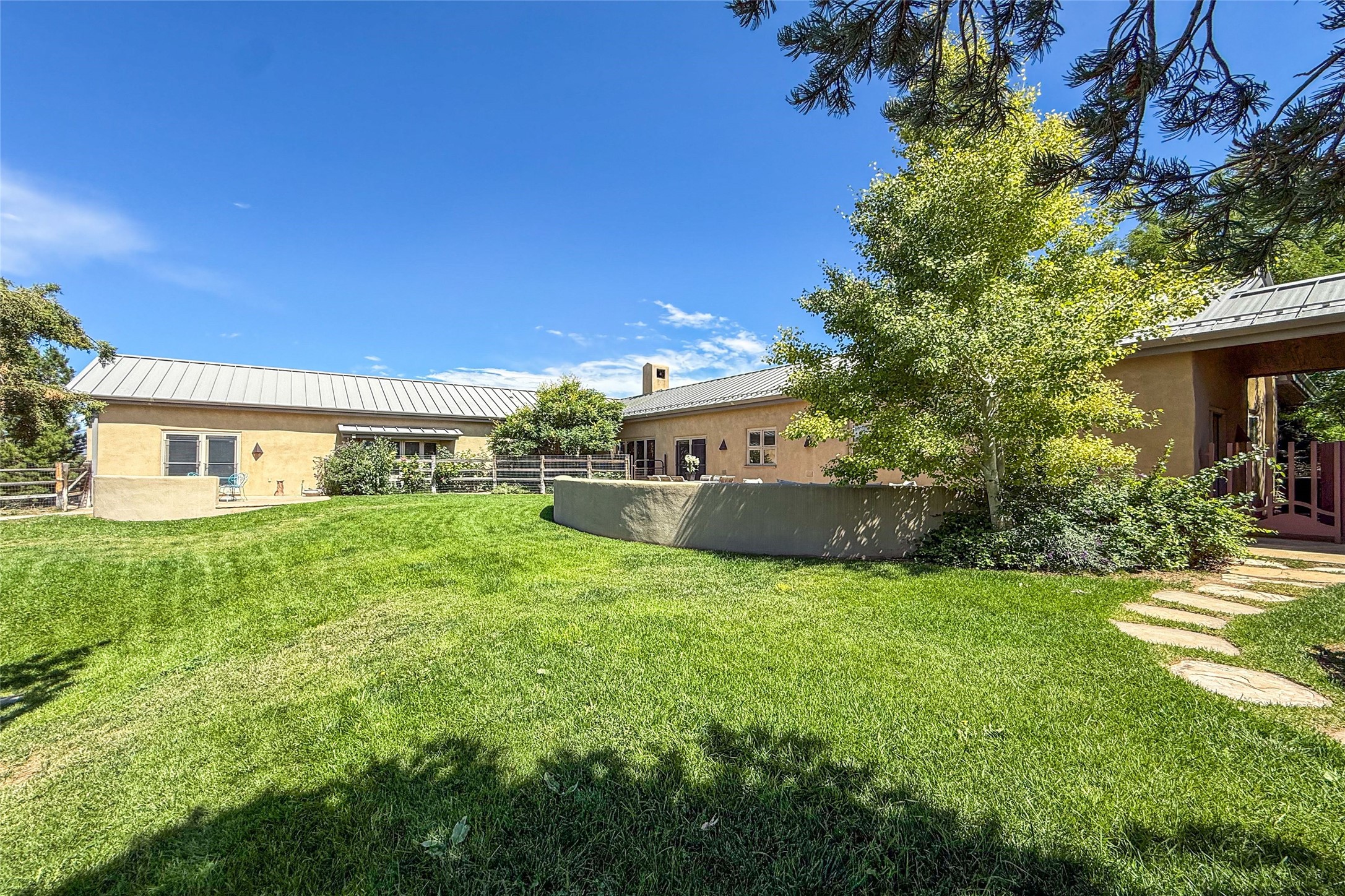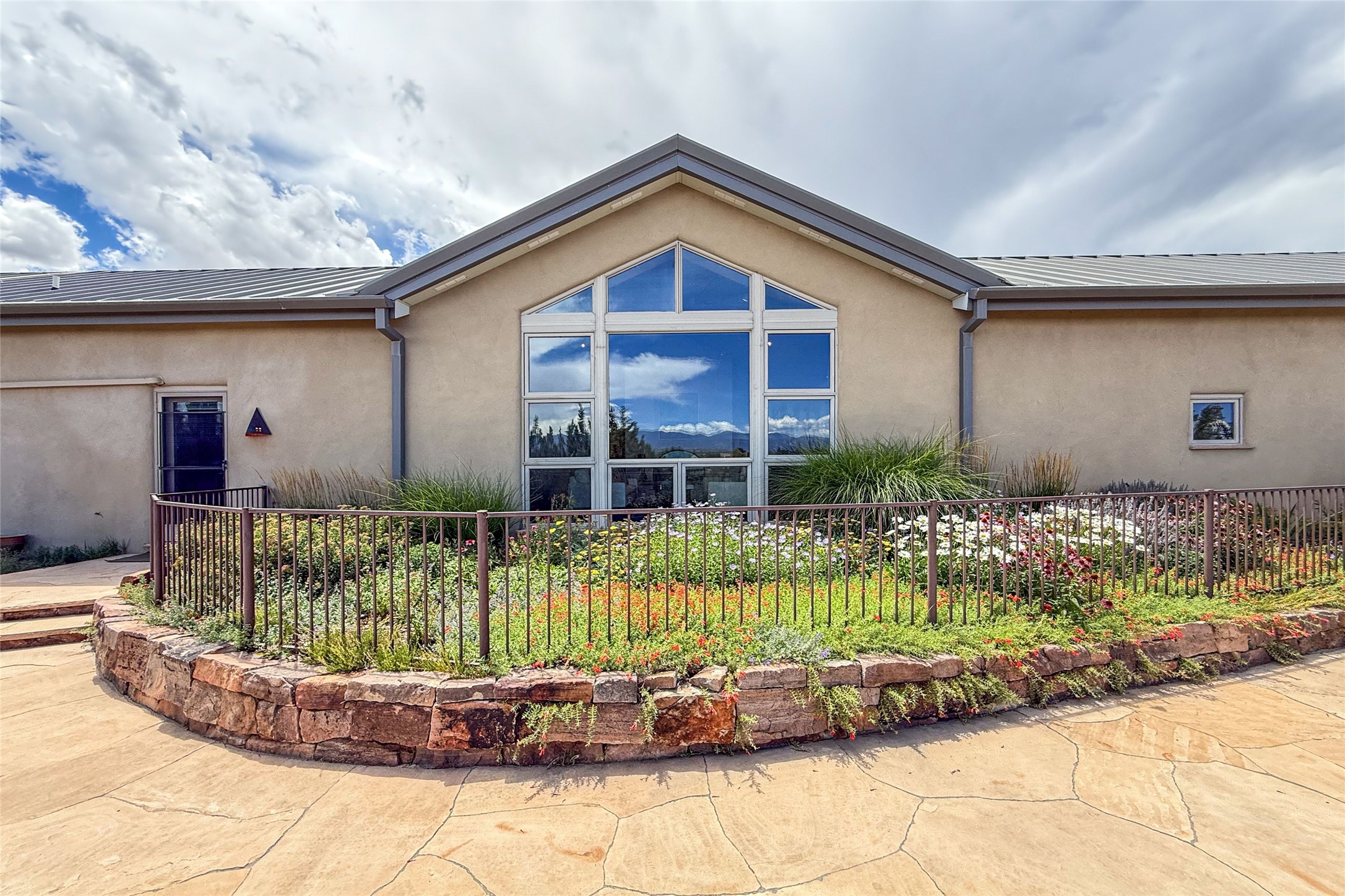 This serene La Tierra Nueva compound, with three distinct residences totaling 7,341 sq. feet of living space. Designed by renowned architect, Lila DeWindt, this lush oasis boasts mature landscaping in a serene, country-like setting with Sangre and Jemez mountain views, 11.85 acres, and vegetable and perennial gardens. The 3,982 sq. foot single level main residence features a blend of timeless Northern NM and modern design, a dramatic high-pitched roof, double-sided stone fireplace, copious natural light, andlarge windows that capture breathtaking Sangre views. With two sitting rooms, a media room and bedrooms that boast mountain views, this residence is truly stunning. Sitting in a bay window, the primary suite's tub overlooks a flower garden. An open-concept kitchen is centered around a large island, perfect for hosting.The home enjoys a portal and multiple patio spaces. The charming 1,334 sq. foot, two bedroom guest house includes a full kitchen, Saltillo tile flooring, a wood-burning stove, large windows, and wrap-around porch. The impressive 2,025 sq footmodern 1-bedroom studio has an open living/dining/kitchen area, and portal. The adult rec-room, with built-in bar, is ideal as live/work space, artist studio/music room, car enthusiast or convert to a barn. Perfect for large gatherings and relaxing with sunset Jemez views. Beneath the studio, lays a remarkable walk-in wine cellar for approx. 5000 bottles with wine tasting area. The property also includes a generous fenced dog area and room for horses.A truly peaceful, secluded atmosphere just 18 minutes from the heart of Santa Fe or the airport, and 8 minutes to The Club at Las Campanas. La Tierra Nueva is a coveted, gated, equestrian-friendly community with access to over 60,000 acres BLM land, and tennis/pickleball court. Ideal for multigenerational living, a large family, or patron of the arts, 7 Goodnight Trail West is a true hidden gem.
