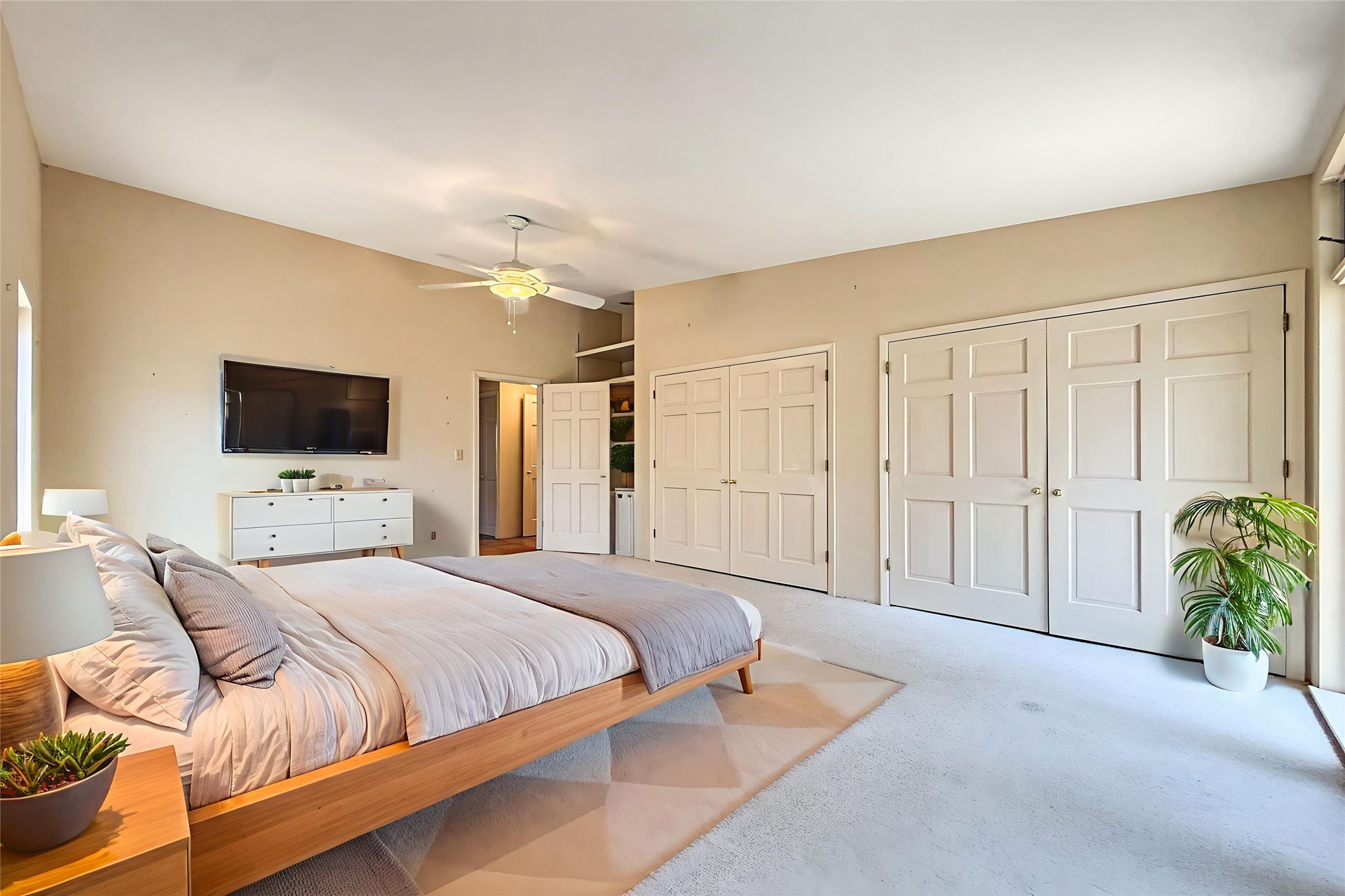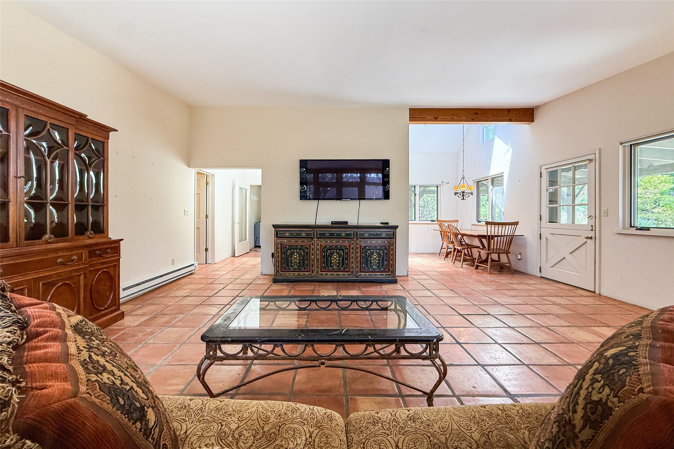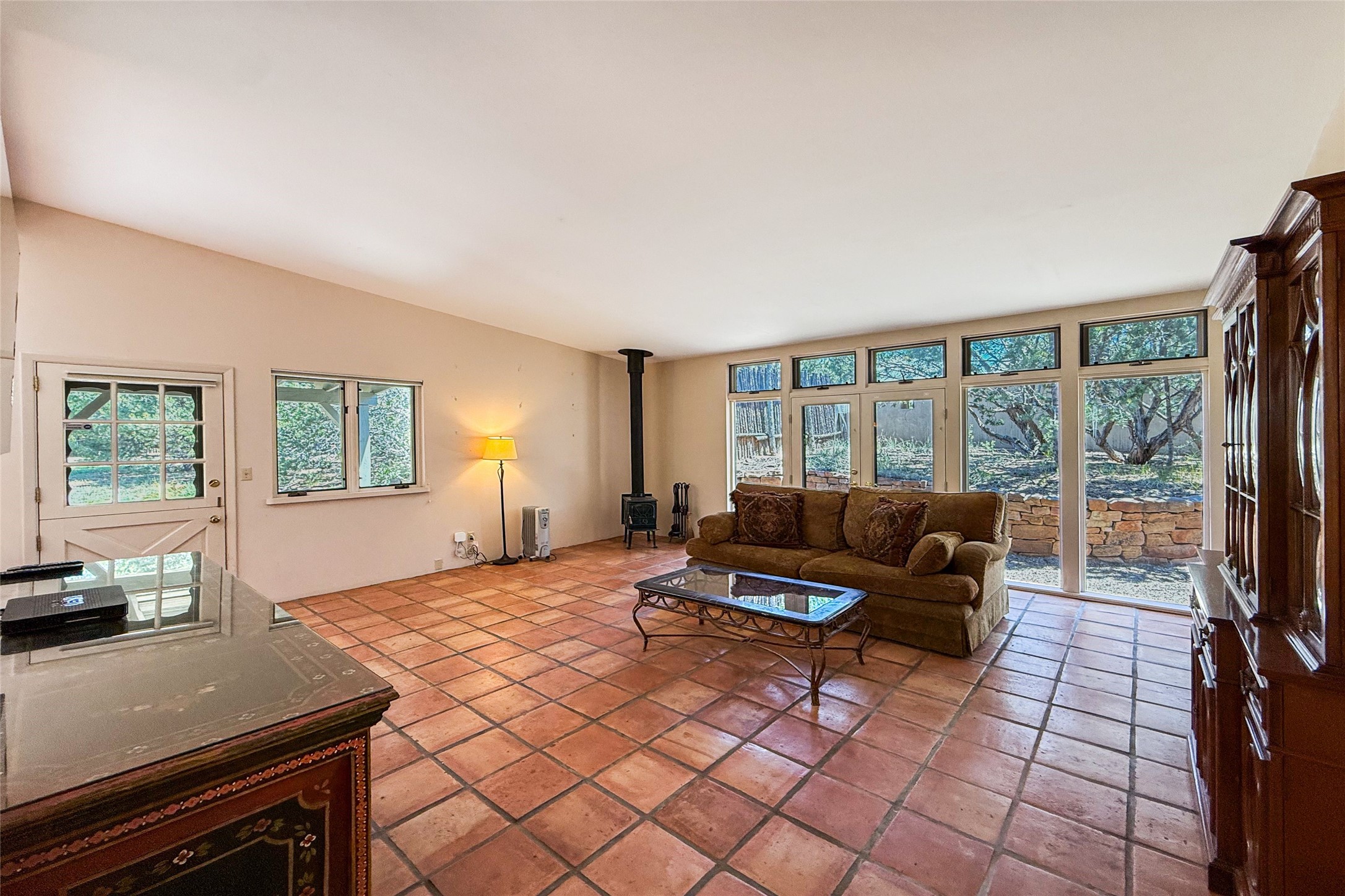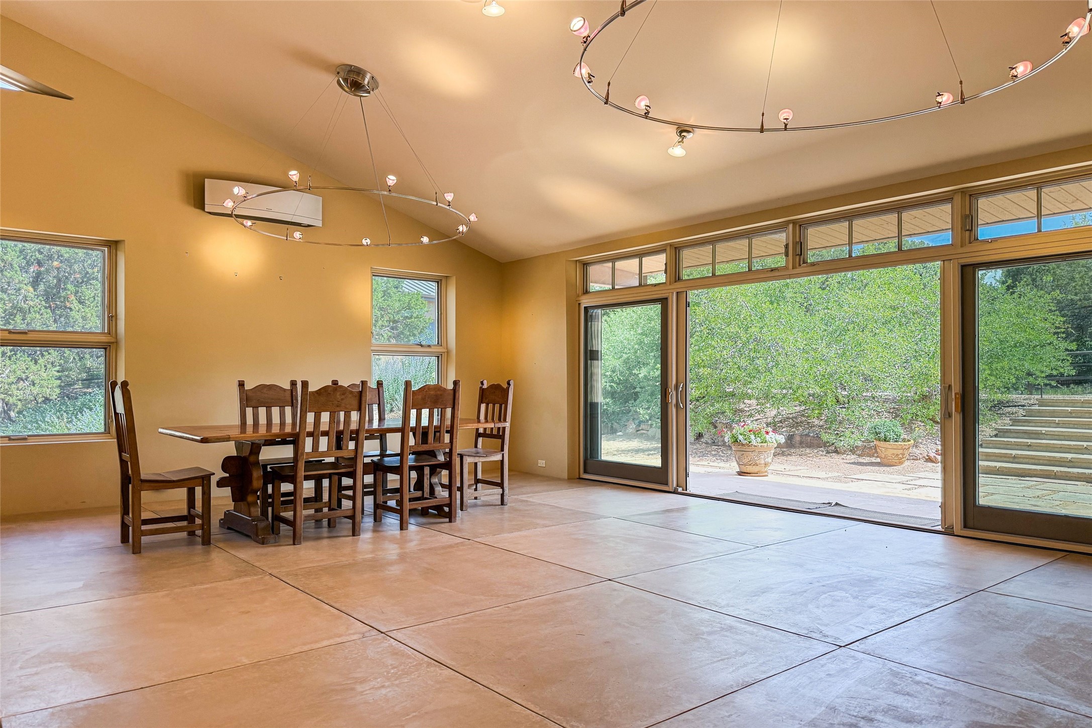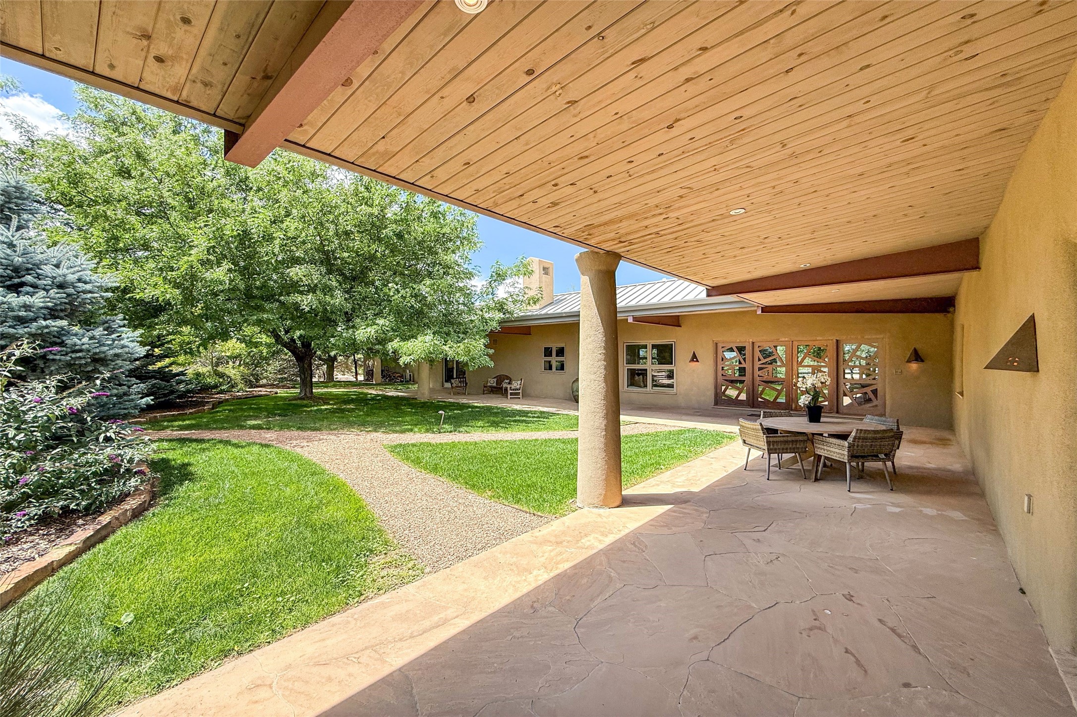 This serene La Tierra Nueva compound, with three distinct residences totaling 7,341 sq. feet of living space. Designed by renowned architect, Lila DeWindt, this lush oasis boasts mature landscaping in a serene, country-like setting with Sangre and Jemez mountain views, 11.85 acres, and vegetable and perennial gardens. The 3,982 sq. foot single level main residence features a blend of timeless Northern NM and modern design, a dramatic high-pitched roof, double-sided stone fireplace, copious natural light, andlarge windows that capture breathtaking Sangre views. With two sitting rooms, a media room and bedrooms that boast mountain views, this residence is truly stunning. Sitting in a bay window, the primary suite's tub overlooks a flower garden. An open-concept kitchen is centered around a large island, perfect for hosting.The home enjoys a portal and multiple patio spaces. The charming 1,334 sq. foot, two bedroom guest house includes a full kitchen, Saltillo tile flooring, a wood-burning stove, large windows, and wrap-around porch. The impressive 2,025 sq footmodern 1-bedroom studio has an open living/dining/kitchen area, and portal. The adult rec-room, with built-in bar, is ideal as live/work space, artist studio/music room, car enthusiast or convert to a barn. Perfect for large gatherings and relaxing with sunset Jemez views. Beneath the studio, lays a remarkable walk-in wine cellar for approx. 5000 bottles with wine tasting area. The property also includes a generous fenced dog area and room for horses.A truly peaceful, secluded atmosphere just 18 minutes from the heart of Santa Fe or the airport, and 8 minutes to The Club at Las Campanas. La Tierra Nueva is a coveted, gated, equestrian-friendly community with access to over 60,000 acres BLM land, and tennis/pickleball court. Ideal for multigenerational living, a large family, or patron of the arts, 7 Goodnight Trail West is a true hidden gem.
