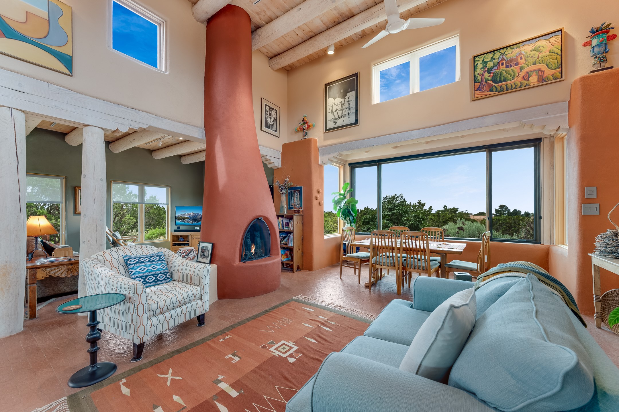 Set on a spacious 1.54+/- acres within the peaceful Eldorado community, this beautifully updated single-story home offers 2800+/- square feet of comfortable living. With 3 bedrooms and 3 & 1/2 bathrooms, it features a versatile layout that includes an attached studio with loft (additional heated 600+/- sqft)-- perfect for creative pursuits or office, gym, or meditation space. Recent updates include new paint, new countertops, and modern appliances throughout the kitchen, which also boasts granite countertops, a gas cooktop and wall-mounted double ovens. High ceilings with traditional vigas, brick flooring, and a charming Kiva fireplace enhance the warm southwestern character of the interior. The expansive primary bedroom includes a generous walk-in closet and an updated en-suite bathroom, offering a private retreat. Enjoy uninterrupted vistas from the rear portal or stay cool inside where the views are just as enticing from behind newer Pella windows and mini-splits to keep you cool. There is convenient parking in the 2-car garage and the lot provides flexibility for gardening or recreation. Enjoy the expansive Eldorado Community Amenities including a pool and walking trails. Come tour this estate today!