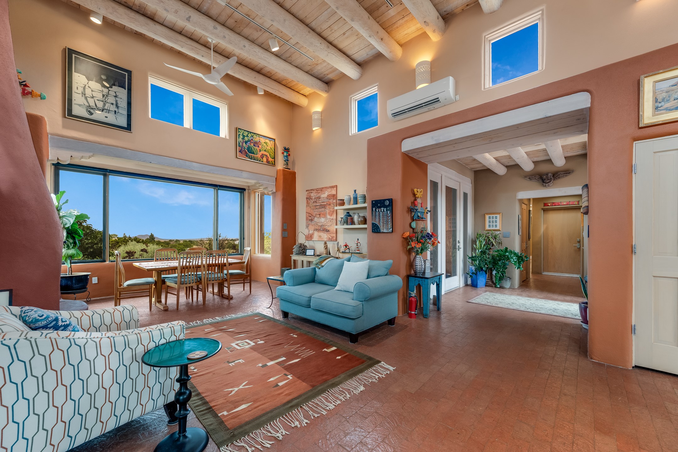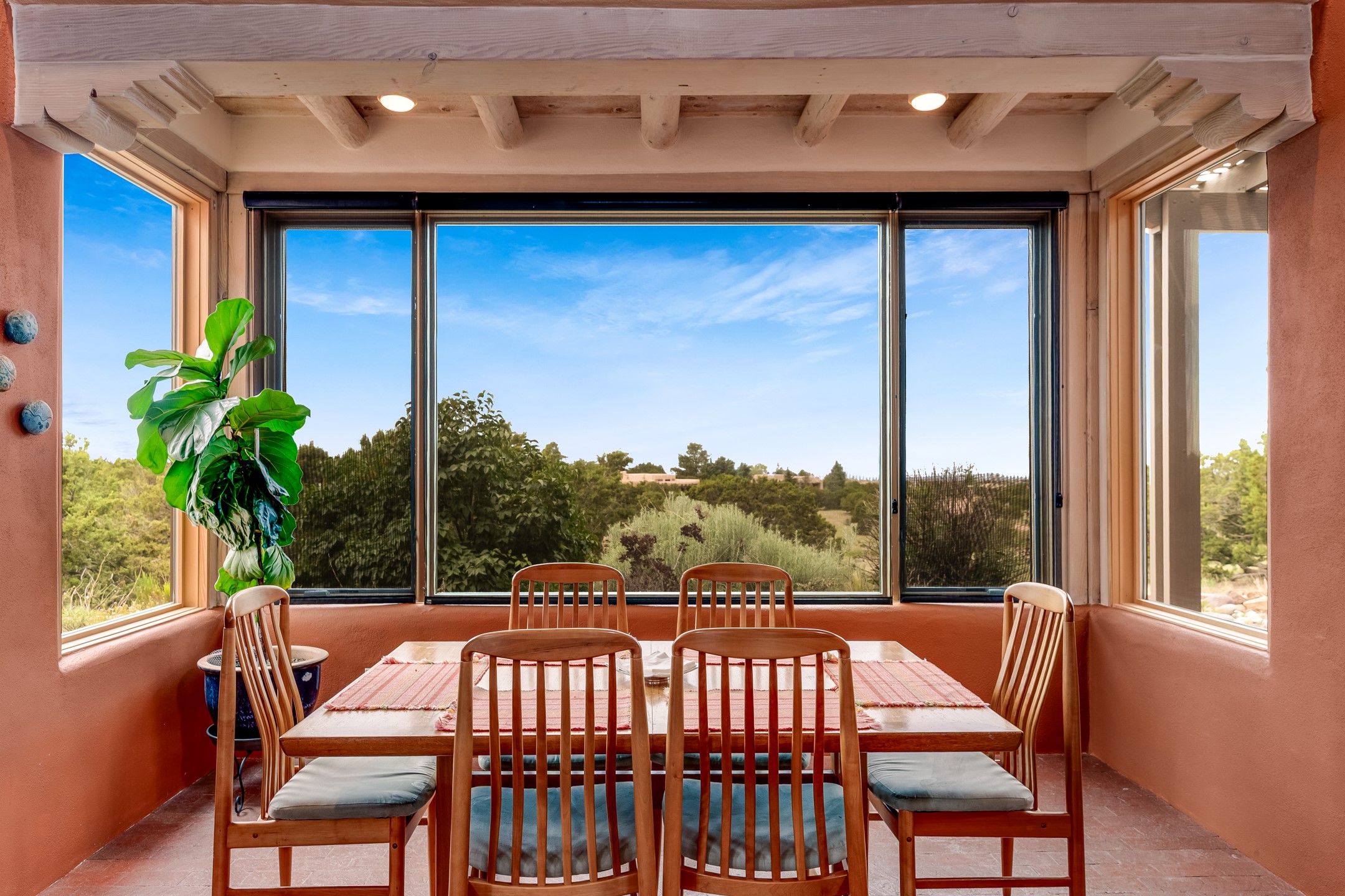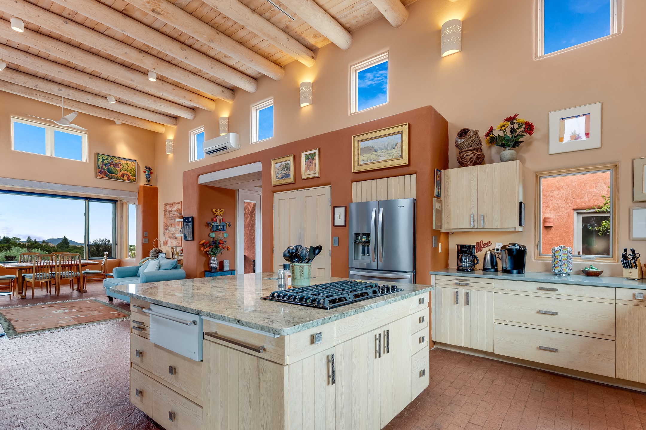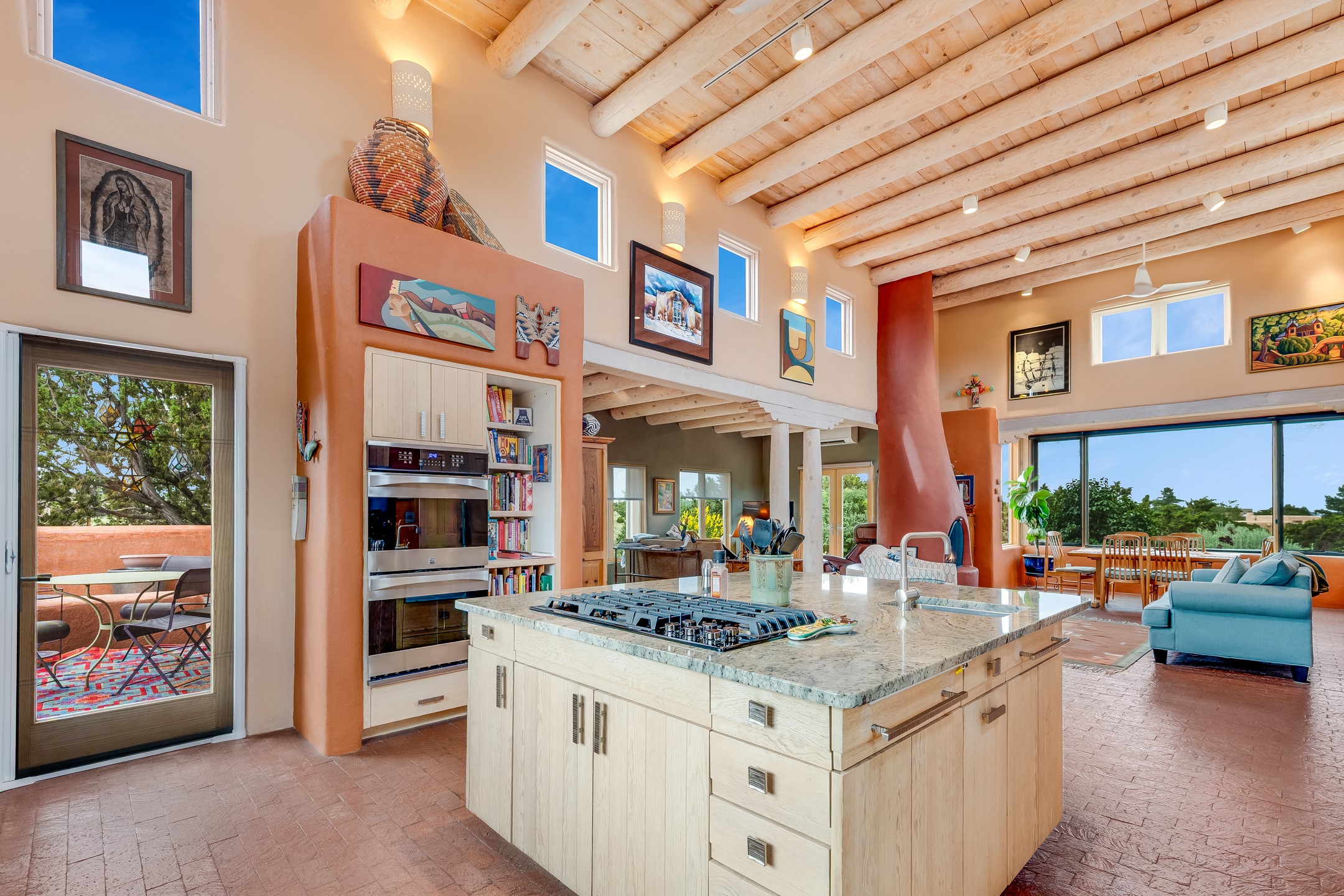 Set on a spacious 1.54+/- acres within the peaceful Eldorado community, this beautifully updated single-story home offers 2800+/- square feet of comfortable living. With 3 bedrooms and 3 & 1/2 bathrooms, it features a versatile layout that includes an attached studio with loft (additional heated 600+/- sqft)-- perfect for creative pursuits or office, gym, or meditation space. Recent updates include new paint, new countertops, and modern appliances throughout the kitchen, which also boasts granite countertops, a gas cooktop and wall-mounted double ovens. High ceilings with traditional vigas, brick flooring, and a charming Kiva fireplace enhance the warm southwestern character of the interior. The expansive primary bedroom includes a generous walk-in closet and an updated en-suite bathroom, offering a private retreat. Enjoy uninterrupted vistas from the rear portal or stay cool inside where the views are just as enticing from behind newer Pella windows and mini-splits to keep you cool. There is convenient parking in the 2-car garage and the lot provides flexibility for gardening or recreation. Enjoy the expansive Eldorado Community Amenities including a pool and walking trails. Come tour this estate today!