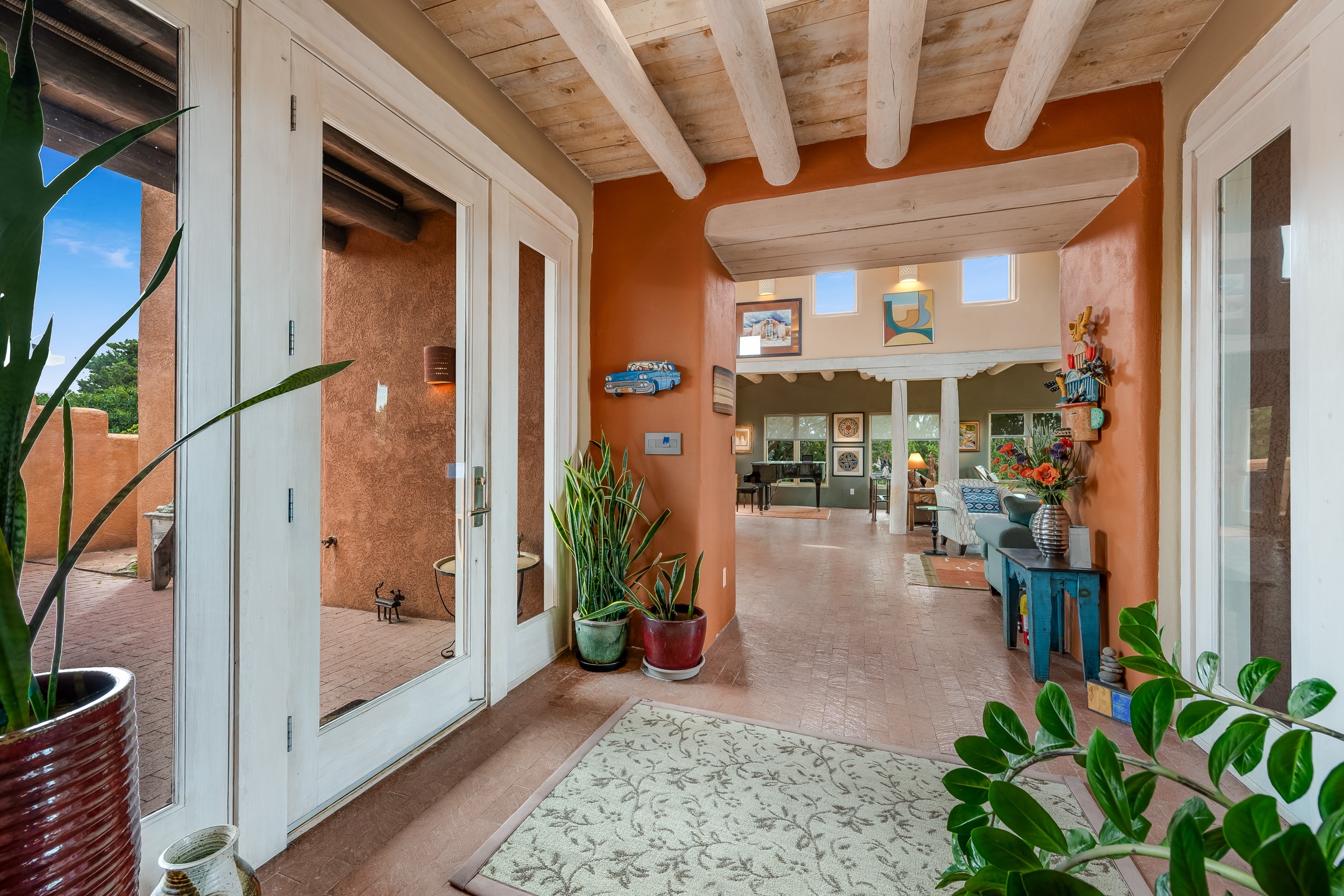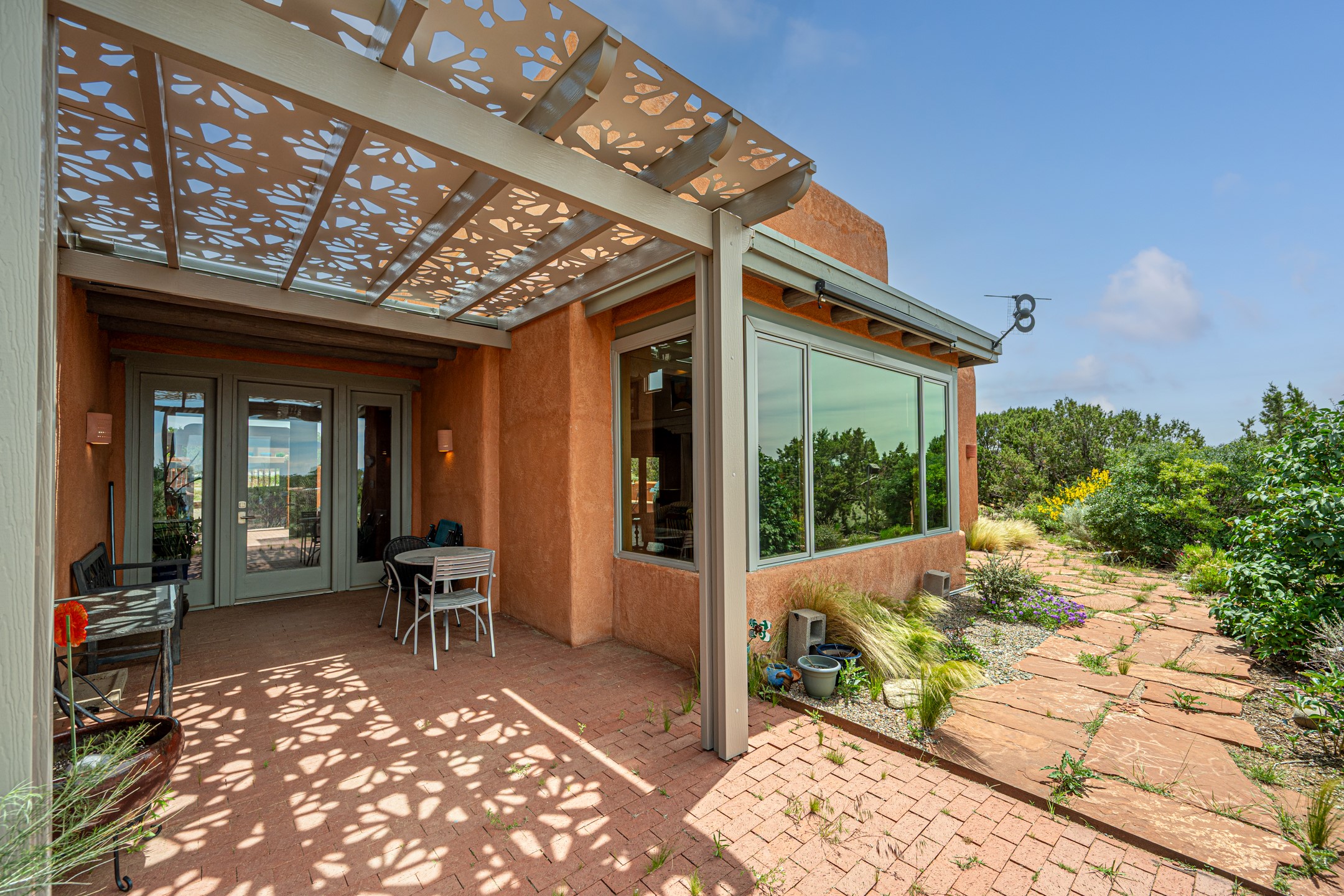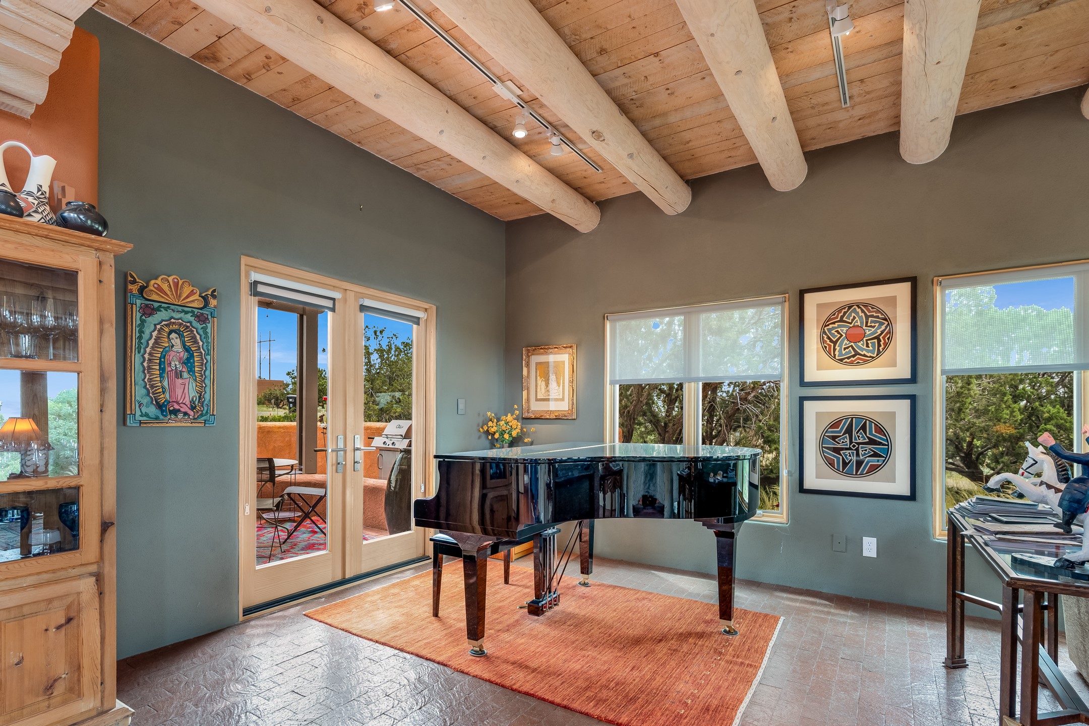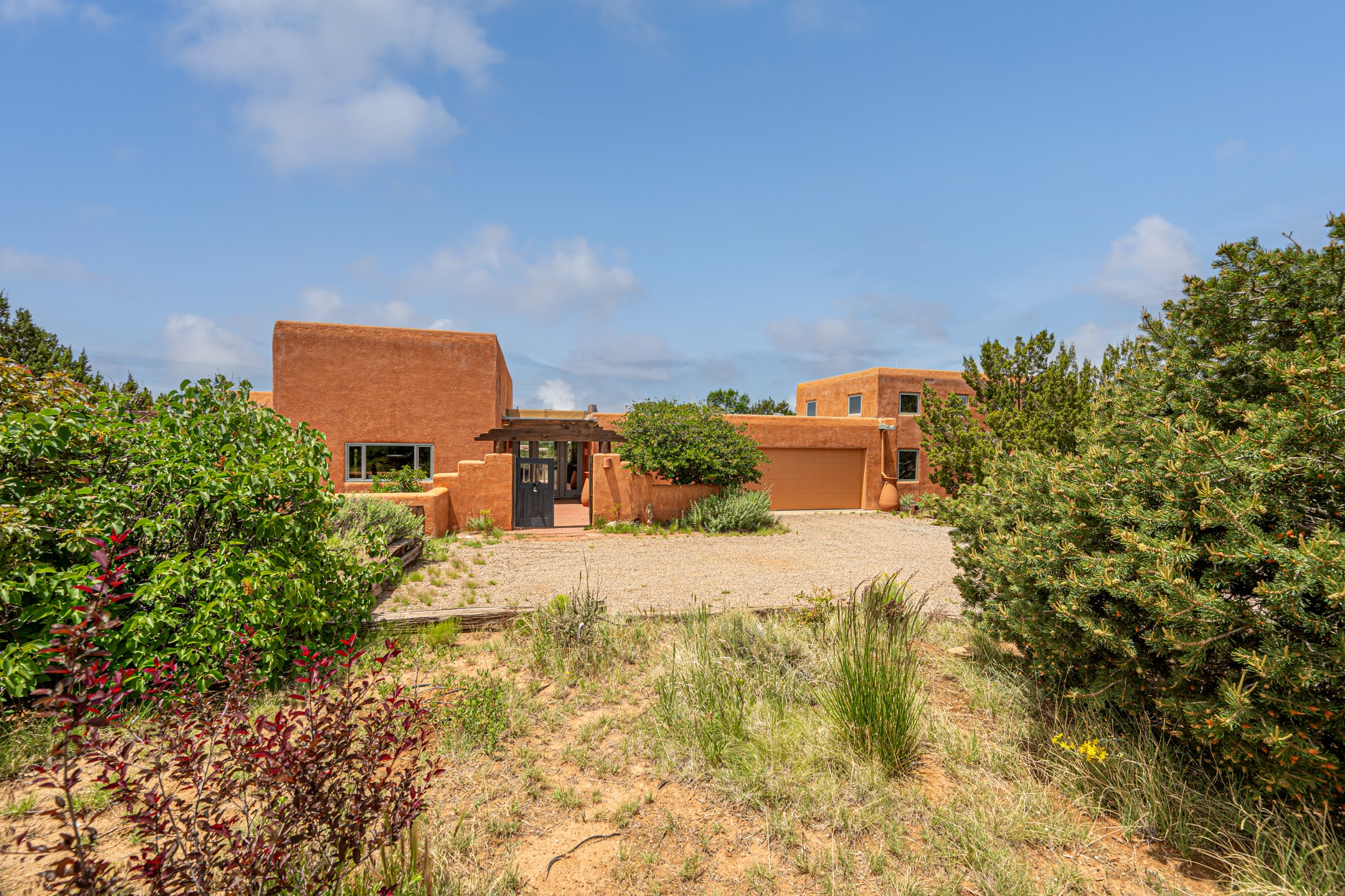 Set on a spacious 1.54+/- acres within the peaceful Eldorado community, this beautifully updated single-story home offers 2800+/- square feet of comfortable living. With 3 bedrooms and 3 & 1/2 bathrooms, it features a versatile layout that includes an attached studio with loft (additional heated 600+/- sqft)-- perfect for creative pursuits or office, gym, or meditation space. Recent updates include new paint, new countertops, and modern appliances throughout the kitchen, which also boasts granite countertops, a gas cooktop and wall-mounted double ovens. High ceilings with traditional vigas, brick flooring, and a charming Kiva fireplace enhance the warm southwestern character of the interior. The expansive primary bedroom includes a generous walk-in closet and an updated en-suite bathroom, offering a private retreat. Enjoy uninterrupted vistas from the rear portal or stay cool inside where the views are just as enticing from behind newer Pella windows and mini-splits to keep you cool. There is convenient parking in the 2-car garage and the lot provides flexibility for gardening or recreation. Enjoy the expansive Eldorado Community Amenities including a pool and walking trails. Come tour this estate today!