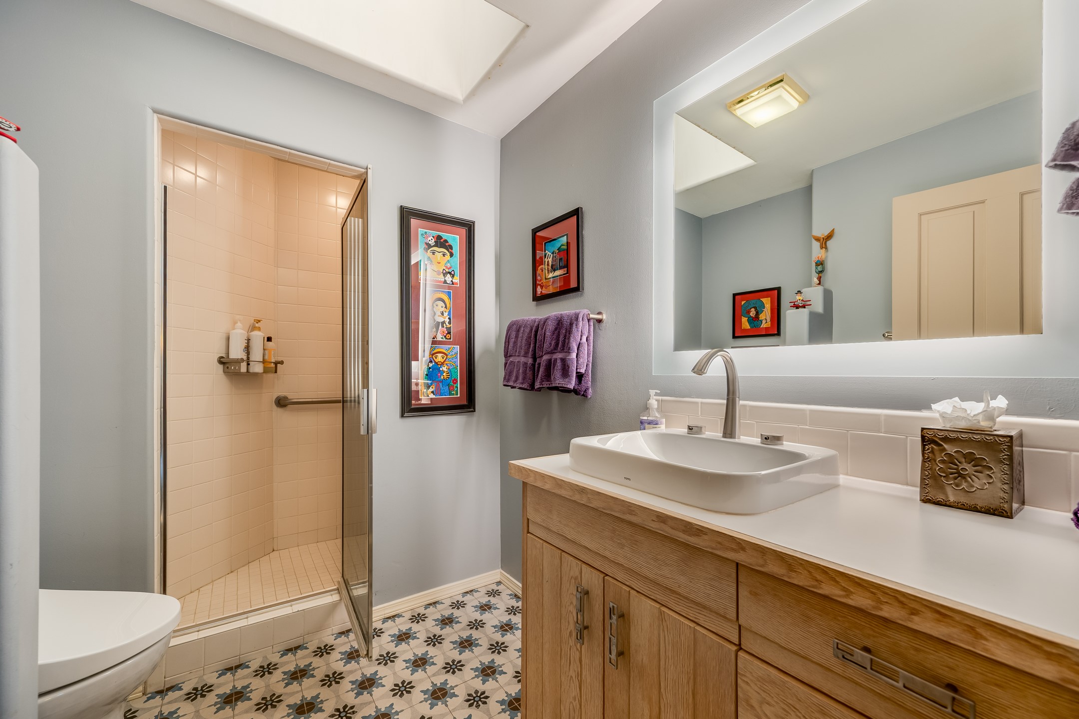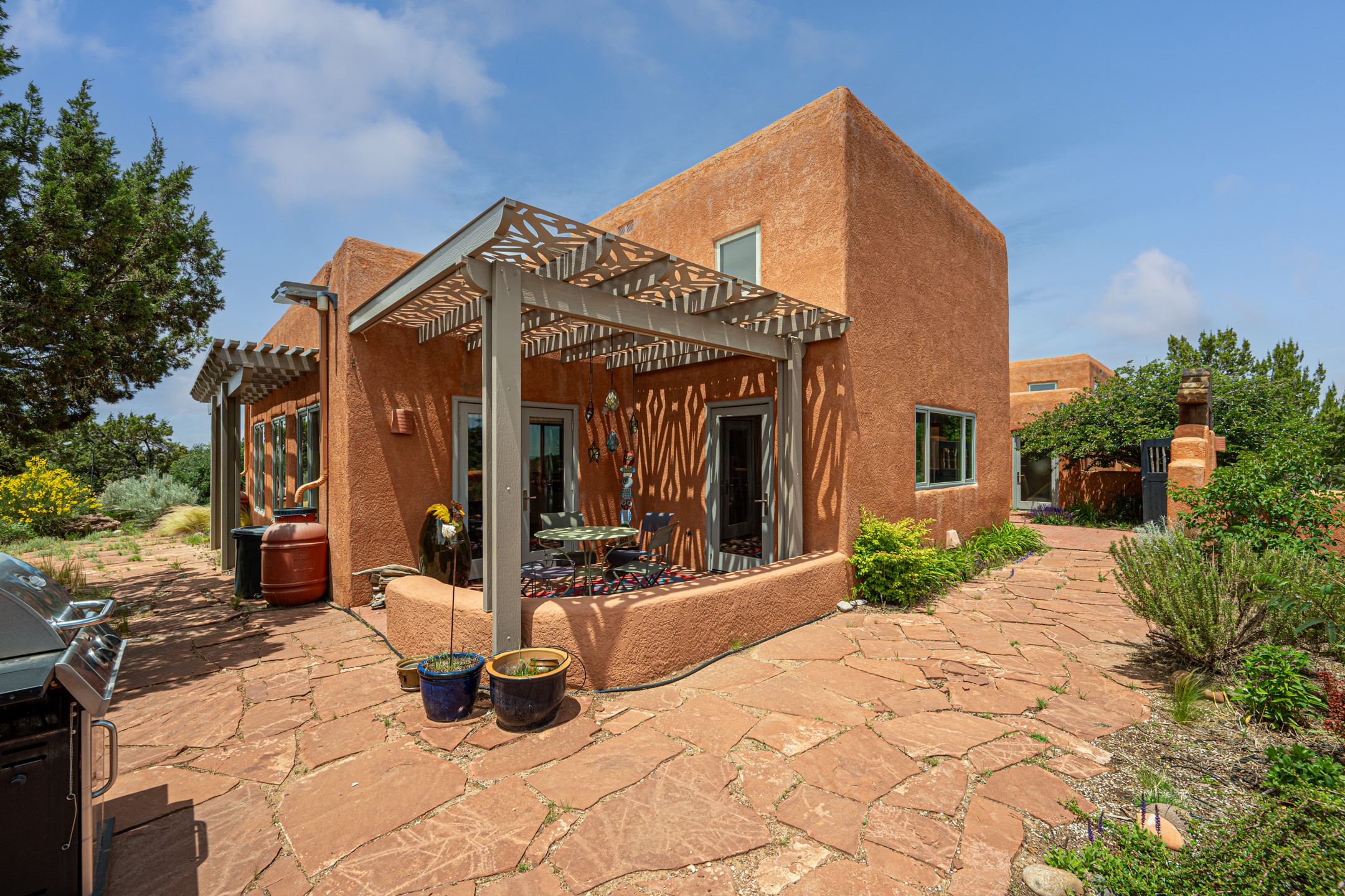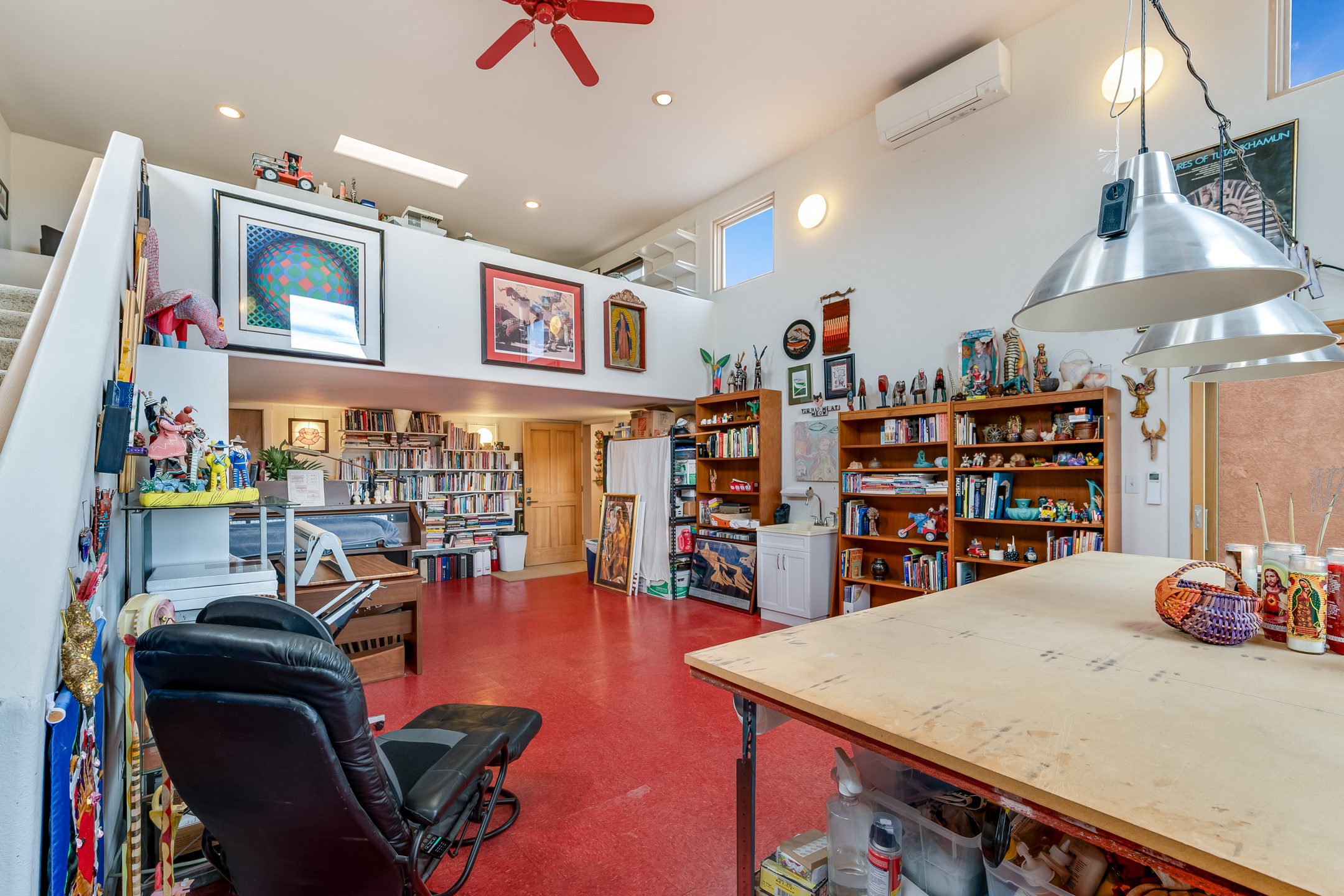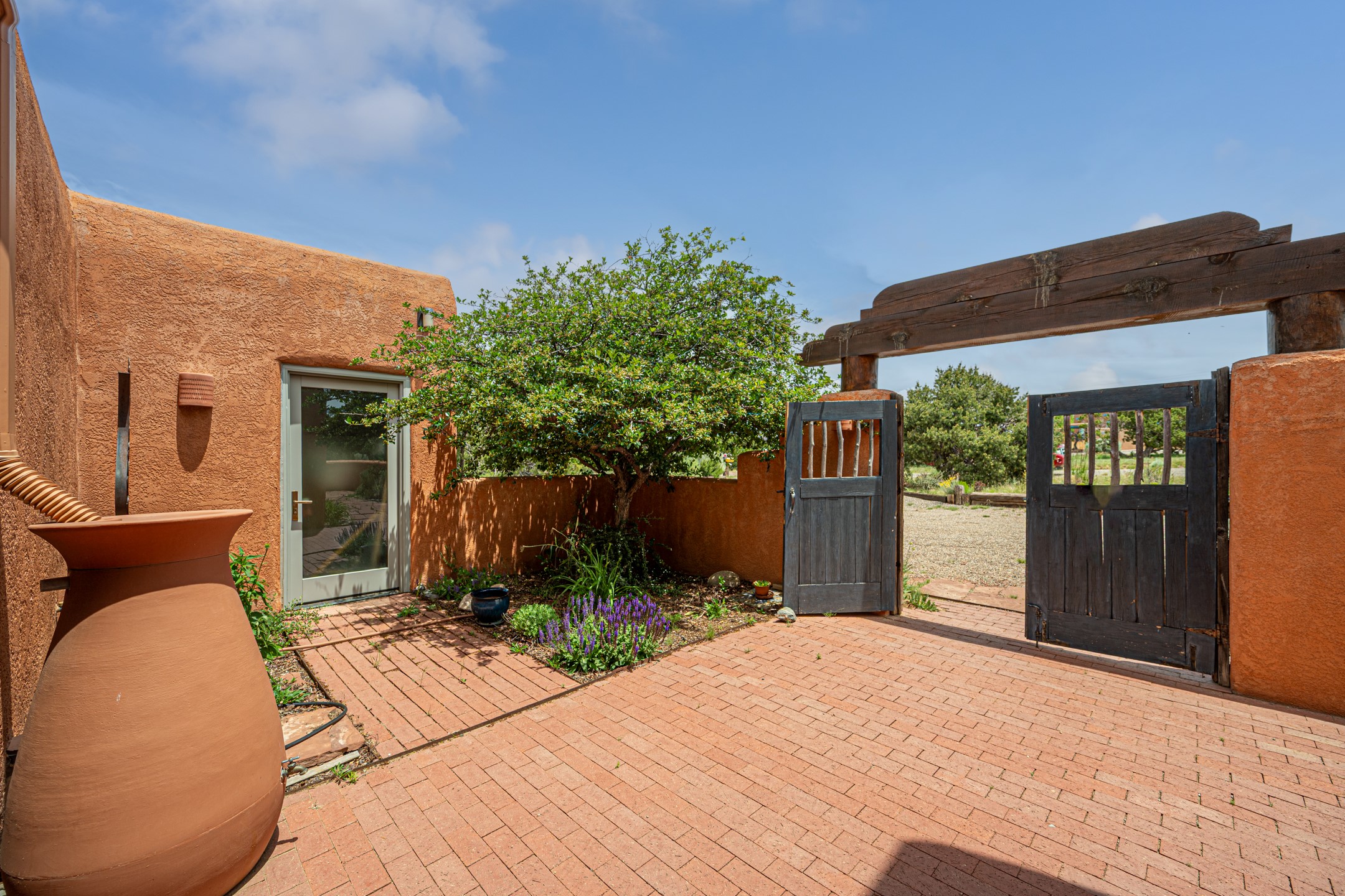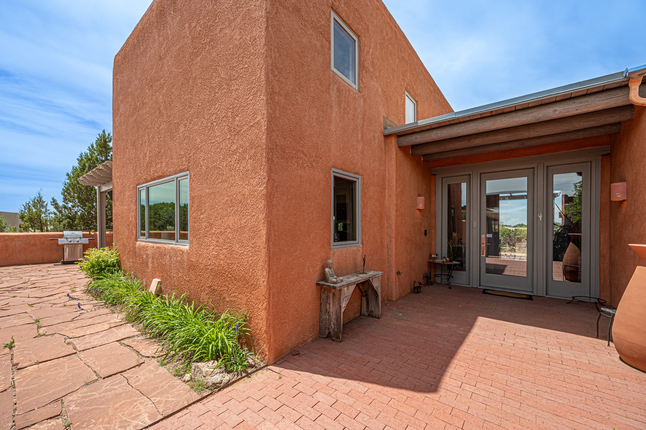 Set on a spacious 1.54+/- acres within the peaceful Eldorado community, this beautifully updated single-story home offers 2800+/- square feet of comfortable living. With 3 bedrooms and 3 & 1/2 bathrooms, it features a versatile layout that includes an attached studio with loft (additional heated 600+/- sqft)-- perfect for creative pursuits or office, gym, or meditation space. Recent updates include new paint, new countertops, and modern appliances throughout the kitchen, which also boasts granite countertops, a gas cooktop and wall-mounted double ovens. High ceilings with traditional vigas, brick flooring, and a charming Kiva fireplace enhance the warm southwestern character of the interior. The expansive primary bedroom includes a generous walk-in closet and an updated en-suite bathroom, offering a private retreat. Enjoy uninterrupted vistas from the rear portal or stay cool inside where the views are just as enticing from behind newer Pella windows and mini-splits to keep you cool. There is convenient parking in the 2-car garage and the lot provides flexibility for gardening or recreation. Enjoy the expansive Eldorado Community Amenities including a pool and walking trails. Come tour this estate today!
