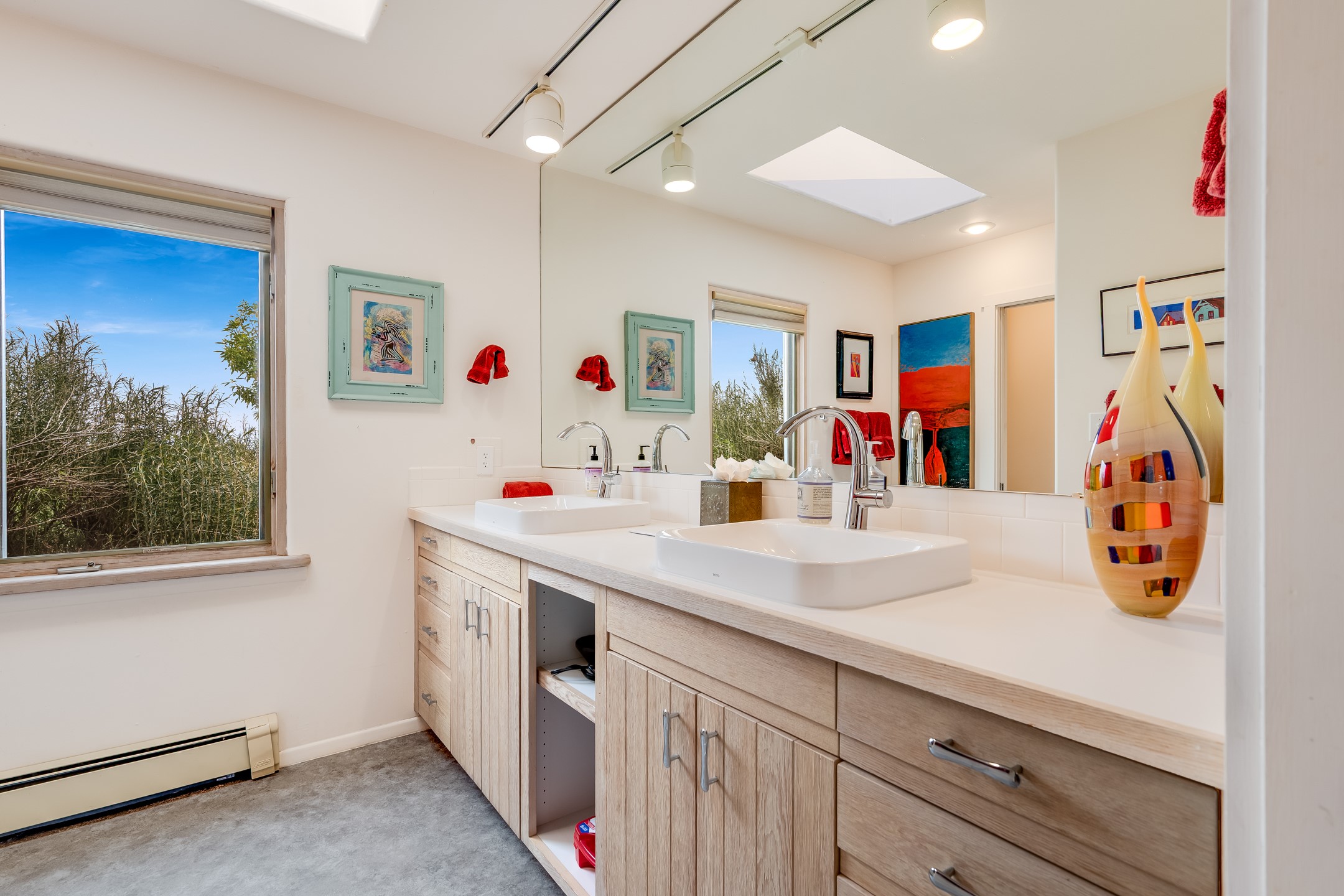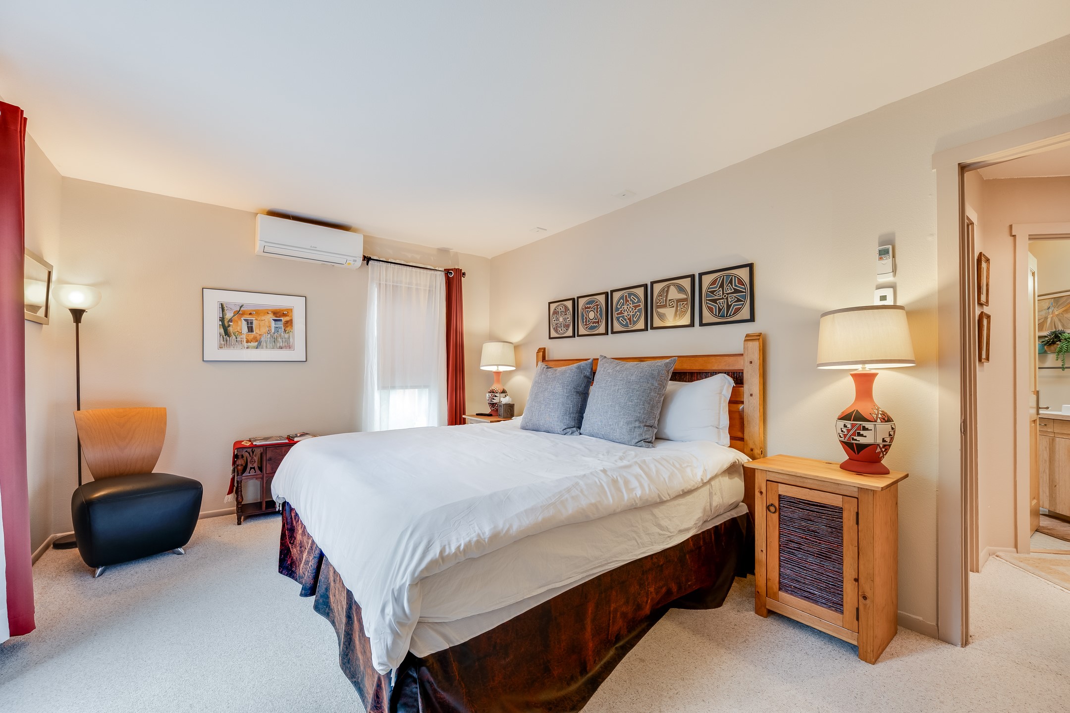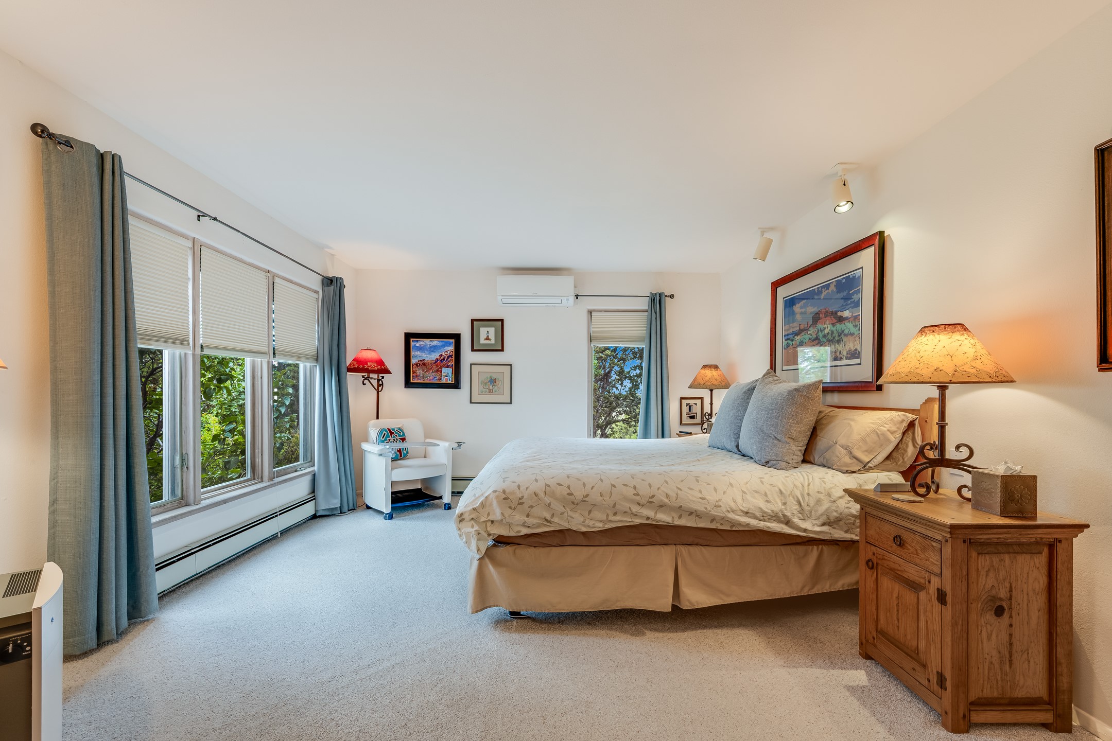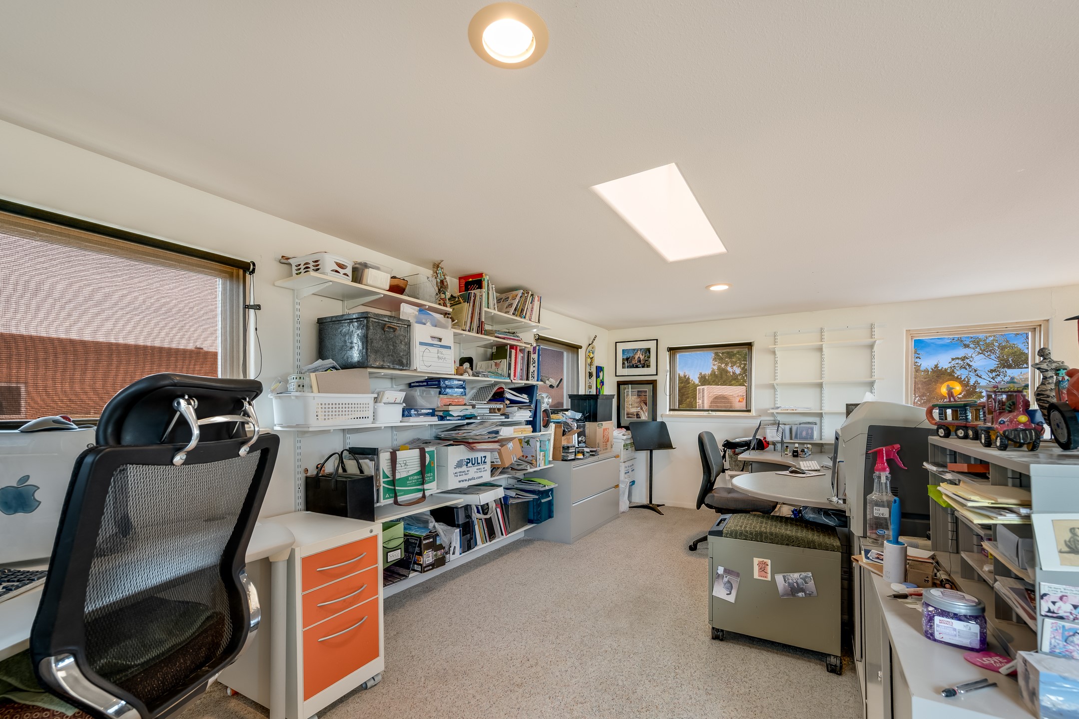 Set on a spacious 1.54+/- acres within the peaceful Eldorado community, this beautifully updated single-story home offers 2800+/- square feet of comfortable living. With 3 bedrooms and 3 & 1/2 bathrooms, it features a versatile layout that includes an attached studio with loft (additional heated 600+/- sqft)-- perfect for creative pursuits or office, gym, or meditation space. Recent updates include new paint, new countertops, and modern appliances throughout the kitchen, which also boasts granite countertops, a gas cooktop and wall-mounted double ovens. High ceilings with traditional vigas, brick flooring, and a charming Kiva fireplace enhance the warm southwestern character of the interior. The expansive primary bedroom includes a generous walk-in closet and an updated en-suite bathroom, offering a private retreat. Enjoy uninterrupted vistas from the rear portal or stay cool inside where the views are just as enticing from behind newer Pella windows and mini-splits to keep you cool. There is convenient parking in the 2-car garage and the lot provides flexibility for gardening or recreation. Enjoy the expansive Eldorado Community Amenities including a pool and walking trails. Come tour this estate today!