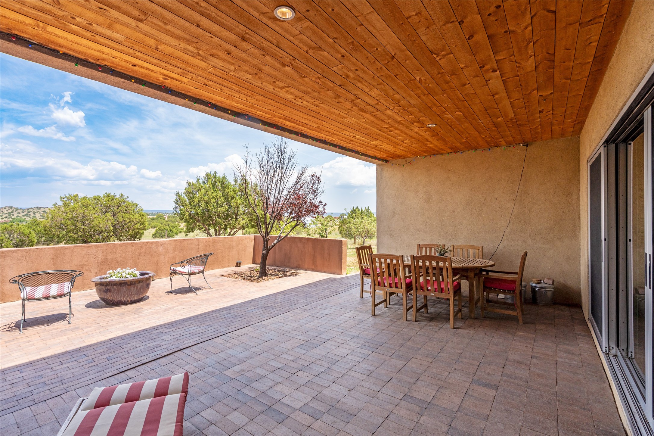 Is Galisteo calling you? Here is a contemporary styled 3 bed, 3 bath home, intelligently designed and well built by EJ Jennings, offering the best of Galisteo: beautiful natural surroundings, panoramic vistas, big skies, solitude and quiet, all a mere 30 minute drive from Santa Fe.Approach a private, walled garden space leading to a wide entryway to the home. The spacious living room glows with natural light and leads the eye to the knockout views, which set this home apart, of Hogback Ridge and the Galisteo Basin! The living room sets the tone for the substantive size and balance of the home's rooms. The open flow from living room to dining room and kitchen allows for both ease of entertainment and an intimate quality of life. Soak up sunsets and dine al fresco on the generous portal off the kitchen which features an outdoor built-in fireplace.The split floor plan offers privacy and serenity, with the primary bedroom suite separated from the two guest bedrooms. One guest bedroom includes an en suite full bath, the other, with gorgeous views, makes an excellent flex space for artists, remote workers and hobbyists. The sustainably minded will appreciate the solar array. With fine features including beamed ceilings in the dining area and kitchen, tile flooring throughout, fresh paint, and plentiful windows all with window treatments, this Galisteo home is ready to receive you!