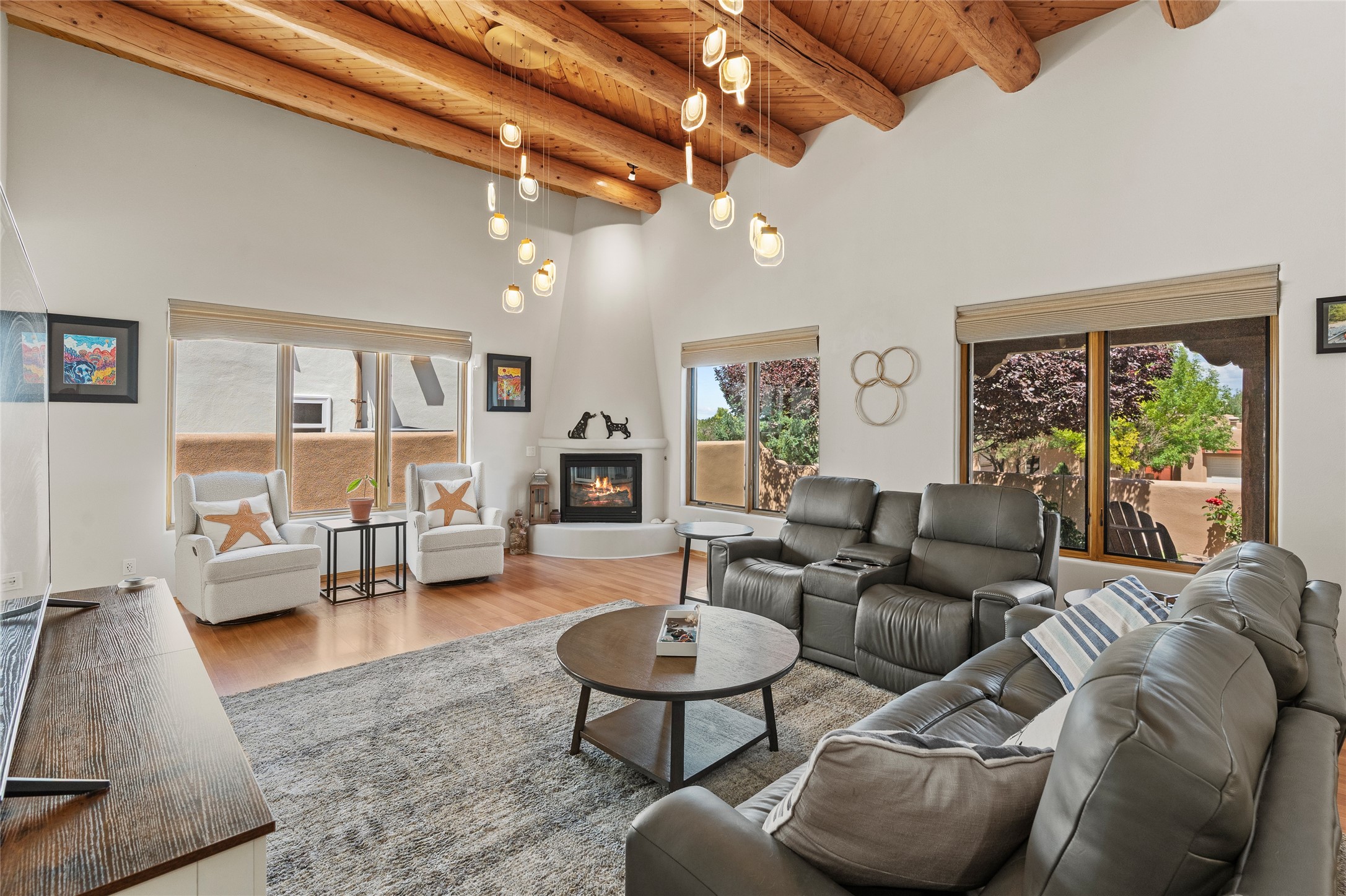 This extensively upgraded home in Pueblos del Sol--boasting over $200,000 in recent enhancements--is one of the finest in the neighborhood. The contemporary kitchen is a standout, featuring top-tier appliances including a new gas cooktop, a beverage refrigerator, sleek modern cabinetry, and a striking stone backsplash that adds a natural, organic touch.The living room impresses with 16-foot ceilings accented by vigas, a gas kiva fireplace, rich wood floors, and oversized windows that flood the space with natural light. All of the windows are newer Pella windows with remote-controlled blinds, providing both ease and comfort. Upstairs, the spacious primary suite offers a private retreat with a cozy sitting area and access to a balcony showcasing expansive sunrise and sunset views. The spa-like bath includes a designer vessel soaking tub, walk-in glass shower, heated towel rack and a generous walk-in closet custom-outfitted by California Closets.Two additional bedrooms are located on the main level, each thoughtfully designed with custom California closet systems. Outside, mature trees offer shade and privacy, and a raised platform invites stargazing or relaxing under the open sky.The oversized two-car garage is another highlight, with 12-foot ceilings, new epoxy flooring, and ceiling-mounted storage to maximize space. Set in a quiet, well-maintained community with its own trail system, this home offers quality, comfort, and convenience--just minutes from all that Santa Fe has to offer.