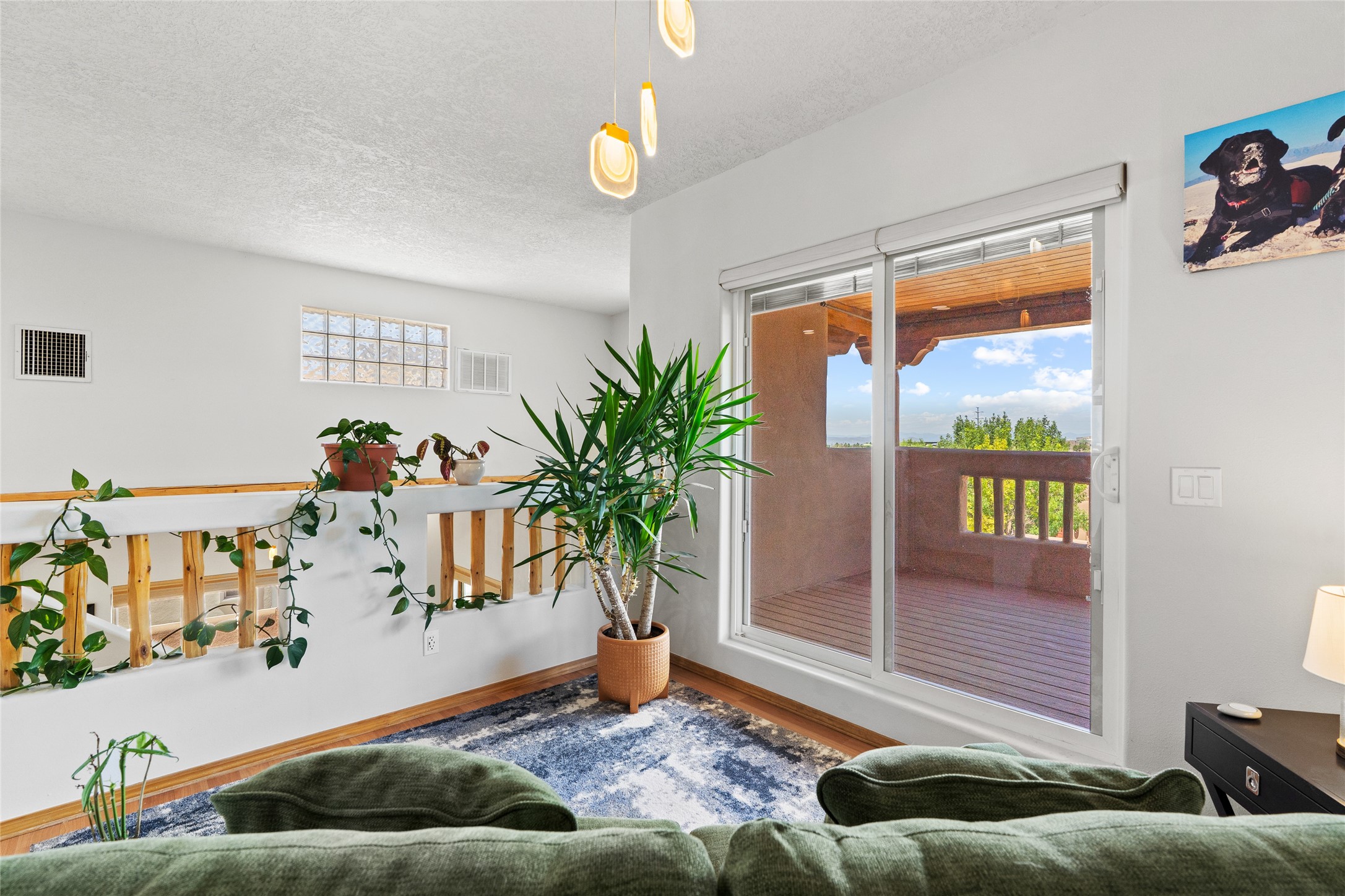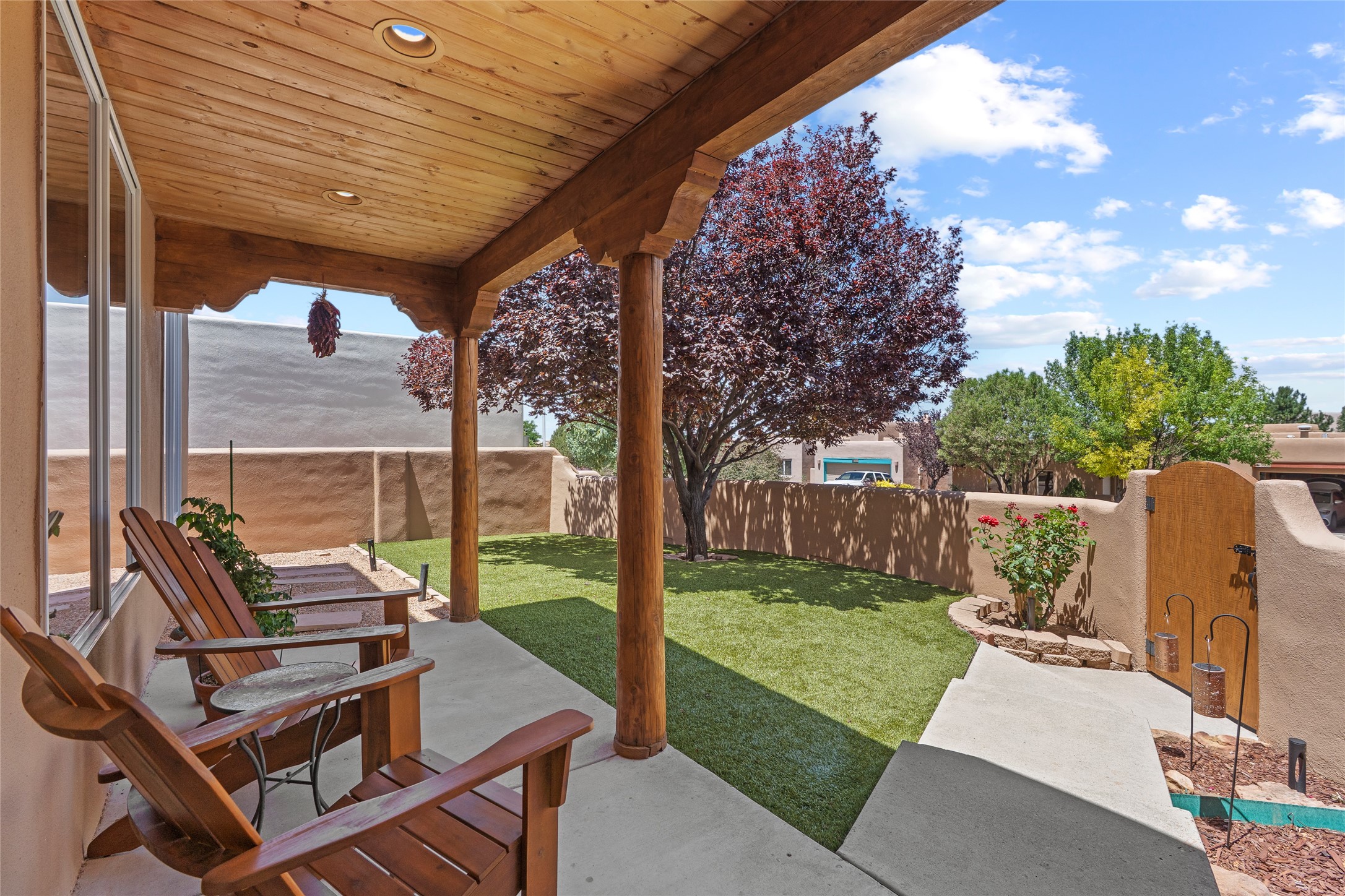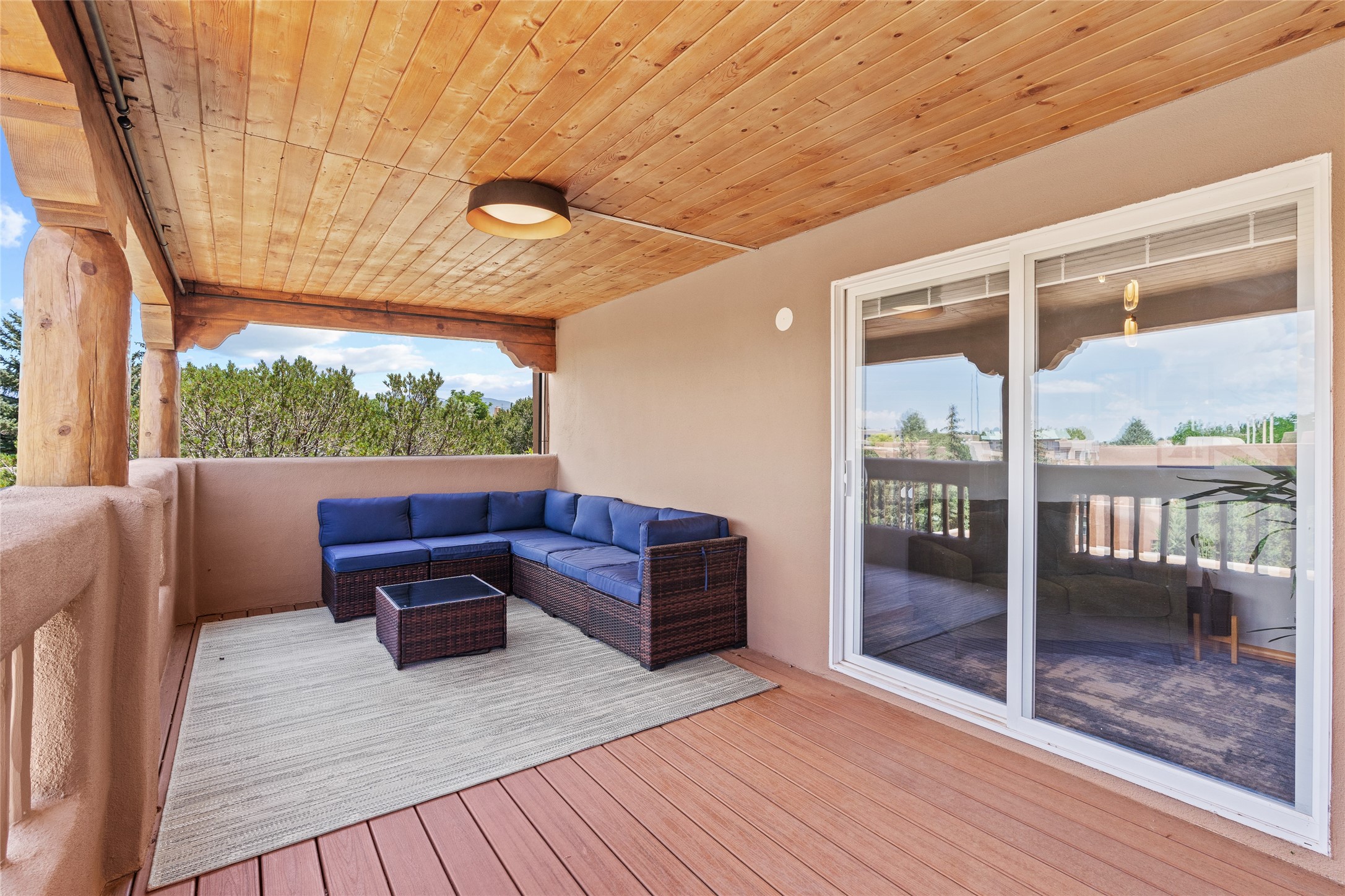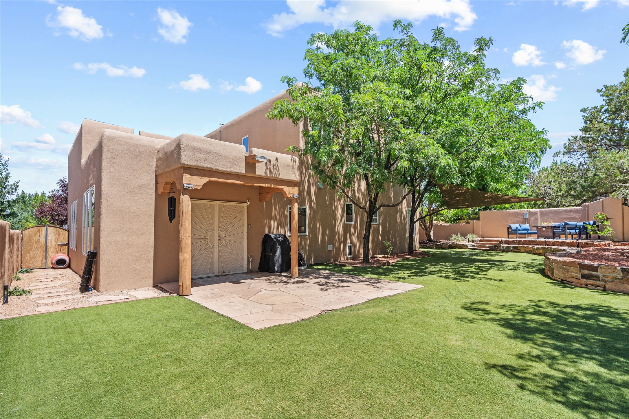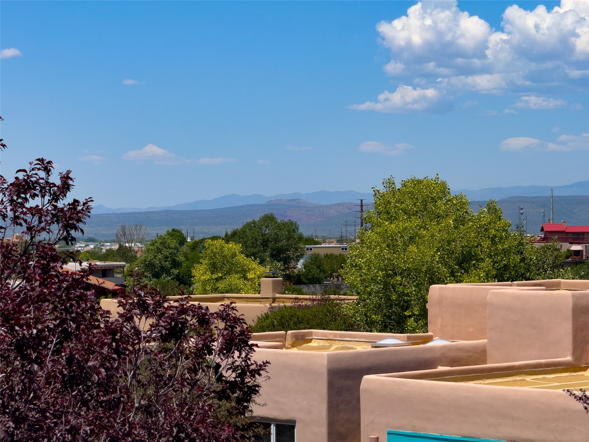 This extensively upgraded home in Pueblos del Sol--boasting over $200,000 in recent enhancements--is one of the finest in the neighborhood. The contemporary kitchen is a standout, featuring top-tier appliances including a new gas cooktop, a beverage refrigerator, sleek modern cabinetry, and a striking stone backsplash that adds a natural, organic touch.The living room impresses with 16-foot ceilings accented by vigas, a gas kiva fireplace, rich wood floors, and oversized windows that flood the space with natural light. All of the windows are newer Pella windows with remote-controlled blinds, providing both ease and comfort. Upstairs, the spacious primary suite offers a private retreat with a cozy sitting area and access to a balcony showcasing expansive sunrise and sunset views. The spa-like bath includes a designer vessel soaking tub, walk-in glass shower, heated towel rack and a generous walk-in closet custom-outfitted by California Closets.Two additional bedrooms are located on the main level, each thoughtfully designed with custom California closet systems. Outside, mature trees offer shade and privacy, and a raised platform invites stargazing or relaxing under the open sky.The oversized two-car garage is another highlight, with 12-foot ceilings, new epoxy flooring, and ceiling-mounted storage to maximize space. Set in a quiet, well-maintained community with its own trail system, this home offers quality, comfort, and convenience--just minutes from all that Santa Fe has to offer.