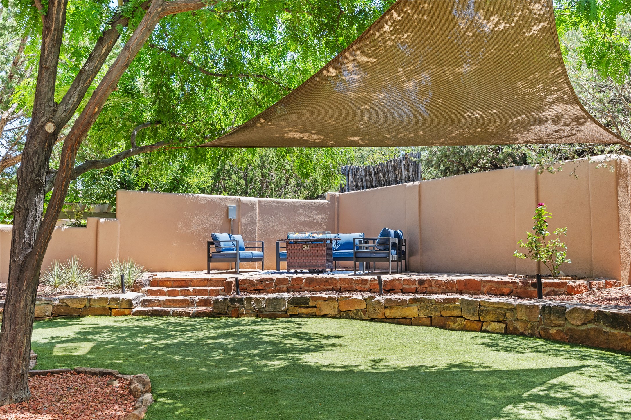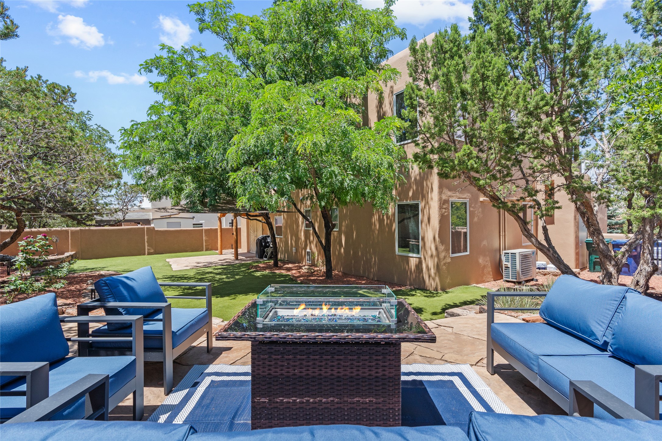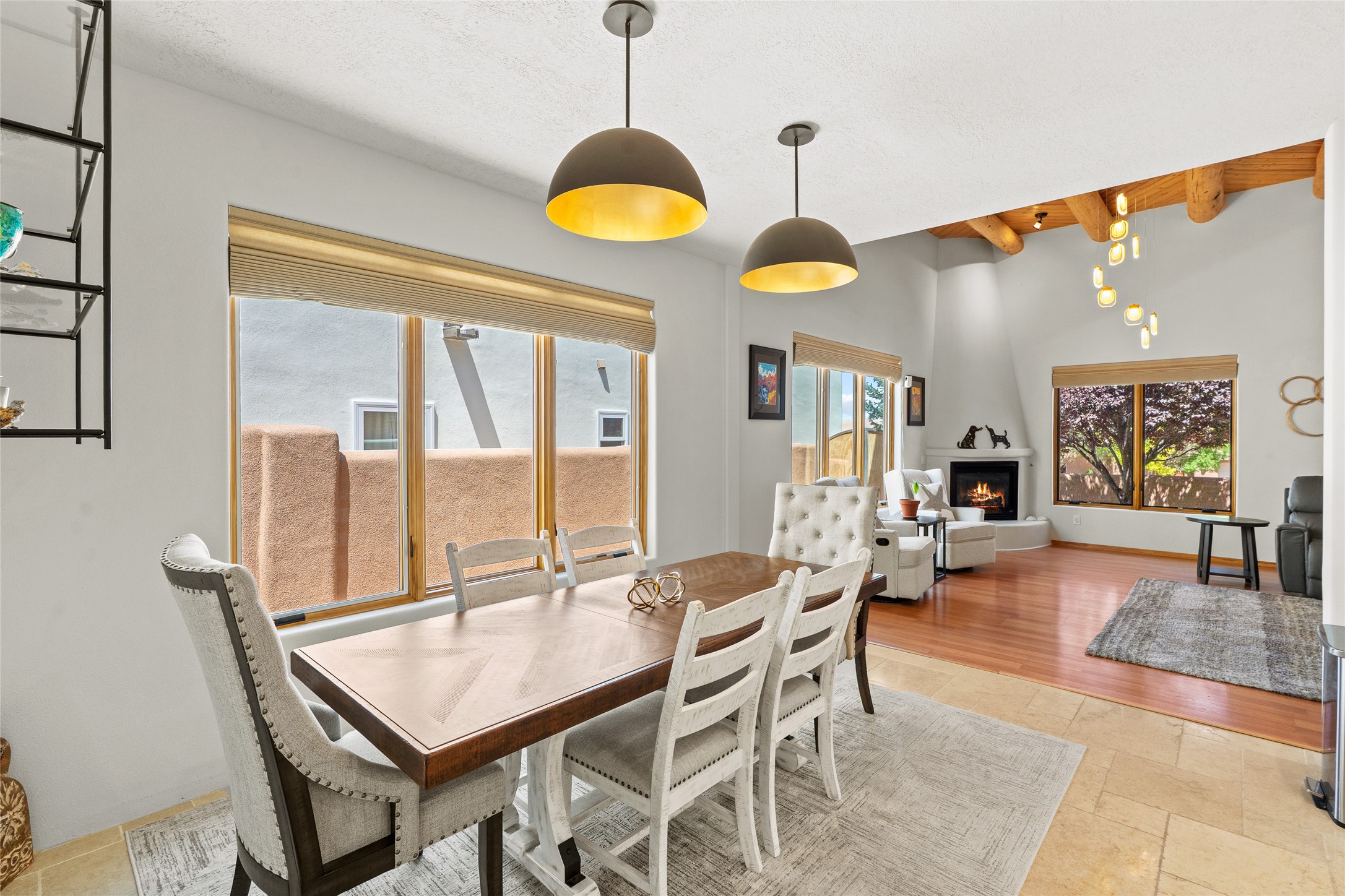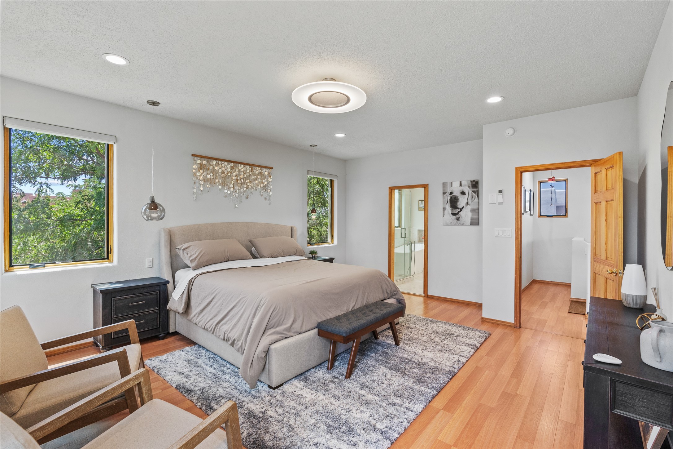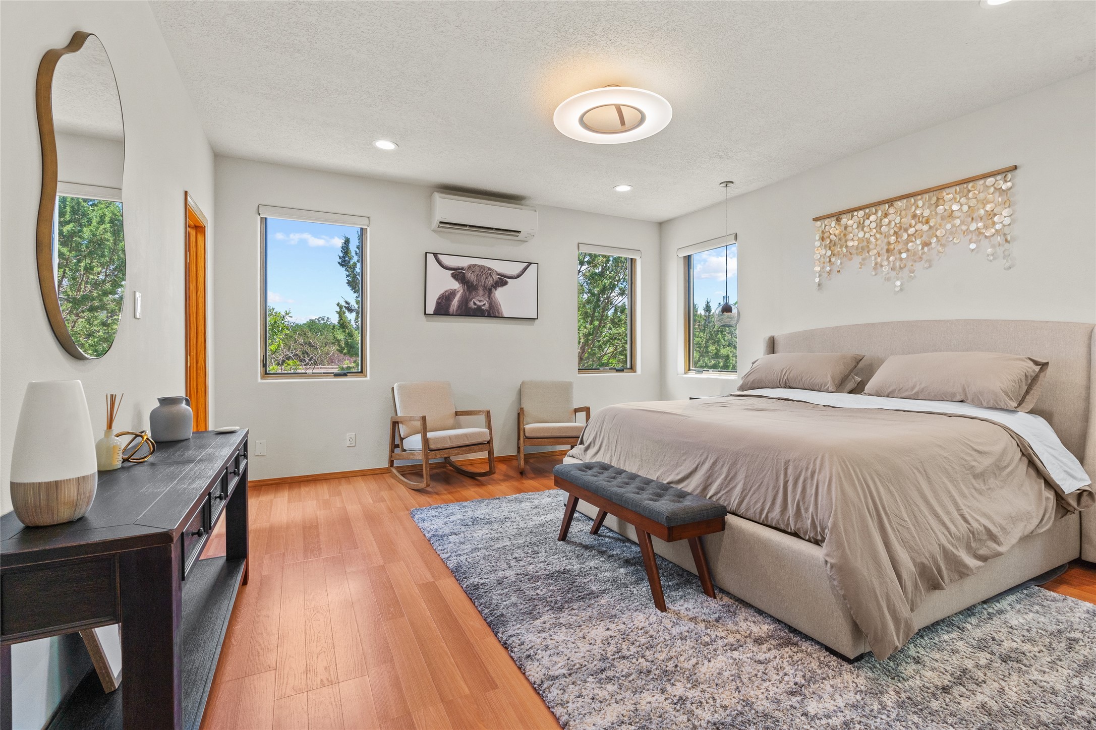 This extensively upgraded home in Pueblos del Sol--boasting over $200,000 in recent enhancements--is one of the finest in the neighborhood. The contemporary kitchen is a standout, featuring top-tier appliances including a new gas cooktop, a beverage refrigerator, sleek modern cabinetry, and a striking stone backsplash that adds a natural, organic touch.The living room impresses with 16-foot ceilings accented by vigas, a gas kiva fireplace, rich wood floors, and oversized windows that flood the space with natural light. All of the windows are newer Pella windows with remote-controlled blinds, providing both ease and comfort. Upstairs, the spacious primary suite offers a private retreat with a cozy sitting area and access to a balcony showcasing expansive sunrise and sunset views. The spa-like bath includes a designer vessel soaking tub, walk-in glass shower, heated towel rack and a generous walk-in closet custom-outfitted by California Closets.Two additional bedrooms are located on the main level, each thoughtfully designed with custom California closet systems. Outside, mature trees offer shade and privacy, and a raised platform invites stargazing or relaxing under the open sky.The oversized two-car garage is another highlight, with 12-foot ceilings, new epoxy flooring, and ceiling-mounted storage to maximize space. Set in a quiet, well-maintained community with its own trail system, this home offers quality, comfort, and convenience--just minutes from all that Santa Fe has to offer.