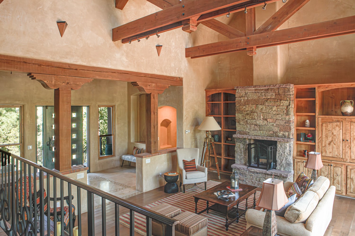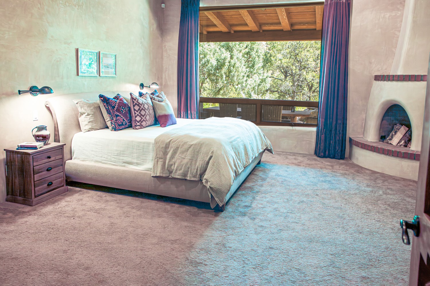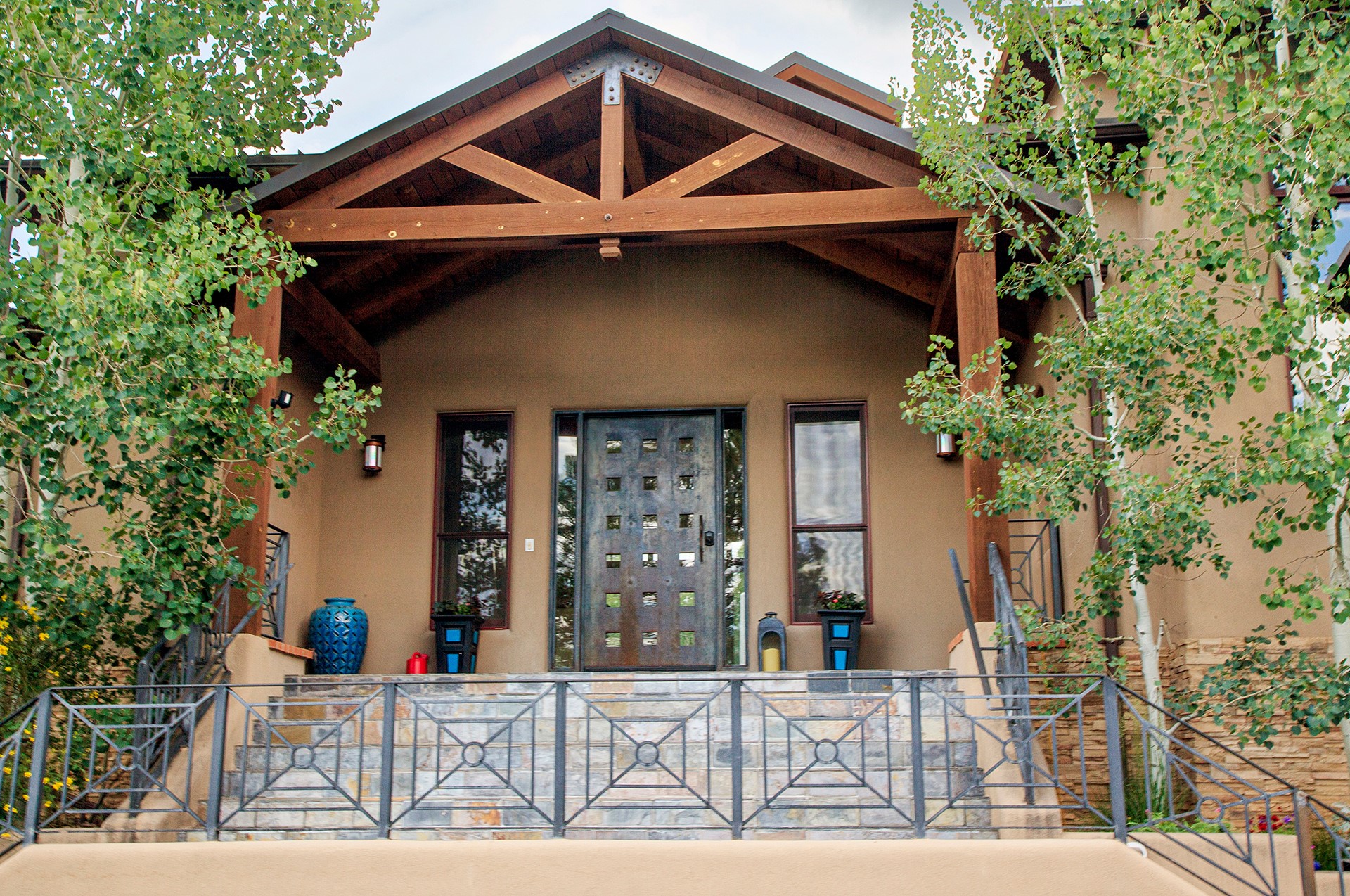 This stunning gated estate sprawls across over 4 acres, offering the perfect blend of privacy and convenience, and only a 20-minute drive to the Santa Fe Ski Basin. The home's architecture is exceptional, featuring a pitched roof, prominent exposed timbers and trusses, a gabled dormer, clerestory windows, a metal roof that enhances its aesthetic appeal and an elevator. The grand entryway is highlighted by a custom steel door and a cascading waterfall feature. The gourmet kitchen is a chef's dream, equipped with a large island, breakfast nook, side-by-side Sub-Zero refrigerator and freezer, a wine and beverage center, and a formal dining area. The spacious living and family rooms are designed for entertaining, with one bedroom in this wing--one large enough to serve as a children's playroom. The expansive master suite includes a sitting area with kiva fireplace, a large bathroom, his and hers closets, and a beautiful view of the adjacent surrounding 25-acre open space. Nearby are an office and two ensuite bedrooms. The lower level features an exercise room, game room, kitchenette, wine cellar, and a bath. Outside, the property is equally impressive, with decks, porches, and patios nestled among lush fruit trees, aspens, and gardens. The outdoor living spaces include a professional BBQ, fireplace, and seating area around a tranquil Koi Pond. A separate combination car/RV garage provides ample space for large vehicles, with a private one-bedroom, one-bath guest house situated above it. This is quite simply a little slice of heaven just minutes from downtown Santa Fe and the Historic Plaza!