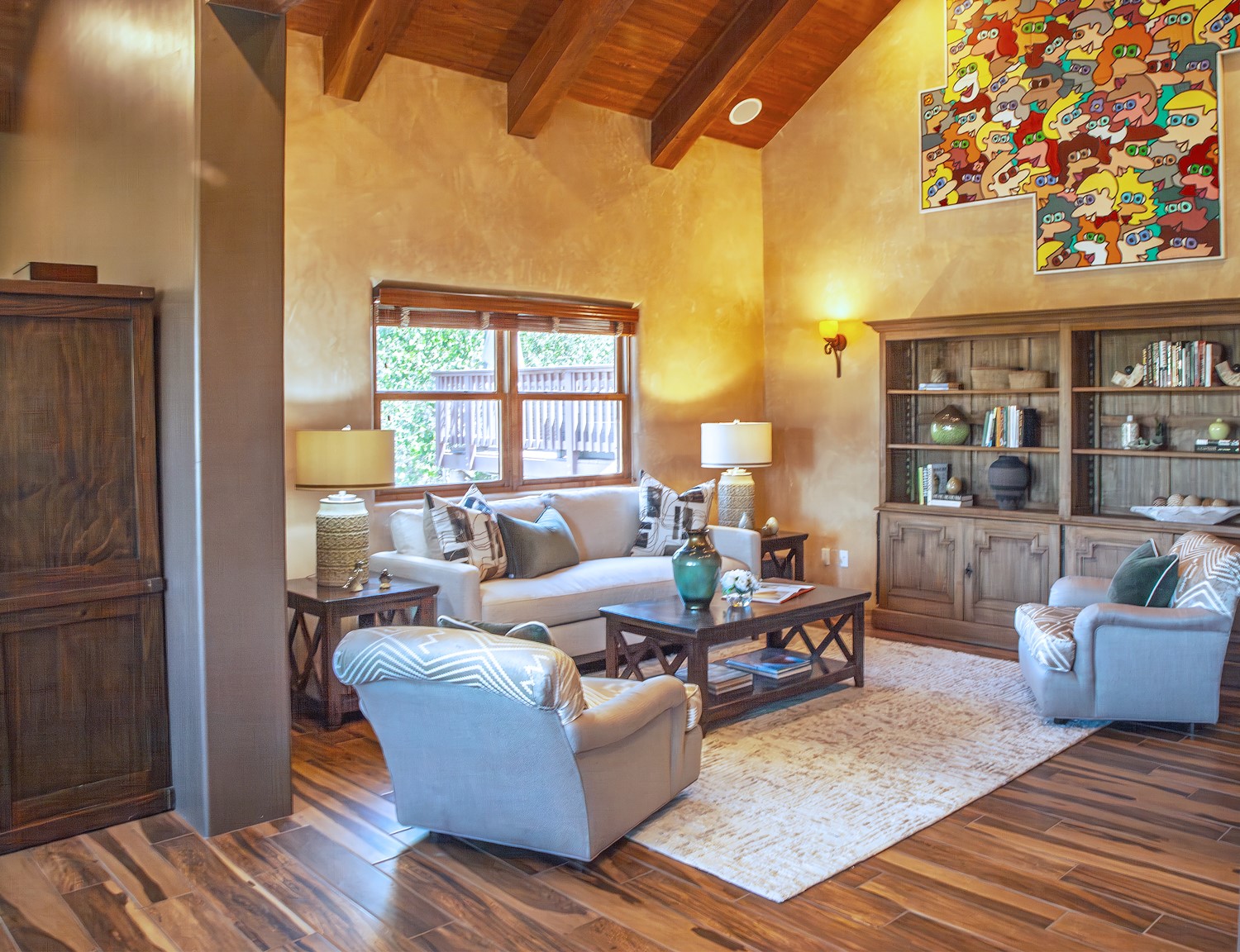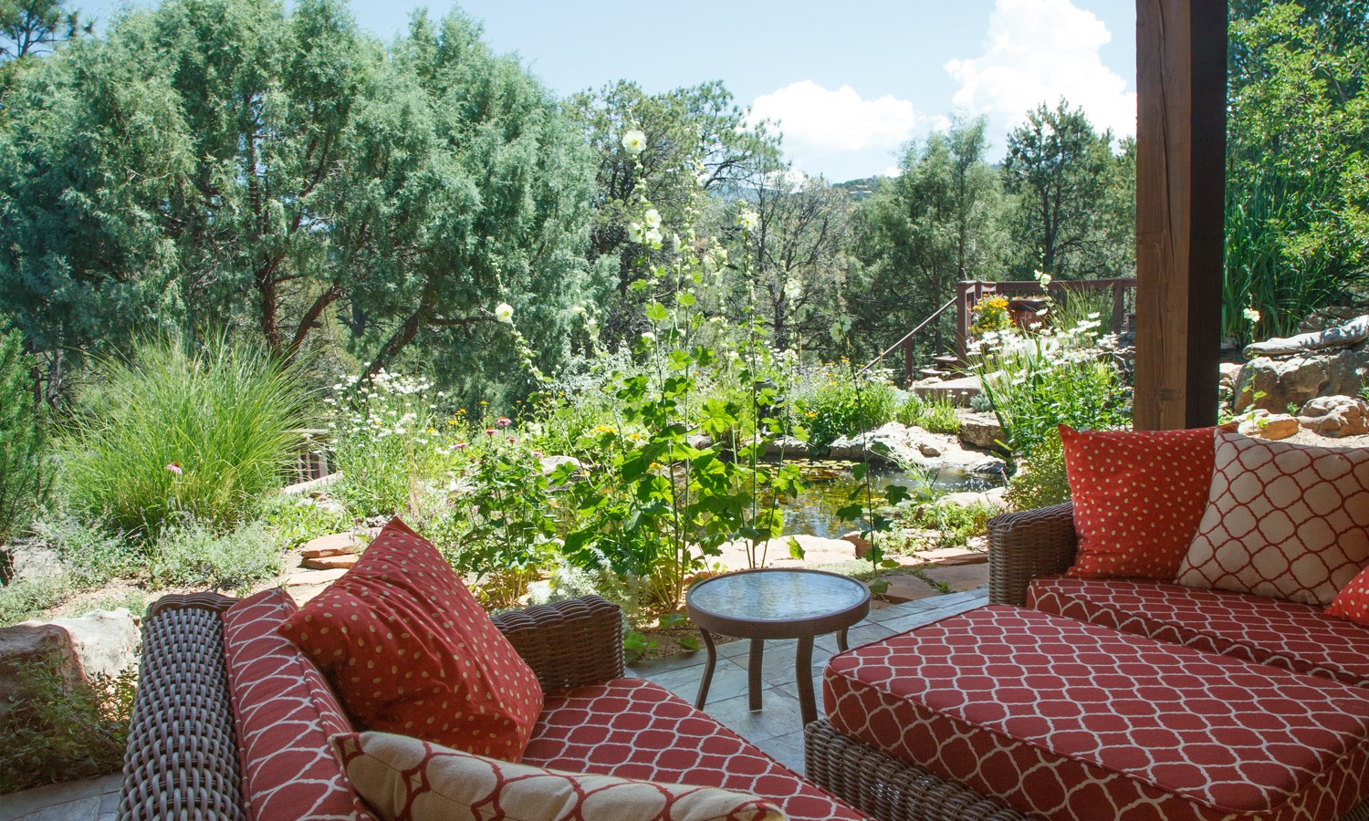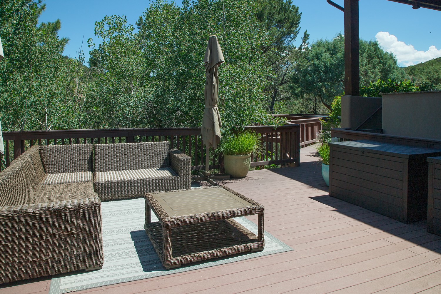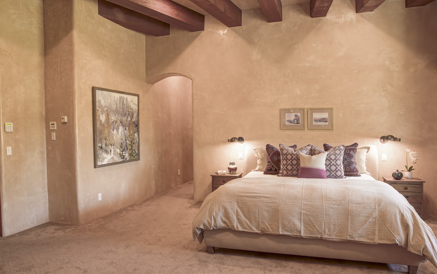 This stunning gated estate sprawls across over 4 acres, offering the perfect blend of privacy and convenience, and only a 20-minute drive to the Santa Fe Ski Basin. The home's architecture is exceptional, featuring a pitched roof, prominent exposed timbers and trusses, a gabled dormer, clerestory windows, a metal roof that enhances its aesthetic appeal and an elevator. The grand entryway is highlighted by a custom steel door and a cascading waterfall feature. The gourmet kitchen is a chef's dream, equipped with a large island, breakfast nook, side-by-side Sub-Zero refrigerator and freezer, a wine and beverage center, and a formal dining area. The spacious living and family rooms are designed for entertaining, with one bedroom in this wing--one large enough to serve as a children's playroom. The expansive master suite includes a sitting area with kiva fireplace, a large bathroom, his and hers closets, and a beautiful view of the adjacent surrounding 25-acre open space. Nearby are an office and two ensuite bedrooms. The lower level features an exercise room, game room, kitchenette, wine cellar, and a bath. Outside, the property is equally impressive, with decks, porches, and patios nestled among lush fruit trees, aspens, and gardens. The outdoor living spaces include a professional BBQ, fireplace, and seating area around a tranquil Koi Pond. A separate combination car/RV garage provides ample space for large vehicles, with a private one-bedroom, one-bath guest house situated above it. This is quite simply a little slice of heaven just minutes from downtown Santa Fe and the Historic Plaza!