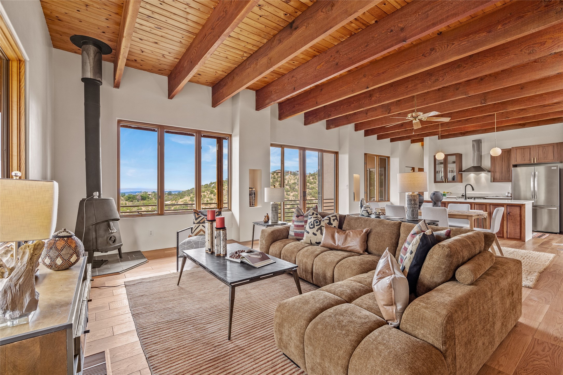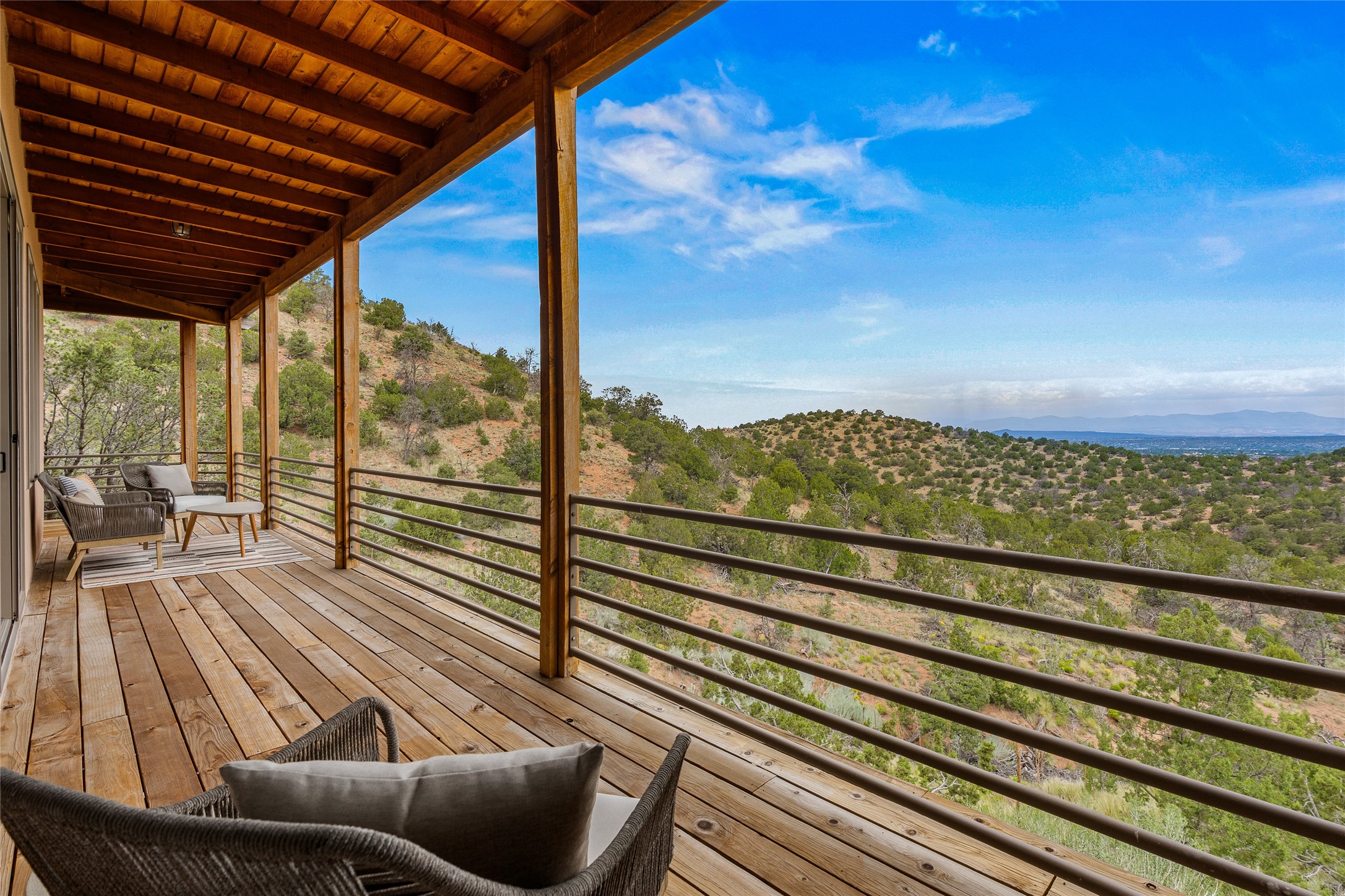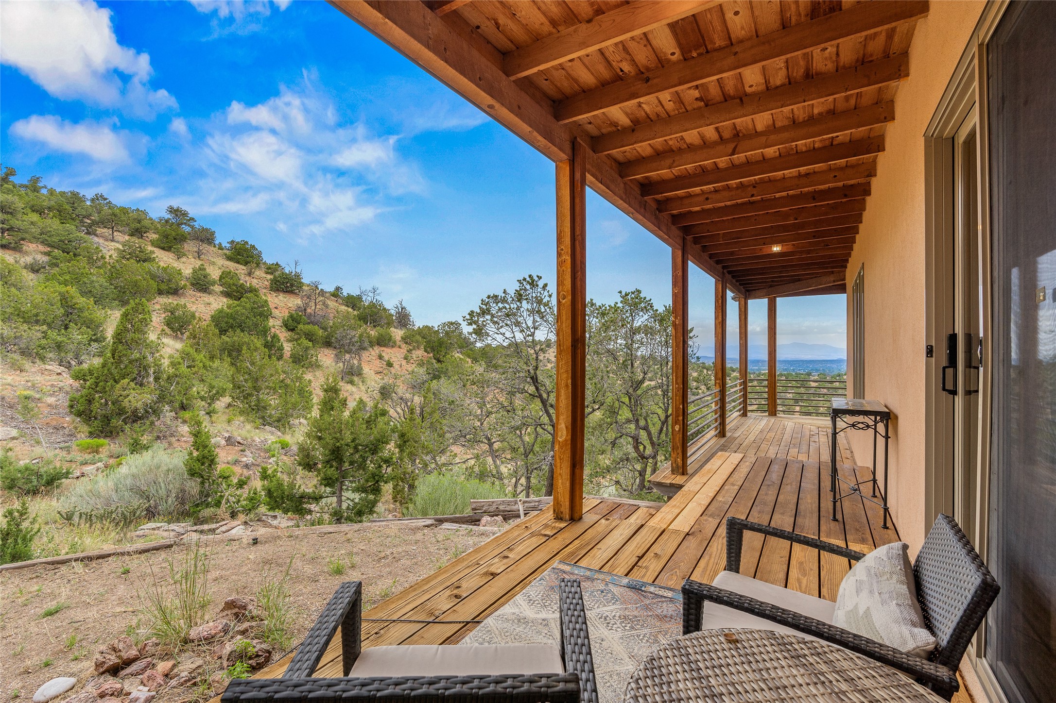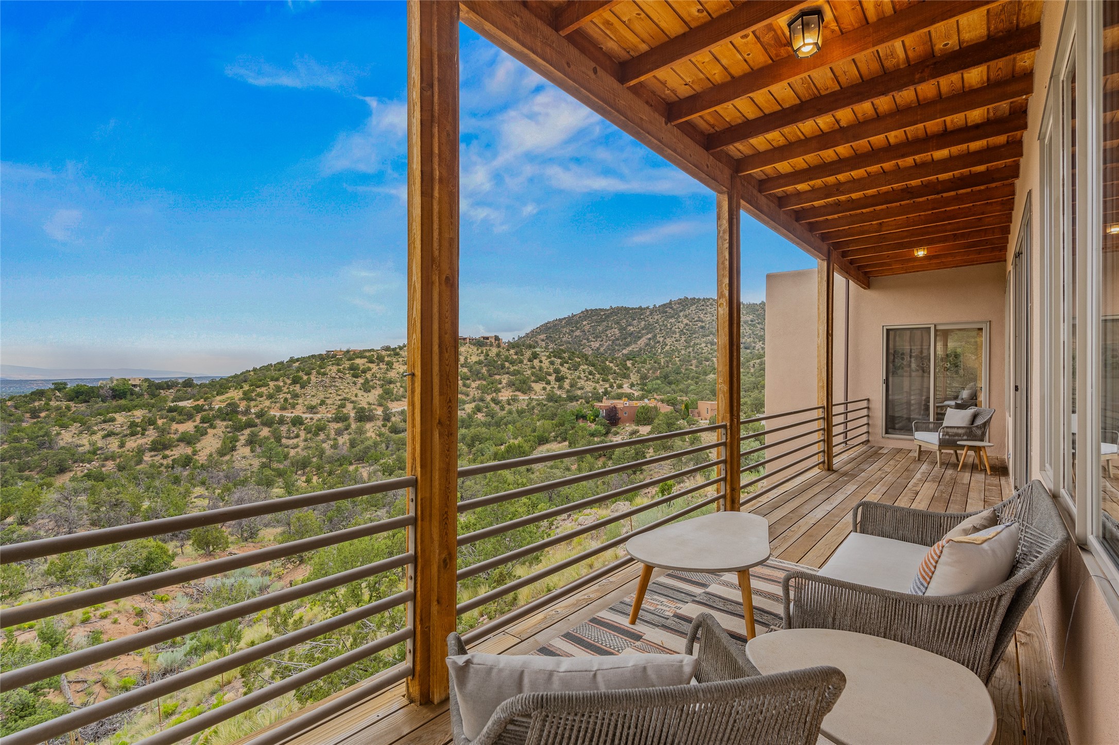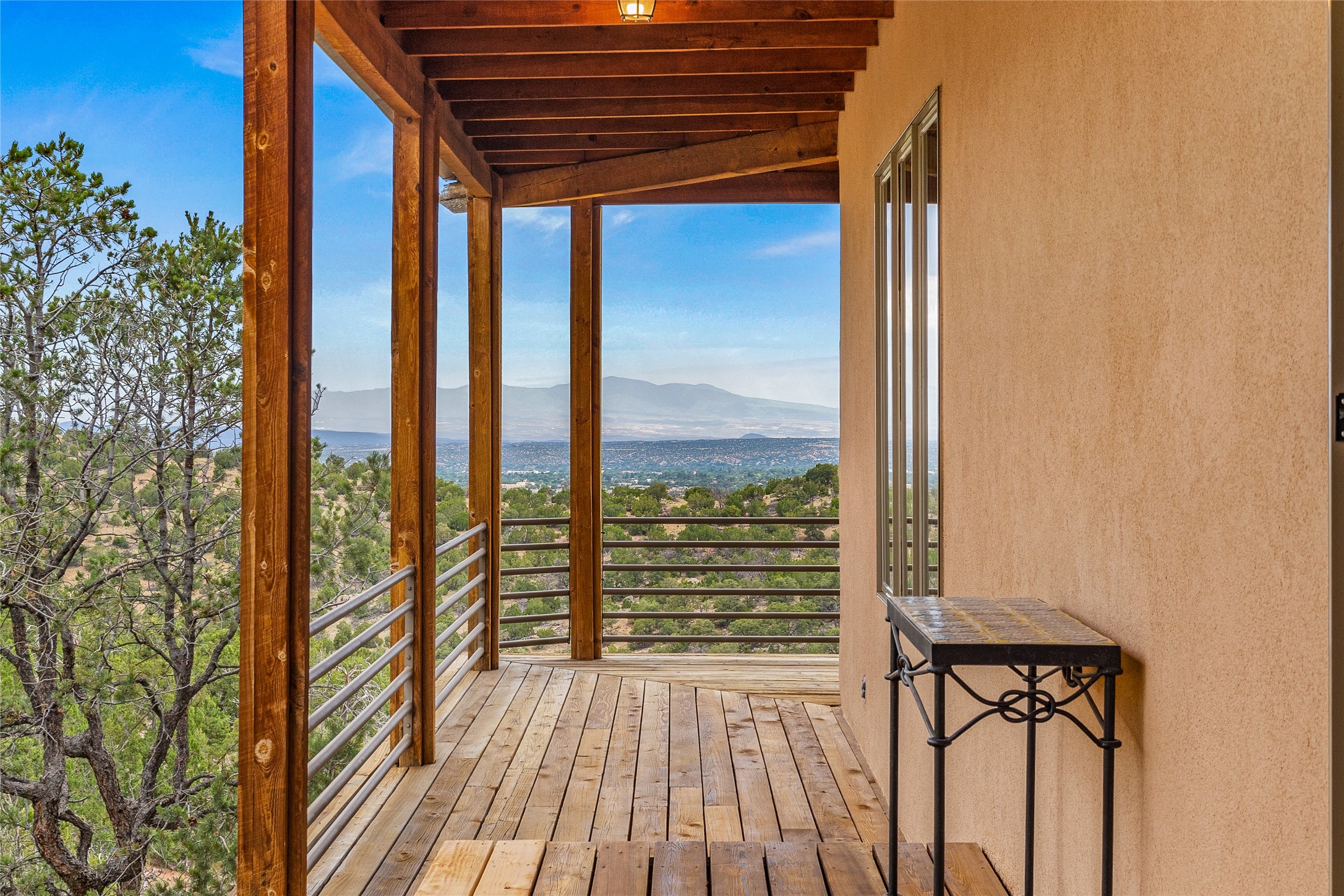 Welcome to your own hilltop "Heaven". A stunning, fully renovated retreat where refined living meets the serenity of sky-high vistas. Perched on 10 private acres, this exceptional residence offers unobstructed panoramic views of the majestic Jemez Mountains, framed by natural rock outcroppings and open skies in every direction.Extensively updated inside and out, the home seamlessly blends custom craftsmanship with modern luxury. Dramatic Mahogany double entry doors and hand-carved doors in the primary suite set a tone of timeless elegance. Recent exterior upgrades include a brand-new roof and fresh stucco for lasting curb appeal.Inside, a chef's dream kitchen awaits--featuring sleek quartz countertops and top-tier stainless steel appliances, ideal for both quiet evenings and lively entertaining. Rich wood floors flow through light-filled open living spaces that draw the eye to the breathtaking landscape beyond.Designed for year-round comfort, the home includes a new tankless water heater, furnace, and central air conditioning. Guests will enjoy a beautifully updated bathroom and a thoughtfully designed floor plan that offers privacy and separation between the primary suite and guest quarters.Step outside onto newly refreshed decks and savor the peace of your elevated retreat--perfect for sunset cocktails, morning coffee, or stargazing under New Mexico's vast night skies.Elegant, tranquil, and truly move-in ready, this one-of-a-kind property invites you to live above it all--where natural beauty, modern amenities, and quiet luxury come together in perfect harmony.