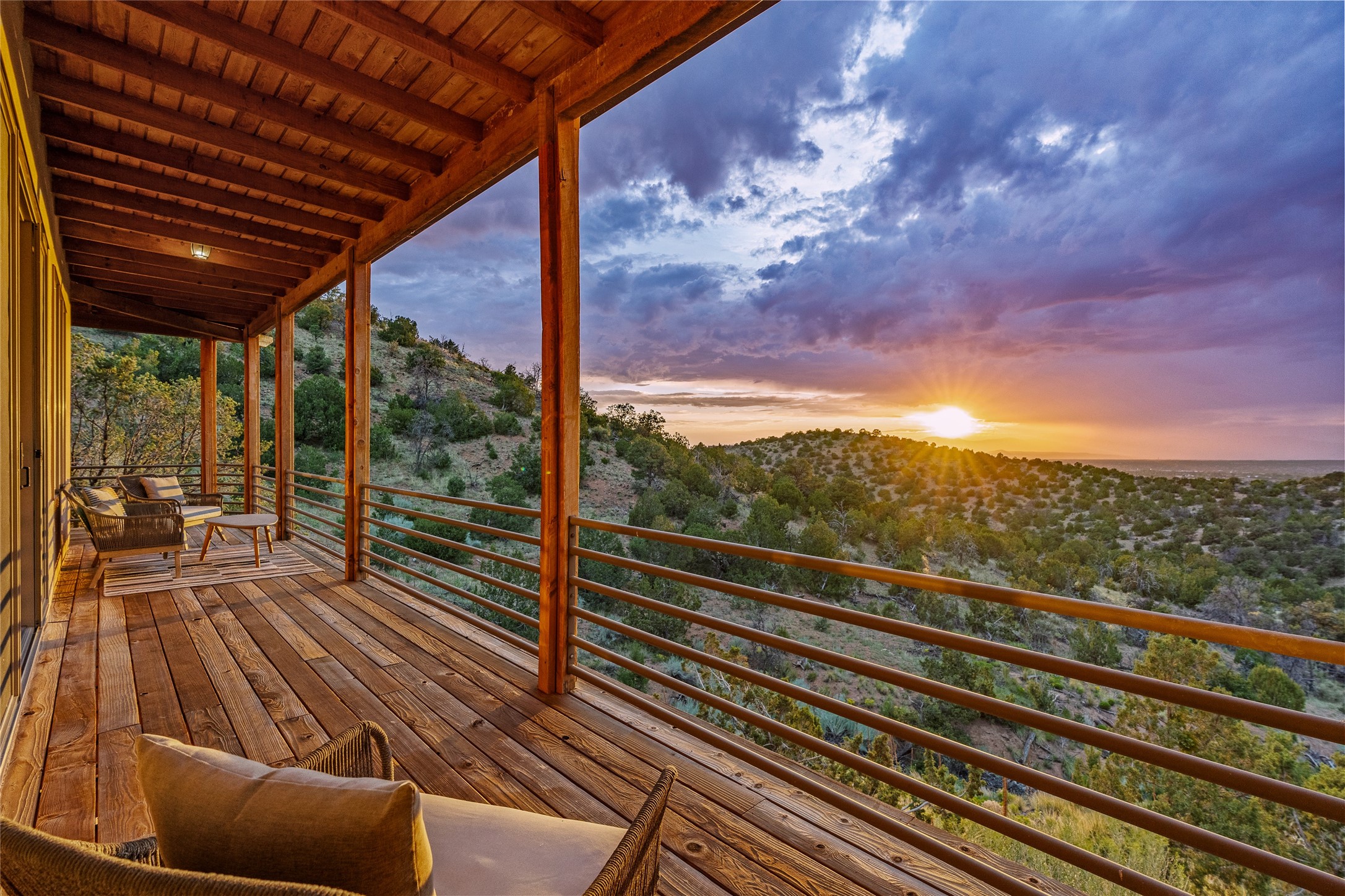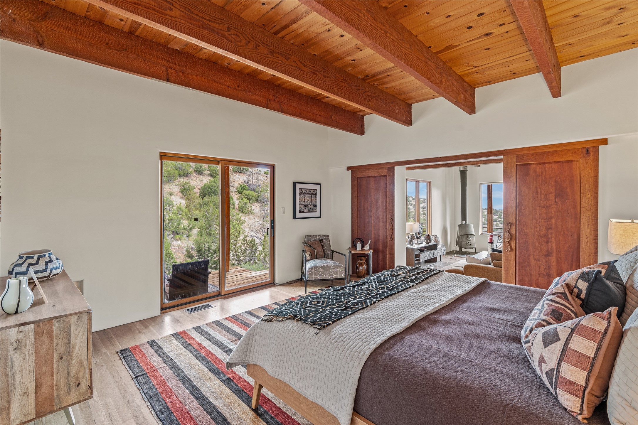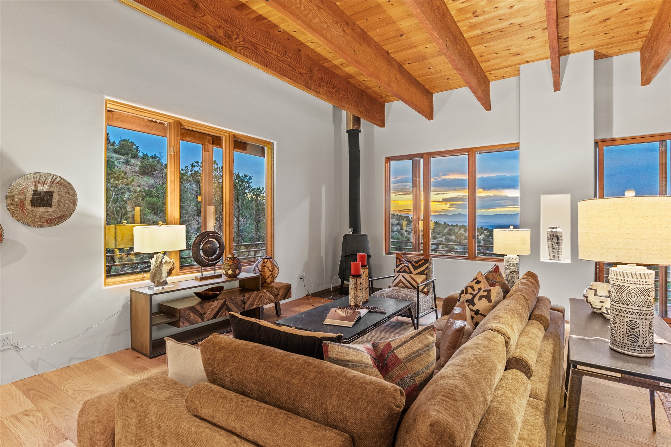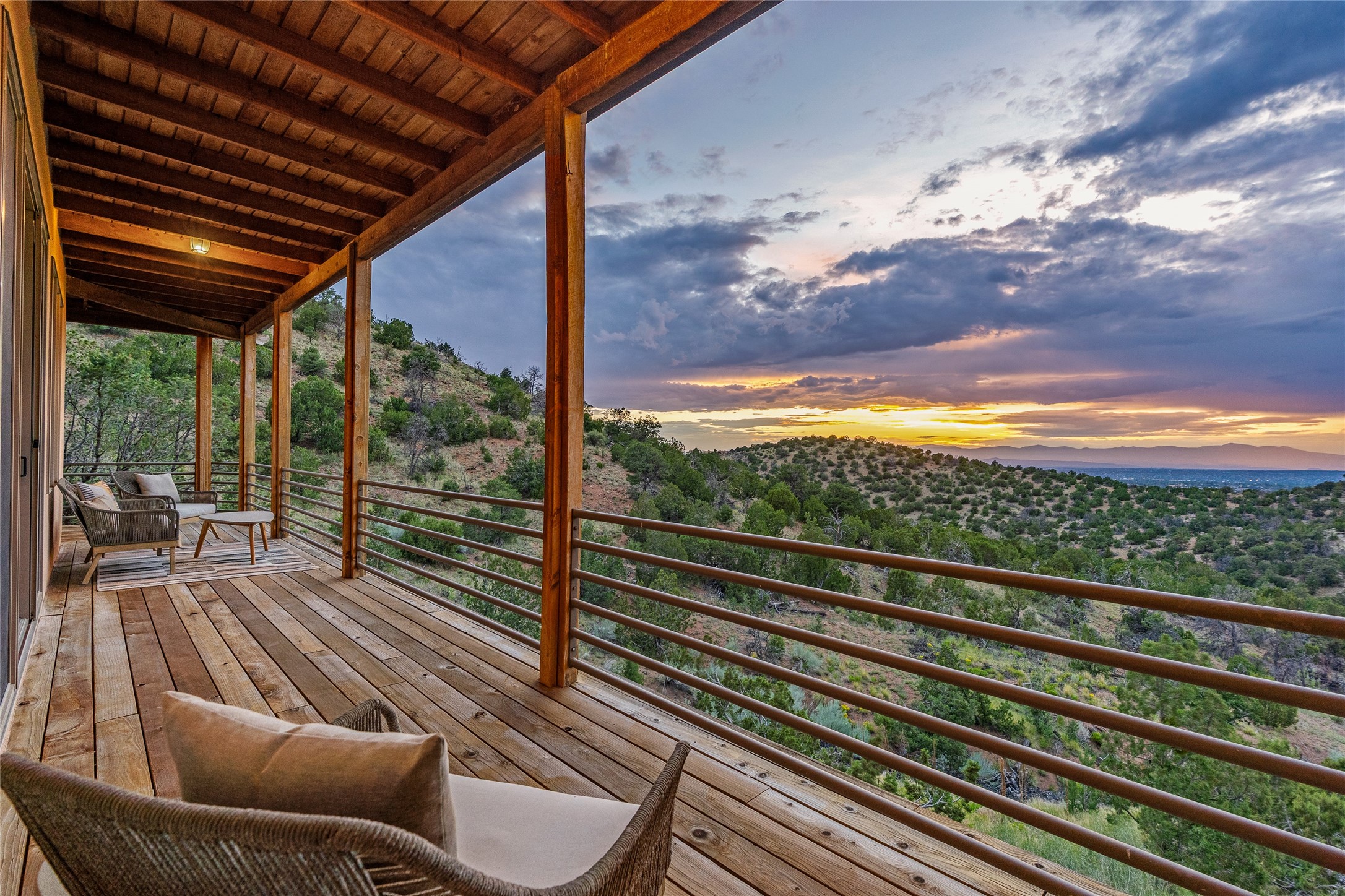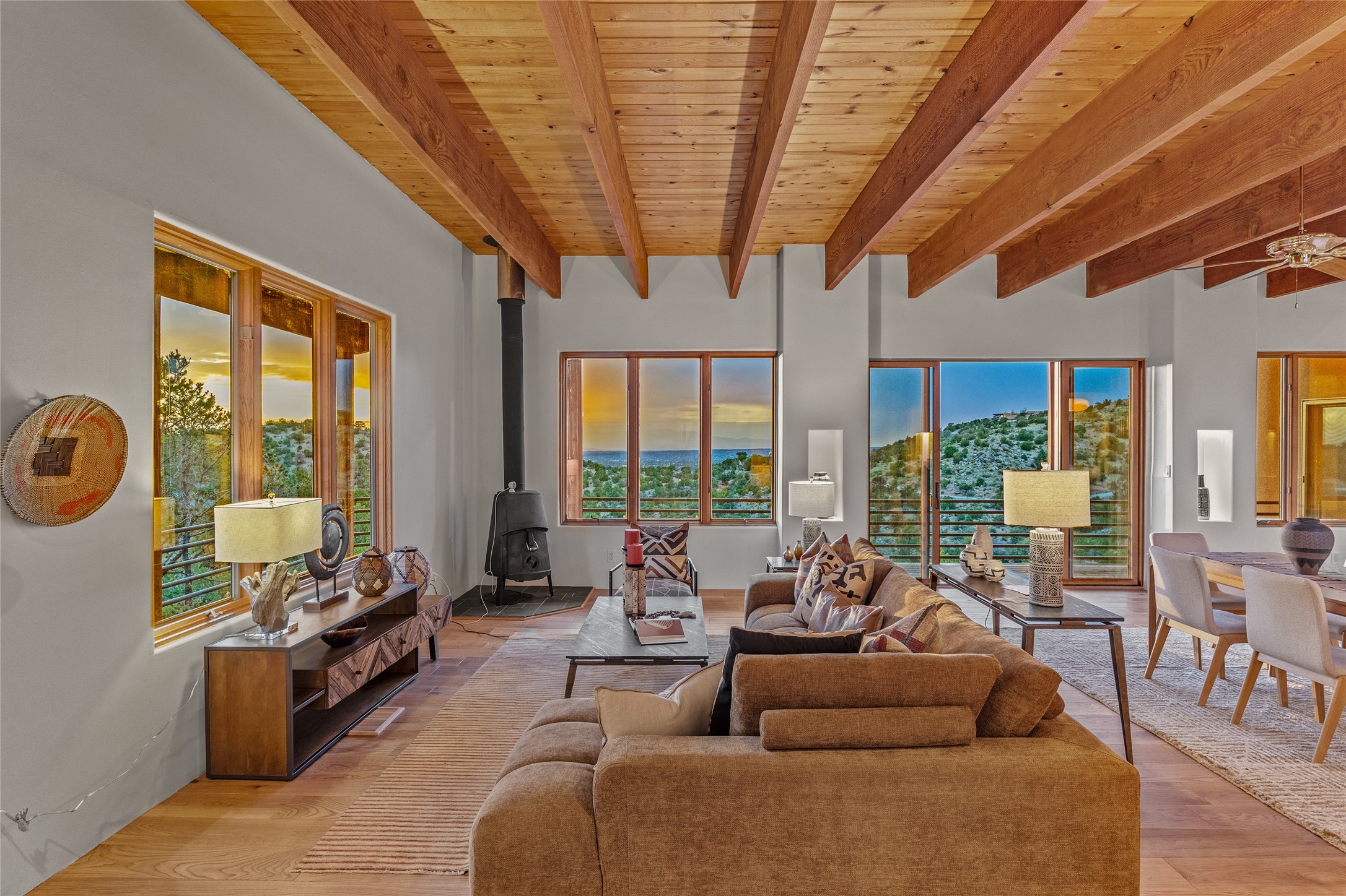 Welcome to your own hilltop "Heaven". A stunning, fully renovated retreat where refined living meets the serenity of sky-high vistas. Perched on 10 private acres, this exceptional residence offers unobstructed panoramic views of the majestic Jemez Mountains, framed by natural rock outcroppings and open skies in every direction.Extensively updated inside and out, the home seamlessly blends custom craftsmanship with modern luxury. Dramatic Mahogany double entry doors and hand-carved doors in the primary suite set a tone of timeless elegance. Recent exterior upgrades include a brand-new roof and fresh stucco for lasting curb appeal.Inside, a chef's dream kitchen awaits--featuring sleek quartz countertops and top-tier stainless steel appliances, ideal for both quiet evenings and lively entertaining. Rich wood floors flow through light-filled open living spaces that draw the eye to the breathtaking landscape beyond.Designed for year-round comfort, the home includes a new tankless water heater, furnace, and central air conditioning. Guests will enjoy a beautifully updated bathroom and a thoughtfully designed floor plan that offers privacy and separation between the primary suite and guest quarters.Step outside onto newly refreshed decks and savor the peace of your elevated retreat--perfect for sunset cocktails, morning coffee, or stargazing under New Mexico's vast night skies.Elegant, tranquil, and truly move-in ready, this one-of-a-kind property invites you to live above it all--where natural beauty, modern amenities, and quiet luxury come together in perfect harmony.
