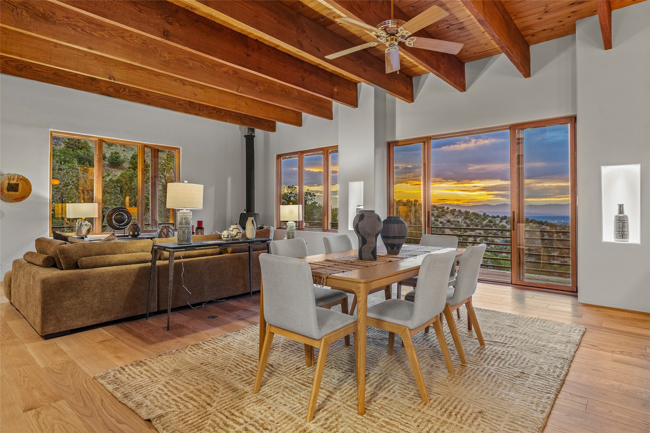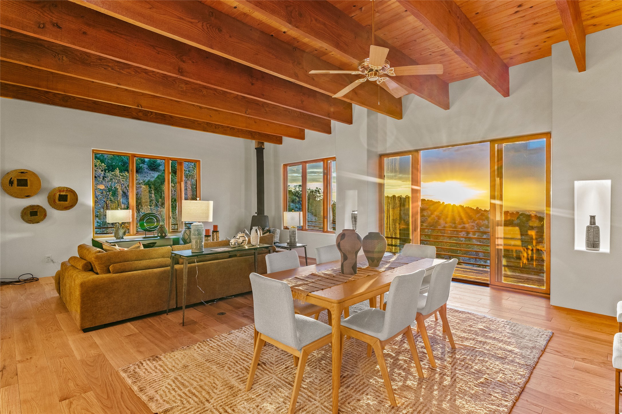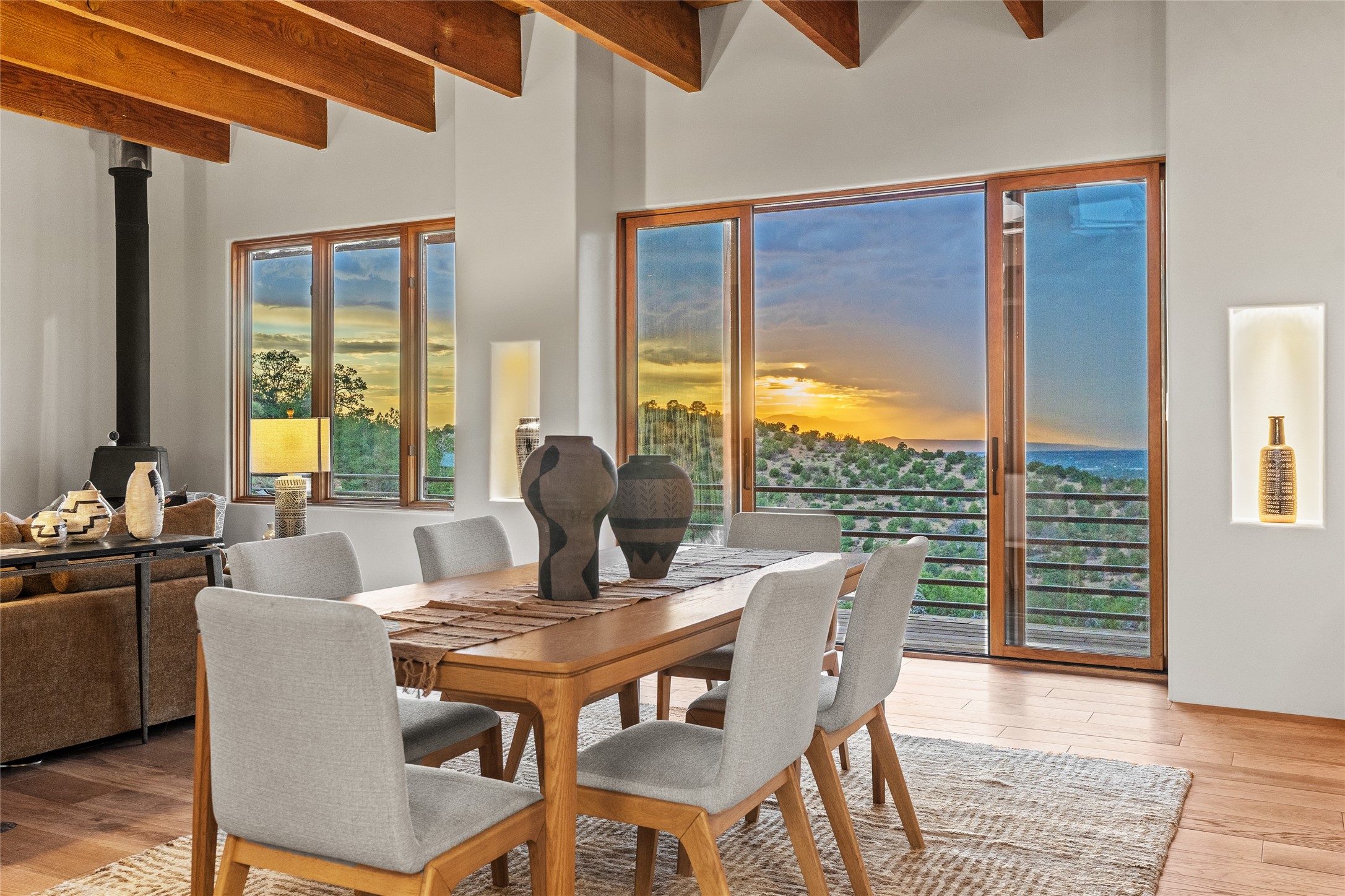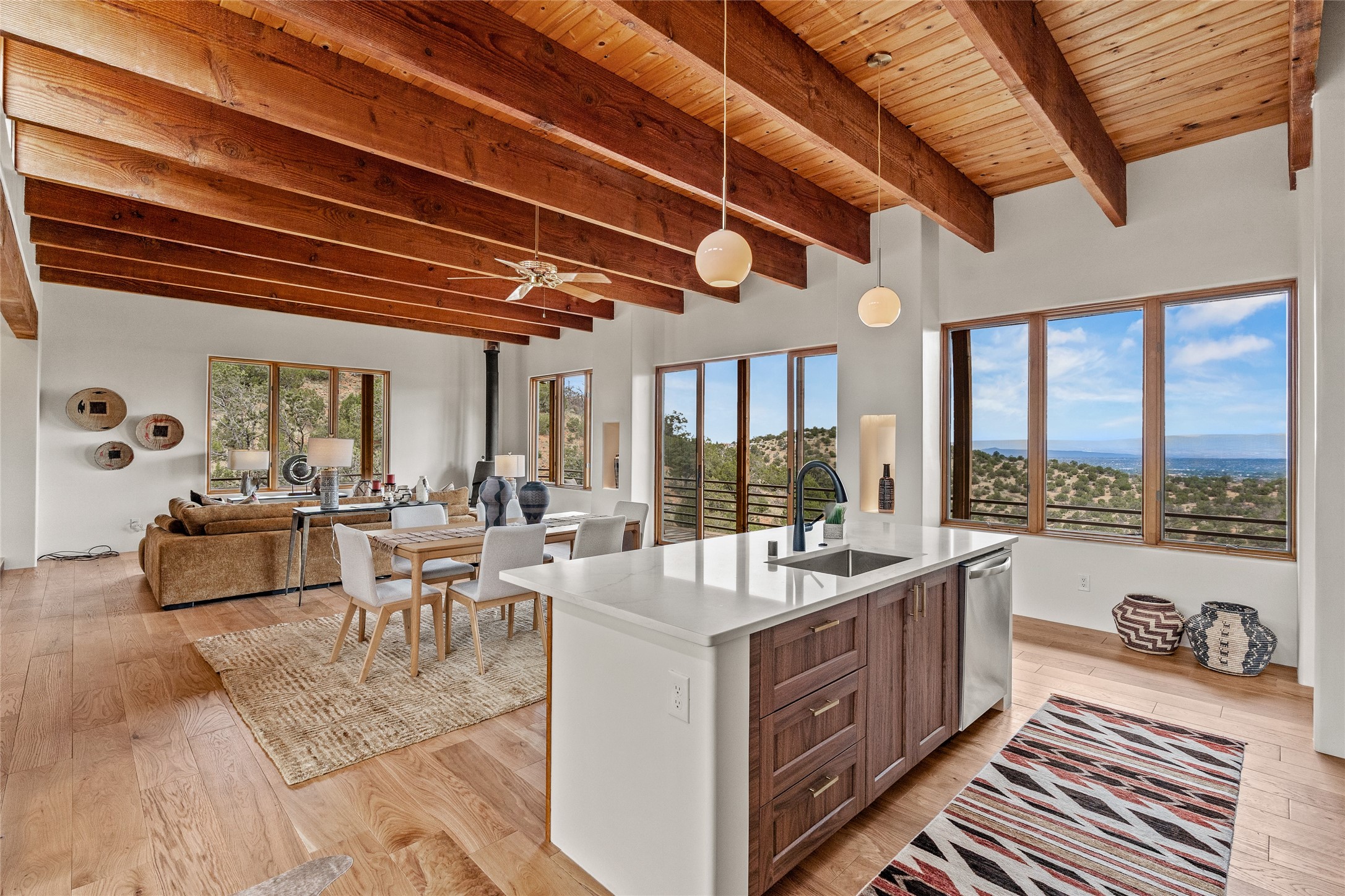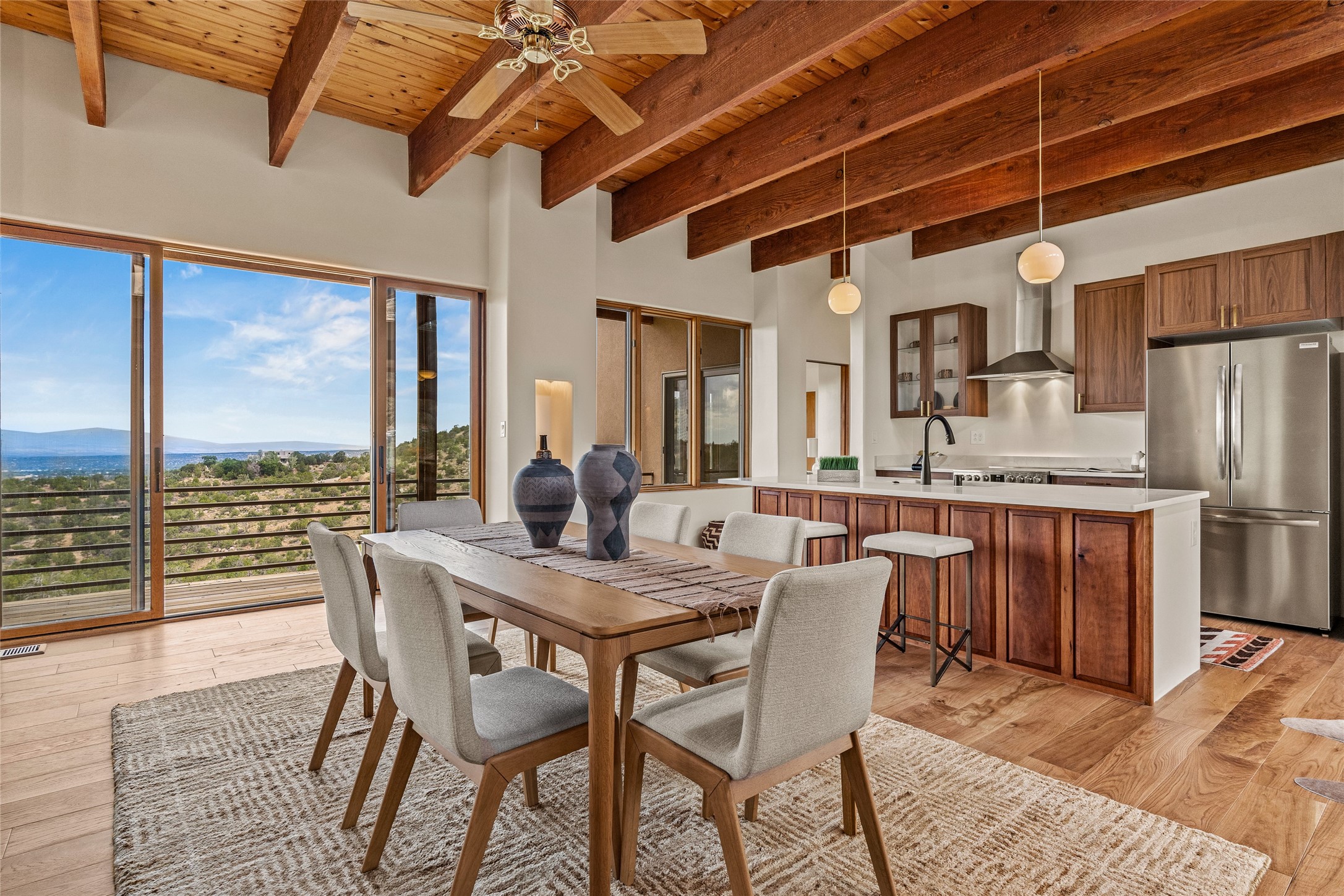 Welcome to your own hilltop "Heaven". A stunning, fully renovated retreat where refined living meets the serenity of sky-high vistas. Perched on 10 private acres, this exceptional residence offers unobstructed panoramic views of the majestic Jemez Mountains, framed by natural rock outcroppings and open skies in every direction.Extensively updated inside and out, the home seamlessly blends custom craftsmanship with modern luxury. Dramatic Mahogany double entry doors and hand-carved doors in the primary suite set a tone of timeless elegance. Recent exterior upgrades include a brand-new roof and fresh stucco for lasting curb appeal.Inside, a chef's dream kitchen awaits--featuring sleek quartz countertops and top-tier stainless steel appliances, ideal for both quiet evenings and lively entertaining. Rich wood floors flow through light-filled open living spaces that draw the eye to the breathtaking landscape beyond.Designed for year-round comfort, the home includes a new tankless water heater, furnace, and central air conditioning. Guests will enjoy a beautifully updated bathroom and a thoughtfully designed floor plan that offers privacy and separation between the primary suite and guest quarters.Step outside onto newly refreshed decks and savor the peace of your elevated retreat--perfect for sunset cocktails, morning coffee, or stargazing under New Mexico's vast night skies.Elegant, tranquil, and truly move-in ready, this one-of-a-kind property invites you to live above it all--where natural beauty, modern amenities, and quiet luxury come together in perfect harmony.