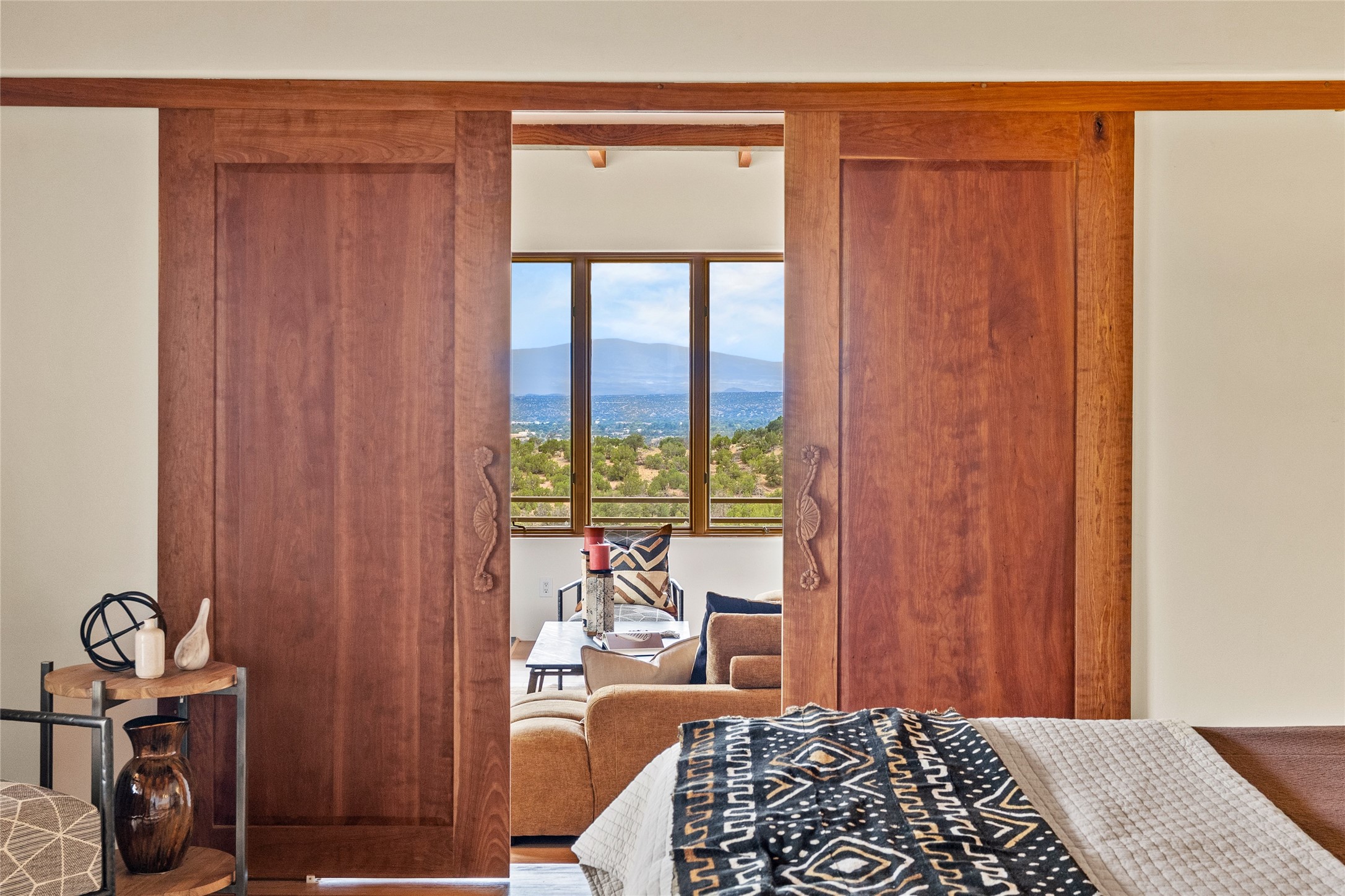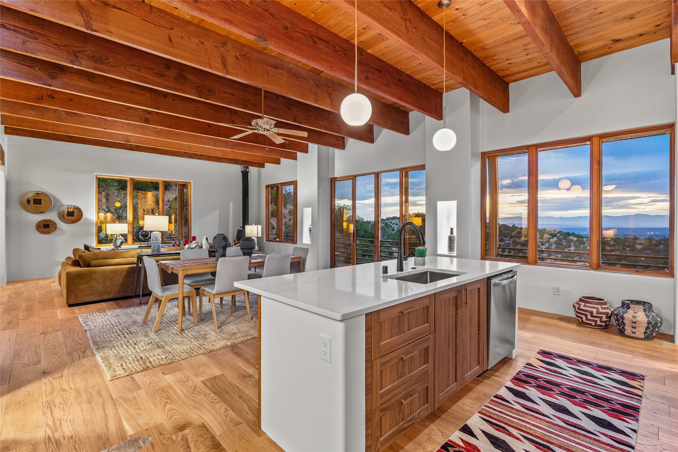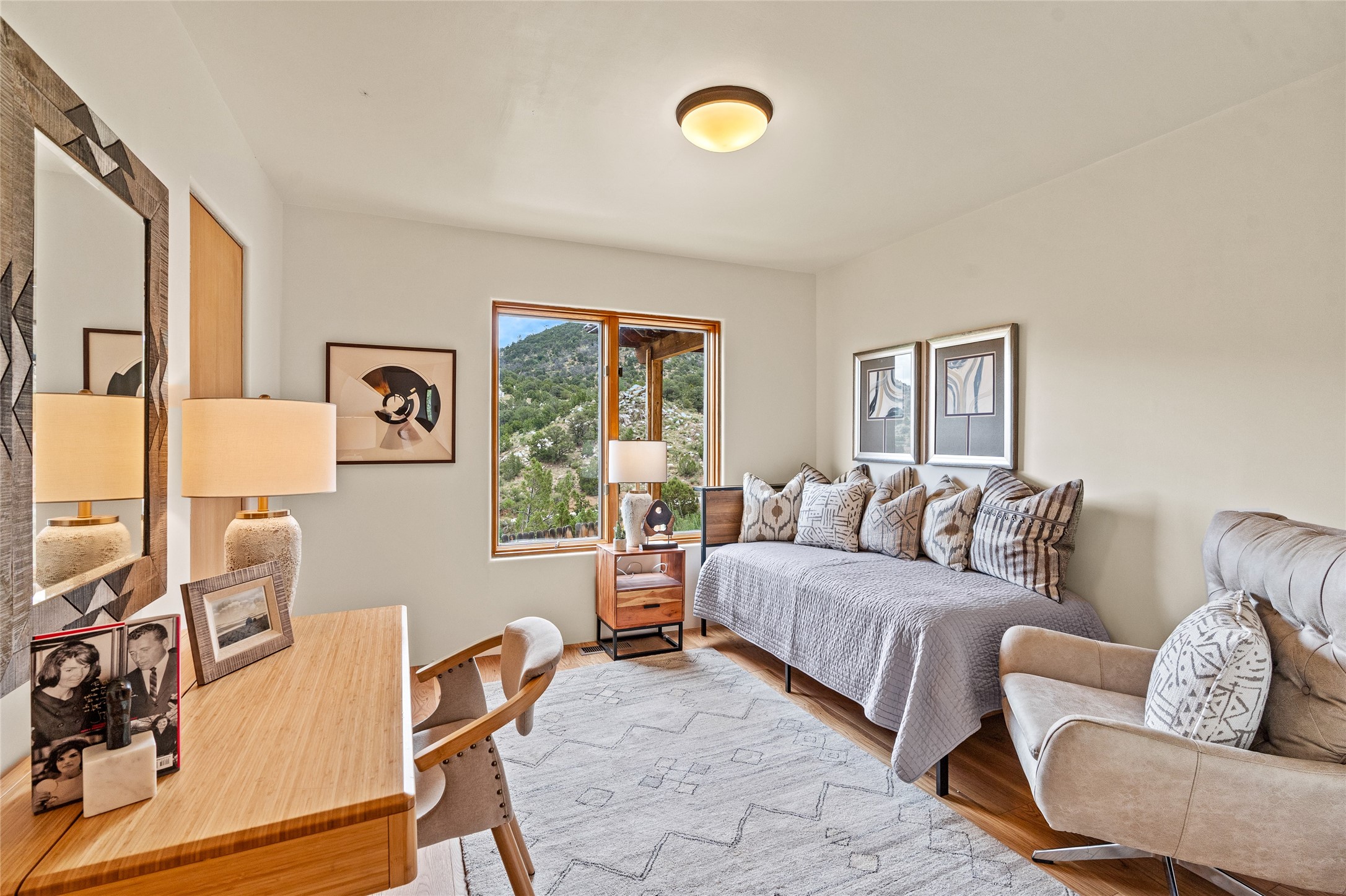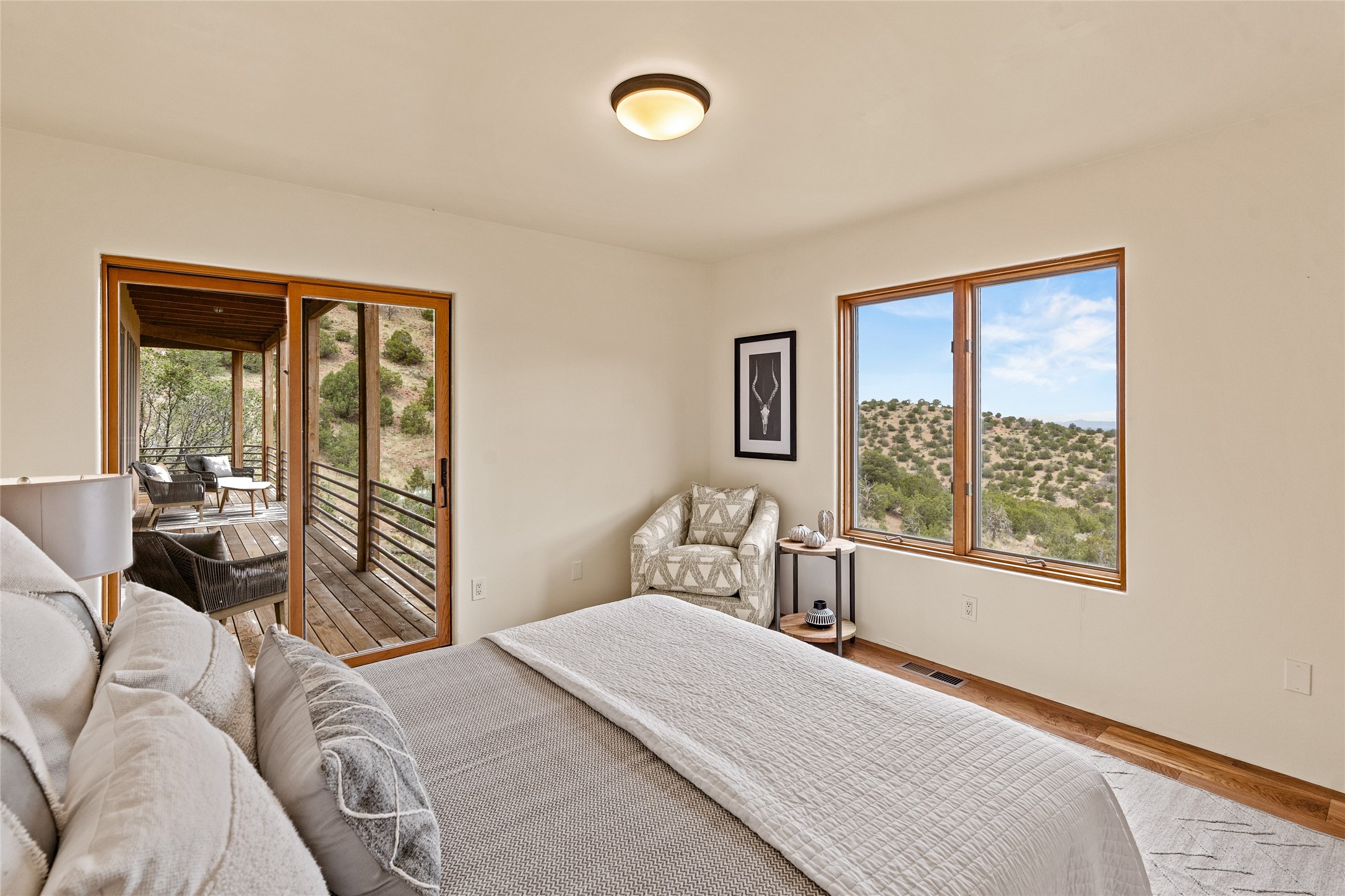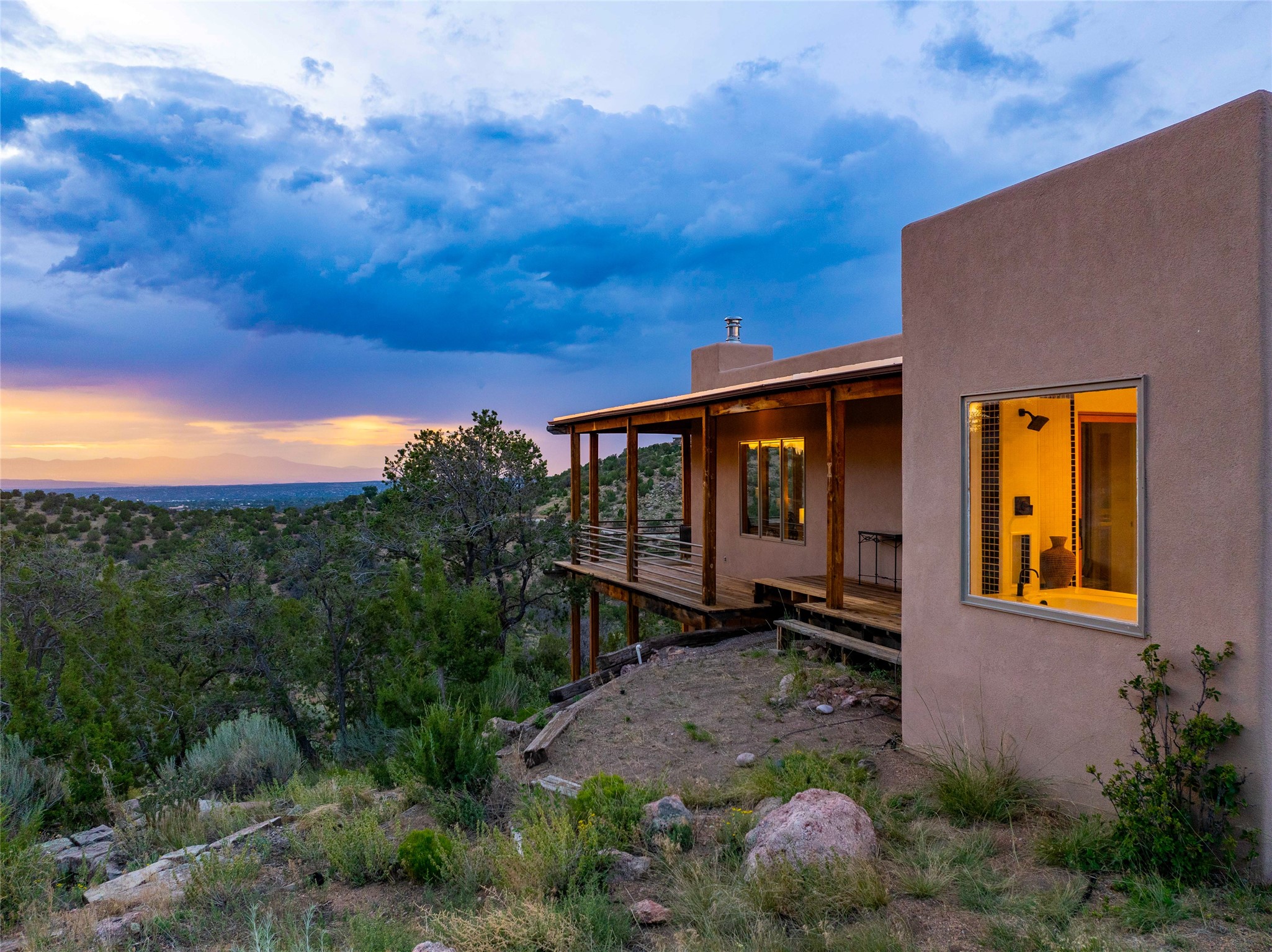 Welcome to your own hilltop "Heaven". A stunning, fully renovated retreat where refined living meets the serenity of sky-high vistas. Perched on 10 private acres, this exceptional residence offers unobstructed panoramic views of the majestic Jemez Mountains, framed by natural rock outcroppings and open skies in every direction.Extensively updated inside and out, the home seamlessly blends custom craftsmanship with modern luxury. Dramatic Mahogany double entry doors and hand-carved doors in the primary suite set a tone of timeless elegance. Recent exterior upgrades include a brand-new roof and fresh stucco for lasting curb appeal.Inside, a chef's dream kitchen awaits--featuring sleek quartz countertops and top-tier stainless steel appliances, ideal for both quiet evenings and lively entertaining. Rich wood floors flow through light-filled open living spaces that draw the eye to the breathtaking landscape beyond.Designed for year-round comfort, the home includes a new tankless water heater, furnace, and central air conditioning. Guests will enjoy a beautifully updated bathroom and a thoughtfully designed floor plan that offers privacy and separation between the primary suite and guest quarters.Step outside onto newly refreshed decks and savor the peace of your elevated retreat--perfect for sunset cocktails, morning coffee, or stargazing under New Mexico's vast night skies.Elegant, tranquil, and truly move-in ready, this one-of-a-kind property invites you to live above it all--where natural beauty, modern amenities, and quiet luxury come together in perfect harmony.
