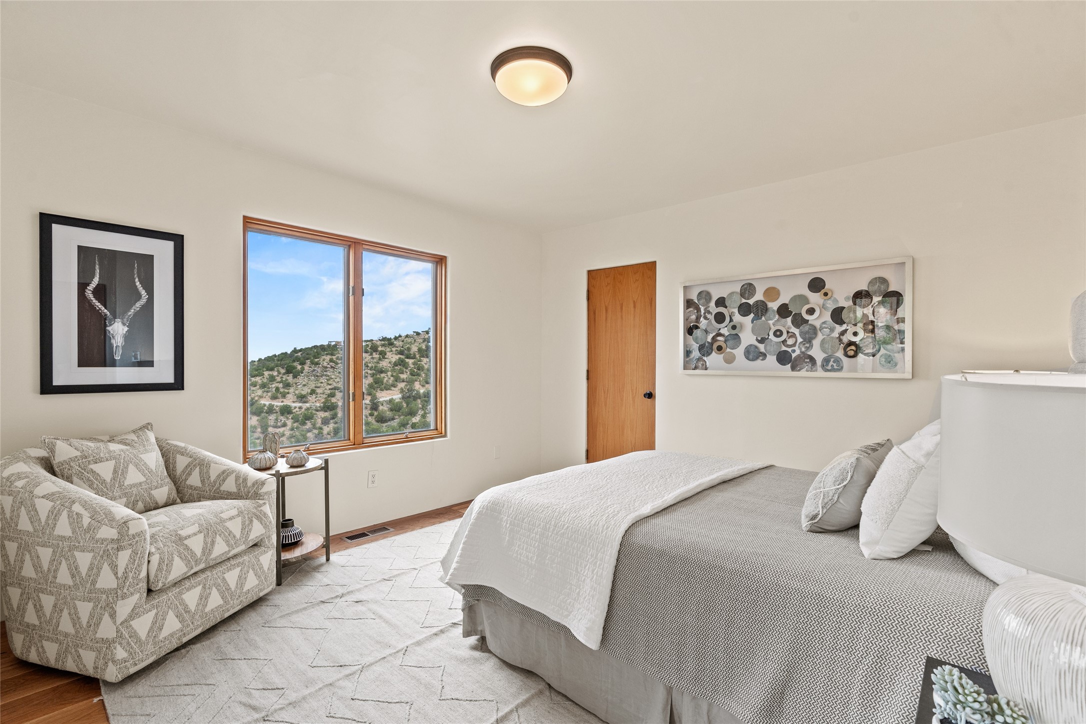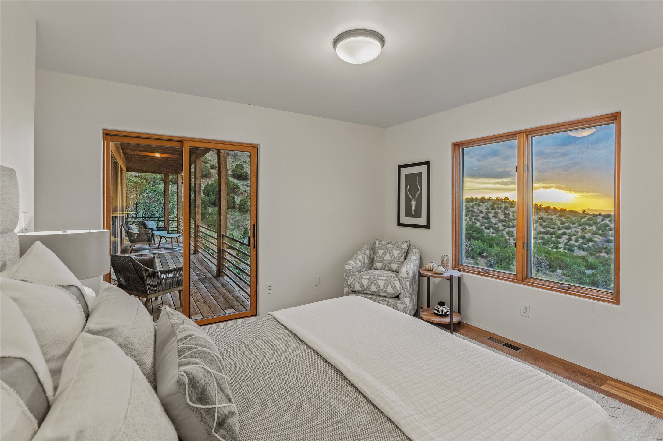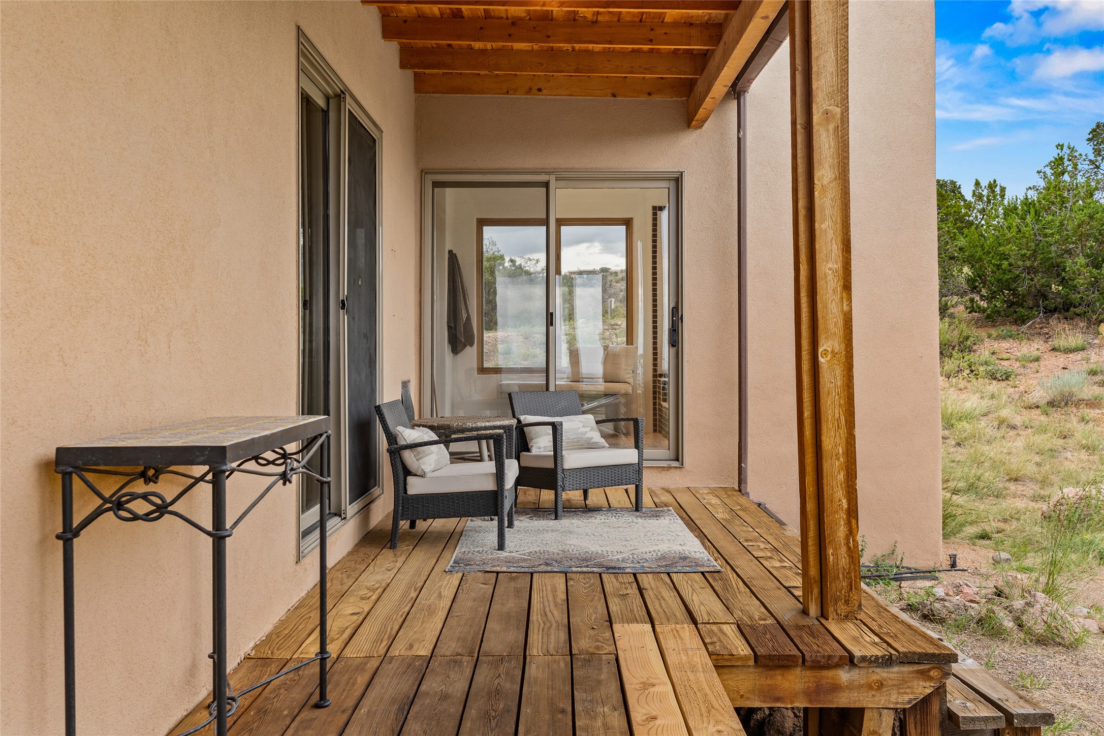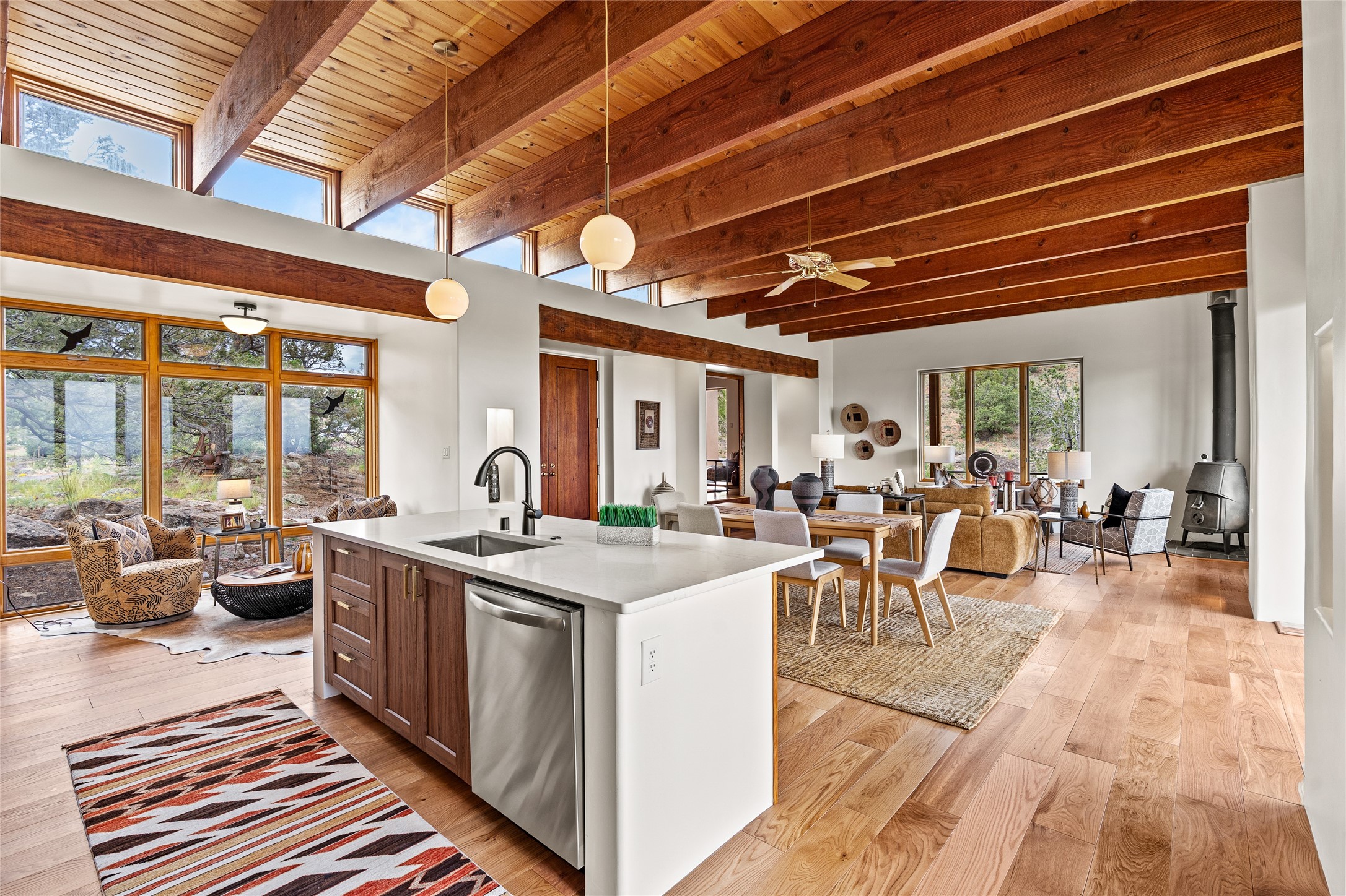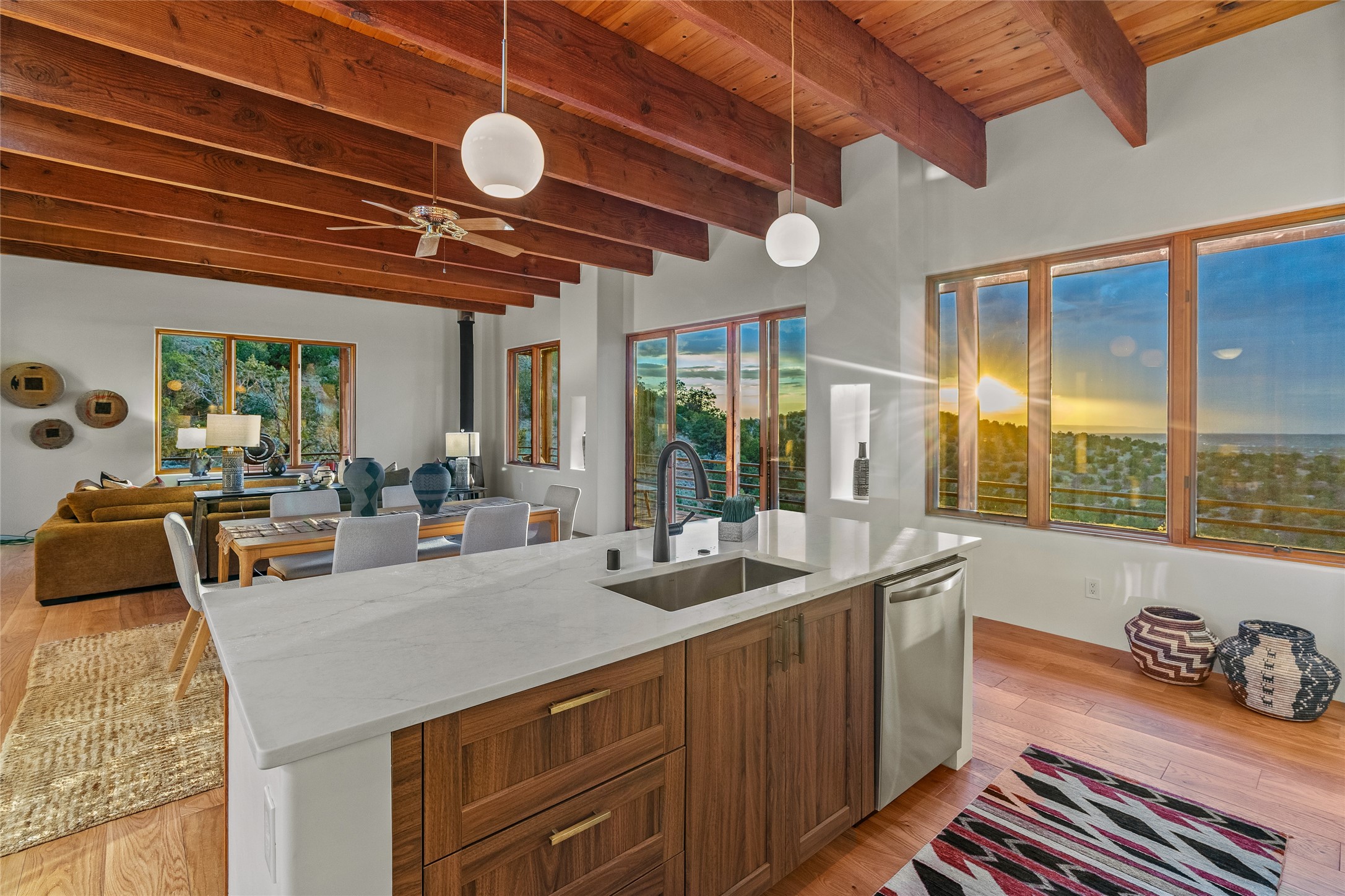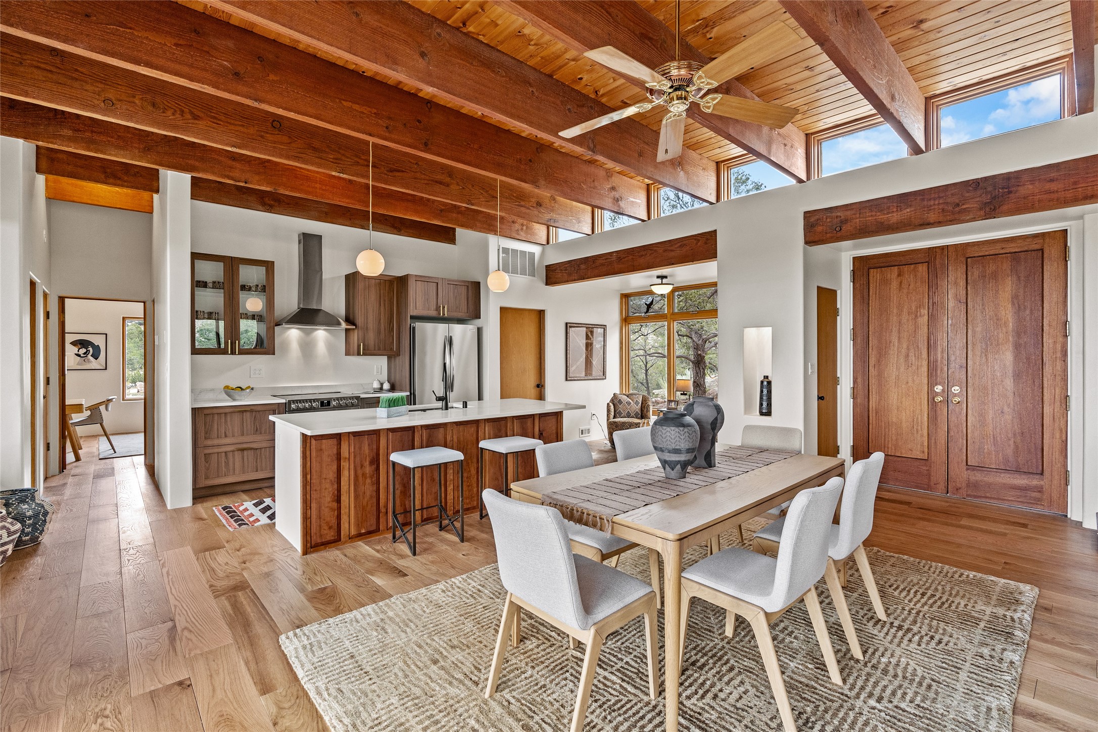 Welcome to your own hilltop "Heaven". A stunning, fully renovated retreat where refined living meets the serenity of sky-high vistas. Perched on 10 private acres, this exceptional residence offers unobstructed panoramic views of the majestic Jemez Mountains, framed by natural rock outcroppings and open skies in every direction.Extensively updated inside and out, the home seamlessly blends custom craftsmanship with modern luxury. Dramatic Mahogany double entry doors and hand-carved doors in the primary suite set a tone of timeless elegance. Recent exterior upgrades include a brand-new roof and fresh stucco for lasting curb appeal.Inside, a chef's dream kitchen awaits--featuring sleek quartz countertops and top-tier stainless steel appliances, ideal for both quiet evenings and lively entertaining. Rich wood floors flow through light-filled open living spaces that draw the eye to the breathtaking landscape beyond.Designed for year-round comfort, the home includes a new tankless water heater, furnace, and central air conditioning. Guests will enjoy a beautifully updated bathroom and a thoughtfully designed floor plan that offers privacy and separation between the primary suite and guest quarters.Step outside onto newly refreshed decks and savor the peace of your elevated retreat--perfect for sunset cocktails, morning coffee, or stargazing under New Mexico's vast night skies.Elegant, tranquil, and truly move-in ready, this one-of-a-kind property invites you to live above it all--where natural beauty, modern amenities, and quiet luxury come together in perfect harmony.