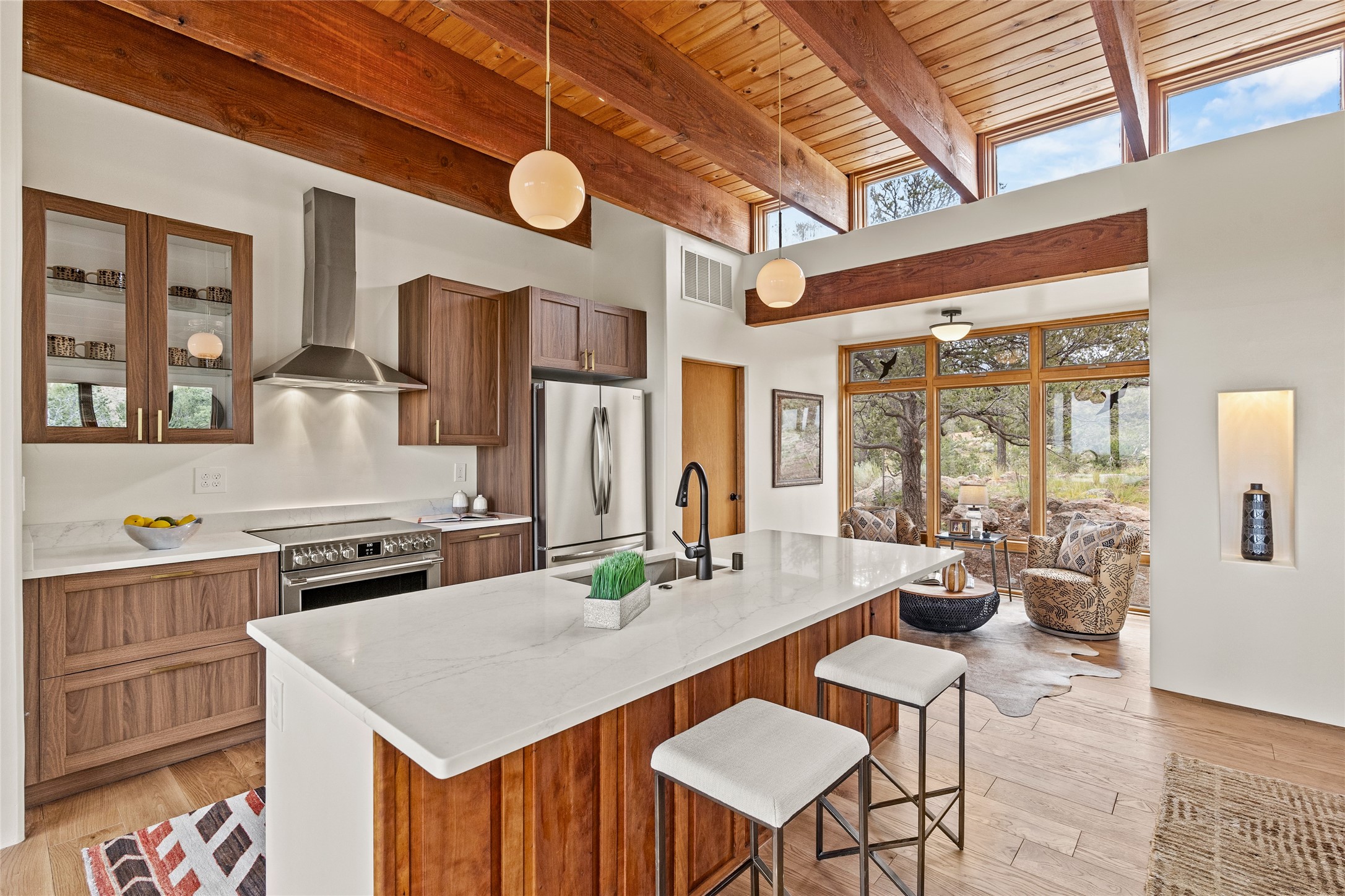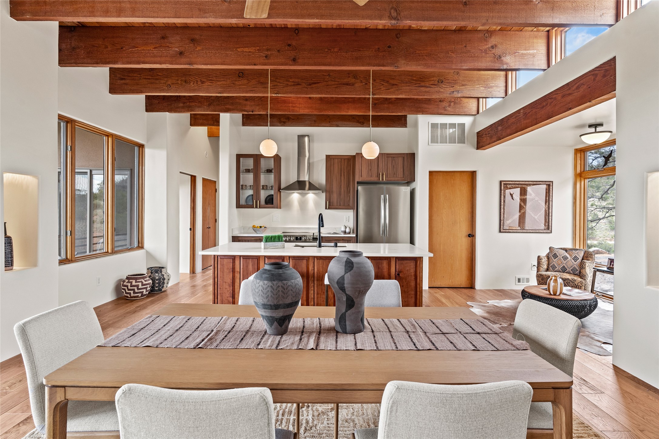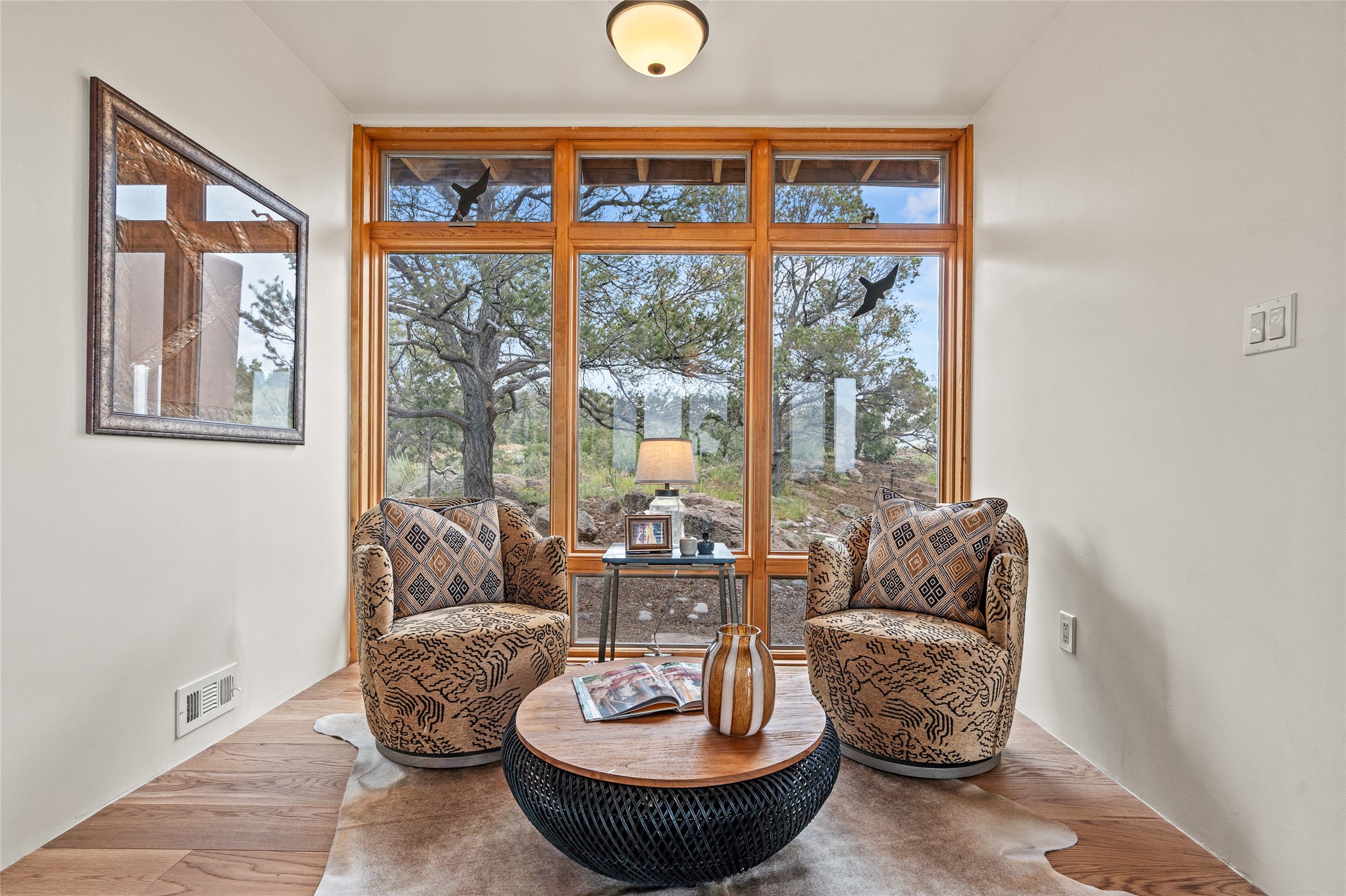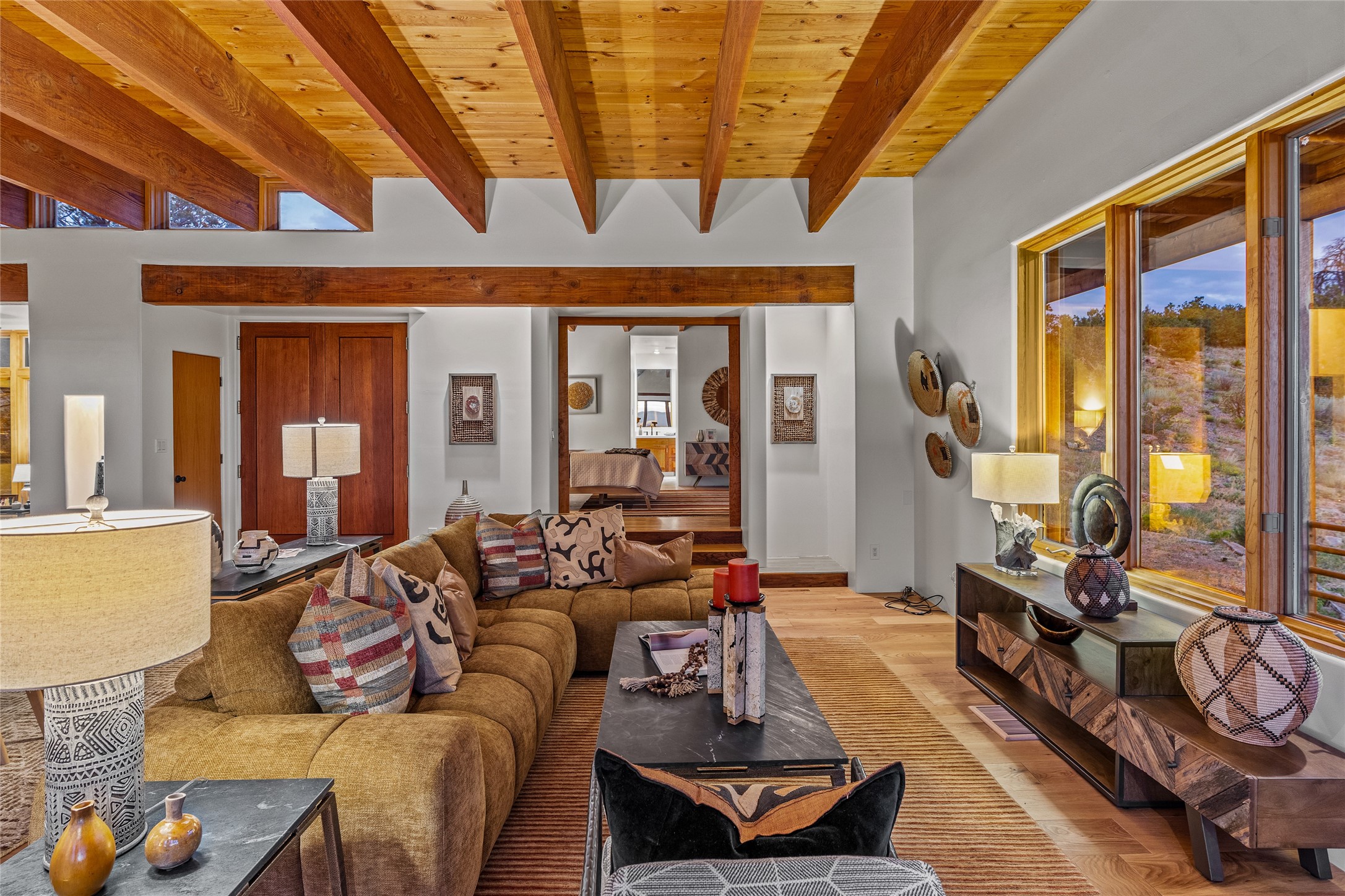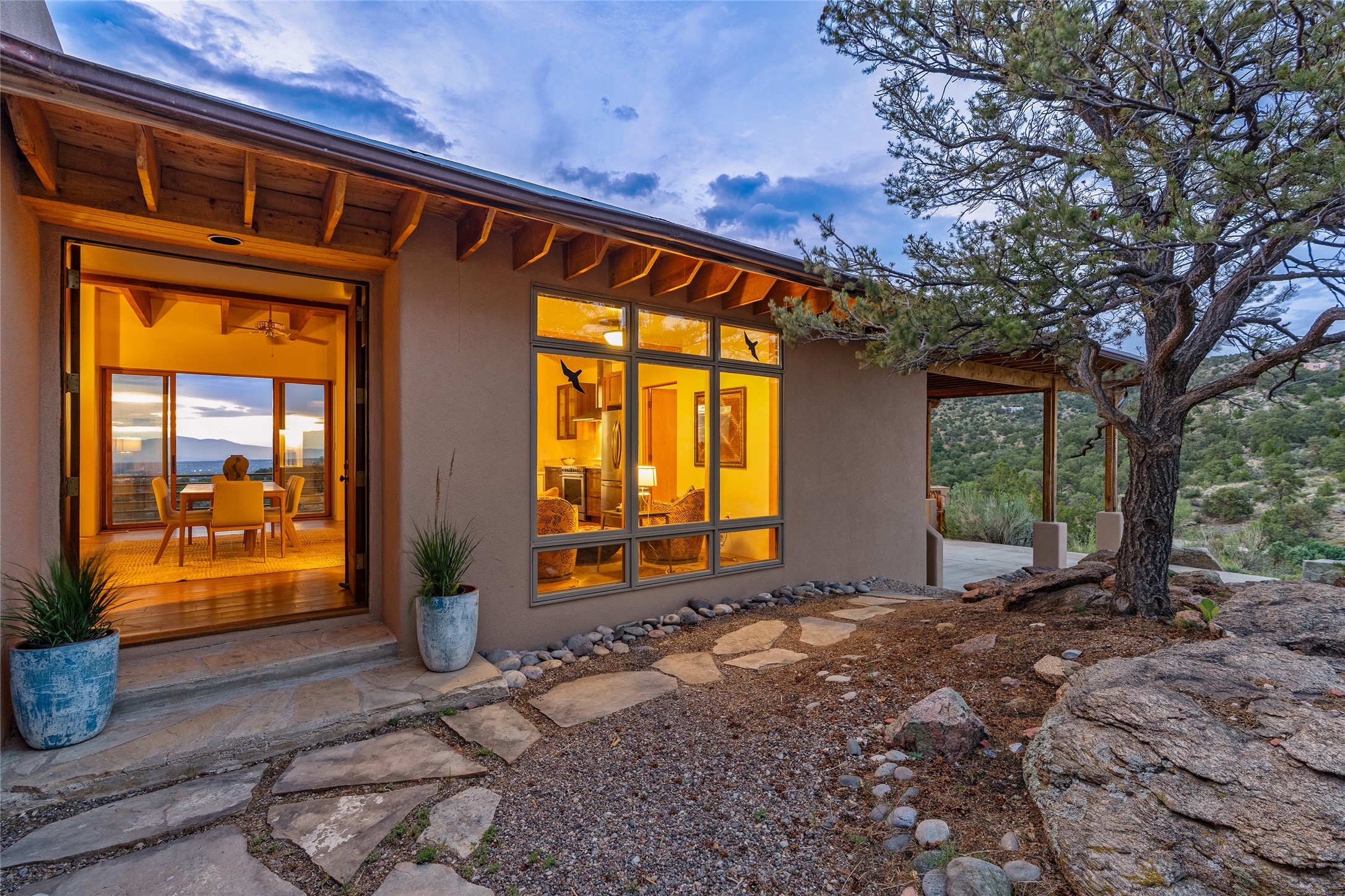 Welcome to your own hilltop "Heaven". A stunning, fully renovated retreat where refined living meets the serenity of sky-high vistas. Perched on 10 private acres, this exceptional residence offers unobstructed panoramic views of the majestic Jemez Mountains, framed by natural rock outcroppings and open skies in every direction.Extensively updated inside and out, the home seamlessly blends custom craftsmanship with modern luxury. Dramatic Mahogany double entry doors and hand-carved doors in the primary suite set a tone of timeless elegance. Recent exterior upgrades include a brand-new roof and fresh stucco for lasting curb appeal.Inside, a chef's dream kitchen awaits--featuring sleek quartz countertops and top-tier stainless steel appliances, ideal for both quiet evenings and lively entertaining. Rich wood floors flow through light-filled open living spaces that draw the eye to the breathtaking landscape beyond.Designed for year-round comfort, the home includes a new tankless water heater, furnace, and central air conditioning. Guests will enjoy a beautifully updated bathroom and a thoughtfully designed floor plan that offers privacy and separation between the primary suite and guest quarters.Step outside onto newly refreshed decks and savor the peace of your elevated retreat--perfect for sunset cocktails, morning coffee, or stargazing under New Mexico's vast night skies.Elegant, tranquil, and truly move-in ready, this one-of-a-kind property invites you to live above it all--where natural beauty, modern amenities, and quiet luxury come together in perfect harmony.