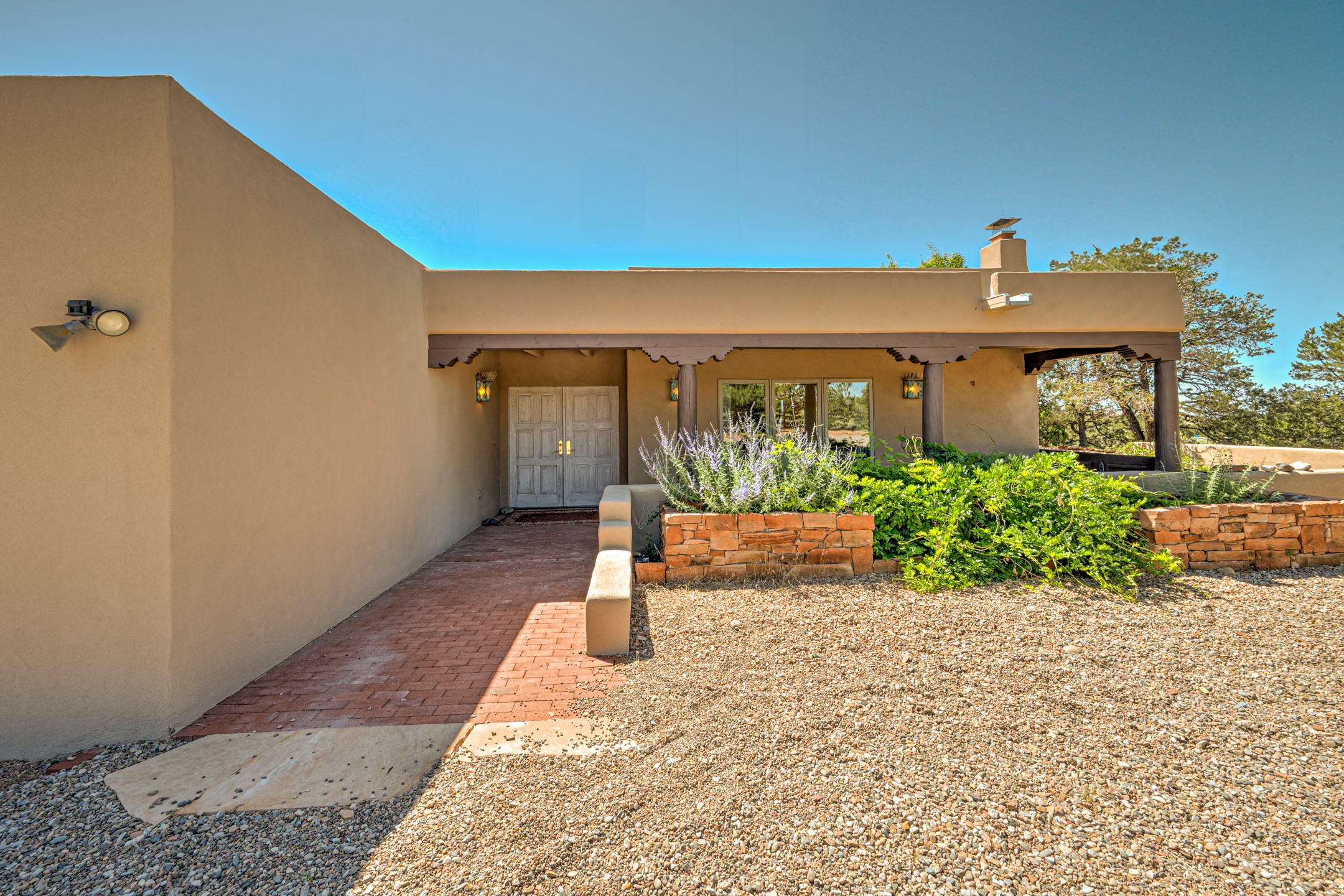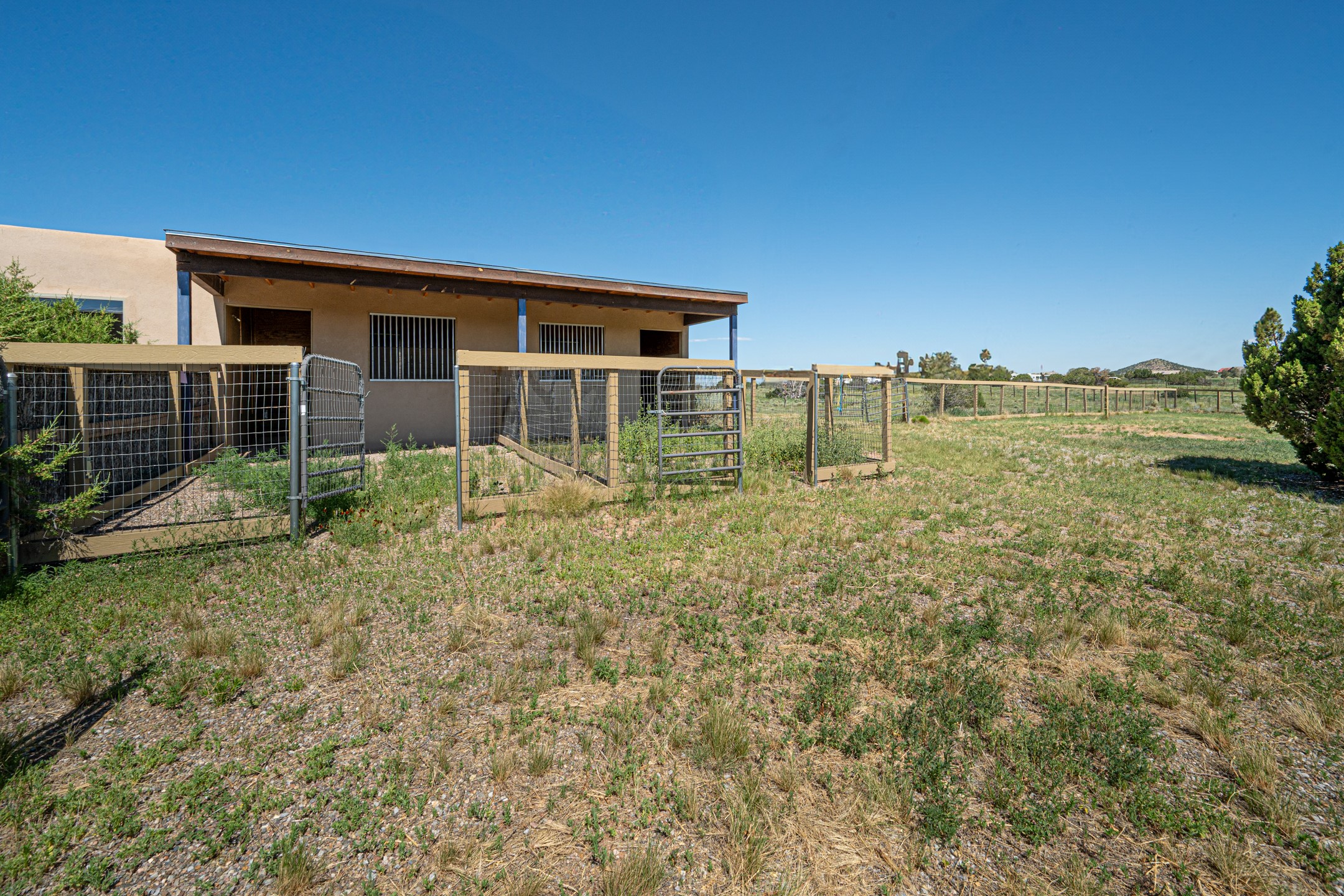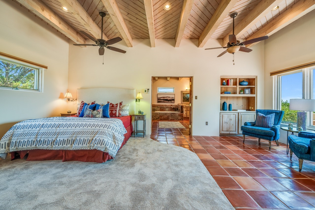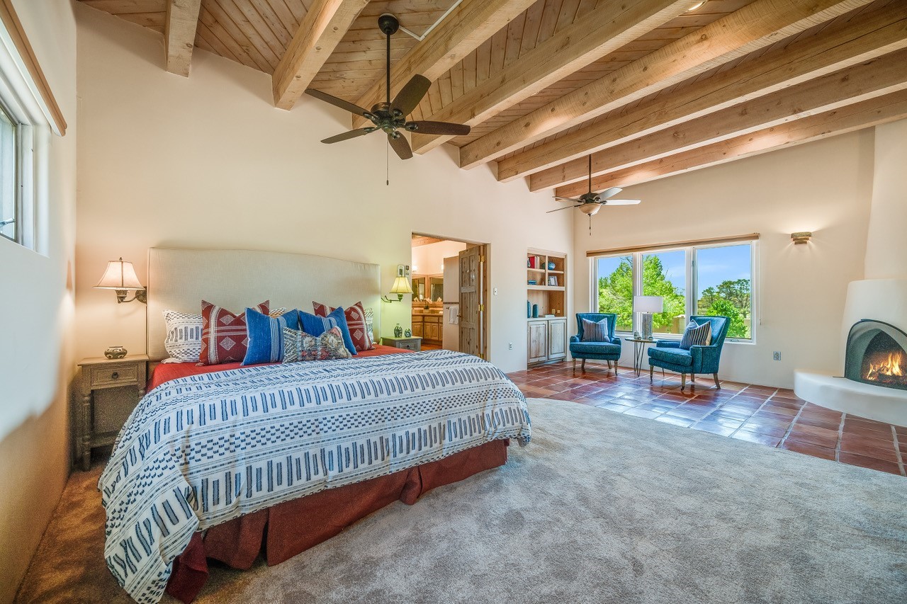 Southwestern charm meets modern comfort and functionality with this home with 3 peaceful acres with tranquil views of both sunrise and sunsets. This lovely property offers the best of rural living just minutes from the amenities of town. The home's open living area is warm and inviting, featuring Saltillo tile floors, high ceilings, and a traditional kiva fireplace--the perfect space to relax or entertain. The large master suite is a private sanctuary with its own sitting area and a second kiva fireplace, offering the kind of comfort and space that's rare to find. A separate bonus room with its own bath adds incredible flexibility--ideal as a guest suite, private office, or artist's studio. Additional features include community water, radiant in-floor heating, natural gas, and mini-split units for cooling, ensuring comfort year-round. Located in the Eldorado school system, this home offers a rare blend of privacy, convenience, and natural beauty. Home has been pre-inspected. If you have horses to bring, this property delivers with a two-stall barn, a half-acre turnout, and direct access to an easement which can be used for riding. Whether you want to saddle up or just take a peaceful hike, you can head out your back door.