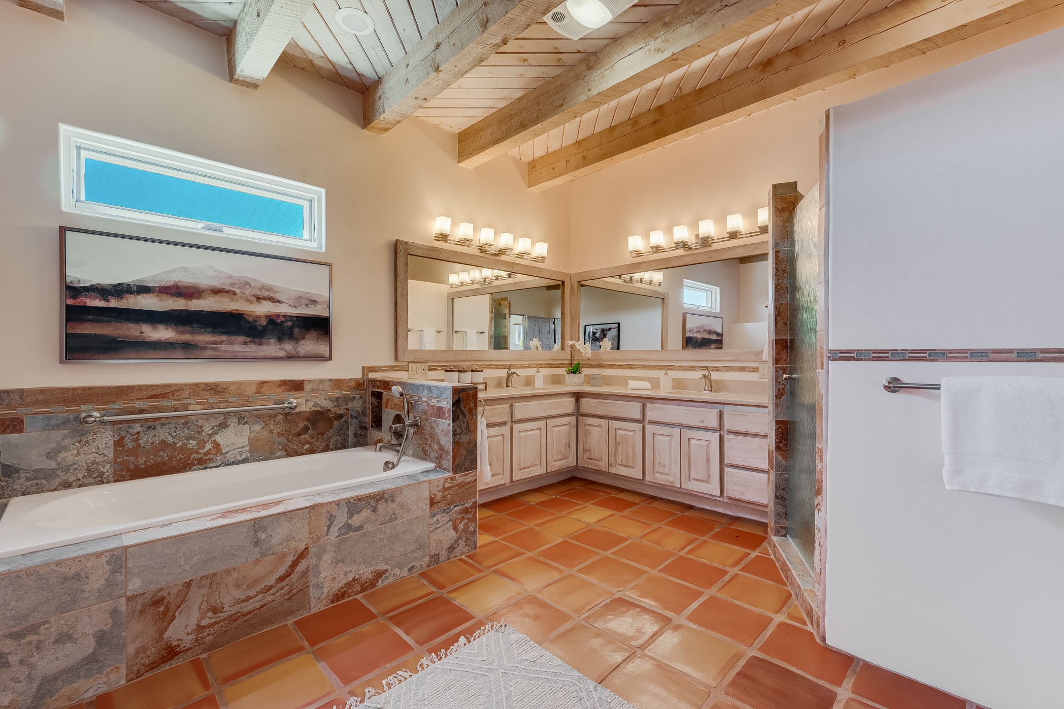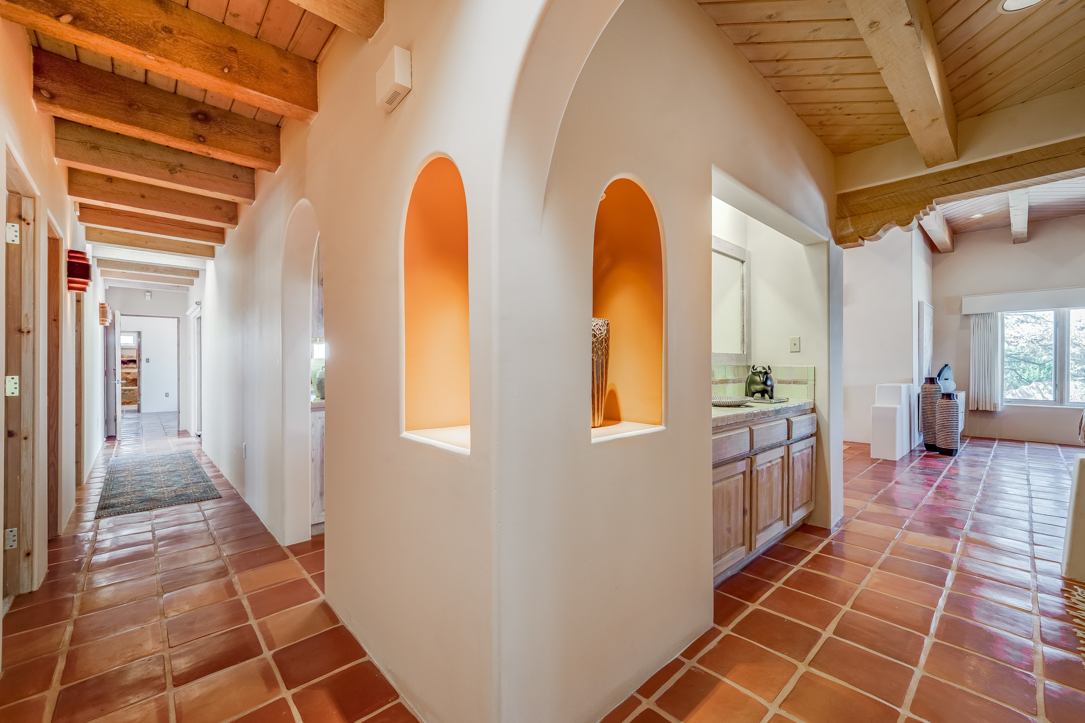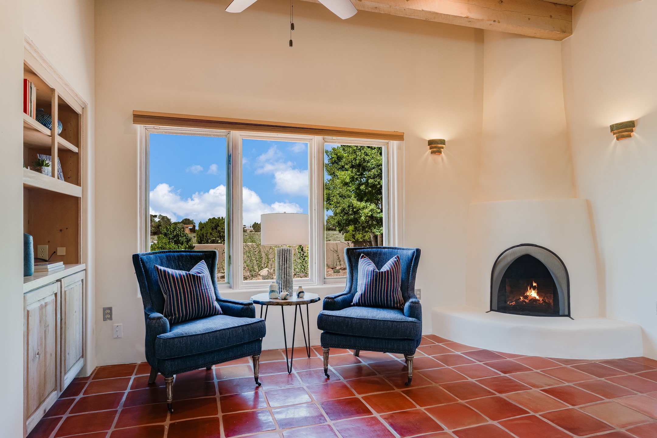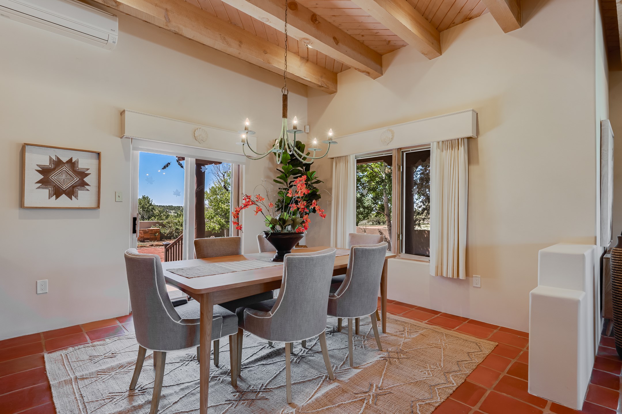 Southwestern charm meets modern comfort and functionality with this home with 3 peaceful acres with tranquil views of both sunrise and sunsets. This lovely property offers the best of rural living just minutes from the amenities of town. The home's open living area is warm and inviting, featuring Saltillo tile floors, high ceilings, and a traditional kiva fireplace--the perfect space to relax or entertain. The large master suite is a private sanctuary with its own sitting area and a second kiva fireplace, offering the kind of comfort and space that's rare to find. A separate bonus room with its own bath adds incredible flexibility--ideal as a guest suite, private office, or artist's studio. Additional features include community water, radiant in-floor heating, natural gas, and mini-split units for cooling, ensuring comfort year-round. Located in the Eldorado school system, this home offers a rare blend of privacy, convenience, and natural beauty. Home has been pre-inspected. If you have horses to bring, this property delivers with a two-stall barn, a half-acre turnout, and direct access to an easement which can be used for riding. Whether you want to saddle up or just take a peaceful hike, you can head out your back door.