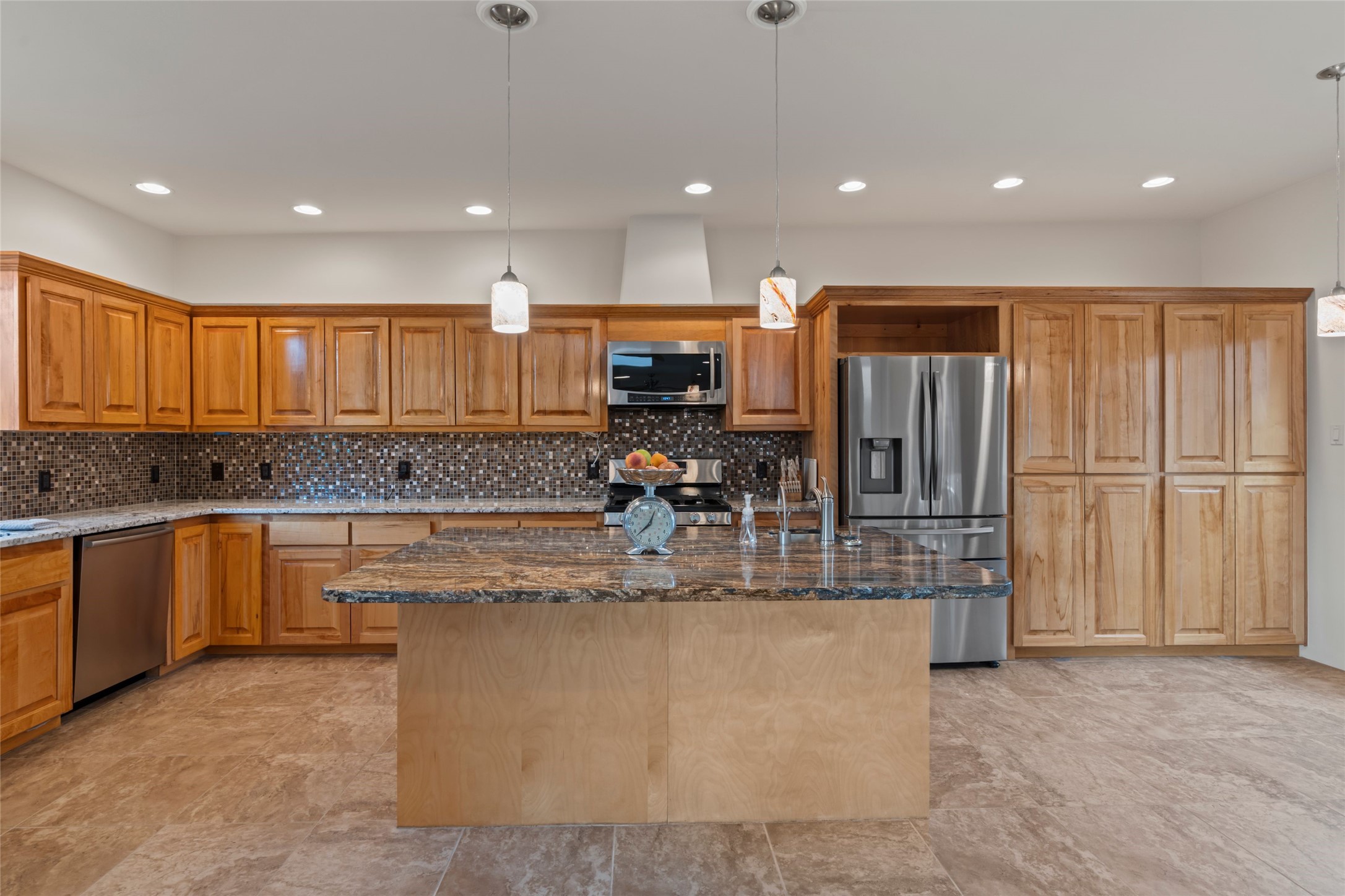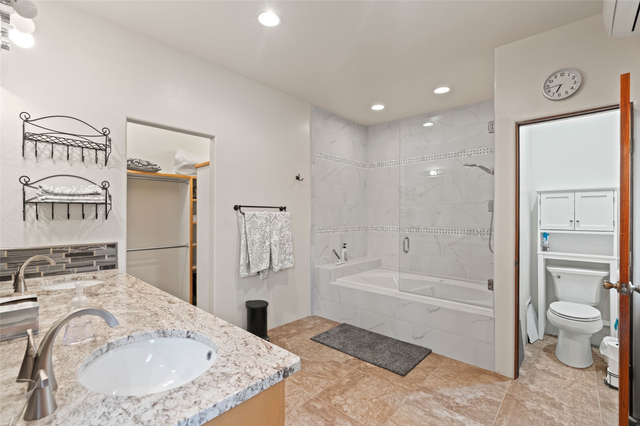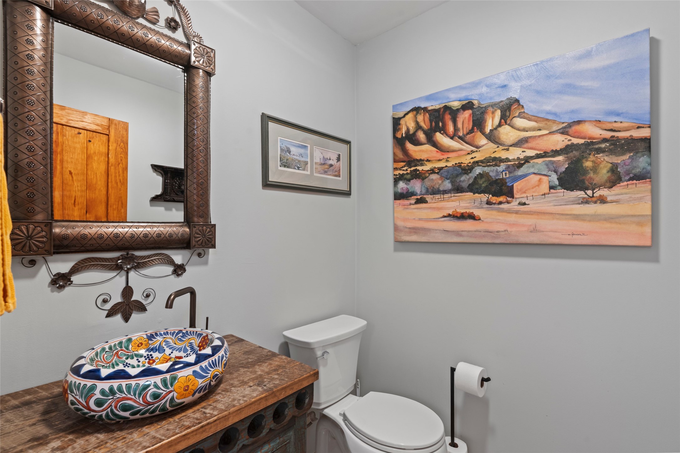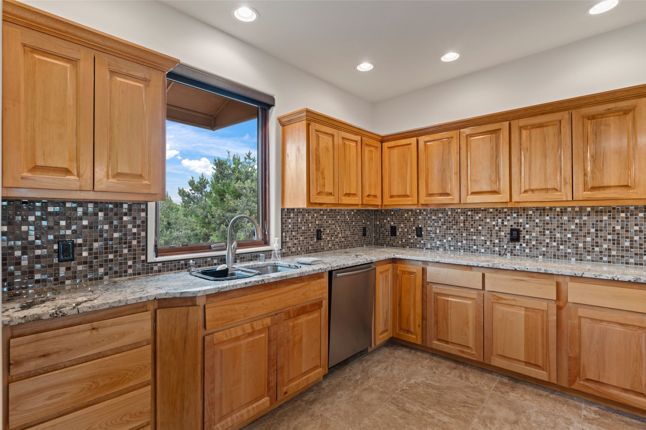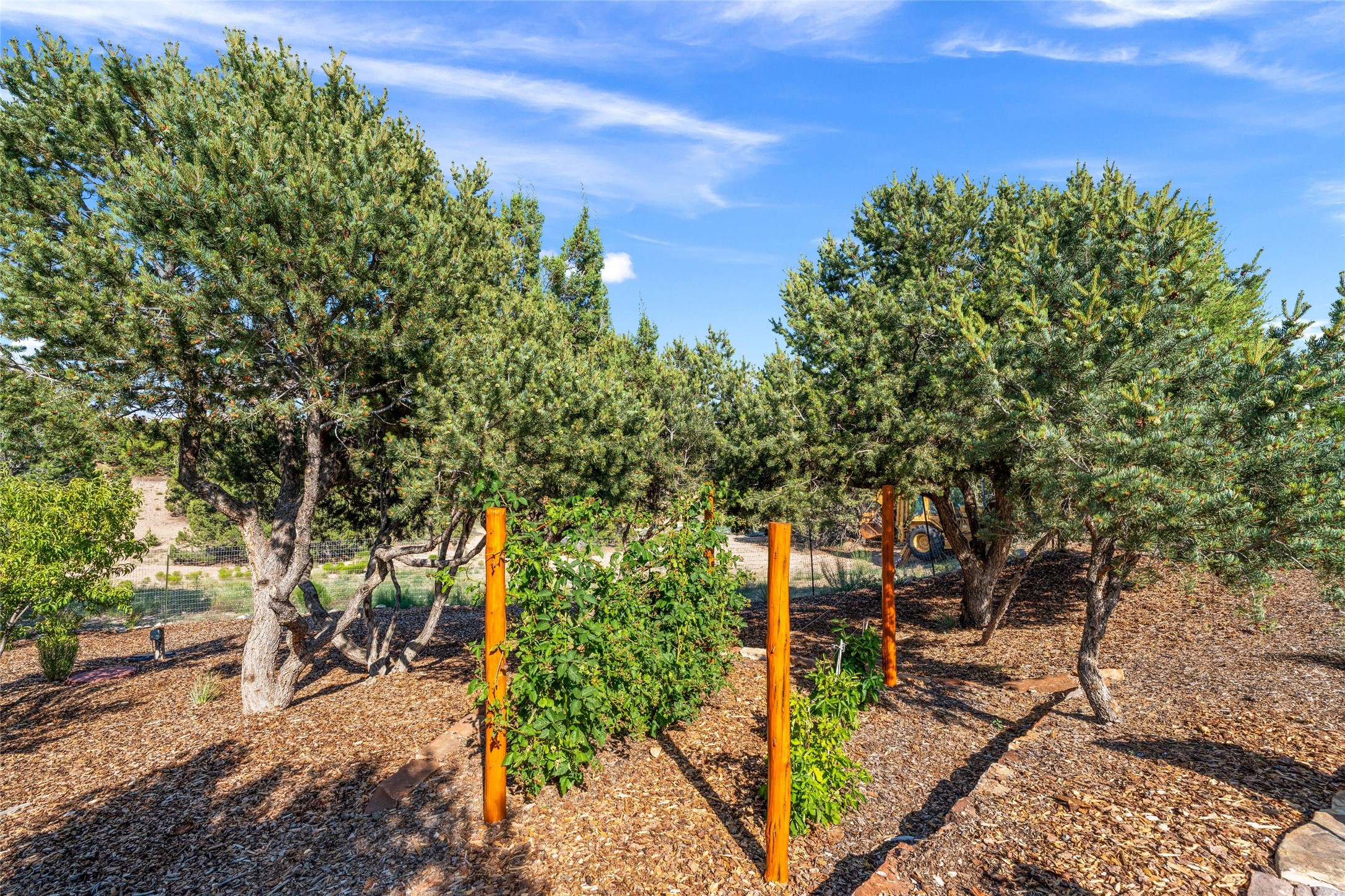 A true Santa Fe masterpiece, this luxurious estate seamlessly blends art, architecture, and nature on a serene 2.46-acre lot with breathtaking views of the Sangre de Cristo mountains. Designed for comfort, sustainability, and inspired living, this extraordinary property offers every amenity for the discerning homeowner.Notable features include double and single-car garages plus a large RV garage, ideal for car enthusiasts, adventure seekers or workshop. The 62-panel solar system and five 2,500-gallon interconnected buried cisterns support an eco-conscious lifestyle, while the extensive drip irrigation system nourishes a lush 1,000 sq. ft. irrigated vegetable garden, orchard (peach, apple, and plum trees), a berry patch bursting with blueberries, blackberries, and raspberries.Enjoy miles of hiking, biking, and horseback riding trails just across the street, or relax in your private oasis with green space bordering the eastern edge of the property, a tranquil water feature with Koi pond, and multiple covered outdoor entertaining spaces, including a plumbed gas fire pit and a fully insulated hot tub.Inside, comfort and luxury abound with radiant floor heating throughout, mini-split systems for cooling, and a security system with cameras. The heart of the home is the spectacular Great Hall, anchored by a gas fireplace, and offering soaring ceilings and an atmosphere of timeless elegance and opening to outdoor spaces. Additional highlights include a top-of-the-line chef's kitchen, butler's pantry, and a quilting/art studio.The estate also includes a charming 2-bedroom guest house and a spacious 2-bedroom studio, also with Sangre de Cristo mountains views. Perfect for guests, extended family, or creative workspaces.There is ample parking for guests and extra vehicles, this estate is ideal for entertaining or enjoying peaceful privacy and solitude. A rare opportunity to own a truly magical home that celebrates the best of indoor-outdoor living in Santa Fe.