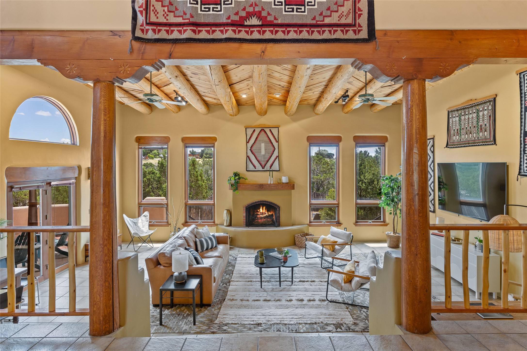 Just 10 minutes from downtown Santa Fe, this 3,255 sq. ft. 4-bedroom, 2.5-bath home on 2.5 acres offers the perfect blend of country living and city convenience. With a private well, a 3-car garage plus storage area, and rich Southwestern character, this one-of-a-kind property is a peaceful retreat with personality and presence. Step inside to soaring spaces and abundant natural light. The open-concept living, kitchen, and dining areas are unified yet distinct, each defined by vaulted ceilings and architectural detail. The main living room--anchored by a striking fireplace--features 14-foot viga ceilings and generous windows that fill the space with natural light. The formal dining room, with its vaulted ceiling of vigas and latillas, is illuminated by dramatic clerestory windows. A raised kiva fireplace creates a warm connection between the dining room and kitchen. The kitchen is both vibrant and functional, featuring a vaulted, beamed ceiling, extensive countertops, a central cooking island with bar seating, and a colorful half-circle stained glass window that echoes the kitchen's playful palette. A connected breakfast nook offers the perfect spot for casual dining. The spacious primary suite is a private sanctuary with soaring ceilings, a floor-to-ceiling kiva fireplace, and a 650 sq. ft. private deck with a cozy gazebo for relaxing outdoors. The ensuite bath features high ceilings, vivid blue tile, and a dramatic walk-in shower that feels like a personal spa. The guest wing offers three additional bedrooms--one currently serving as a game room with a pool table--and a beautifully updated full bathroom.With privacy, style, and unmistakable Southwestern charm, this exceptional property is a rare opportunity just minutes from the heart of Santa Fe.
