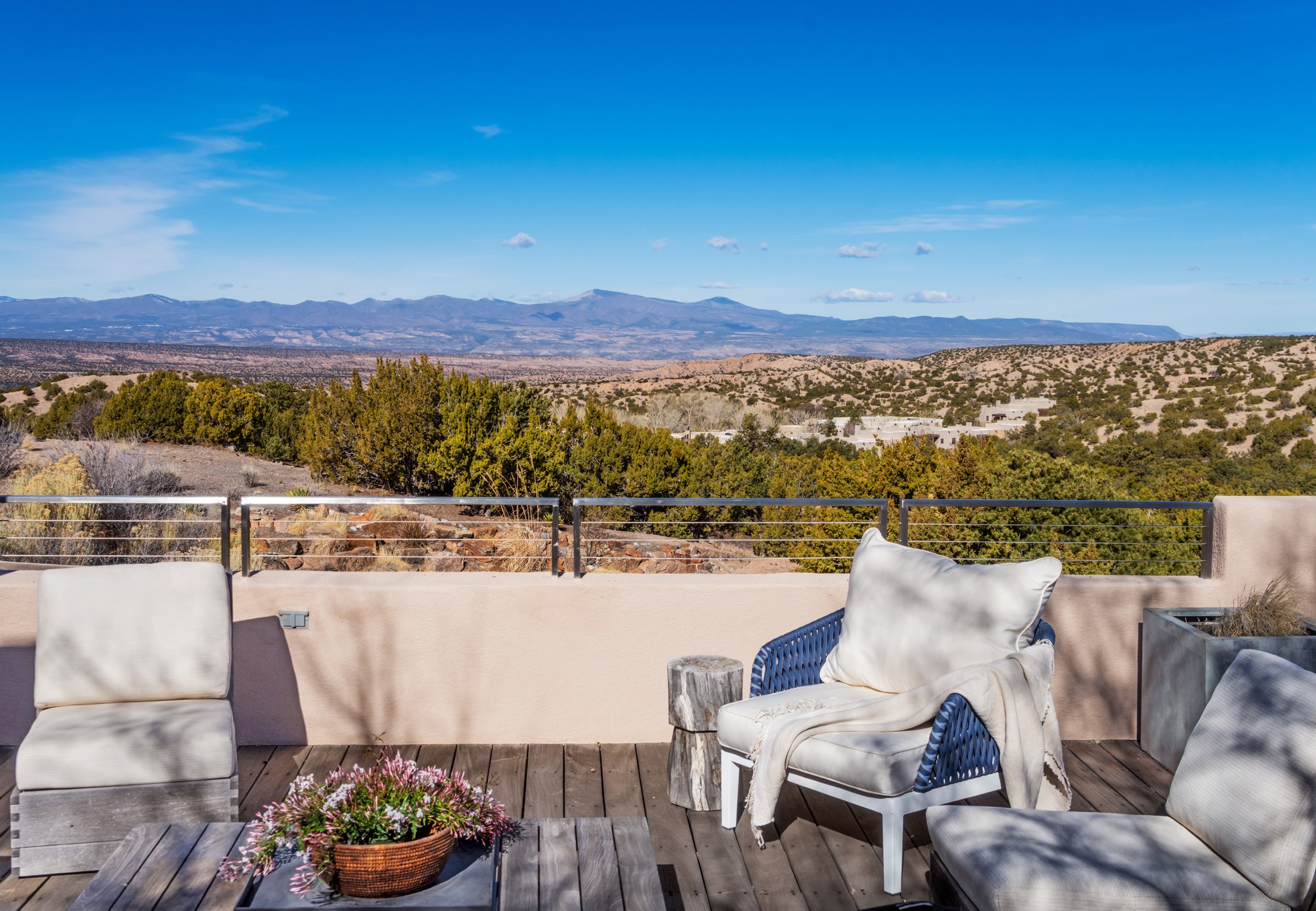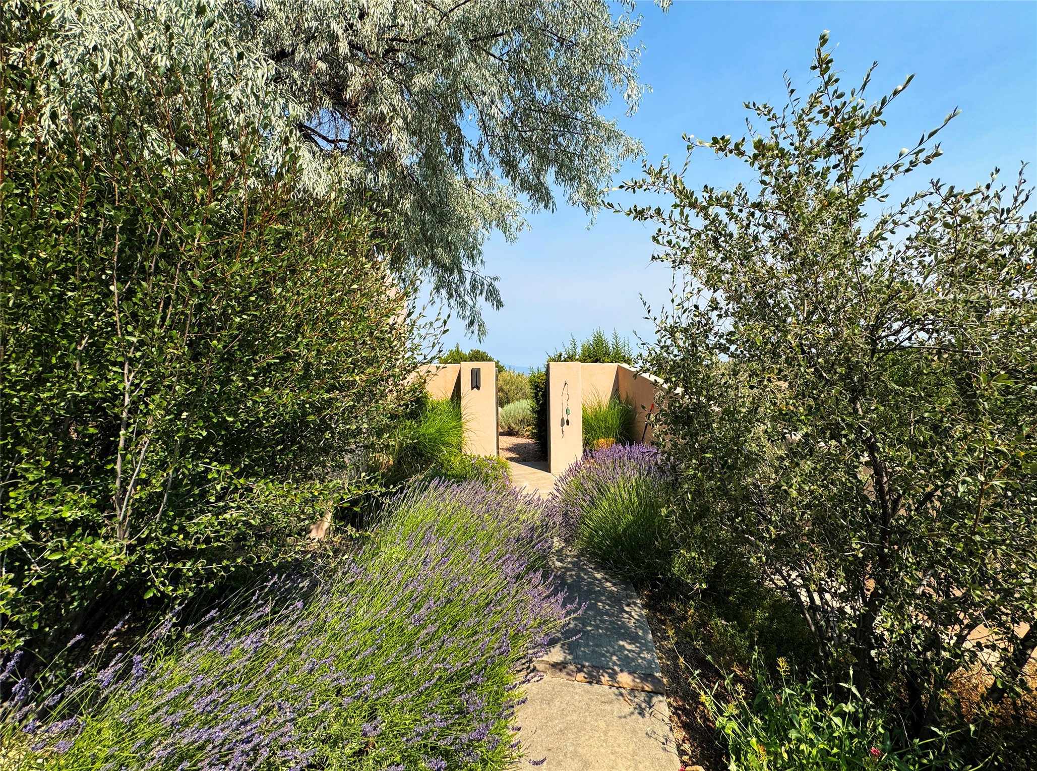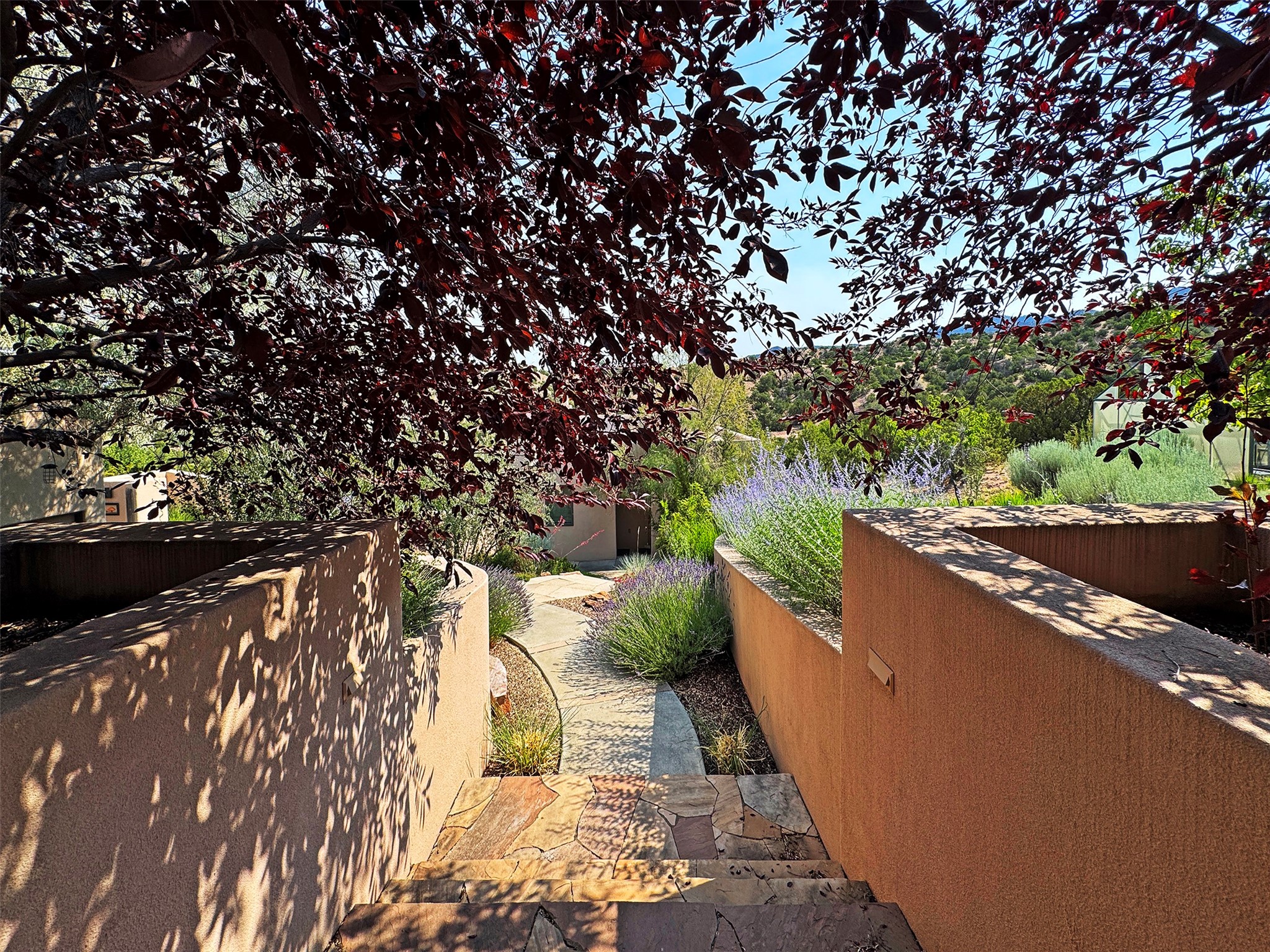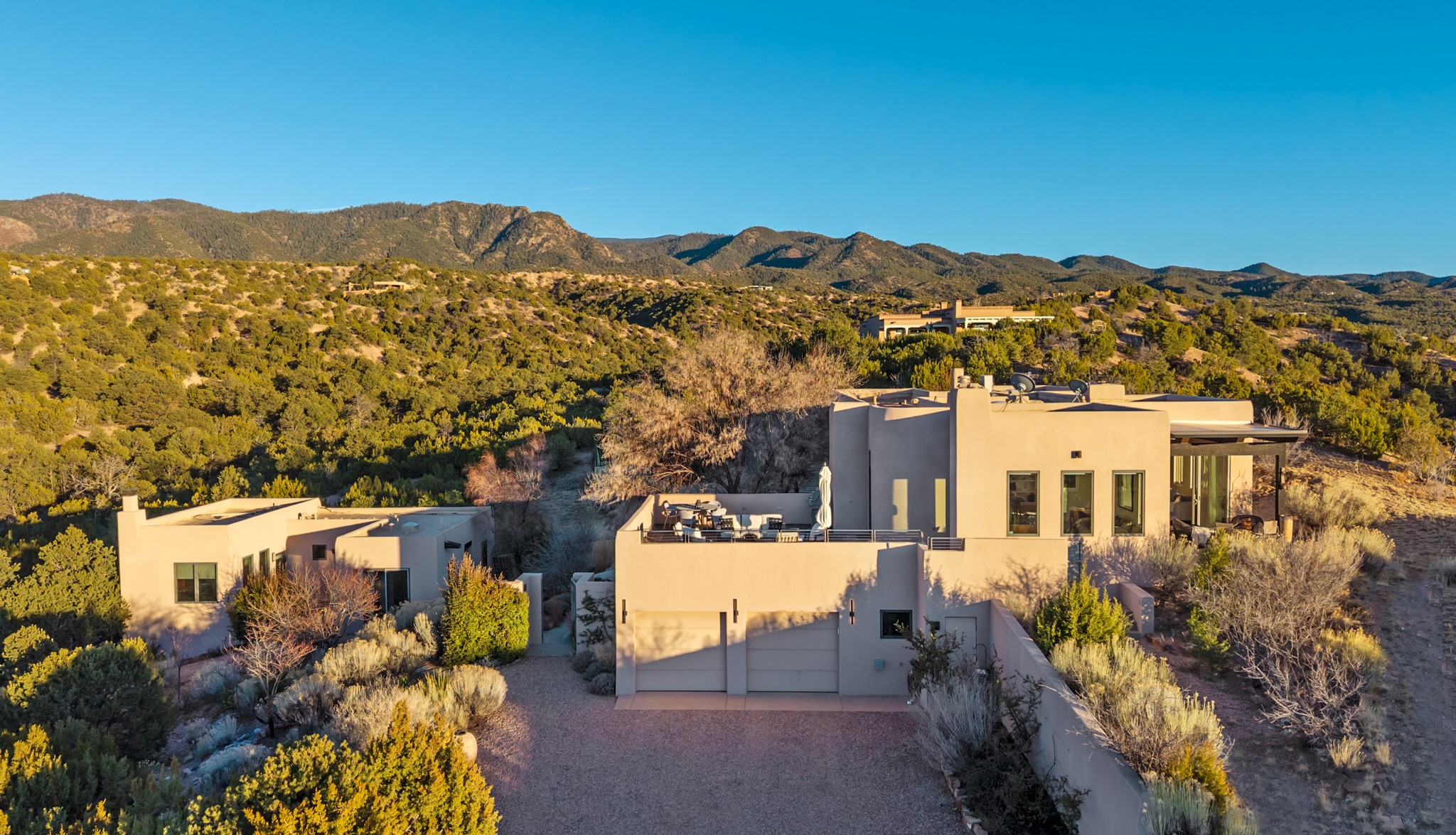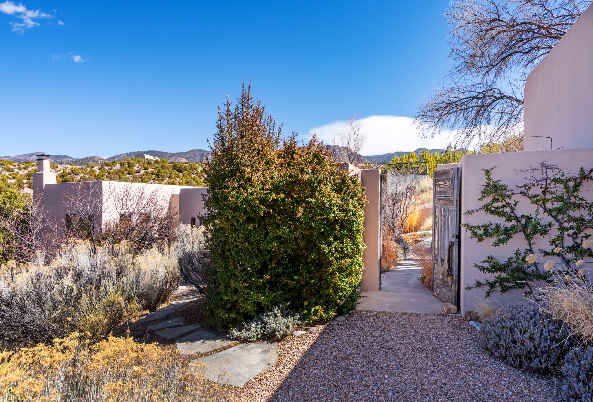 This refined main house and privatecasitais set high in the rolling Tesuque foothills of the Sangre de Cristo Mountains.Extensively re-designed and guided by Feng Shui principles so that energy moves smoothly, the main house creates an immediatesense of calm and well-being, with cherrywoodfloors, rich surfaces and fine details.A quiet retreat with serene spaces sets youinside the landscape of atmospheric views that stay with you. Three patios offer a choice of light and spacethroughout the day. Effortless indoor-outdoor living can be enjoyed from sunrise to sunset--this home welcomesbothquiet reflection andgreat hosting.The kitchen cabinetry and other custom pieces were milled and hand made from a single walnut tree from Oregon by alocal artisan.The great room and den offer warmth and light, with curated views, and each open directly ontoits own outdoor space. The calming primary bedroom flows into a restorative, spa-like experience: From soaking tub to sauna toshower, then stepping outdoors to the hot tub for star gazing--an outdoor shower completes the experience. Next, thecharming 2-bedroom, 2-bath guest house, which is separated by gorgeous native plantings and fruit trees, has its own entrance and parking toprovide exceptional privacy and flexibility for guests. This home offers a rare balance of seclusion and access--equally suited as a lock-and-leave retreat or a primary residence. Serene and immersed in nature, yet minutes from The Four Seasons,Tesuque Village Market, El Nido, andapp. 15 minutes to the Plaza and the Santa Fe Opera. Gated Los Caminitos comprises 573-acres with mapped trails for residents, a clubhouse, pool, tennis and pickleball.
