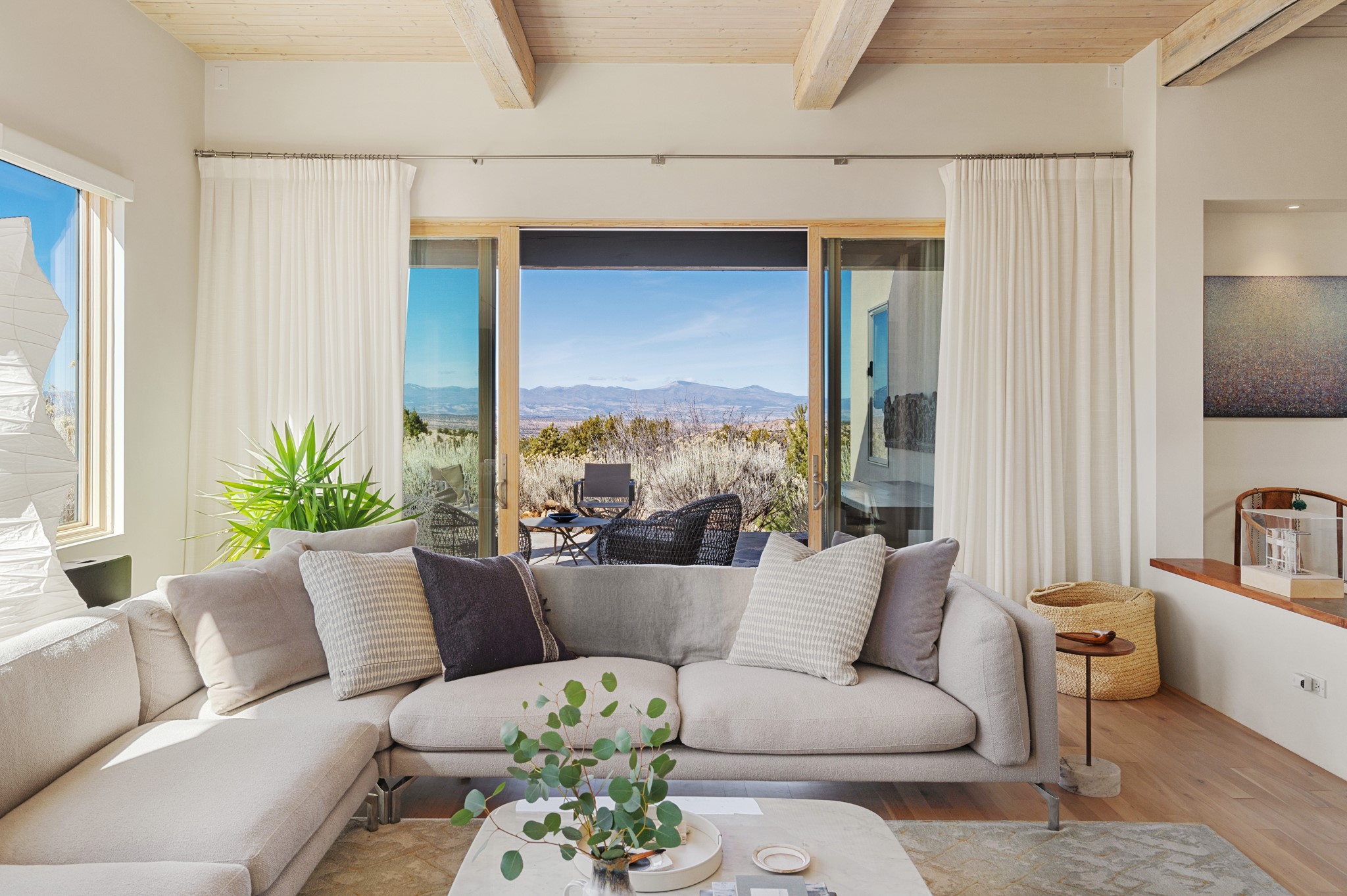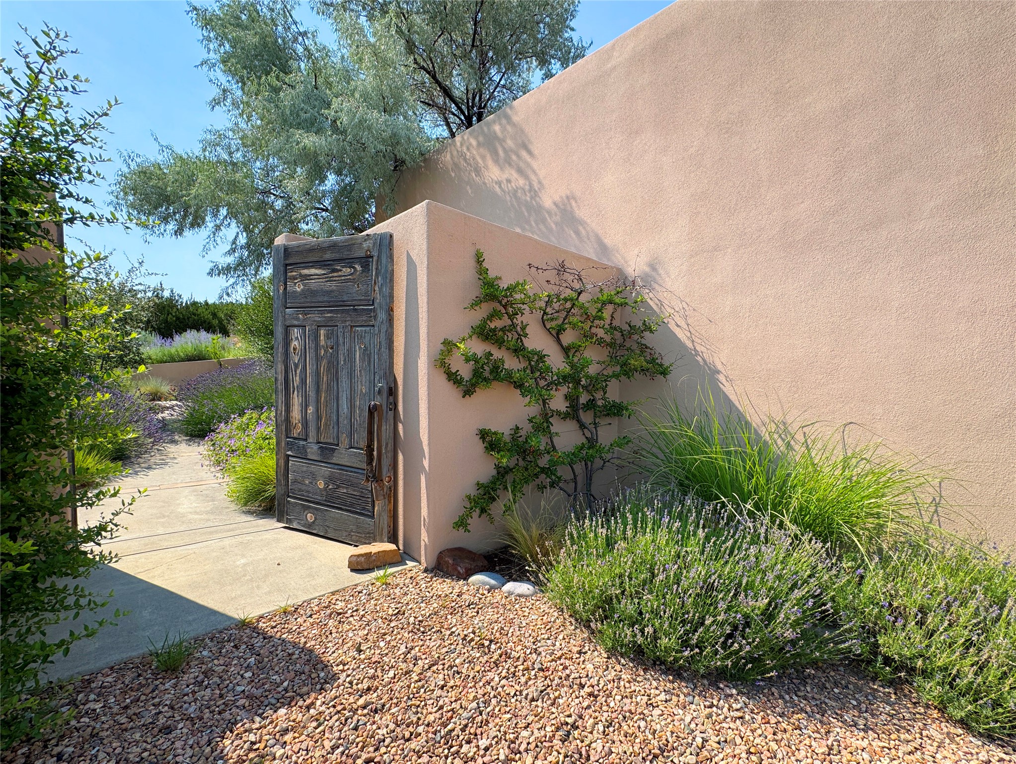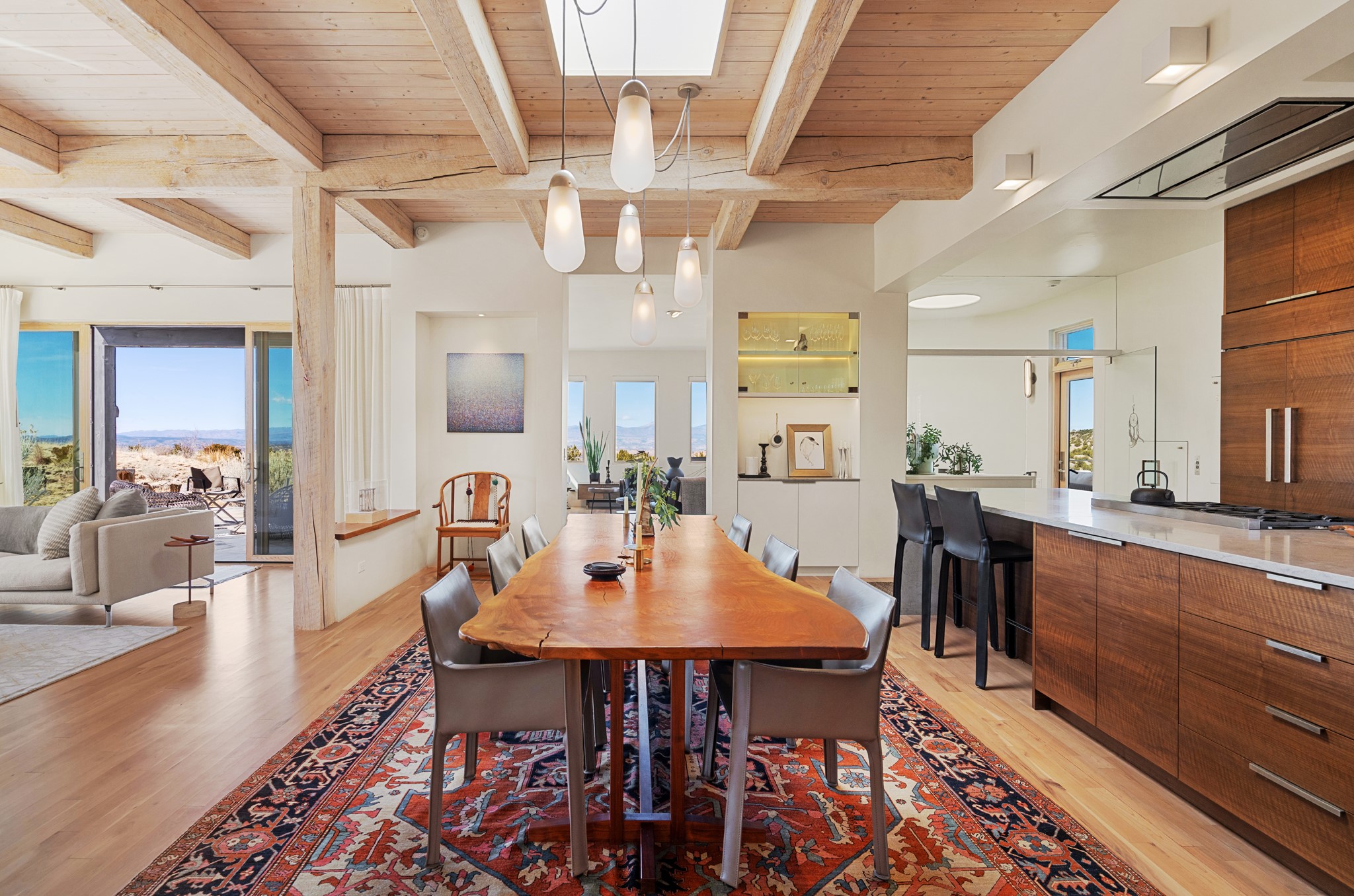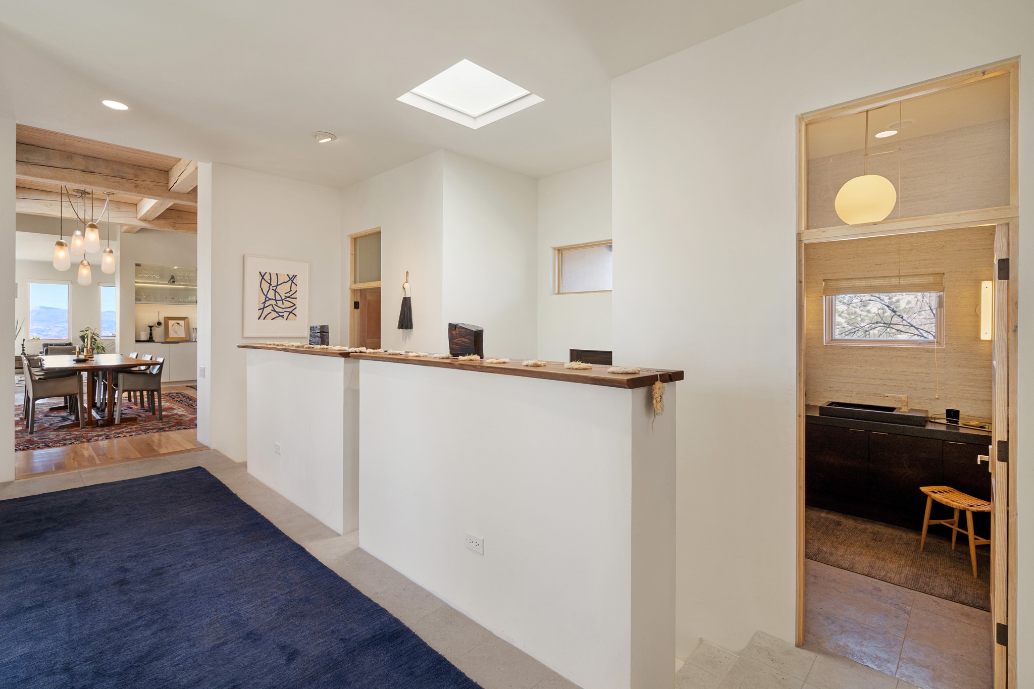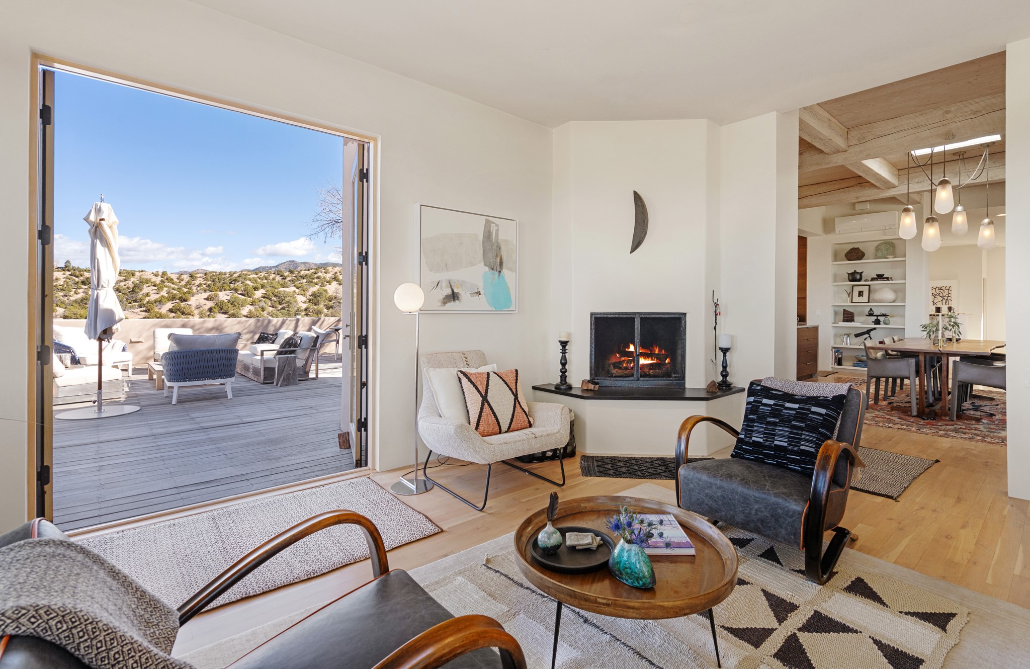 This refined main house and privatecasitais set high in the rolling Tesuque foothills of the Sangre de Cristo Mountains.Extensively re-designed and guided by Feng Shui principles so that energy moves smoothly, the main house creates an immediatesense of calm and well-being, with cherrywoodfloors, rich surfaces and fine details.A quiet retreat with serene spaces sets youinside the landscape of atmospheric views that stay with you. Three patios offer a choice of light and spacethroughout the day. Effortless indoor-outdoor living can be enjoyed from sunrise to sunset--this home welcomesbothquiet reflection andgreat hosting.The kitchen cabinetry and other custom pieces were milled and hand made from a single walnut tree from Oregon by alocal artisan.The great room and den offer warmth and light, with curated views, and each open directly ontoits own outdoor space. The calming primary bedroom flows into a restorative, spa-like experience: From soaking tub to sauna toshower, then stepping outdoors to the hot tub for star gazing--an outdoor shower completes the experience. Next, thecharming 2-bedroom, 2-bath guest house, which is separated by gorgeous native plantings and fruit trees, has its own entrance and parking toprovide exceptional privacy and flexibility for guests. This home offers a rare balance of seclusion and access--equally suited as a lock-and-leave retreat or a primary residence. Serene and immersed in nature, yet minutes from The Four Seasons,Tesuque Village Market, El Nido, andapp. 15 minutes to the Plaza and the Santa Fe Opera. Gated Los Caminitos comprises 573-acres with mapped trails for residents, a clubhouse, pool, tennis and pickleball.