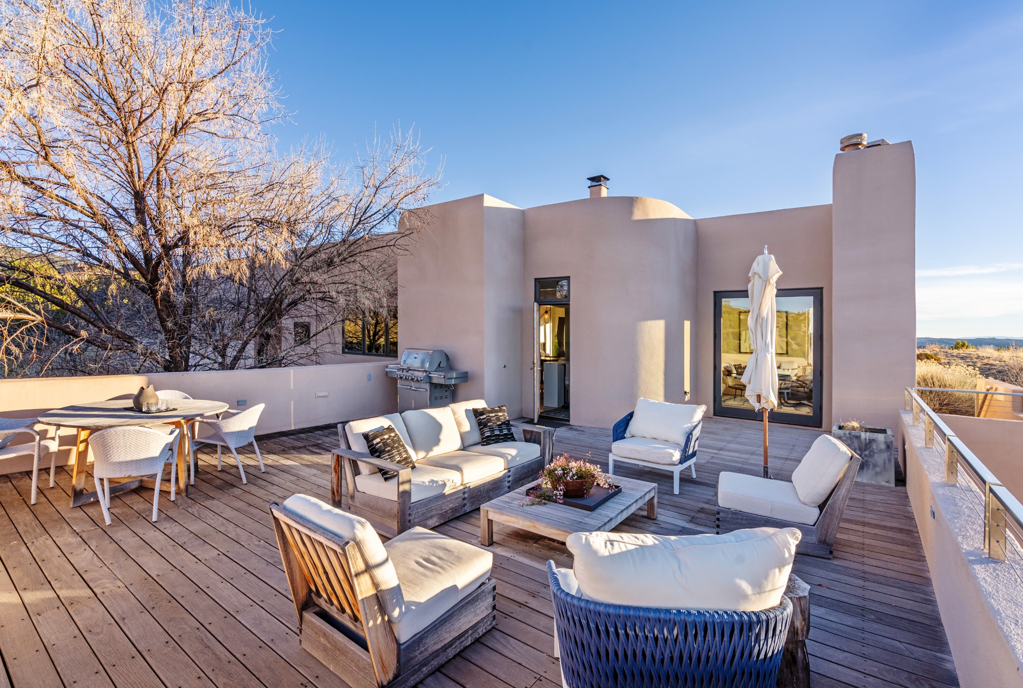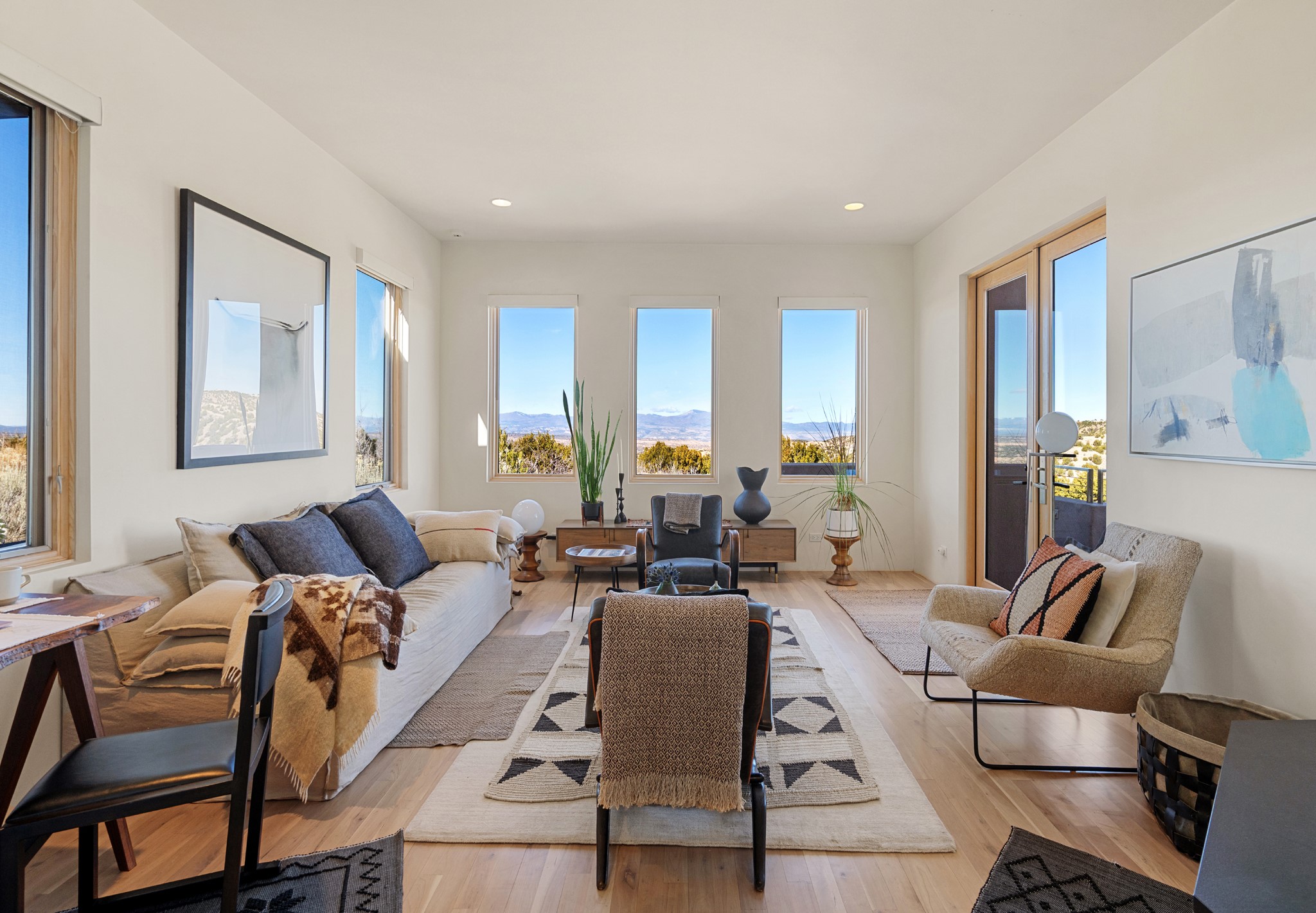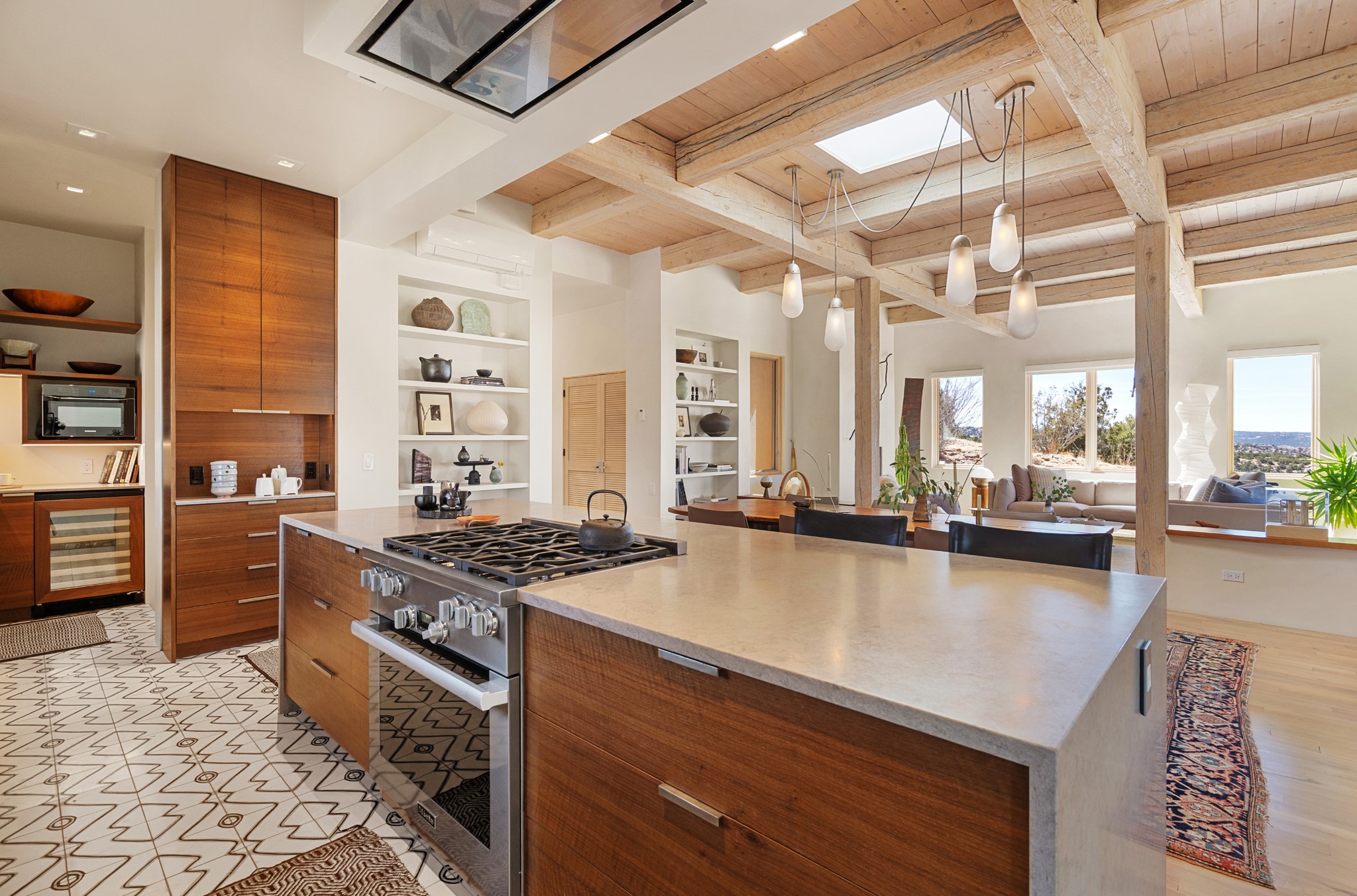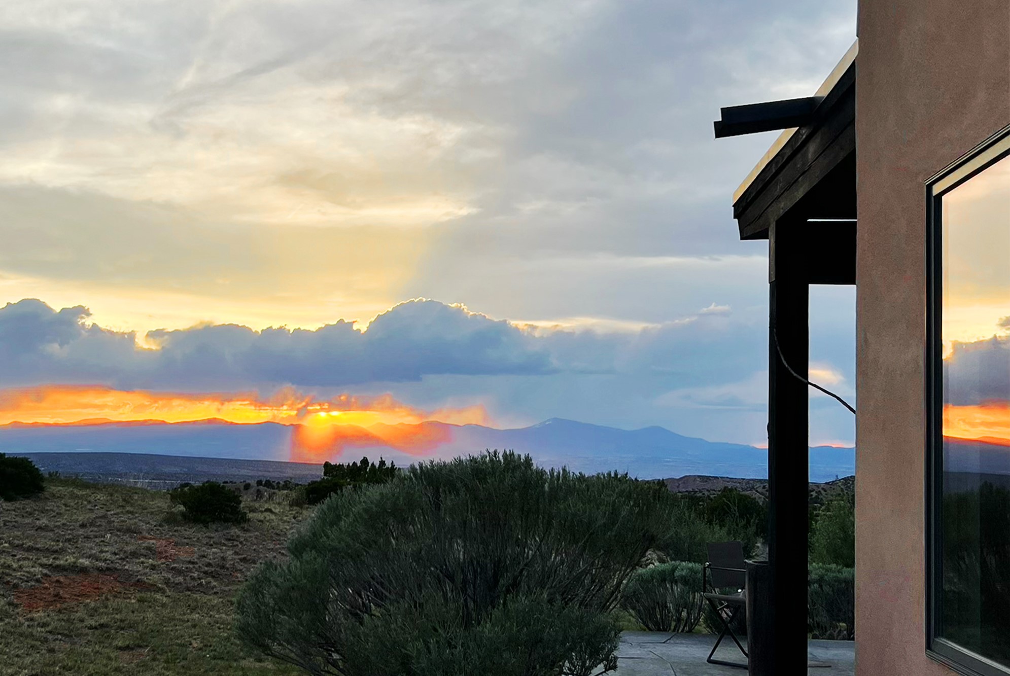This refined main house and privatecasitais set high in the rolling Tesuque foothills of the Sangre de Cristo Mountains.Extensively re-designed and guided by Feng Shui principles so that energy moves smoothly, the main house creates an immediatesense of calm and well-being, with cherrywoodfloors, rich surfaces and fine details.A quiet retreat with serene spaces sets youinside the landscape of atmospheric views that stay with you. Three patios offer a choice of light and spacethroughout the day. Effortless indoor-outdoor living can be enjoyed from sunrise to sunset--this home welcomesbothquiet reflection andgreat hosting.The kitchen cabinetry and other custom pieces were milled and hand made from a single walnut tree from Oregon by alocal artisan.The great room and den offer warmth and light, with curated views, and each open directly ontoits own outdoor space. The calming primary bedroom flows into a restorative, spa-like experience: From soaking tub to sauna toshower, then stepping outdoors to the hot tub for star gazing--an outdoor shower completes the experience. Next, thecharming 2-bedroom, 2-bath guest house, which is separated by gorgeous native plantings and fruit trees, has its own entrance and parking toprovide exceptional privacy and flexibility for guests. This home offers a rare balance of seclusion and access--equally suited as a lock-and-leave retreat or a primary residence. Serene and immersed in nature, yet minutes from The Four Seasons,Tesuque Village Market, El Nido, andapp. 15 minutes to the Plaza and the Santa Fe Opera. Gated Los Caminitos comprises 573-acres with mapped trails for residents, a clubhouse, pool, tennis and pickleball.