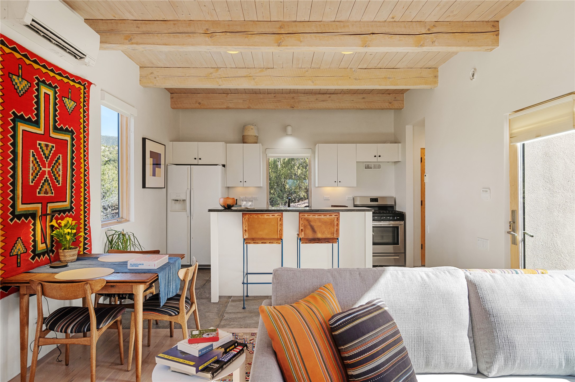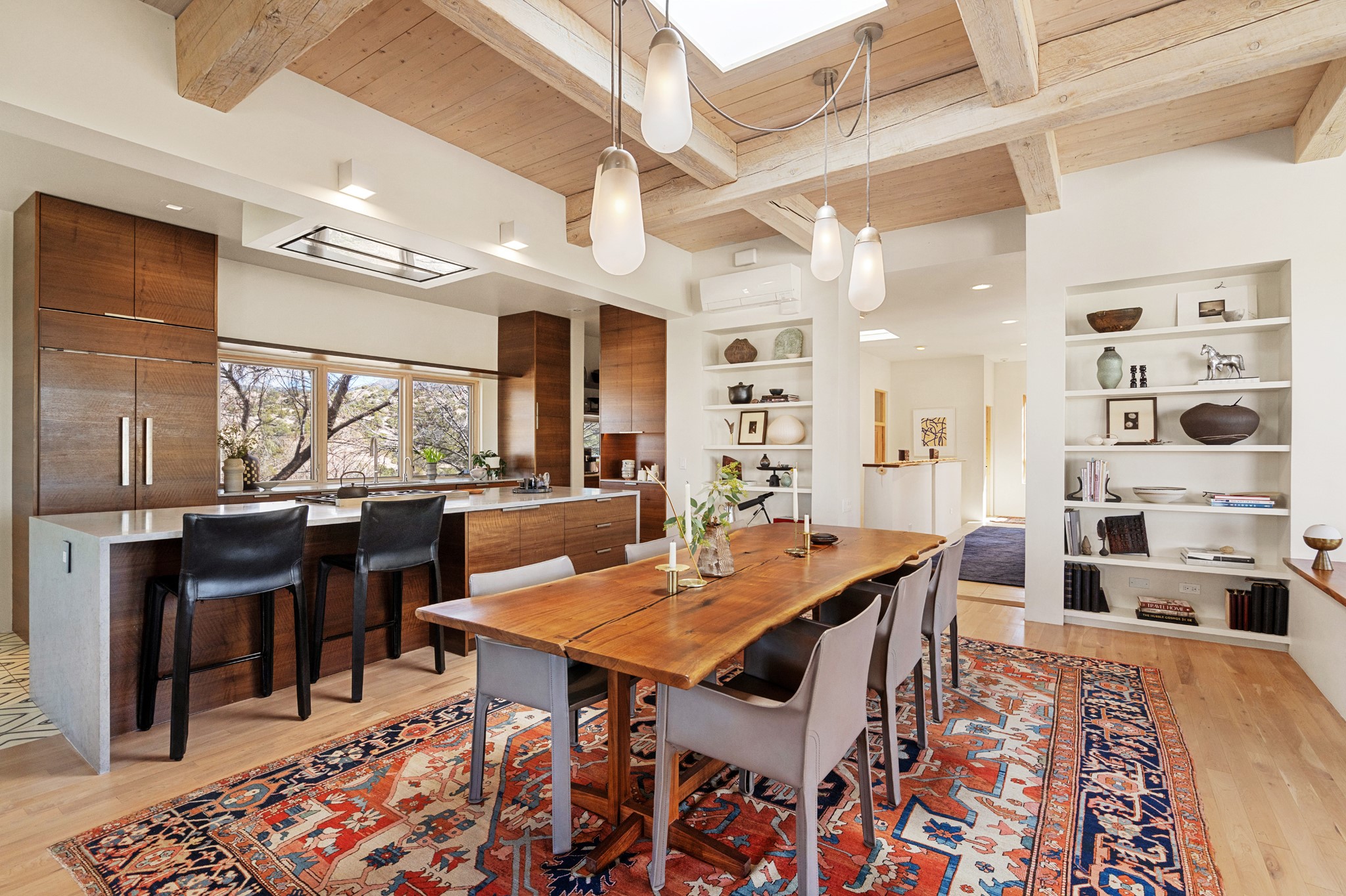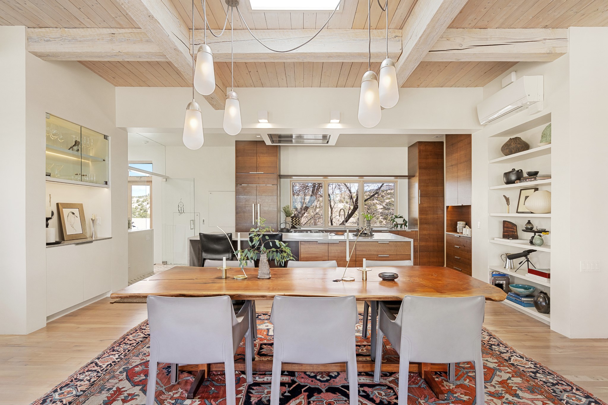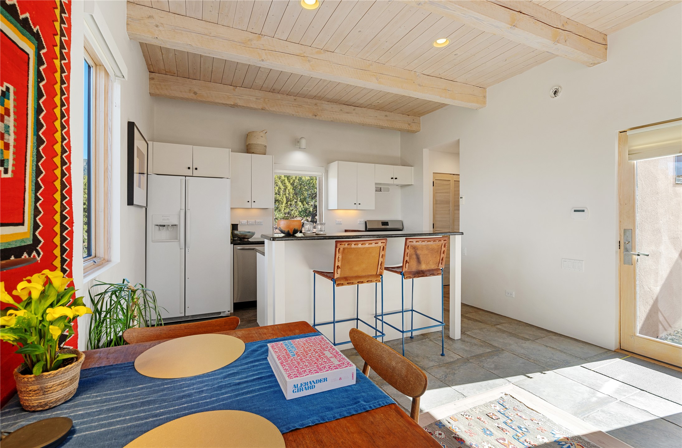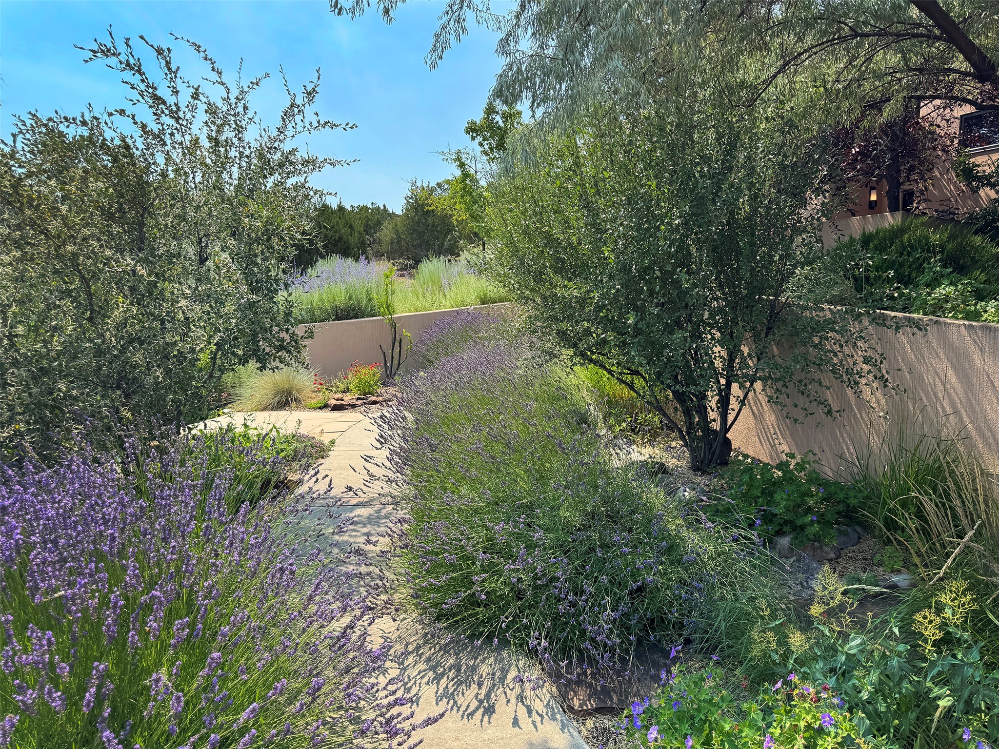 This refined main house and privatecasitais set high in the rolling Tesuque foothills of the Sangre de Cristo Mountains.Extensively re-designed and guided by Feng Shui principles so that energy moves smoothly, the main house creates an immediatesense of calm and well-being, with cherrywoodfloors, rich surfaces and fine details.A quiet retreat with serene spaces sets youinside the landscape of atmospheric views that stay with you. Three patios offer a choice of light and spacethroughout the day. Effortless indoor-outdoor living can be enjoyed from sunrise to sunset--this home welcomesbothquiet reflection andgreat hosting.The kitchen cabinetry and other custom pieces were milled and hand made from a single walnut tree from Oregon by alocal artisan.The great room and den offer warmth and light, with curated views, and each open directly ontoits own outdoor space. The calming primary bedroom flows into a restorative, spa-like experience: From soaking tub to sauna toshower, then stepping outdoors to the hot tub for star gazing--an outdoor shower completes the experience. Next, thecharming 2-bedroom, 2-bath guest house, which is separated by gorgeous native plantings and fruit trees, has its own entrance and parking toprovide exceptional privacy and flexibility for guests. This home offers a rare balance of seclusion and access--equally suited as a lock-and-leave retreat or a primary residence. Serene and immersed in nature, yet minutes from The Four Seasons,Tesuque Village Market, El Nido, andapp. 15 minutes to the Plaza and the Santa Fe Opera. Gated Los Caminitos comprises 573-acres with mapped trails for residents, a clubhouse, pool, tennis and pickleball.