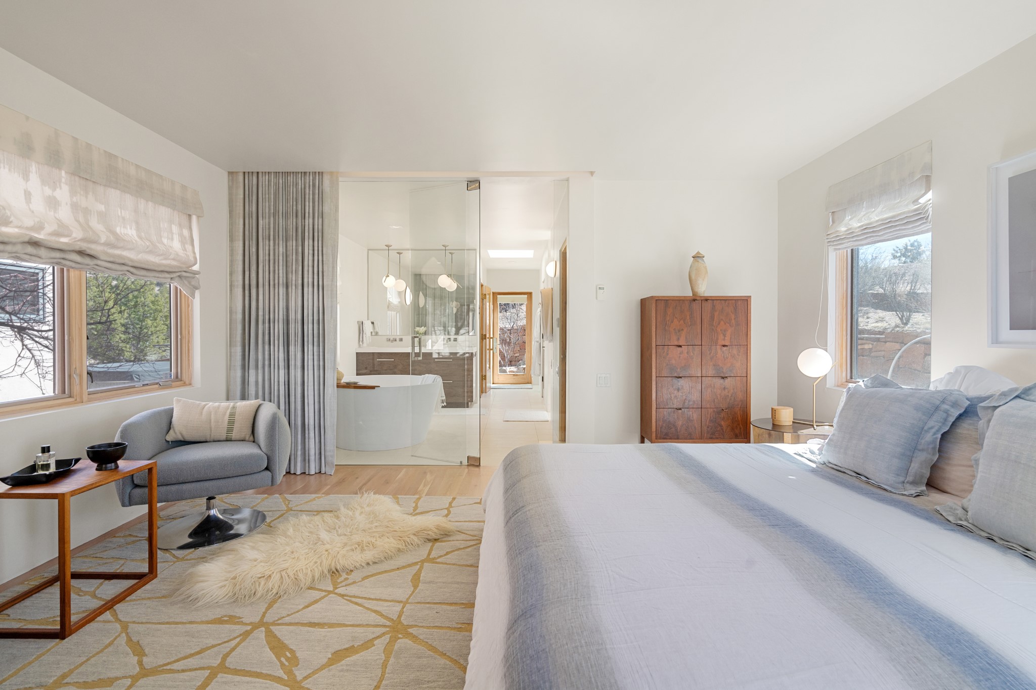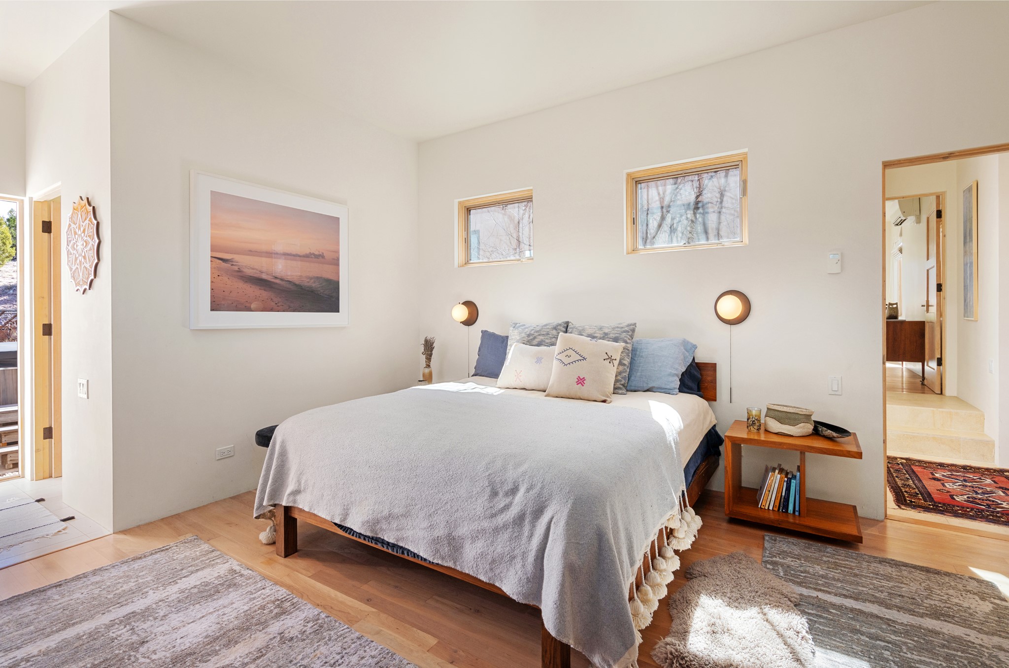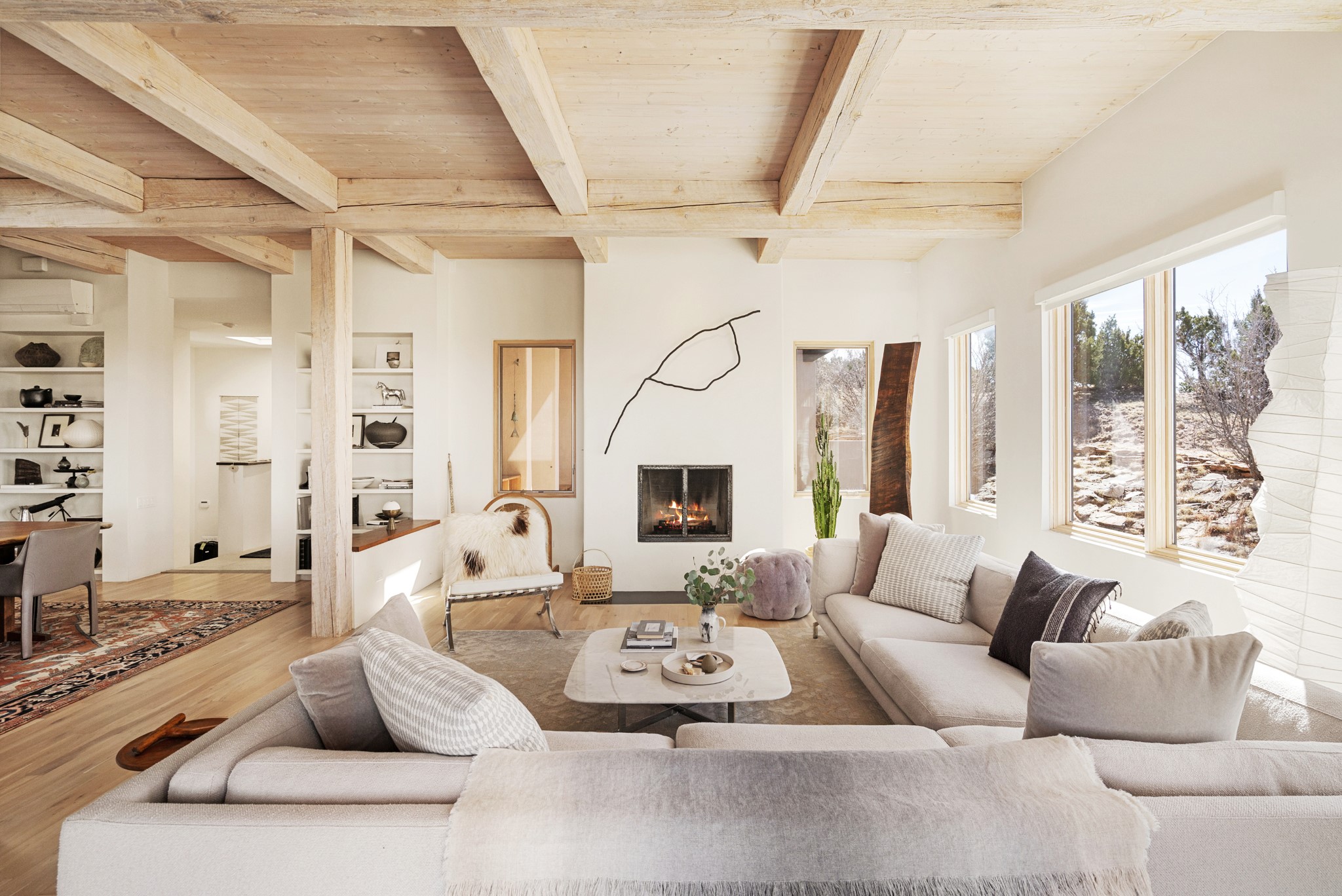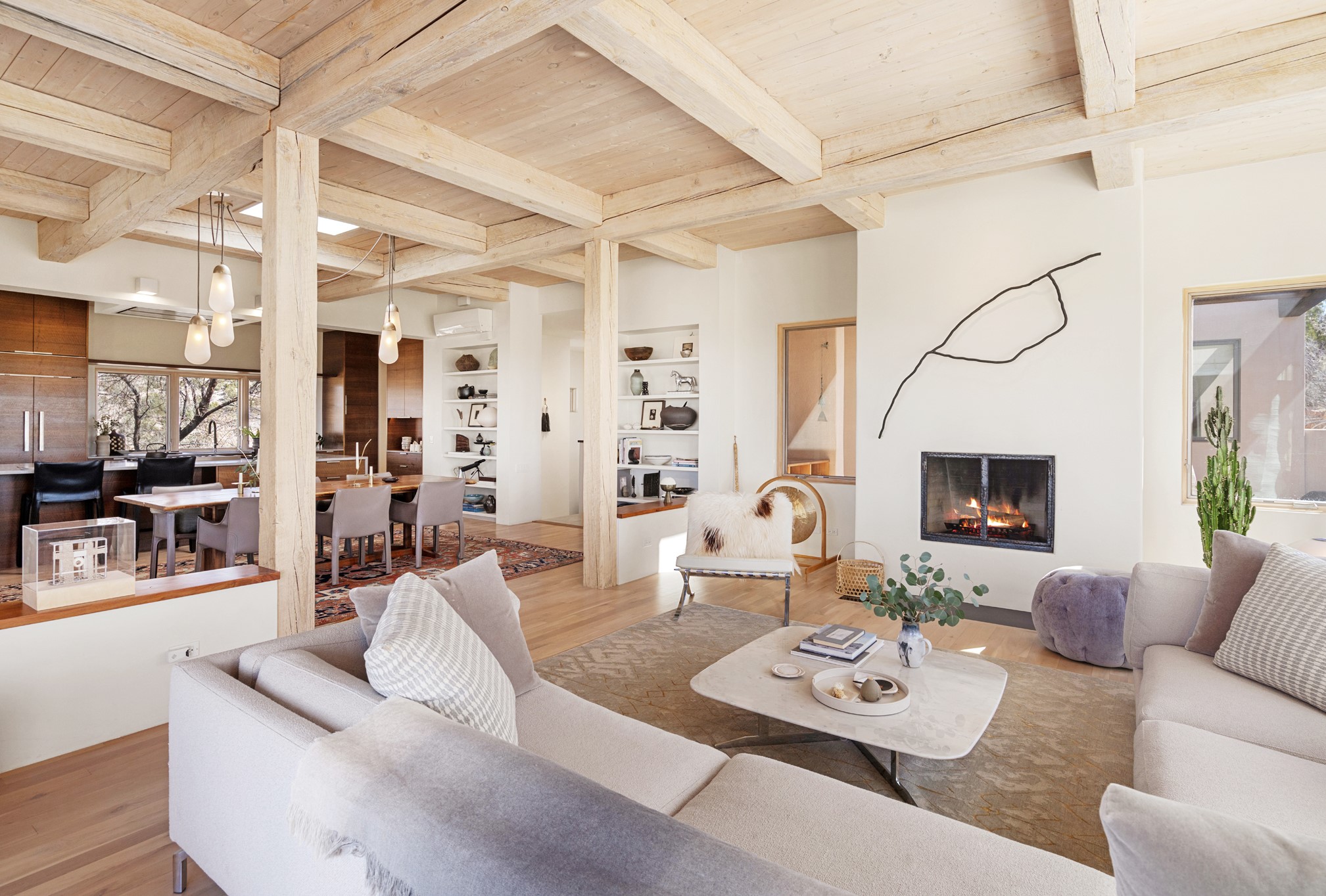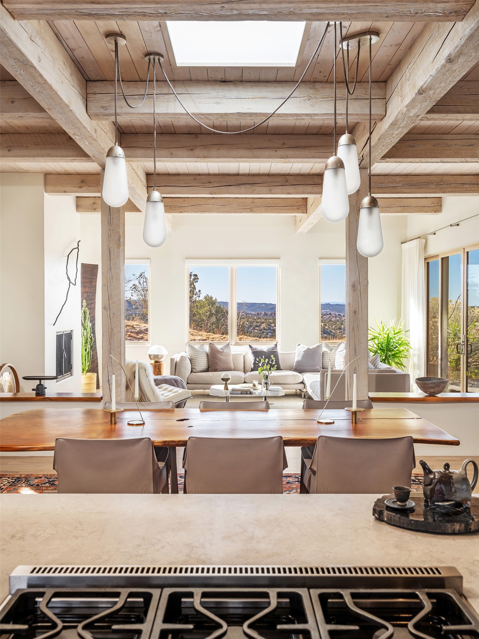 This refined main house and privatecasitais set high in the rolling Tesuque foothills of the Sangre de Cristo Mountains.Extensively re-designed and guided by Feng Shui principles so that energy moves smoothly, the main house creates an immediatesense of calm and well-being, with cherrywoodfloors, rich surfaces and fine details.A quiet retreat with serene spaces sets youinside the landscape of atmospheric views that stay with you. Three patios offer a choice of light and spacethroughout the day. Effortless indoor-outdoor living can be enjoyed from sunrise to sunset--this home welcomesbothquiet reflection andgreat hosting.The kitchen cabinetry and other custom pieces were milled and hand made from a single walnut tree from Oregon by alocal artisan.The great room and den offer warmth and light, with curated views, and each open directly ontoits own outdoor space. The calming primary bedroom flows into a restorative, spa-like experience: From soaking tub to sauna toshower, then stepping outdoors to the hot tub for star gazing--an outdoor shower completes the experience. Next, thecharming 2-bedroom, 2-bath guest house, which is separated by gorgeous native plantings and fruit trees, has its own entrance and parking toprovide exceptional privacy and flexibility for guests. This home offers a rare balance of seclusion and access--equally suited as a lock-and-leave retreat or a primary residence. Serene and immersed in nature, yet minutes from The Four Seasons,Tesuque Village Market, El Nido, andapp. 15 minutes to the Plaza and the Santa Fe Opera. Gated Los Caminitos comprises 573-acres with mapped trails for residents, a clubhouse, pool, tennis and pickleball.