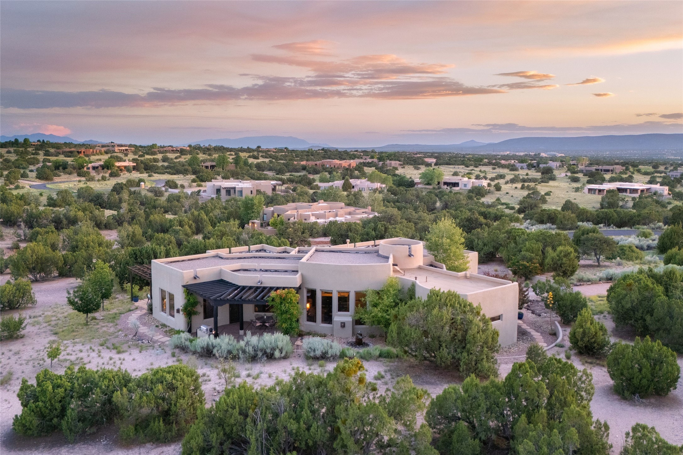 Peaceful elegance with sunset views. Welcome to a serene, custom-crafted sanctuary where timeless design meets contemporary comfort. Nestled in a quiet setting, this exceptional property offers stunning Sangre and Jemez mountain views, just minutes from the exclusive amenities of Las Campanas, including the Ranch Estates equestrian facilities. Every detail of this thoughtfully designed home reflects architectural elegance and ease of living. Distinctive arches, stained ceiling beams, and porcelain tile flooring create an inviting aesthetic. The curved hallways eliminate visible doorways in main areas, encouraging seamless, tranquil flow. The living room features an Anasazi stacked stone fireplace, expansive bay windows, and programmable remote-controlled shades. The chef's kitchen offers a large waterfall island, JennAir appliances, Fulgor range, custom cabinetry, and Anasazi stone backsplash--ideal for both daily use and stylish entertaining. A State-of-the-art sound studio capable of professional music production features hardwood flooring and was built using a sophisticated, advanced sound proofing wall spring system which effectively blocks noise and vibration transfer. The studio has a dedicated 20-amp panel, and mini split for comfort. This space would make an excellent media room for anyone! The spacious primary suite includes a gas kiva fireplace, large picture windows with Sangre views, portal access, and a spa-like bath with Caesarstone finishes, corner windows, and oversized shower. Two additional ensuite bedrooms--one with bay windows and one flex/guest space--offer comfort and versatility. Outdoor living includes a built-in grill, granite counters, water feature, and flagstone paths winding through native landscaping and a 4-cistern-fed irrigation system. Additional highlights include custom wood shutters on all windows, skylights throughout, stained doors/baseboards, new paint, and new tankless water heater. A rare blend of elegance, privacy, and ease.