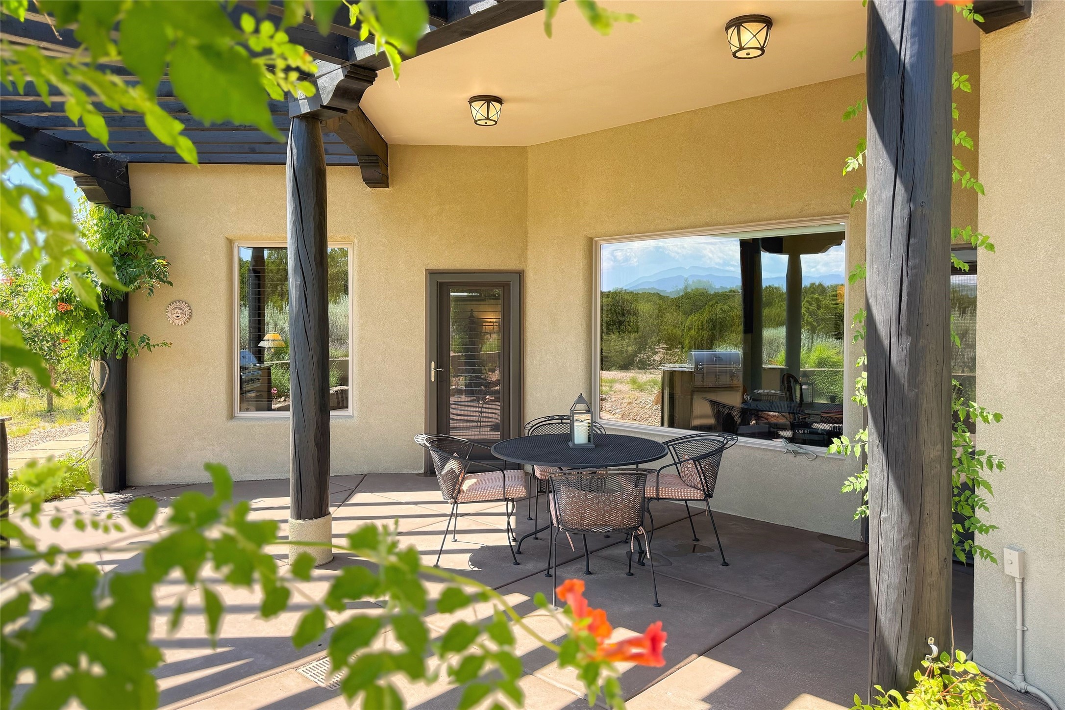 Peaceful elegance with sunset views. Welcome to a serene, custom-crafted sanctuary where timeless design meets contemporary comfort. Nestled in a quiet setting, this exceptional property offers stunning Sangre and Jemez mountain views, just minutes from the exclusive amenities of Las Campanas, including the Ranch Estates equestrian facilities. Every detail of this thoughtfully designed home reflects architectural elegance and ease of living. Distinctive arches, stained ceiling beams, and porcelain tile flooring create an inviting aesthetic. The curved hallways eliminate visible doorways in main areas, encouraging seamless, tranquil flow. The living room features an Anasazi stacked stone fireplace, expansive bay windows, and programmable remote-controlled shades. The chef's kitchen offers a large waterfall island, JennAir appliances, Fulgor range, custom cabinetry, and Anasazi stone backsplash--ideal for both daily use and stylish entertaining. A State-of-the-art sound studio capable of professional music production features hardwood flooring and was built using a sophisticated, advanced sound proofing wall spring system which effectively blocks noise and vibration transfer. The studio has a dedicated 20-amp panel, and mini split for comfort. This space would make an excellent media room for anyone! The spacious primary suite includes a gas kiva fireplace, large picture windows with Sangre views, portal access, and a spa-like bath with Caesarstone finishes, corner windows, and oversized shower. Two additional ensuite bedrooms--one with bay windows and one flex/guest space--offer comfort and versatility. Outdoor living includes a built-in grill, granite counters, water feature, and flagstone paths winding through native landscaping and a 4-cistern-fed irrigation system. Additional highlights include custom wood shutters on all windows, skylights throughout, stained doors/baseboards, new paint, and new tankless water heater. A rare blend of elegance, privacy, and ease.