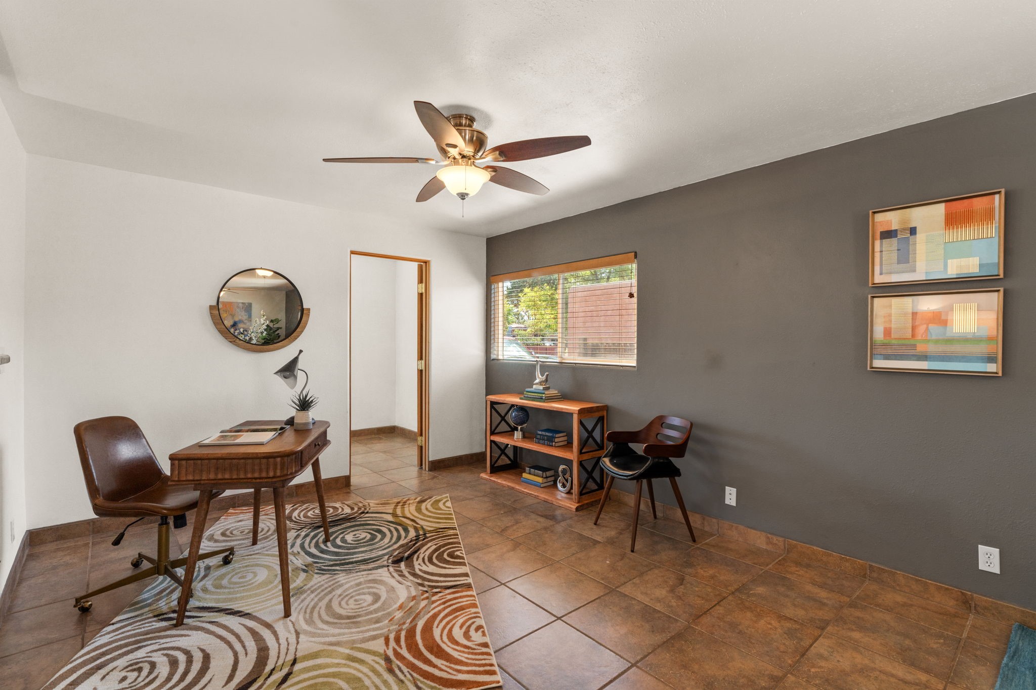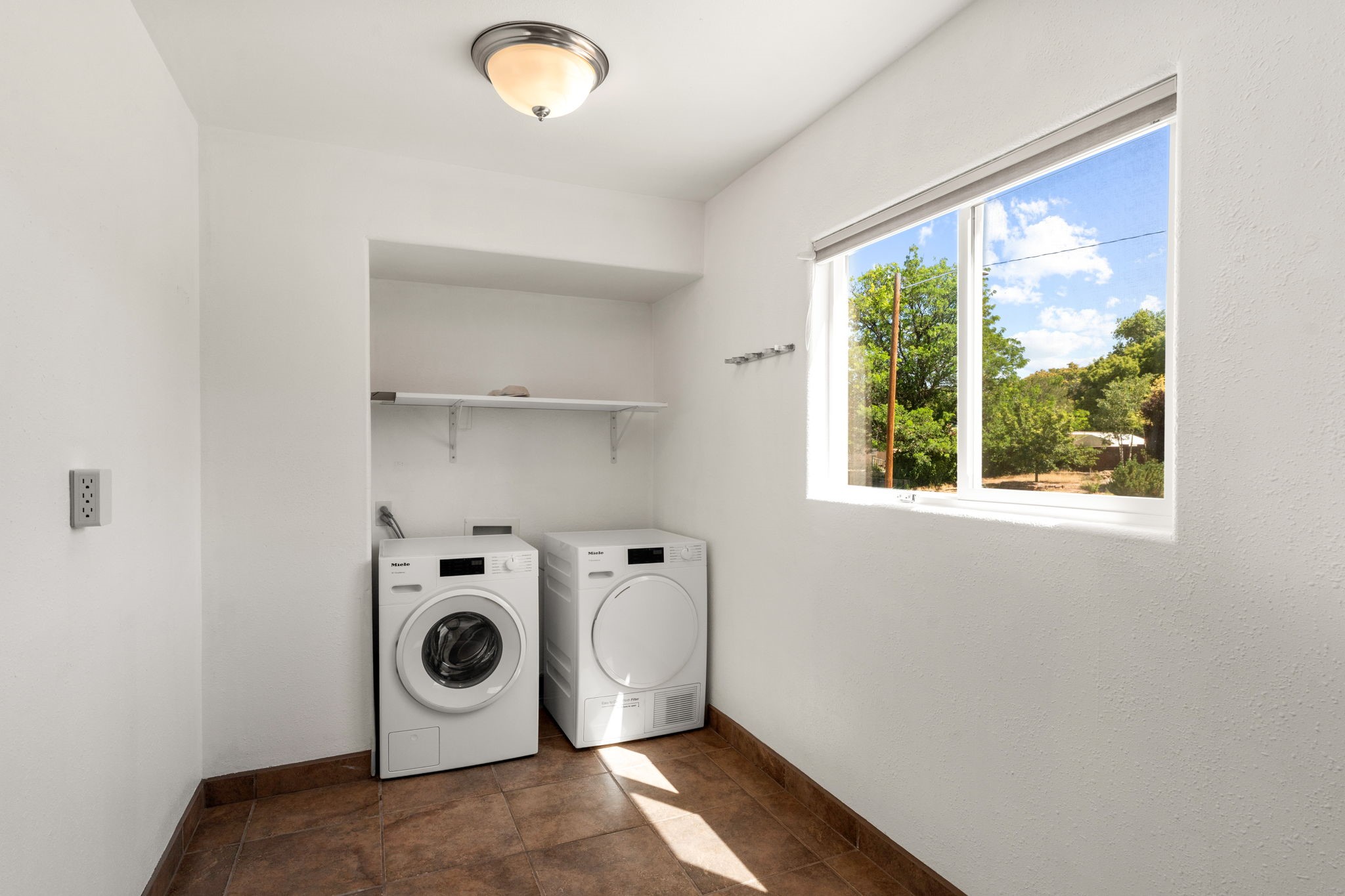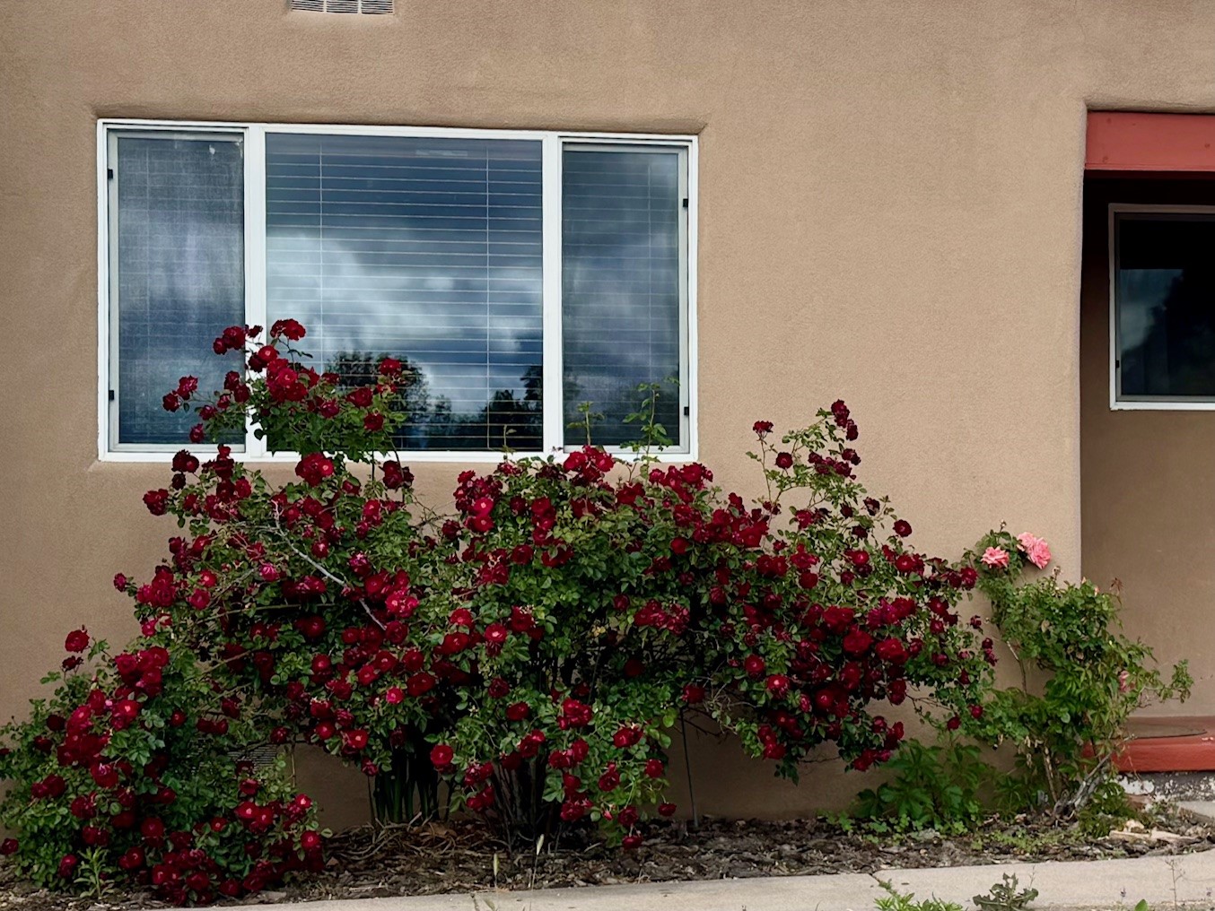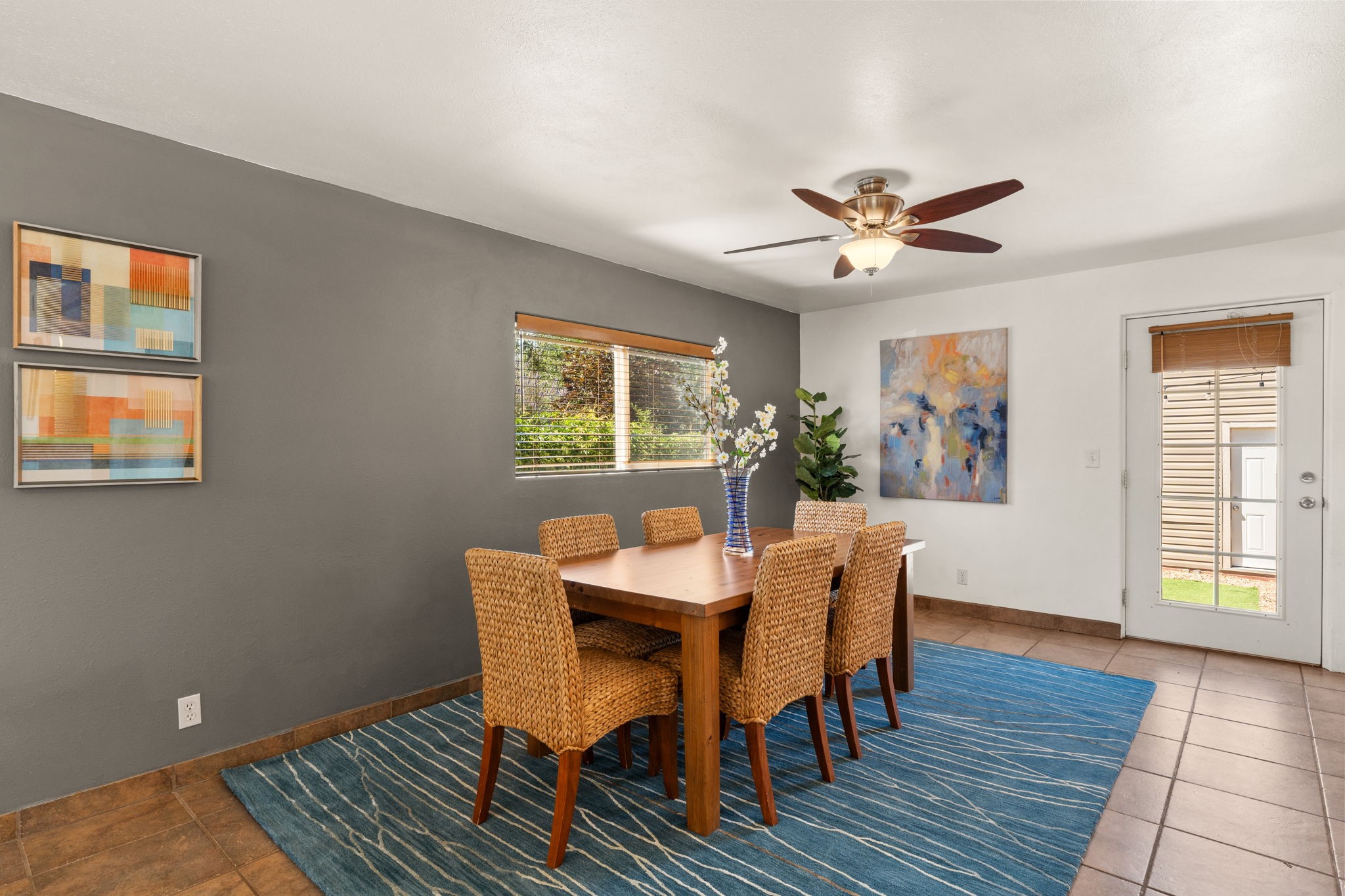 This light-filled and beautifully remodeled Stamm home offers captivating Sangre de Cristo mountain views and a seamless blend of classic charm and modern upgrades. The open floor plan centers around a spacious, completely updated kitchen featuring sleek cabinetry, stainless-steel appliances, and a generous butcher block island with ample storage--perfect for gathering and entertaining, with hardwood floors lending warmth throughout. The inviting living room boasts a cozy corner Kiva fireplace and a large picture window framing the unforgettable mountain vistas. The home offers three comfortable bedrooms, including a primary suite with a tastefully remodeled en suite bath. Central heating and A/C provide year-round comfort. Outside, the expansive and private back yard includes a large storage shed with shelving and a second smaller shed ideal for garden tools. With only one step throughout the entire home, accessibility is easy and effortless. Just moments from the Santa Fe River Trail, La Tierra trails and dog park, and within walking distance to local coffee shops and shopping, this property blends convenience, comfort, and natural beauty into a truly special place to call home.