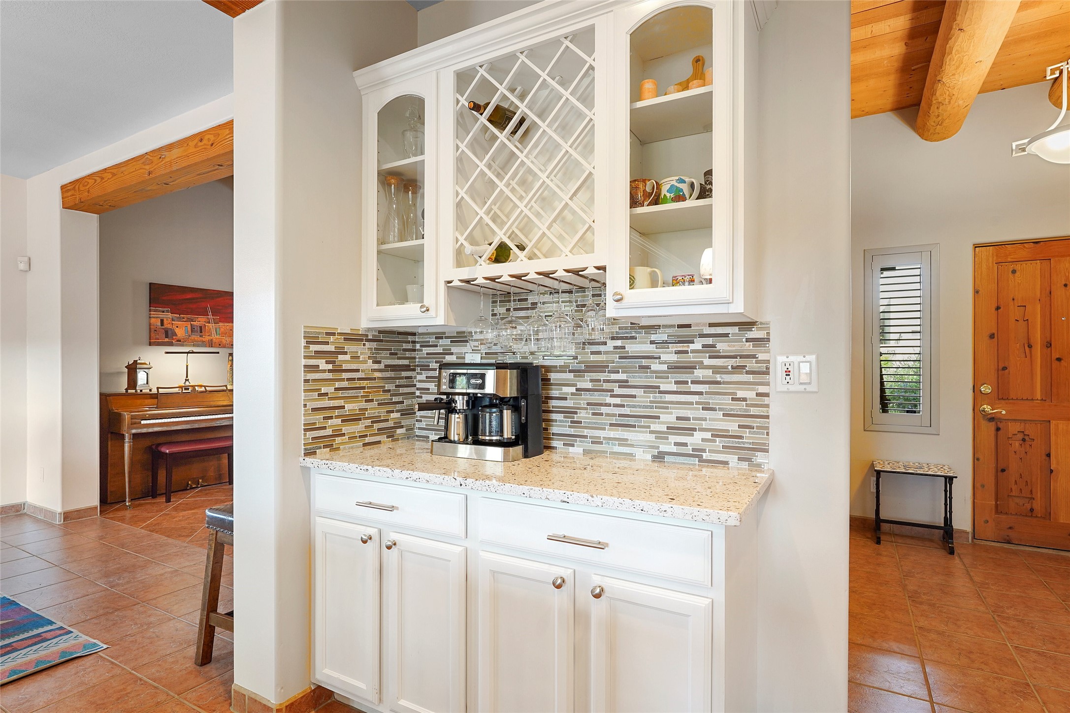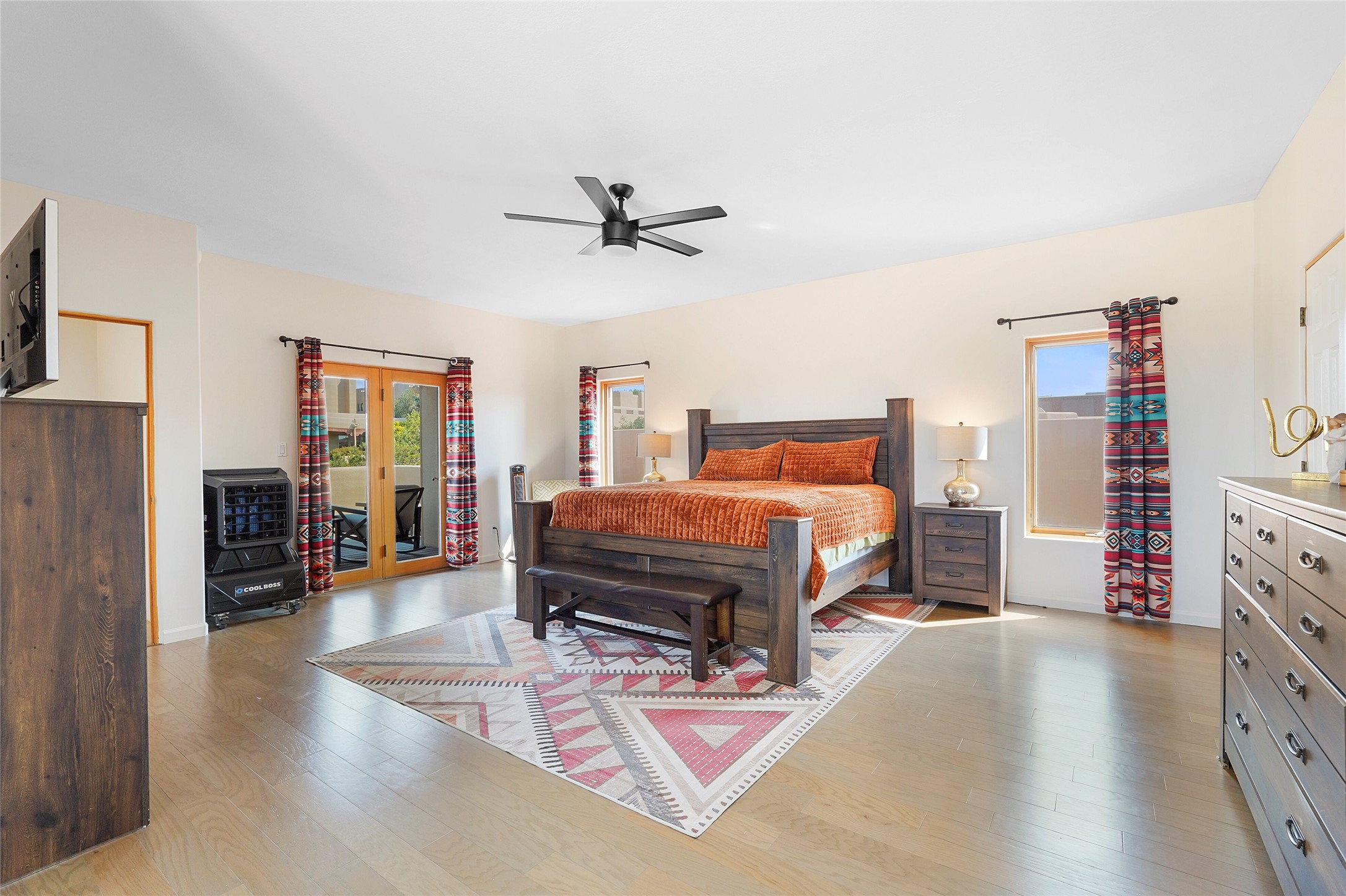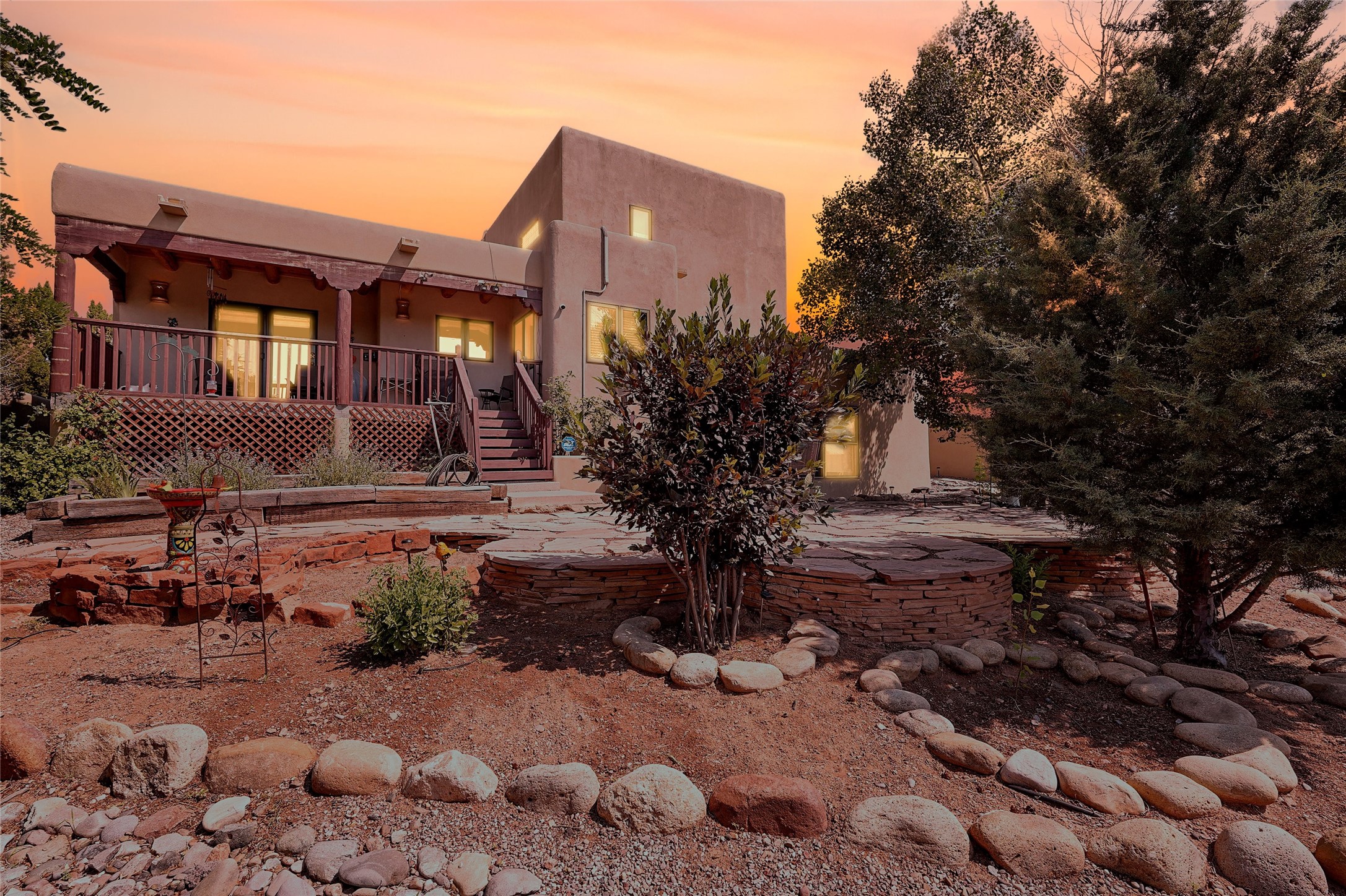 Welcome to this beautifully maintained home in the sought-after Pueblos de Sol subdivision, offering comfortable living and sweeping views. Recent upgrades include a modern kitchen with stainless steel appliances, granite countertops, and a spa-like primary bathroom with a standalone tub and custom stone tile. The primary suite also features a private deck with durable Trex decking. A TPO roof was installed in 2022. Enjoy year-round comfort with 5 mini-splits and radiant heating. Outdoor living shines with multiple decks, a charming courtyard, mature trees, and drip irrigation. A separate-entry studio/guesthouse with full bath offers rental or creative flexibility. Don't miss this Santa Fe gem! Trails and parks nearby!