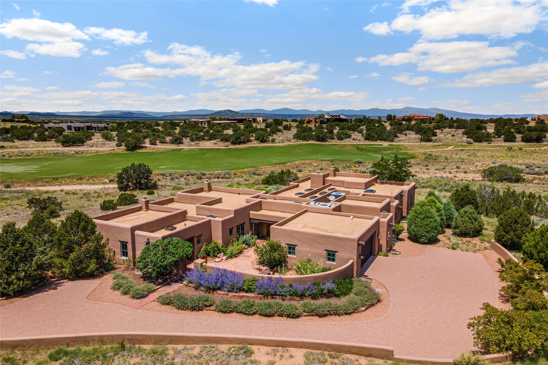 This home is the epitome of Refined Santa Fe Elegance, with 4 Bedrooms, 4.5 baths, 4 Fireplaces, No Steps and panoramic views of Sandia Mountain & the Fourth Fairway of the Sunset Golf Course, at the end of a cul-de-sac in Gated Las Campanas. An expansive hallway for artwork features 2 sets of French doors that open to the wrap-around portal for dining & relaxing which extends to the Living Room, also showcases the golf course view. The Gourmet Kitchen includes Viking appliances, an over-size island with prep sink, menu-planning desk & Butler's Pantry with wine cooler. The Main Bedroom suite offers a luxurious Spa Bath with large shower & whirlpool tub plus a walk-in closet worthy of a designer retail store. Bedroom Two is sequestered from the Main and has an en-suite bath. Bedroom Three with en-suite bath is adjacent to the Main and currently used as an office. Bedroom Four offers total privacy, as an attached Casita with en-suite bath & mini-kitchenette. The expansive brick Portal off the gallery hall includes a built-in BBQ & impressive fireplace, providing the perfect venue for entertaining, dining, relaxing or savoring the panoramic golf course & Sandia Mountain views. The Two-car Garage has eliminated garage clutter, with 29 feet of handsome cabinets plus a power wall to store bicycles, skis & other outdoor equipment. Come see why this 4-Bedroom home with Golf & Mountain views is the perfect embodiment of elegant Santa Fe resort living.