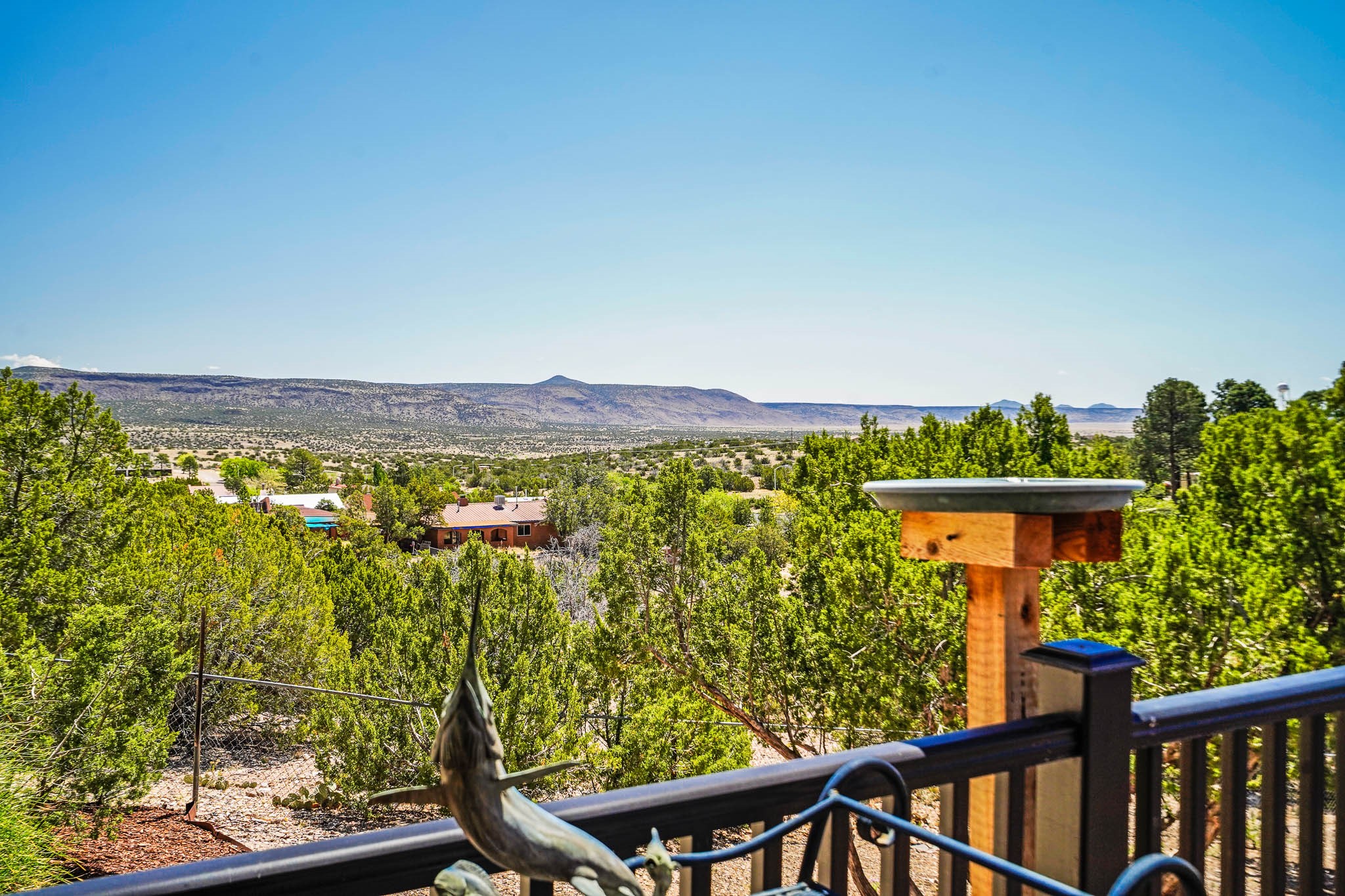 Discover a truly exceptional Cochiti Lake home, fully remodeled in 2023 and thoughtfully enhanced since! Perched on a ridgeline in a peaceful cul-de-sac on a generous .93-acre fenced lot, this property offers unparalleled peace and quiet with breathtaking views toward La Bajada Mesa and Tetilla Peak, especially from the spacious Trex deck off the kitchen. Experience the magic of dark skies, the Milky Way, and vibrant constellations right from your own backyard.Every detail has been addressed: the exterior boasts new paint, a gravel parking pad, updated electrical panel, new driveway, garage door, and a welcoming front door with a screen door. Enjoy enhanced curb appeal with new front porch lights and meticulously refreshed front yard landscaping with flagstone. A 10x20 steel garage/storage building provides ample extra space. All windows and the sliding glass door are new, and a greenhouse adds a touch of charm.Inside, comfort is assured with a new York air-conditioning/heating unit. The interior shines with paneled pine doors and trim throughout, a relocated master entry, and clever shelving by the master bedroom. The acoustic ceilings were removed and the entire house has been freshly painted. Both the master and second bathrooms are updated and remodeled, featuring a new tile floor in the latter and added shelving in the master. The fireplace has been beautifully updated, and new ceiling fans are installed throughout. The complete kitchen remodel features top-end GE appliances, including a gas stove, double oven, French door refrigerator, and stunning quartz countertops. The dining room impresses with deer print wallpaper, while a small office space has been added for productivity. The laundry room is now more functional with an added sink, complemented by a stacked washer/dryer. This home is truly move-in ready and elegantly updated for modern living.