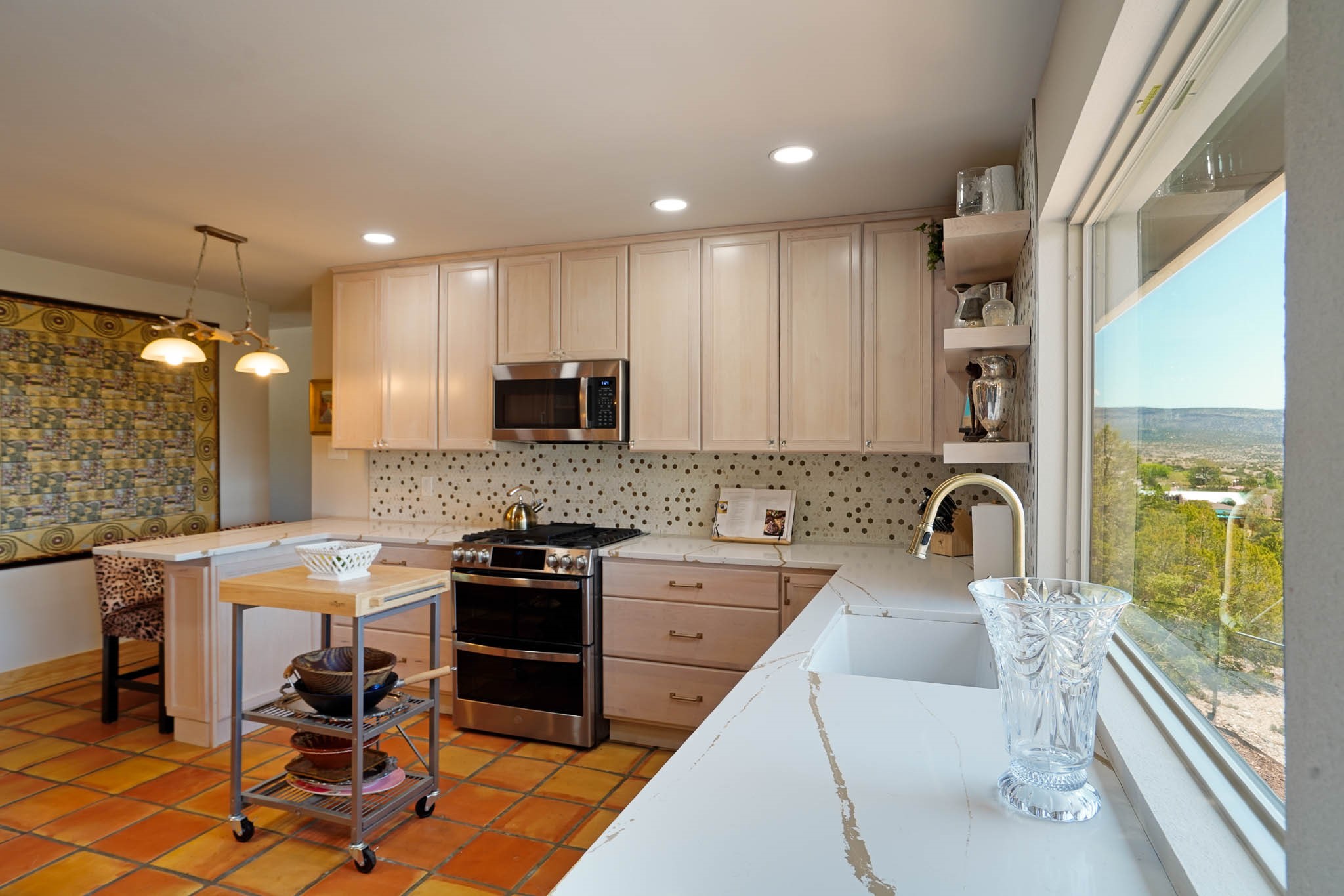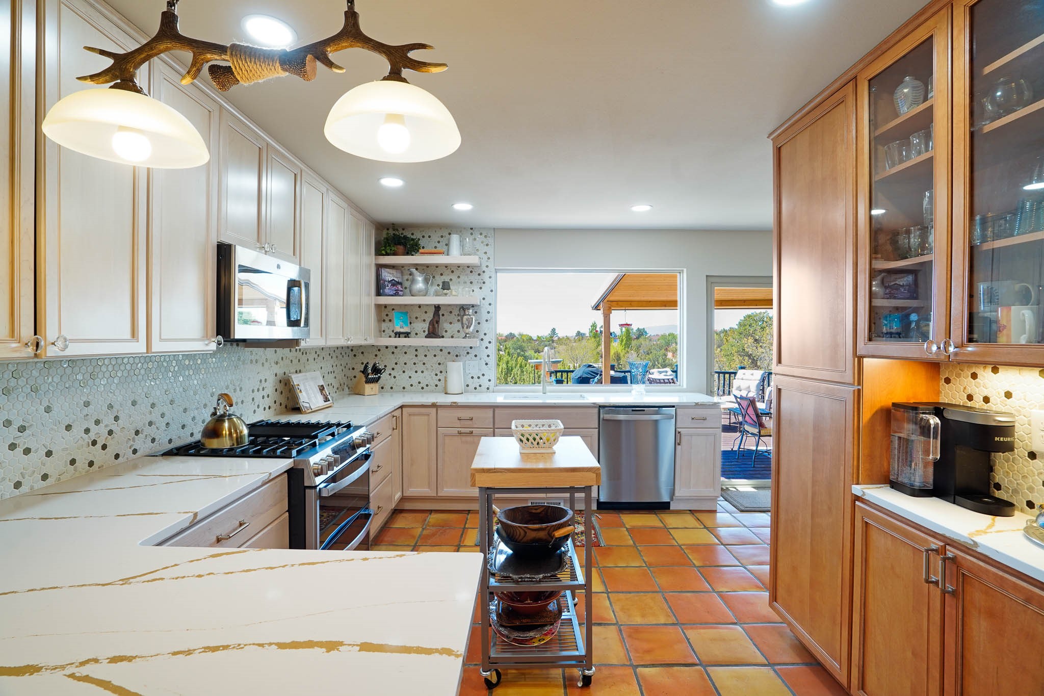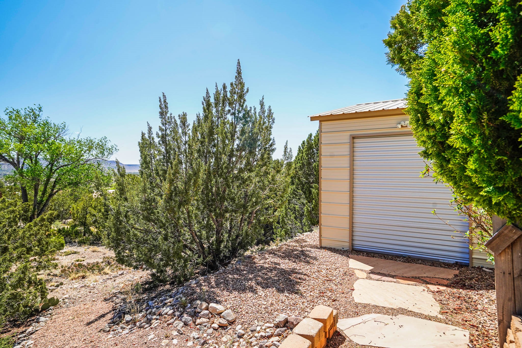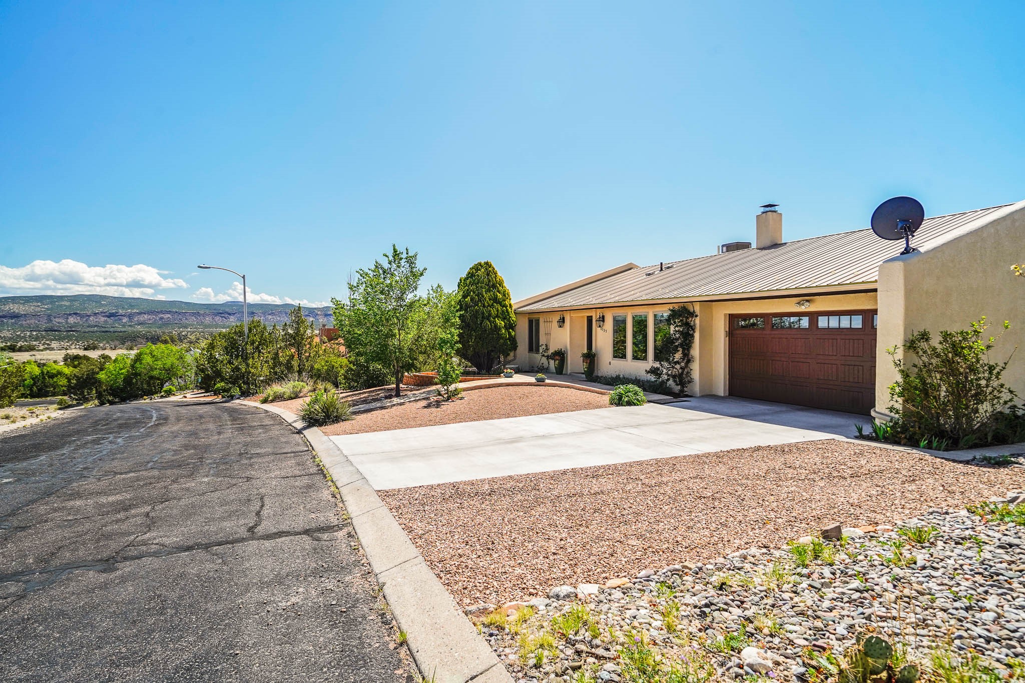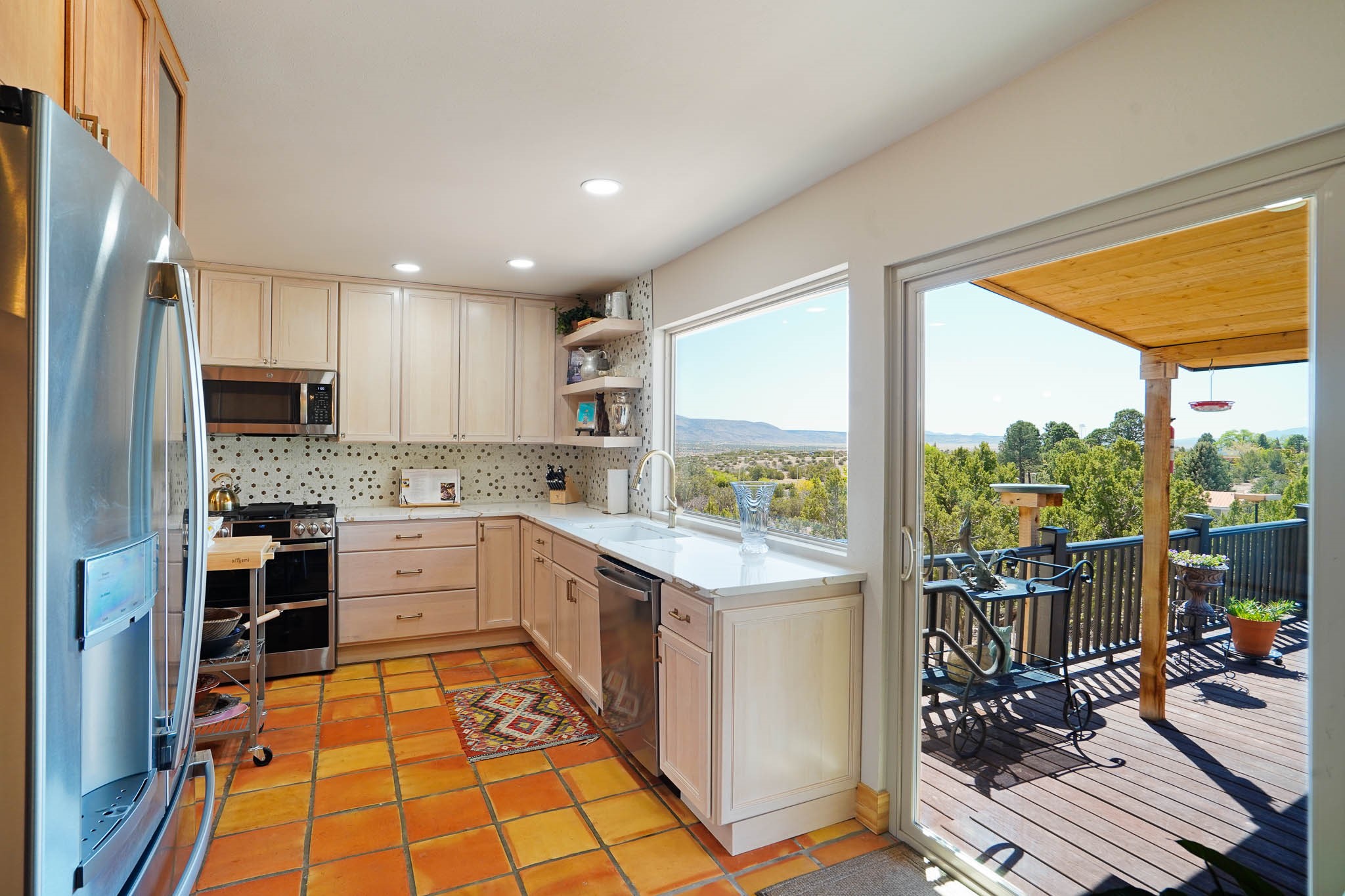 Discover a truly exceptional Cochiti Lake home, fully remodeled in 2023 and thoughtfully enhanced since! Perched on a ridgeline in a peaceful cul-de-sac on a generous .93-acre fenced lot, this property offers unparalleled peace and quiet with breathtaking views toward La Bajada Mesa and Tetilla Peak, especially from the spacious Trex deck off the kitchen. Experience the magic of dark skies, the Milky Way, and vibrant constellations right from your own backyard.Every detail has been addressed: the exterior boasts new paint, a gravel parking pad, updated electrical panel, new driveway, garage door, and a welcoming front door with a screen door. Enjoy enhanced curb appeal with new front porch lights and meticulously refreshed front yard landscaping with flagstone. A 10x20 steel garage/storage building provides ample extra space. All windows and the sliding glass door are new, and a greenhouse adds a touch of charm.Inside, comfort is assured with a new York air-conditioning/heating unit. The interior shines with paneled pine doors and trim throughout, a relocated master entry, and clever shelving by the master bedroom. The acoustic ceilings were removed and the entire house has been freshly painted. Both the master and second bathrooms are updated and remodeled, featuring a new tile floor in the latter and added shelving in the master. The fireplace has been beautifully updated, and new ceiling fans are installed throughout. The complete kitchen remodel features top-end GE appliances, including a gas stove, double oven, French door refrigerator, and stunning quartz countertops. The dining room impresses with deer print wallpaper, while a small office space has been added for productivity. The laundry room is now more functional with an added sink, complemented by a stacked washer/dryer. This home is truly move-in ready and elegantly updated for modern living.