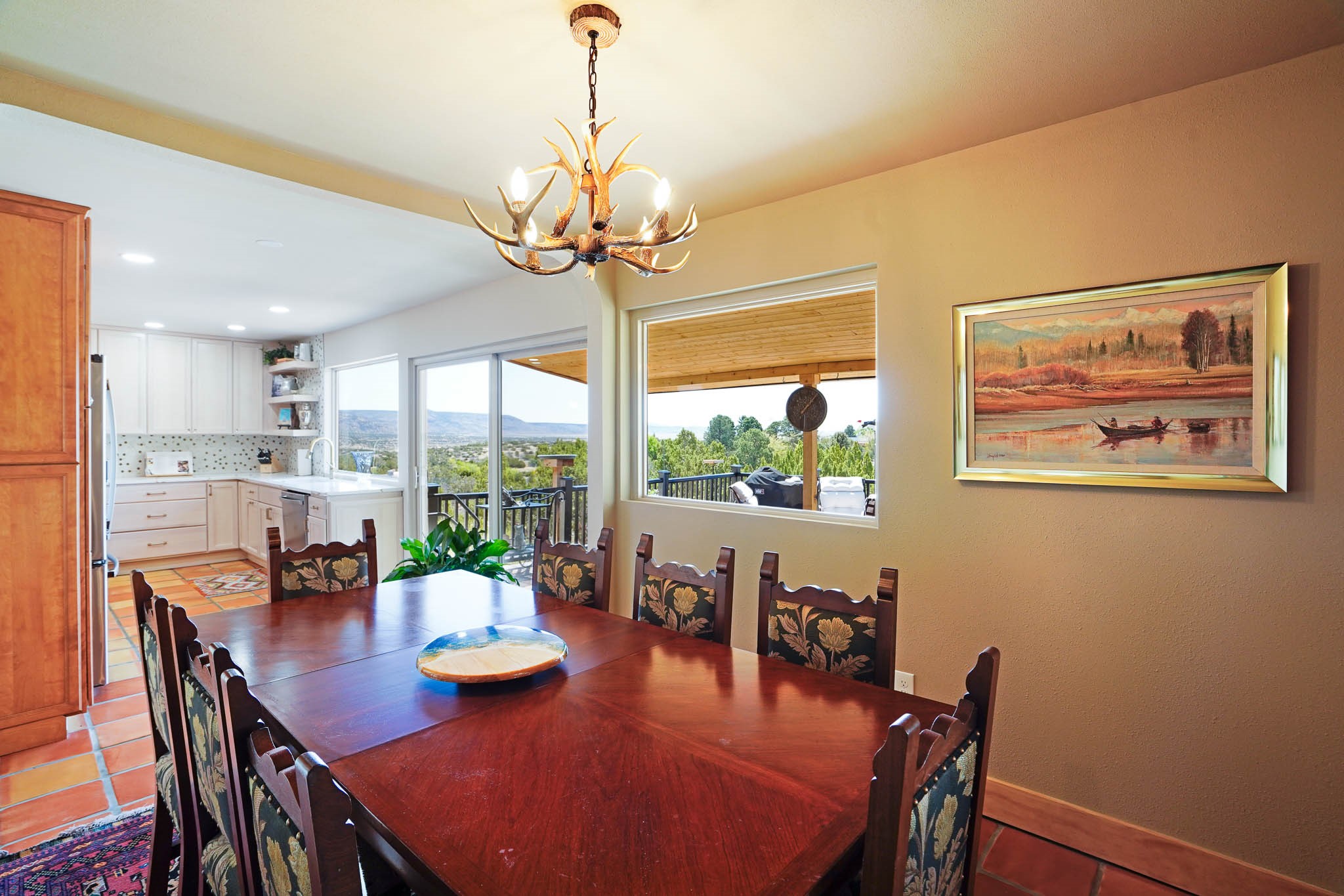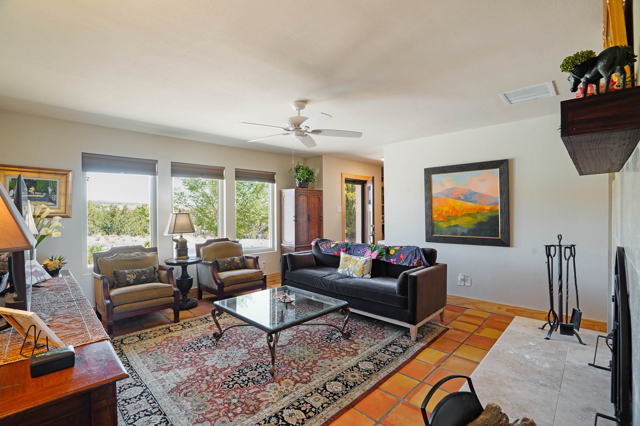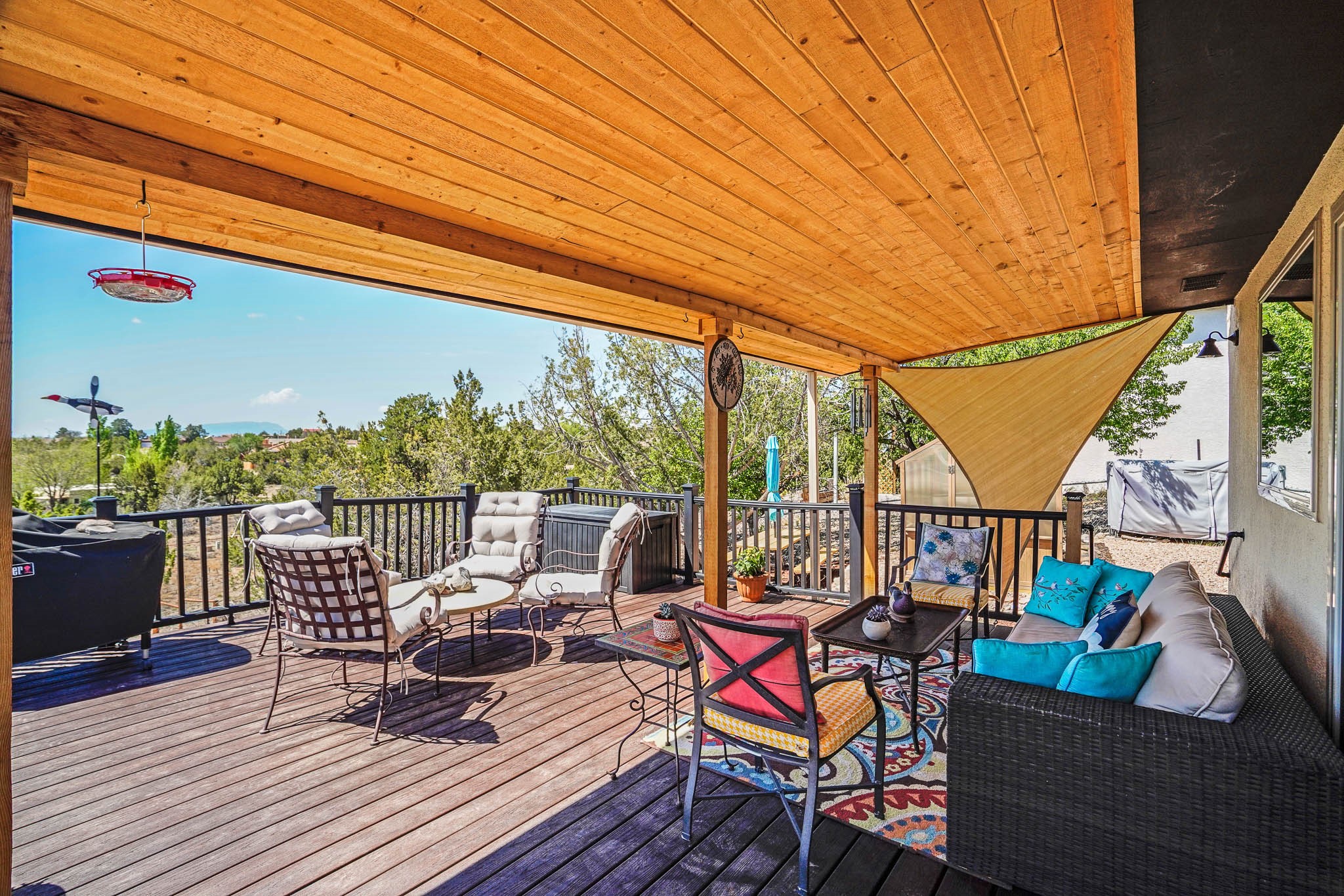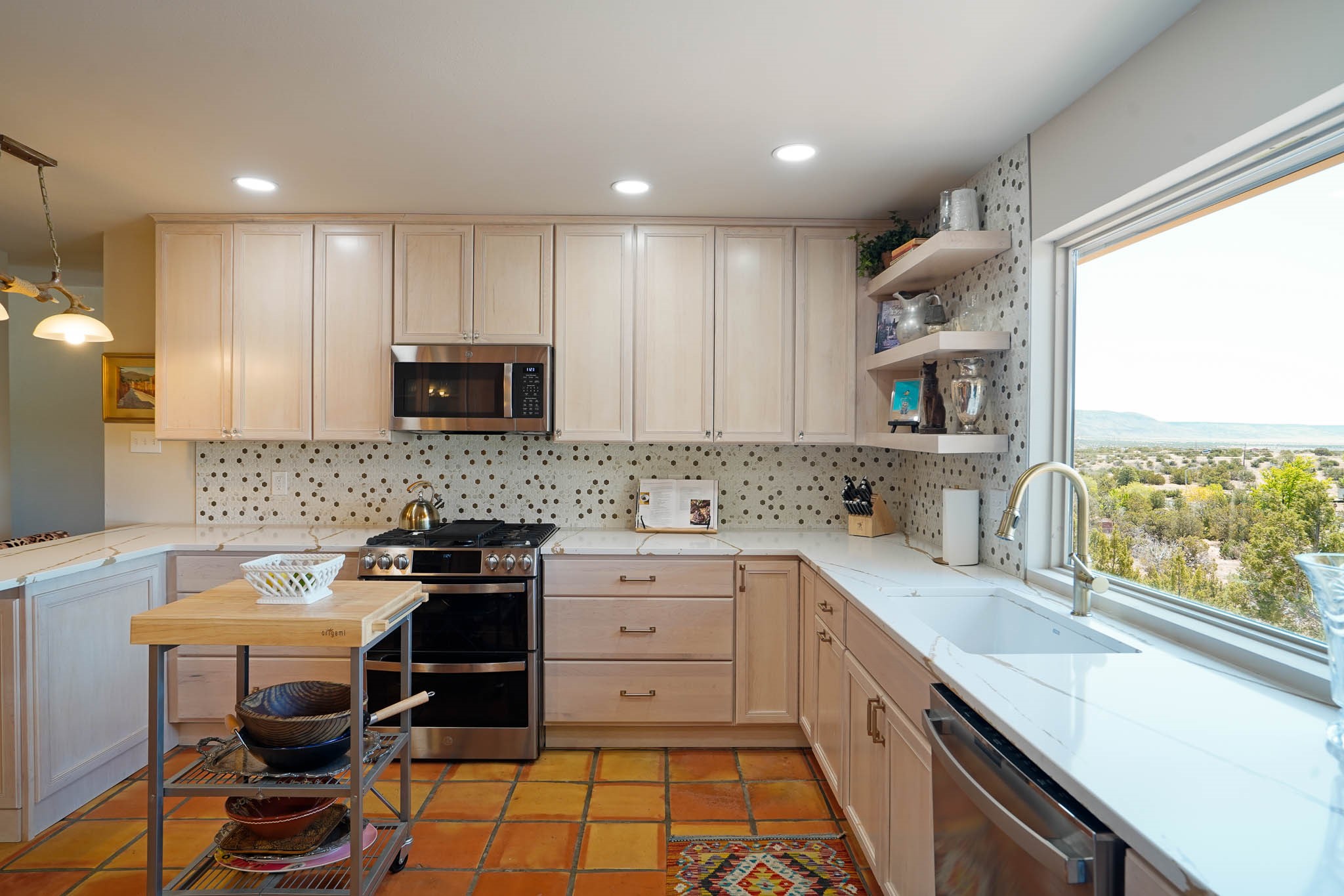 Discover a truly exceptional Cochiti Lake home, fully remodeled in 2023 and thoughtfully enhanced since! Perched on a ridgeline in a peaceful cul-de-sac on a generous .93-acre fenced lot, this property offers unparalleled peace and quiet with breathtaking views toward La Bajada Mesa and Tetilla Peak, especially from the spacious Trex deck off the kitchen. Experience the magic of dark skies, the Milky Way, and vibrant constellations right from your own backyard.Every detail has been addressed: the exterior boasts new paint, a gravel parking pad, updated electrical panel, new driveway, garage door, and a welcoming front door with a screen door. Enjoy enhanced curb appeal with new front porch lights and meticulously refreshed front yard landscaping with flagstone. A 10x20 steel garage/storage building provides ample extra space. All windows and the sliding glass door are new, and a greenhouse adds a touch of charm.Inside, comfort is assured with a new York air-conditioning/heating unit. The interior shines with paneled pine doors and trim throughout, a relocated master entry, and clever shelving by the master bedroom. The acoustic ceilings were removed and the entire house has been freshly painted. Both the master and second bathrooms are updated and remodeled, featuring a new tile floor in the latter and added shelving in the master. The fireplace has been beautifully updated, and new ceiling fans are installed throughout. The complete kitchen remodel features top-end GE appliances, including a gas stove, double oven, French door refrigerator, and stunning quartz countertops. The dining room impresses with deer print wallpaper, while a small office space has been added for productivity. The laundry room is now more functional with an added sink, complemented by a stacked washer/dryer. This home is truly move-in ready and elegantly updated for modern living.